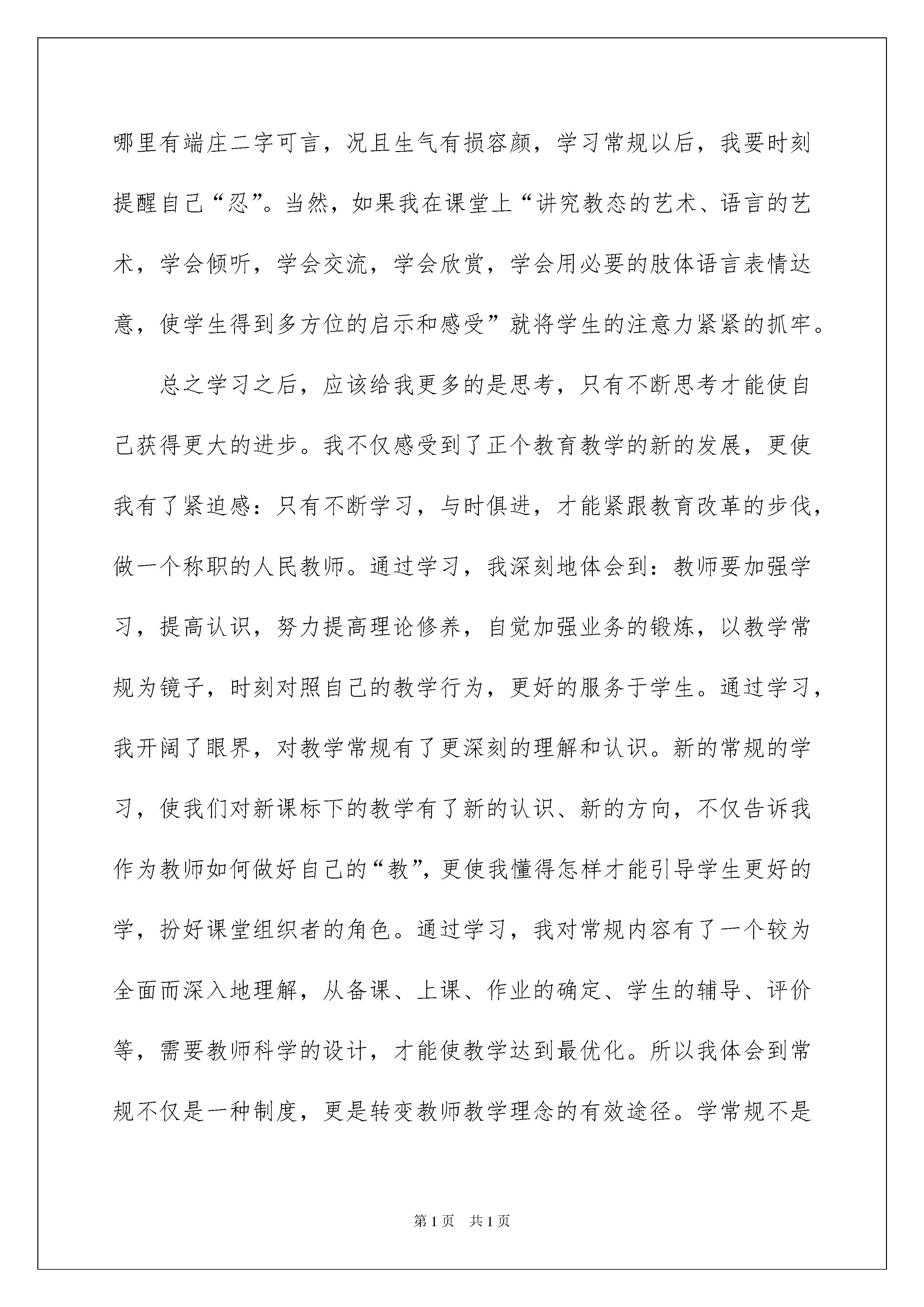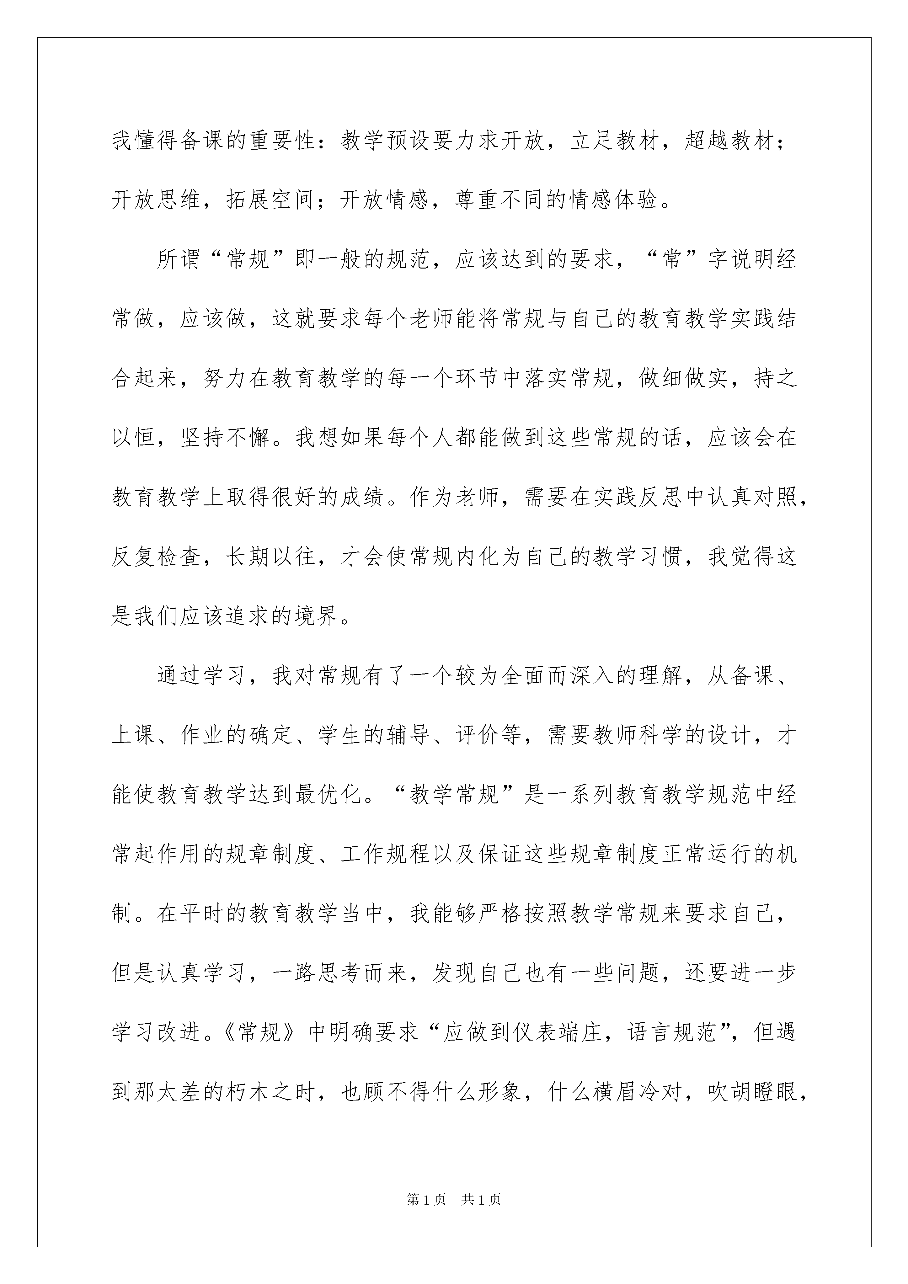 2022教师学习教学常规心得体会教师学习教学常规心得体会当我们受到启发,对生活有了新的感悟时,不如来好好地做个总结,写一篇心得体会,通过写心得体会,可使我们今后少走弯路。那么心得体会怎么写才恰当呢?以下是我收集整理的教师学习教学常规心得体会,仅供参考,欢迎大家阅读。教师学习教学常规心得体会1在学校认真组织下,我学习了《学校常规管理细则》和《小学教师教学常规》,通过学习交流,使我对教育教学常规有了更深刻的认识,教师要时刻加强学习,努力提高理论修养,自觉加强业务的锻炼,以教学常规为标准,时刻要求自己的教学行为,更好的服务于学生。随着课程改革的深入,课堂给学生、教师提供了广阔的空间,怎样才能使师生在课堂优化组合,发挥最佳状态,我想一场精彩的好戏,离不开一个好的剧本,所以备好课是基础。以往在备课中往往注重教学内容的确立,考虑较多的是自己怎样教的顺手,忽视了学生学习的主动性,教学设计单一,方法陈旧,教学效果自然平平。通过学习使我懂得备课的重要性:教学预设要力求开放,立足教材,超越教材;开放思维,拓展空间;开放情感,尊重不同的情感体验。所谓“常规”即一般的规范,应该达到的要求,“常”字说明经常做,应该做,这就要求每个老师能将常规与自己的教育教学实践结合起来,努力在教育教学的每一个环节中落实常规,做细做实,持之以恒,坚持不懈。我想如果每个人都能做到这些常规的话,应该会在教育教学上取得很好的成绩。作为老师,需要在实践反思中认真对照,反复检查,长期以往,才会使常规内化为自己的教学习惯,我觉得这是我们应该追求的境界。通过学习,我对常规有了一个较为全面而深入的理解,从备课、上课、作业的确定、学生的辅导、评价等,需要教师科学的设计,才能使教育教学达到最优化。“教学常规”是一系列教育教学规范中经常起作用的规章制度、工作规程以及保证这些规章制度正常运行的机制。在平时的教育教学当中,我能够严格按照教学常规来要求自己,但是认真学习,一路思考而来,发现自己也有一些问题,还要进一步学习改进。《常规》中明确要求“应做到仪表端庄,语言规范”,但遇到那太差的朽木之时,也顾不得什么形象,什么横眉冷对,吹胡瞪眼,哪里有端庄二字可言,况且生气有损容颜,学习常规以后,我要时刻提醒自己“忍”。当然,如果我在课堂上“讲究教态的艺术、语言的艺术,学会倾听,学会交流,学会欣赏,学会用必要的肢体语言表情达意,使学生得到多方位的启示和感受”就将学生的注意力紧紧的抓牢。总之学习之后,应该给我更多的是思考,只有不断思考才能使自己获得更大的进步。我不仅感受到了正个教育教学的新的发展,更使我有了紧迫感:只有不断学习,与时俱进,才能紧跟教育改革的步伐,做一个称职的人民教师。通过学习,我深刻地体会到:教师要加强学习,提高认识,努力提高理论修养,自觉加强业务的锻炼,以教学常规为镜子,时刻对照自己的教学行为,更好的服务于学生。通过学习,我开阔了眼界,对教学常规有了更深刻的理解和认识。新的常规的学习,使我们对新课标下的教学有了新的认识、新的方向,不仅告诉我作为教师如何做好自己的“教”,更使我懂得怎样才能引导学生更好的学,扮好课堂组织者的角色。通过学习,我对常规内容有了一个较为全面而深入地理解,从备课、上课、作业的确定、学生的辅导、评价等,需要教师科学的设计,才能使教学达到最优化。所以我体会到常规不仅是一种制度,更是转变教师教学理念的有效途径。学常规不是多余的,而是十分必要的,势在必行的。只有学好常规,才能自觉地遵循常规,指导自己的教学,才会取得良好的教育教学效果。教师学习教学常规心得体会2在学校认真组织下,我学习了《学校常规管理细则》和《小学教师教学常规》,通过学习交流,使我对教育教学常规有了更深刻的认识,教师要时刻加强学习,努力提高理论修养,自觉加强业务的锻炼,以教学常规为标准,时刻要求自己的教学行为,更好的服务于学生。教学常规,顾名思义是学校教学工作的基本规范。在基础教育课程改革的新背景下,为优化中小学教学管理,有效地克服教学工作中存在的盲目性和随意性,正确引导教学改革,提高教学工作的整体效益,全面提高教学质量,我省制定出了新的小学教学工作常规,并掀起来学习常规的热潮。通过学习,使我更深刻地体会到:教师只有不断加强学习,提高认识,努力提高理论修养,自觉加强业务的锻炼,以教学常规为镜子,时刻对照自己的教学行为,才能更好的服务于学生。下面就结合近一段时间来通过教学常规的学习受到的启迪谈一下自己对课前准备的感想。课前准备,我觉得似乎是原来所提“备课”的深化,更强调了“有形的”和“无形的”两大块。“有形的”也就是能成文看到的,比如说文本教案,是教师将准备