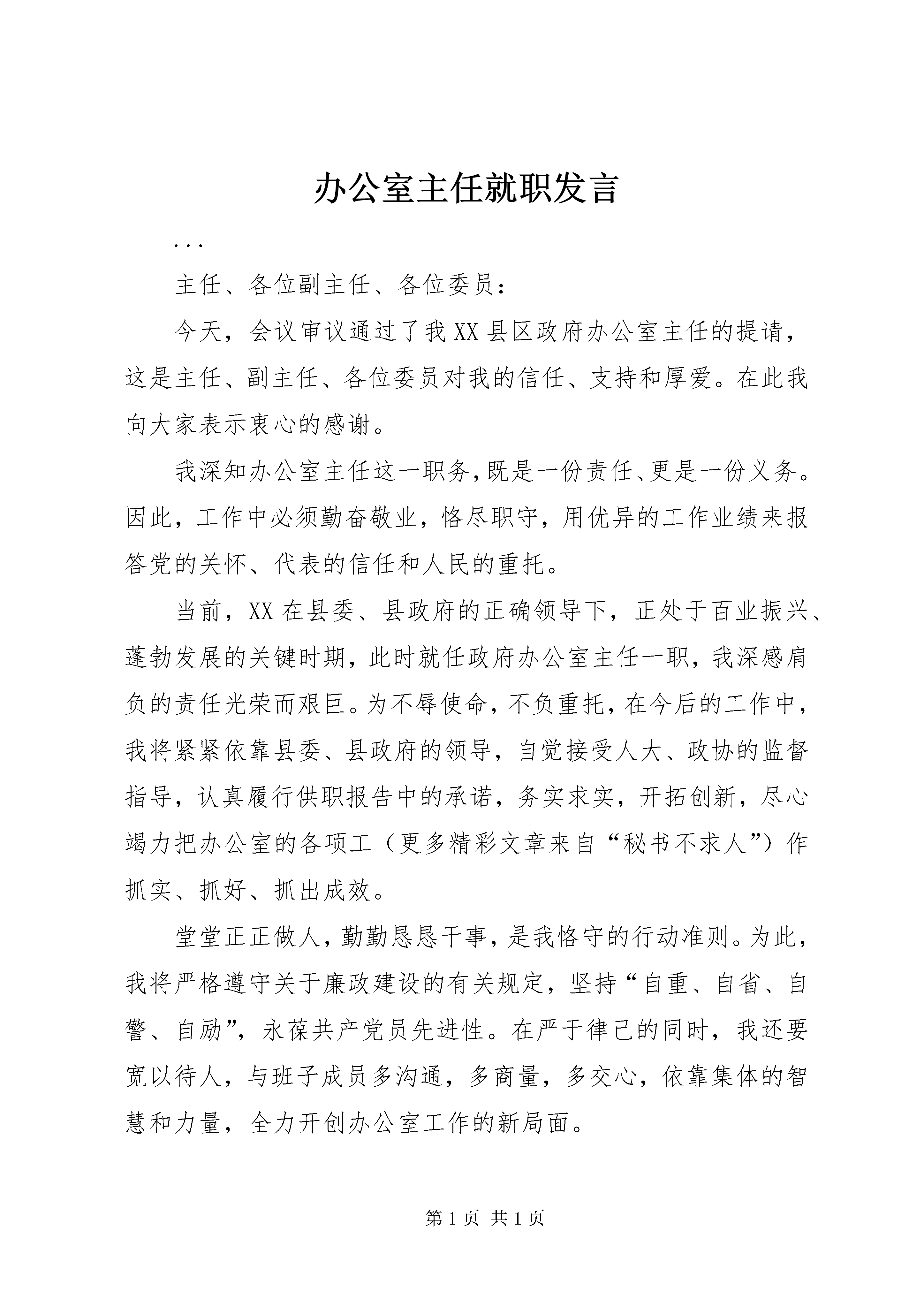 办公室主任就职发言...主任、各位副主任、各位委员:今天,会议审议通过了我XX县区政府办公室主任的提请,这是主任、副主任、各位委员对我的信任、支持和厚爱。在此我向大家表示衷心的感谢。我深知办公室主任这一职务,既是一份责任、更是一份义务。因此,工作中必须勤奋敬业,恪尽职守,用优异的工作业绩来报答党的关怀、代表的信任和人民的重托。当前,XX在县委、县政府的正确领导下,正处于百业振兴、蓬勃发展的关键时期,此时就任政府办公室主任一职,我深感肩负的责任光荣而艰巨。为不辱使命,不负重托,在今后的工作中,我将紧紧依靠县委、县政府的领导,自觉接受人大、政协的监督指导,认真履行供职报告中的承诺,务实求实,开拓创新,尽心竭力把办公室的各项工(更多精彩文章来自“秘书不求人”)作抓实、抓好、抓出成效。堂堂正正做人,勤勤恳恳干事,是我恪守的行动准则。为此,我将严格遵守关于廉政建设的有关规定,坚持“自重、自省、自警、自励”,永葆共产党员先进性。在严于律己的同时,我还要宽以待人,与班子成员多沟通,多商量,多交心,依靠集体的智慧和力量,全力开创办公室工作的新局面。主任、副主任、各位委员,是XX这片土地养育了我、培养了我,我将用我全部的聪明和智慧,用我满腔的赤诚和热忱,回报组织的厚爱,人民的信任,为XX的加快发展贡献出自己的一份力量。
