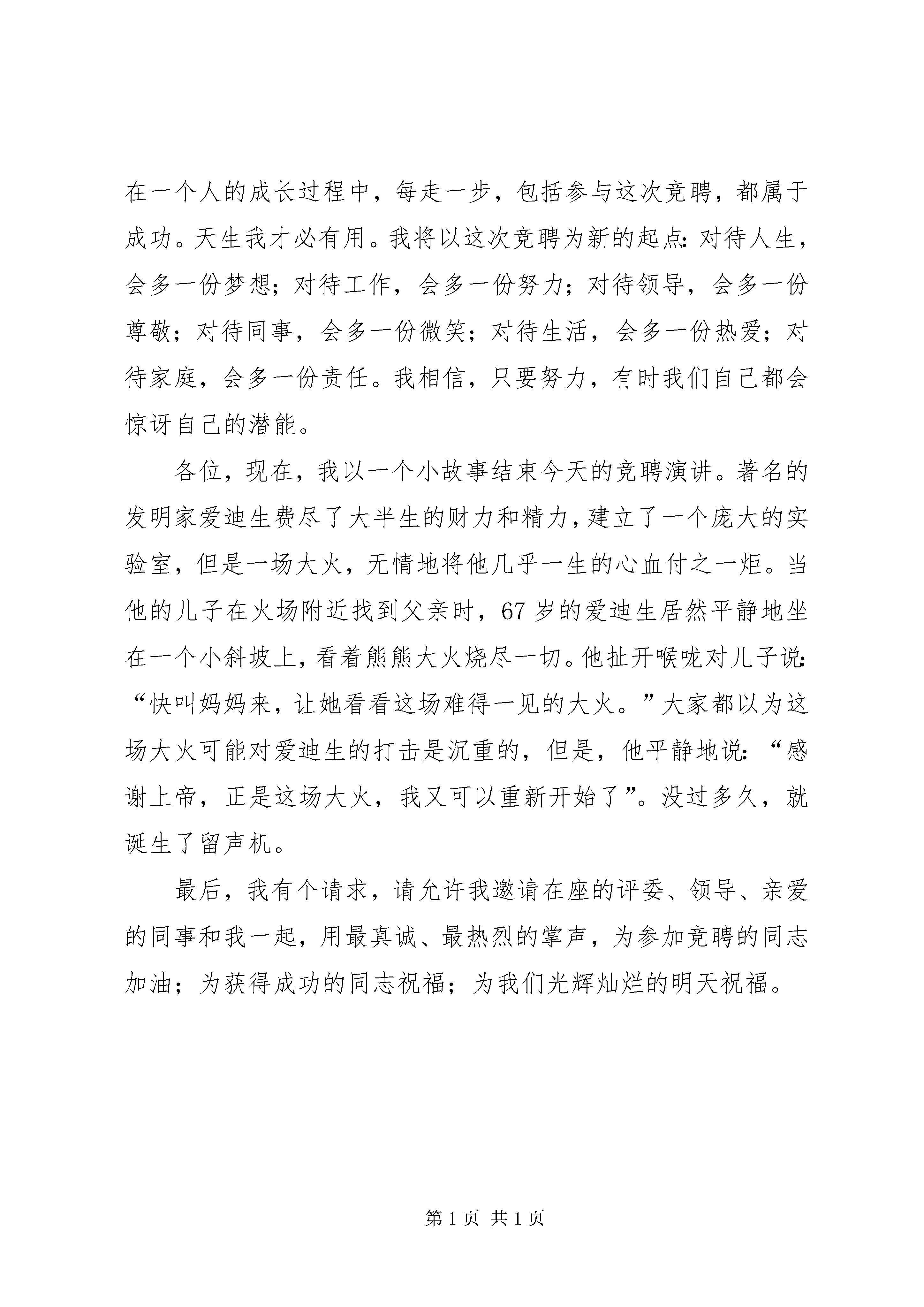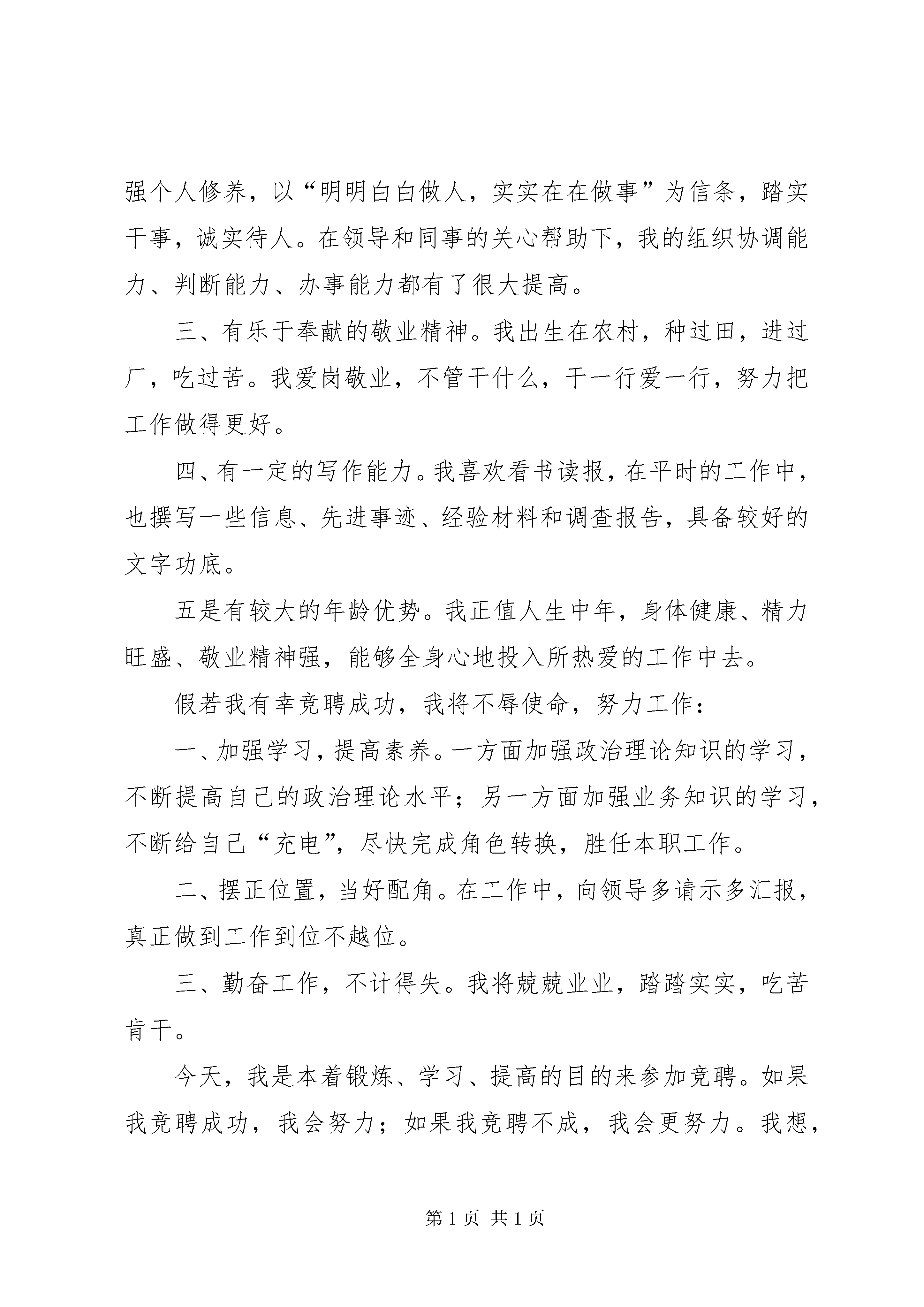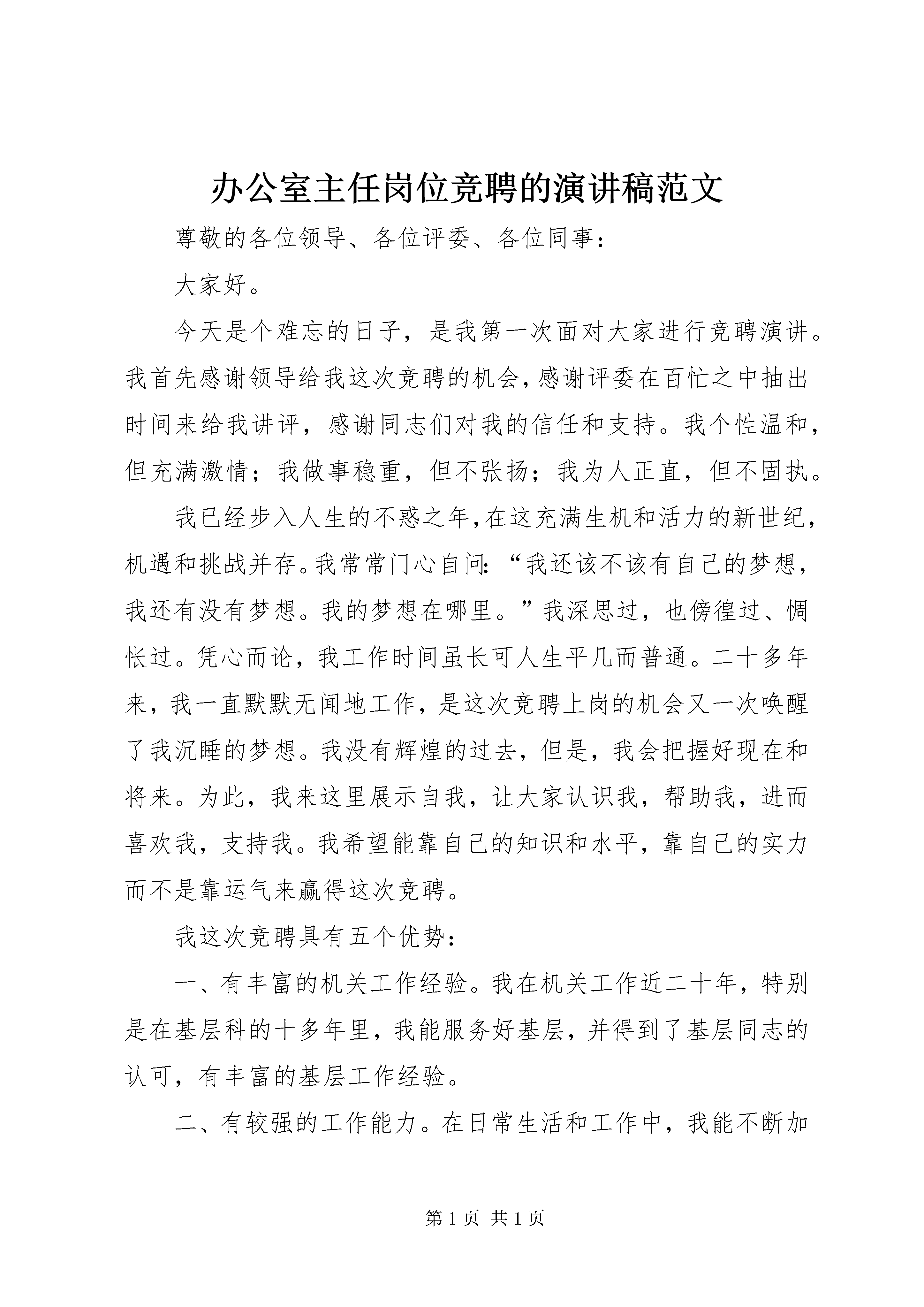 办公室主任岗位竞聘的演讲稿范文尊敬的各位领导、各位评委、各位同事:大家好。今天是个难忘的日子,是我第一次面对大家进行竞聘演讲。我首先感谢领导给我这次竞聘的机会,感谢评委在百忙之中抽出时间来给我讲评,感谢同志们对我的信任和支持。我个性温和,但充满激情;我做事稳重,但不张扬;我为人正直,但不固执。我已经步入人生的不惑之年,在这充满生机和活力的新世纪,机遇和挑战并存。我常常门心自问:“我还该不该有自己的梦想,我还有没有梦想。我的梦想在哪里。”我深思过,也傍徨过、惆怅过。凭心而论,我工作时间虽长可人生平几而普通。二十多年来,我一直默默无闻地工作,是这次竞聘上岗的机会又一次唤醒了我沉睡的梦想。我没有辉煌的过去,但是,我会把握好现在和将来。为此,我来这里展示自我,让大家认识我,帮助我,进而喜欢我,支持我。我希望能靠自己的知识和水平,靠自己的实力而不是靠运气来赢得这次竞聘。我这次竞聘具有五个优势:一、有丰富的机关工作经验。我在机关工作近二十年,特别是在基层科的十多年里,我能服务好基层,并得到了基层同志的认可,有丰富的基层工作经验。二、有较强的工作能力。在日常生活和工作中,我能不断加强个人修养,以“明明白白做人,实实在在做事”为信条,踏实干事,诚实待人。在领导和同事的关心帮助下,我的组织协调能力、判断能力、办事能力都有了很大提高。三、有乐于奉献的敬业精神。我出生在农村,种过田,进过厂,吃过苦。我爱岗敬业,不管干什么,干一行爱一行,努力把工作做得更好。四、有一定的写作能力。我喜欢看书读报,在平时的工作中,也撰写一些信息、先进事迹、经验材料和调查报告,具备较好的文字功底。五是有较大的年龄优势。我正值人生中年,身体健康、精力旺盛、敬业精神强,能够全身心地投入所热爱的工作中去。假若我有幸竞聘成功,我将不辱使命,努力工作:一、加强学习,提高素养。一方面加强政治理论知识的学习,不断提高自己的政治理论水平;另一方面加强业务知识的学习,不断给自己“充电”,尽快完成角色转换,胜任本职工作。二、摆正位置,当好配角。在工作中,向领导多请示多汇报,真正做到工作到位不越位。三、勤奋工作,不计得失。我将兢兢业业,踏踏实实,吃苦肯干。今天,我是本着锻炼、学习、提高的目的来参加竞聘。如果我竞聘成功,我会努力;如果我竞聘不成,我会更努力。我想,在一个人的成长过程中,每走一步,包括参与这次竞聘,都属于成功。天生我才必有用。我将以这次竞聘为新的起点:对待人生,会多一份梦想;对待工作,会多一份努力;对待领导,会多一份尊敬;对待同事,会多一份微笑;对待生活,会多一份热爱;对待家庭,会多一份责任。我相信,只要努力,有时我们自己都会惊讶自己的潜能。各位,现在,我以一个小故事结束今天的竞聘演讲。著名的发明家爱迪生费尽了大半生的财力和精力,建立了一个庞大的实验室,但是一场大火,无情地将他几乎一生的心血付之一炬。当他的儿子在火场附近找到父亲时,67岁的爱迪生居然平静地坐在一个小斜坡上,看着熊熊大火烧尽一切。他扯开喉咙对儿子说:“快叫妈妈来,让她看看这场难得一见的大火。”大家都以为这场大火可能对爱迪生的打击是沉重的,但是,他平静地说:“感谢上帝,正是这场大火,我又可以重新开始了”。没过多久,就诞生了留声机。最后,我有个请求,请允许我邀请在座的评委、领导、亲爱的同事和我一起,用最真诚、最热烈的掌声,为参加竞聘的同志加油;为获得成功的同志祝福;为我们光辉灿烂的明天祝福。