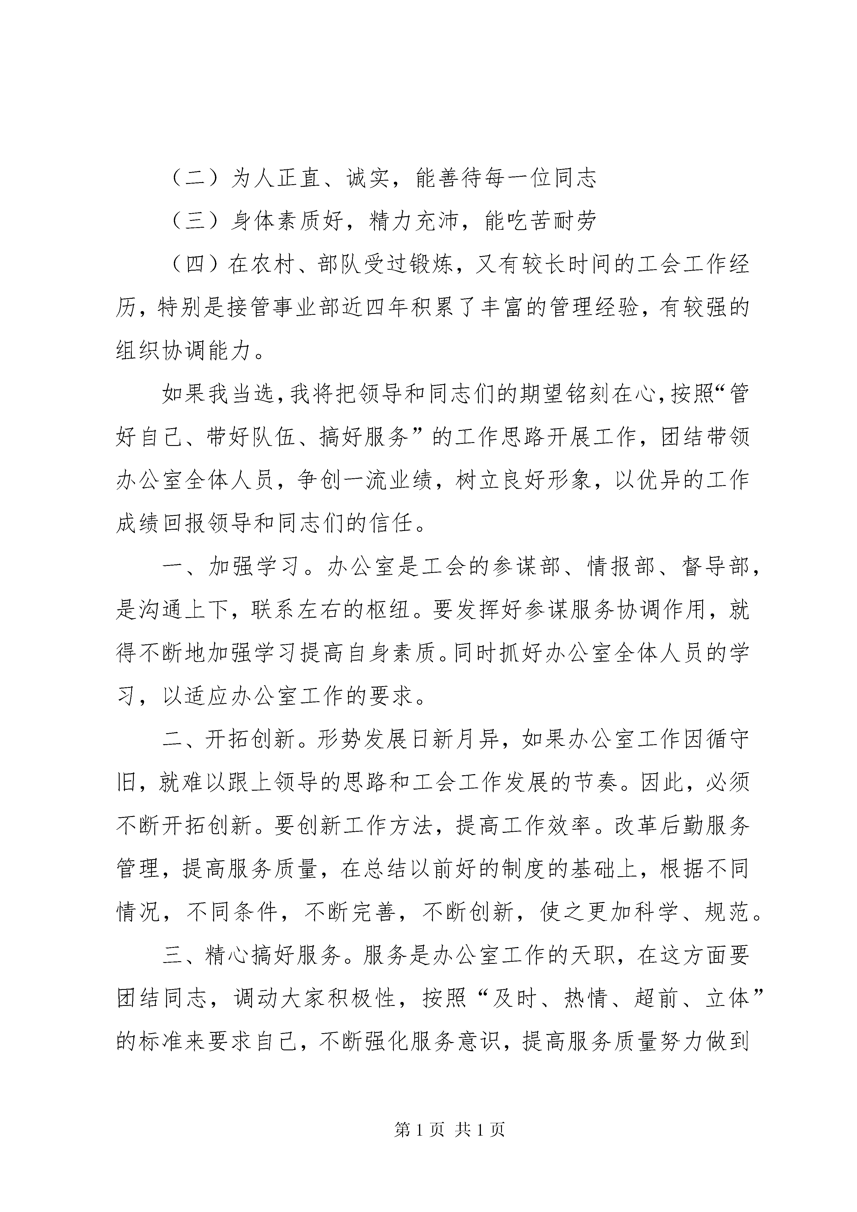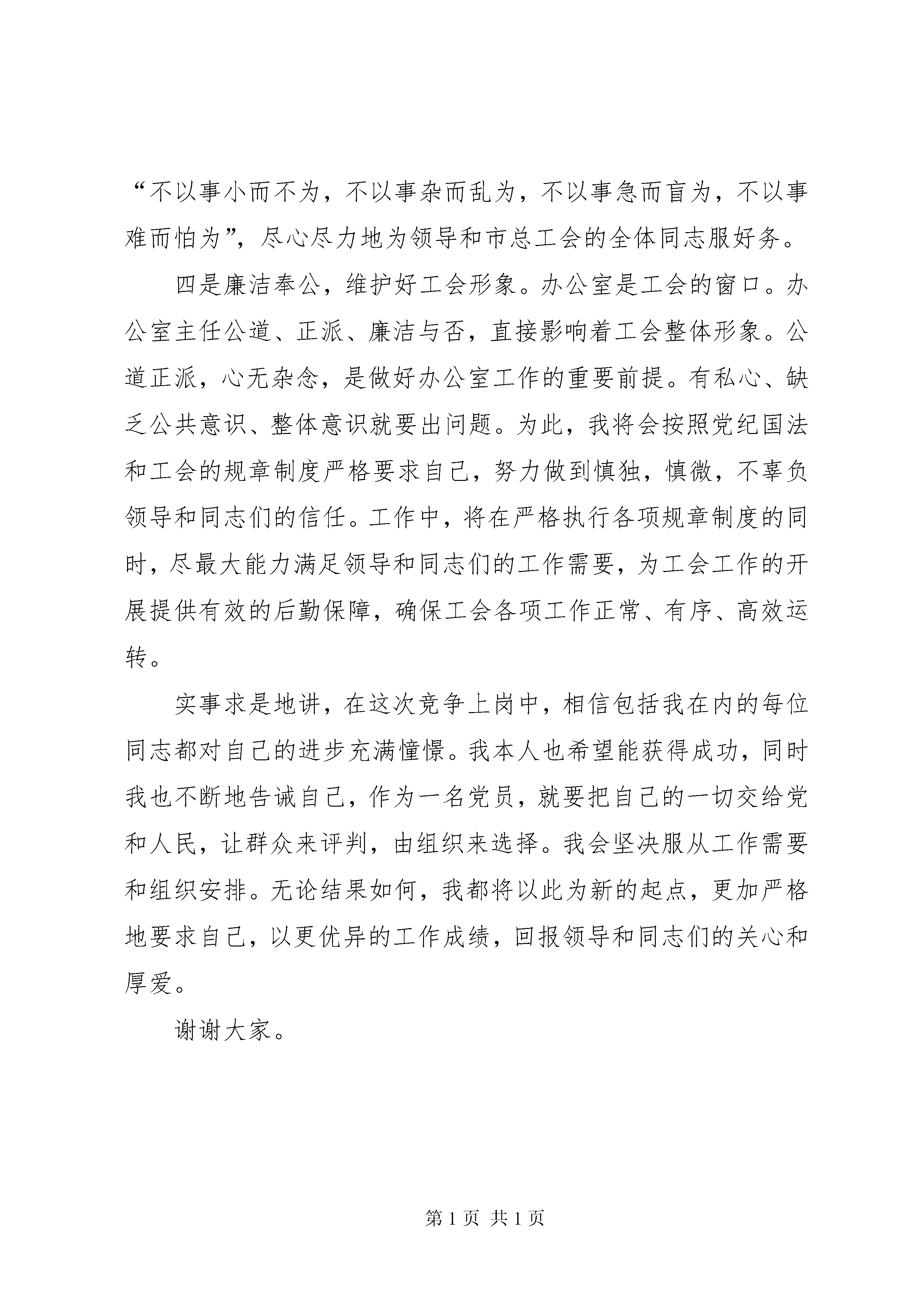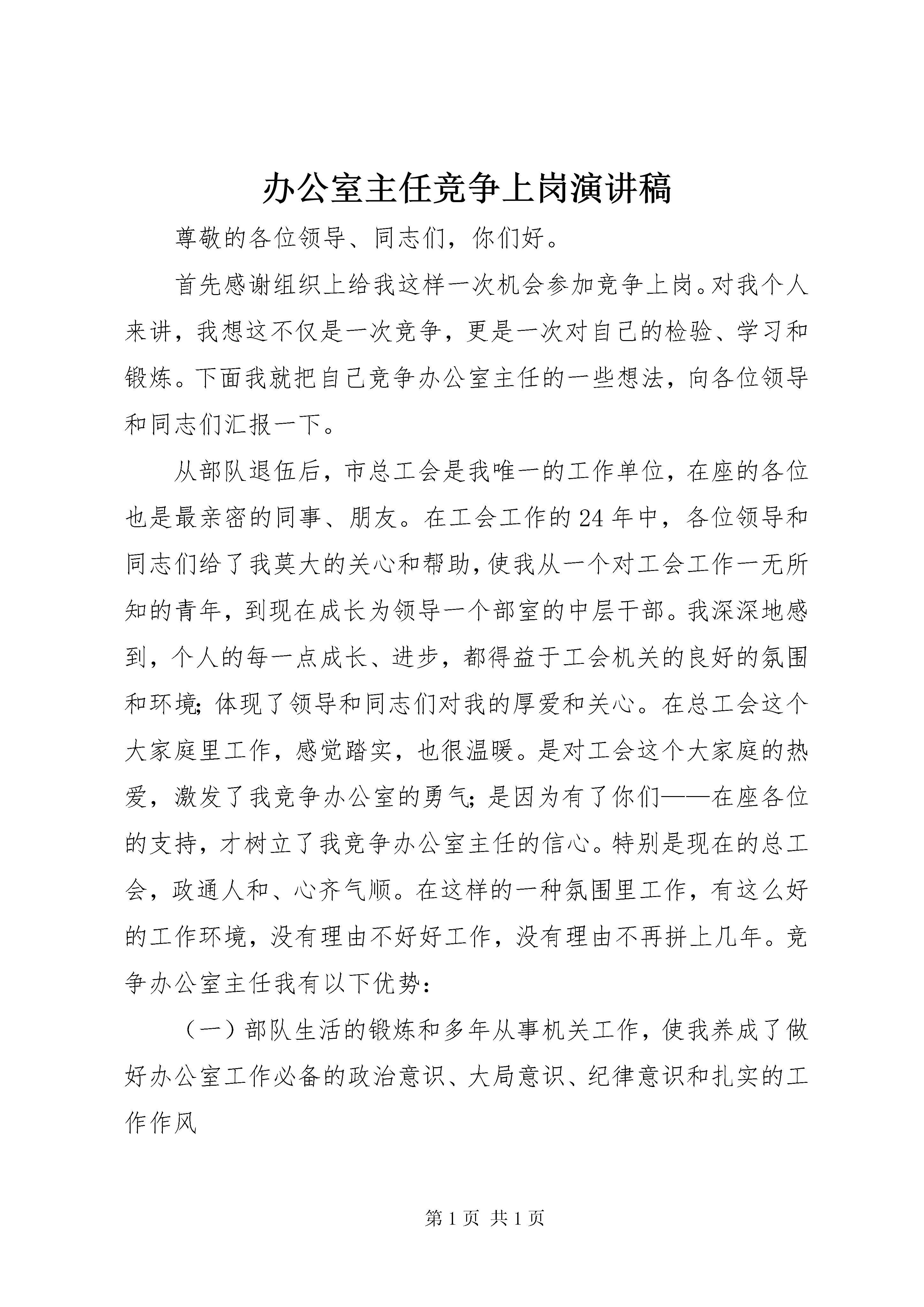 办公室主任竞争上岗演讲稿尊敬的各位领导、同志们,你们好。首先感谢组织上给我这样一次机会参加竞争上岗。对我个人来讲,我想这不仅是一次竞争,更是一次对自己的检验、学习和锻炼。下面我就把自己竞争办公室主任的一些想法,向各位领导和同志们汇报一下。从部队退伍后,市总工会是我唯一的工作单位,在座的各位也是最亲密的同事、朋友。在工会工作的24年中,各位领导和同志们给了我莫大的关心和帮助,使我从一个对工会工作一无所知的青年,到现在成长为领导一个部室的中层干部。我深深地感到,个人的每一点成长、进步,都得益于工会机关的良好的氛围和环境;体现了领导和同志们对我的厚爱和关心。在总工会这个大家庭里工作,感觉踏实,也很温暖。是对工会这个大家庭的热爱,激发了我竞争办公室的勇气;是因为有了你们——在座各位的支持,才树立了我竞争办公室主任的信心。特别是现在的总工会,政通人和、心齐气顺。在这样的一种氛围里工作,有这么好的工作环境,没有理由不好好工作,没有理由不再拼上几年。竞争办公室主任我有以下优势:(一)部队生活的锻炼和多年从事机关工作,使我养成了做好办公室工作必备的政治意识、大局意识、纪律意识和扎实的工作作风(二)为人正直、诚实,能善待每一位同志(三)身体素质好,精力充沛,能吃苦耐劳(四)在农村、部队受过锻炼,又有较长时间的工会工作经历,特别是接管事业部近四年积累了丰富的管理经验,有较强的组织协调能力。如果我当选,我将把领导和同志们的期望铭刻在心,按照“管好自己、带好队伍、搞好服务”的工作思路开展工作,团结带领办公室全体人员,争创一流业绩,树立良好形象,以优异的工作成绩回报领导和同志们的信任。一、加强学习。办公室是工会的参谋部、情报部、督导部,是沟通上下,联系左右的枢纽。要发挥好参谋服务协调作用,就得不断地加强学习提高自身素质。同时抓好办公室全体人员的学习,以适应办公室工作的要求。二、开拓创新。形势发展日新月异,如果办公室工作因循守旧,就难以跟上领导的思路和工会工作发展的节奏。因此,必须不断开拓创新。要创新工作方法,提高工作效率。改革后勤服务管理,提高服务质量,在总结以前好的制度的基础上,根据不同情况,不同条件,不断完善,不断创新,使之更加科学、规范。三、精心搞好服务。服务是办公室工作的天职,在这方面要团结同志,调动大家积极性,按照“及时、热情、超前、立体”的标准来要求自己,不断强化服务意识,提高服务质量努力做到“不以事小而不为,不以事杂而乱为,不以事急而盲为,不以事难而怕为”,尽心尽力地为领导和市总工会的全体同志服好务。四是廉洁奉公,维护好工会形象。办公室是工会的窗口。办公室主任公道、正派、廉洁与否,直接影响着工会整体形象。公道正派,心无杂念,是做好办公室工作的重要前提。有私心、缺乏公共意识、整体意识就要出问题。为此,我将会按照党纪国法和工会的规章制度严格要求自己,努力做到慎独,慎微,不辜负领导和同志们的信任。工作中,将在严格执行各项规章制度的同时,尽最大能力满足领导和同志们的工作需要,为工会工作的开展提供有效的后勤保障,确保工会各项工作正常、有序、高效运转。实事求是地讲,在这次竞争上岗中,相信包括我在内的每位同志都对自己的进步充满憧憬。我本人也希望能获得成功,同时我也不断地告诫自己,作为一名党员,就要把自己的一切交给党和人民,让群众来评判,由组织来选择。我会坚决服从工作需要和组织安排。无论结果如何,我都将以此为新的起点,更加严格地要求自己,以更优异的工作成绩,回报领导和同志们的关心和厚爱。谢谢大家。