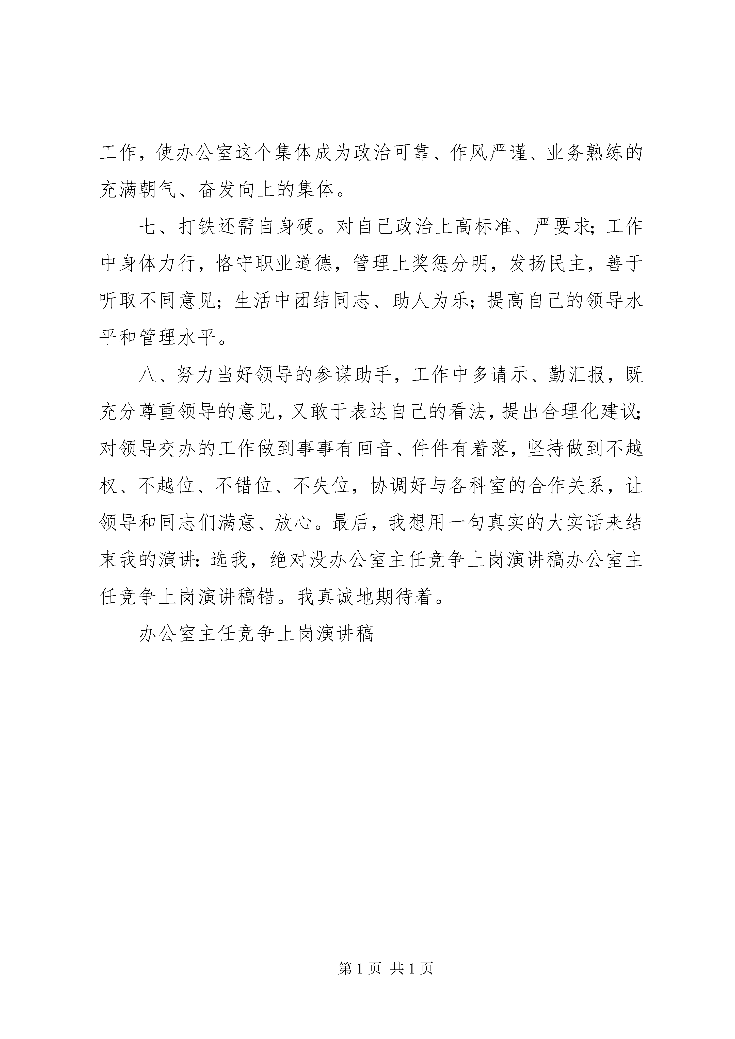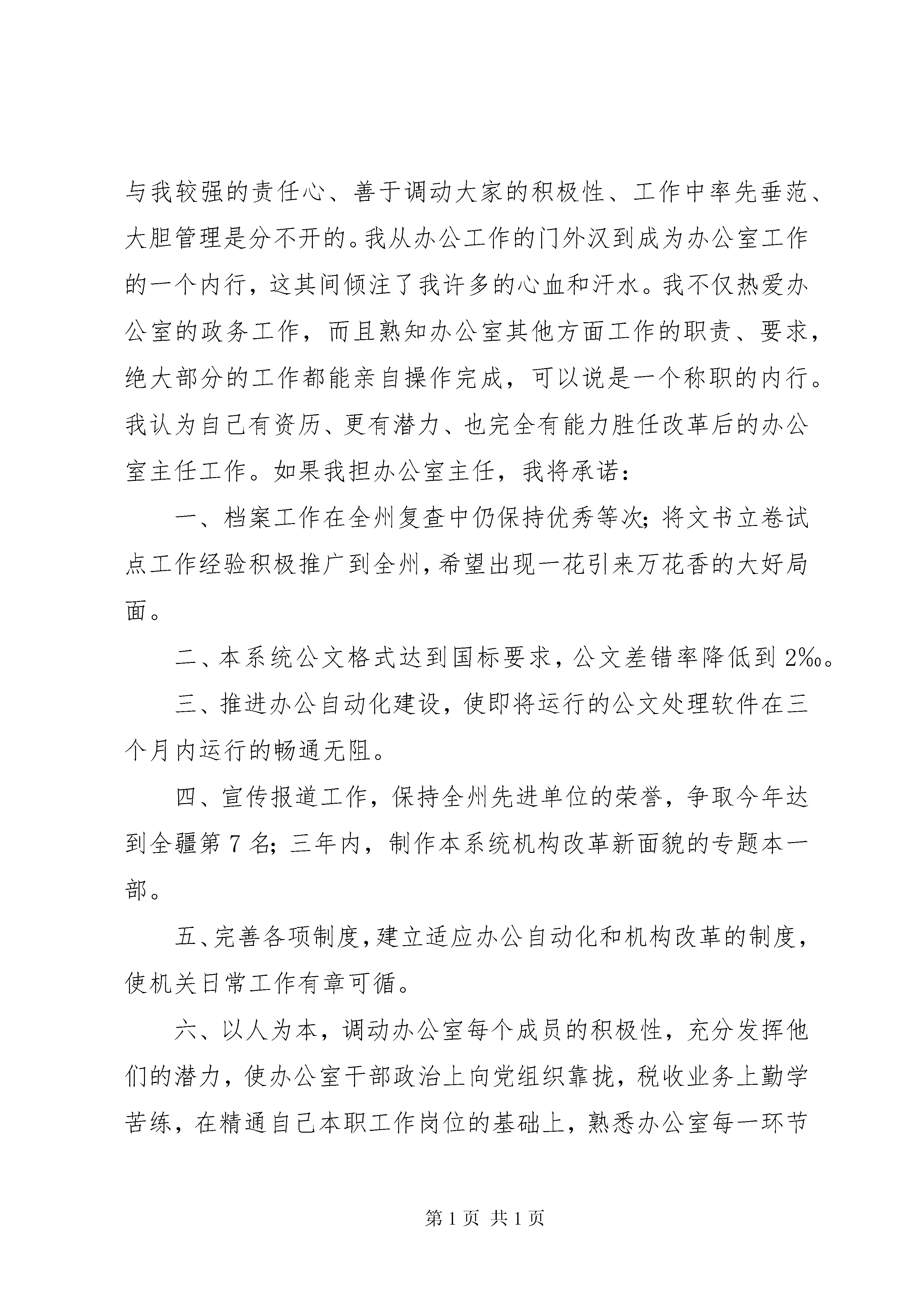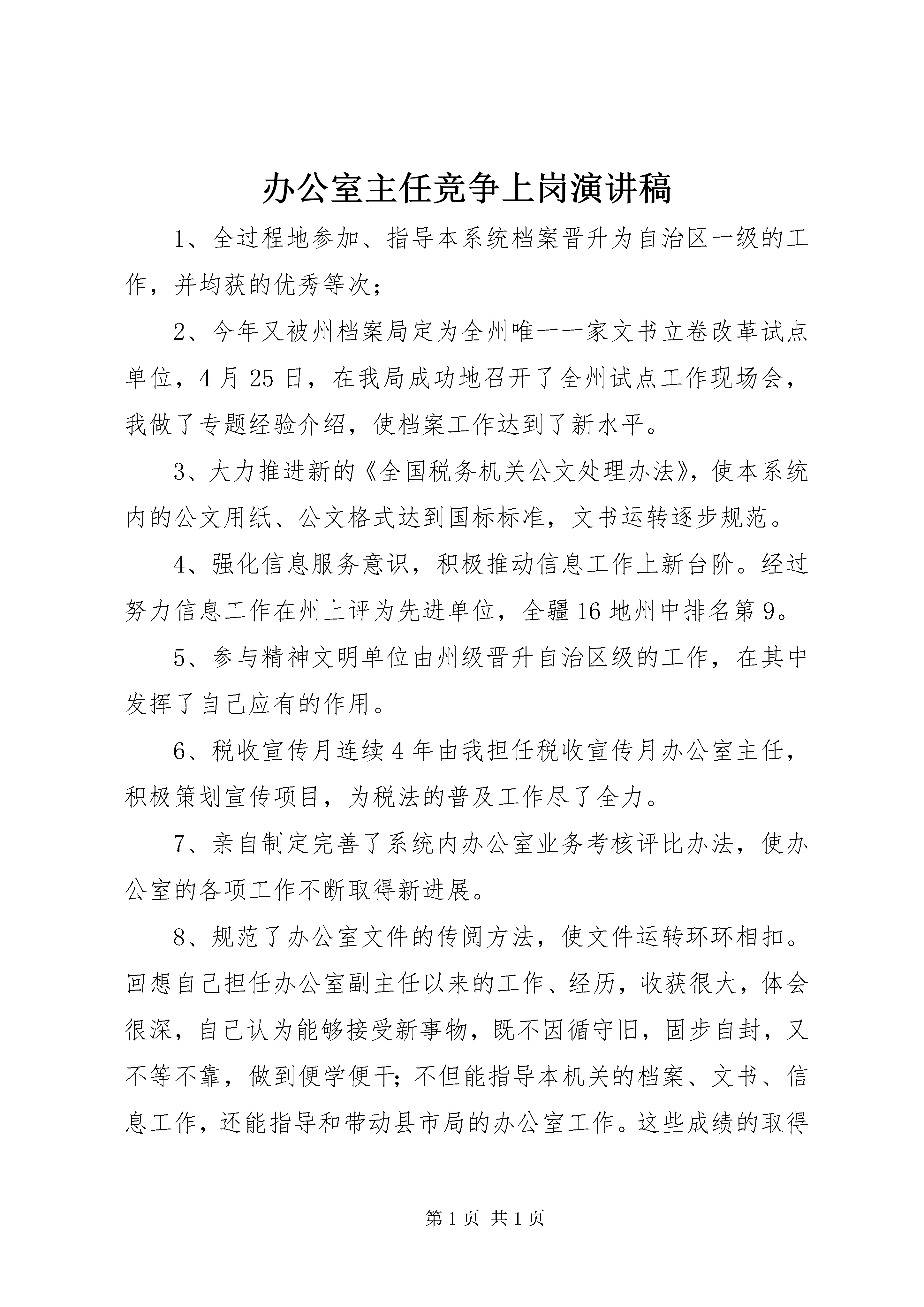办公室主任竞争上岗演讲稿1、全过程地参加、指导本系统档案晋升为自治区一级的工作,并均获的优秀等次;2、今年又被州档案局定为全州唯一一家文书立卷改革试点单位,4月25日,在我局成功地召开了全州试点工作现场会,我做了专题经验介绍,使档案工作达到了新水平。3、大力推进新的《全国税务机关公文处理办法》,使本系统内的公文用纸、公文格式达到国标标准,文书运转逐步规范。4、强化信息服务意识,积极推动信息工作上新台阶。经过努力信息工作在州上评为先进单位,全疆16地州中排名第9。5、参与精神文明单位由州级晋升自治区级的工作,在其中发挥了自己应有的作用。6、税收宣传月连续4年由我担任税收宣传月办公室主任,积极策划宣传项目,为税法的普及工作尽了全力。7、亲自制定完善了系统内办公室业务考核评比办法,使办公室的各项工作不断取得新进展。8、规范了办公室文件的传阅方法,使文件运转环环相扣。回想自己担任办公室副主任以来的工作、经历,收获很大,体会很深,自己认为能够接受新事物,既不因循守旧,固步自封,又不等不靠,做到便学便干;不但能指导本机关的档案、文书、信息工作,还能指导和带动县市局的办公室工作。这些成绩的取得与我较强的责任心、善于调动大家的积极性、工作中率先垂范、大胆管理是分不开的。我从办公工作的门外汉到成为办公室工作的一个内行,这其间倾注了我许多的心血和汗水。我不仅热爱办公室的政务工作,而且熟知办公室其他方面工作的职责、要求,绝大部分的工作都能亲自操作完成,可以说是一个称职的内行。我认为自己有资历、更有潜力、也完全有能力胜任改革后的办公室主任工作。如果我担办公室主任,我将承诺:一、档案工作在全州复查中仍保持优秀等次;将文书立卷试点工作经验积极推广到全州,希望出现一花引来万花香的大好局面。二、本系统公文格式达到国标要求,公文差错率降低到2‰。三、推进办公自动化建设,使即将运行的公文处理软件在三个月内运行的畅通无阻。四、宣传报道工作,保持全州先进单位的荣誉,争取今年达到全疆第7名;三年内,制作本系统机构改革新面貌的专题本一部。五、完善各项制度,建立适应办公自动化和机构改革的制度,使机关日常工作有章可循。六、以人为本,调动办公室每个成员的积极性,充分发挥他们的潜力,使办公室干部政治上向党组织靠拢,税收业务上勤学苦练,在精通自己本职工作岗位的基础上,熟悉办公室每一环节工作,使办公室这个集体成为政治可靠、作风严谨、业务熟练的充满朝气、奋发向上的集体。七、打铁还需自身硬。对自己政治上高标准、严要求;工作中身体力行,恪守职业道德,管理上奖惩分明,发扬民主,善于听取不同意见;生活中团结同志、助人为乐;提高自己的领导水平和管理水平。八、努力当好领导的参谋助手,工作中多请示、勤汇报,既充分尊重领导的意见,又敢于表达自己的看法,提出合理化建议;对领导交办的工作做到事事有回音、件件有着落,坚持做到不越权、不越位、不错位、不失位,协调好与各科室的合作关系,让领导和同志们满意、放心。最后,我想用一句真实的大实话来结束我的演讲:选我,绝对没办公室主任竞争上岗演讲稿办公室主任竞争上岗演讲稿错。我真诚地期待着。办公室主任竞争上岗演讲稿