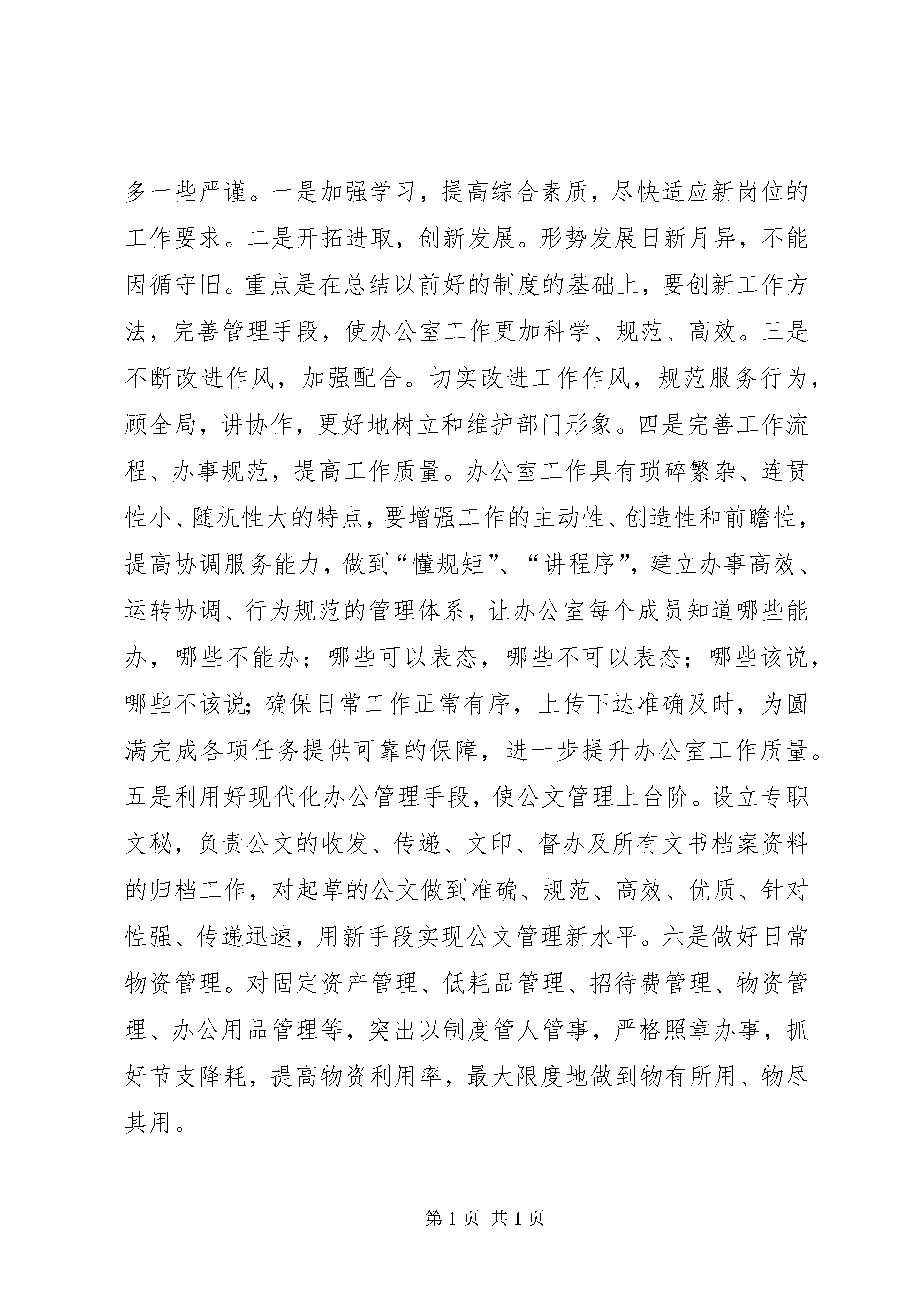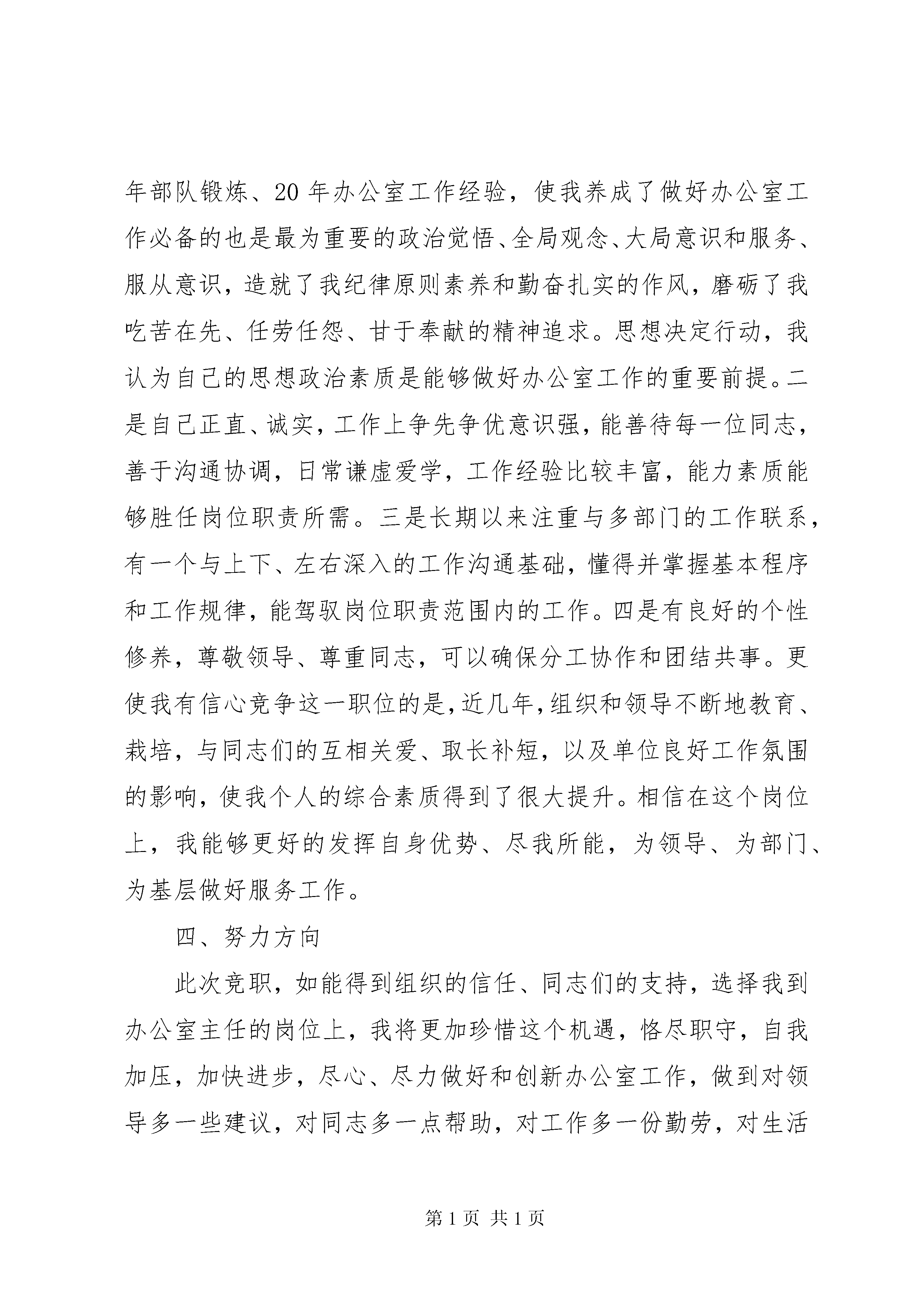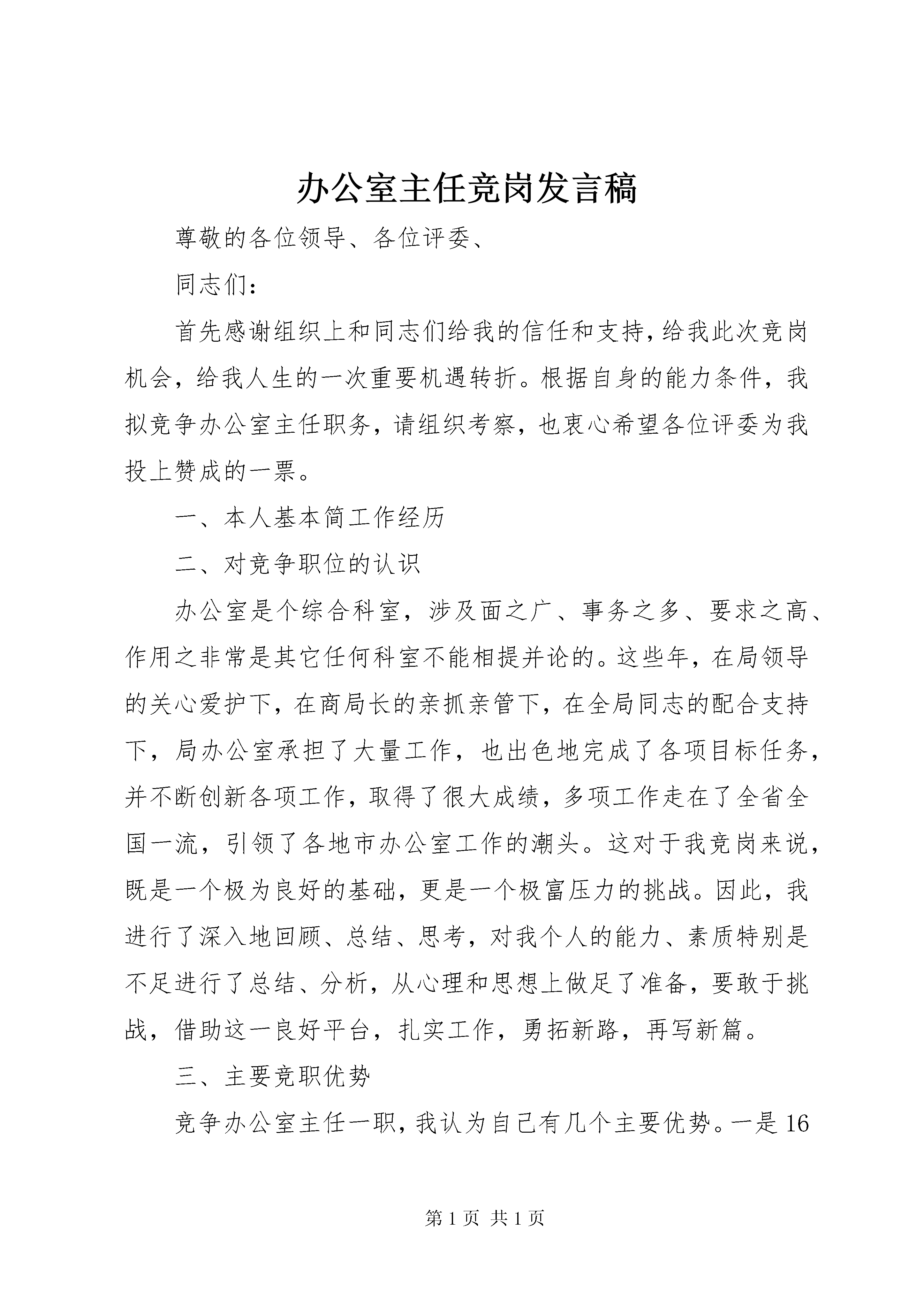 办公室主任竞岗发言稿尊敬的各位领导、各位评委、同志们:首先感谢组织上和同志们给我的信任和支持,给我此次竞岗机会,给我人生的一次重要机遇转折。根据自身的能力条件,我拟竞争办公室主任职务,请组织考察,也衷心希望各位评委为我投上赞成的一票。一、本人基本简工作经历二、对竞争职位的认识办公室是个综合科室,涉及面之广、事务之多、要求之高、作用之非常是其它任何科室不能相提并论的。这些年,在局领导的关心爱护下,在商局长的亲抓亲管下,在全局同志的配合支持下,局办公室承担了大量工作,也出色地完成了各项目标任务,并不断创新各项工作,取得了很大成绩,多项工作走在了全省全国一流,引领了各地市办公室工作的潮头。这对于我竞岗来说,既是一个极为良好的基础,更是一个极富压力的挑战。因此,我进行了深入地回顾、总结、思考,对我个人的能力、素质特别是不足进行了总结、分析,从心理和思想上做足了准备,要敢于挑战,借助这一良好平台,扎实工作,勇拓新路,再写新篇。三、主要竞职优势竞争办公室主任一职,我认为自己有几个主要优势。一是16年部队锻炼、20年办公室工作经验,使我养成了做好办公室工作必备的也是最为重要的政治觉悟、全局观念、大局意识和服务、服从意识,造就了我纪律原则素养和勤奋扎实的作风,磨砺了我吃苦在先、任劳任怨、甘于奉献的精神追求。思想决定行动,我认为自己的思想政治素质是能够做好办公室工作的重要前提。二是自己正直、诚实,工作上争先争优意识强,能善待每一位同志,善于沟通协调,日常谦虚爱学,工作经验比较丰富,能力素质能够胜任岗位职责所需。三是长期以来注重与多部门的工作联系,有一个与上下、左右深入的工作沟通基础,懂得并掌握基本程序和工作规律,能驾驭岗位职责范围内的工作。四是有良好的个性修养,尊敬领导、尊重同志,可以确保分工协作和团结共事。更使我有信心竞争这一职位的是,近几年,组织和领导不断地教育、栽培,与同志们的互相关爱、取长补短,以及单位良好工作氛围的影响,使我个人的综合素质得到了很大提升。相信在这个岗位上,我能够更好的发挥自身优势、尽我所能,为领导、为部门、为基层做好服务工作。四、努力方向此次竞职,如能得到组织的信任、同志们的支持,选择我到办公室主任的岗位上,我将更加珍惜这个机遇,恪尽职守,自我加压,加快进步,尽心、尽力做好和创新办公室工作,做到对领导多一些建议,对同志多一点帮助,对工作多一份勤劳,对生活多一些严谨。一是加强学习,提高综合素质,尽快适应新岗位的工作要求。二是开拓进取,创新发展。形势发展日新月异,不能因循守旧。重点是在总结以前好的制度的基础上,要创新工作方法,完善管理手段,使办公室工作更加科学、规范、高效。三是不断改进作风,加强配合。切实改进工作作风,规范服务行为,顾全局,讲协作,更好地树立和维护部门形象。四是完善工作流程、办事规范,提高工作质量。办公室工作具有琐碎繁杂、连贯性小、随机性大的特点,要增强工作的主动性、创造性和前瞻性,提高协调服务能力,做到“懂规矩”、“讲程序”,建立办事高效、运转协调、行为规范的管理体系,让办公室每个成员知道哪些能办,哪些不能办;哪些可以表态,哪些不可以表态;哪些该说,哪些不该说;确保日常工作正常有序,上传下达准确及时,为圆满完成各项任务提供可靠的保障,进一步提升办公室工作质量。五是利用好现代化办公管理手段,使公文管理上台阶。设立专职文秘,负责公文的收发、传递、文印、督办及所有文书档案资料的归档工作,对起草的公文做到准确、规范、高效、优质、针对性强、传递迅速,用新手段实现公文管理新水平。六是做好日常物资管理。对固定资产管理、低耗品管理、招待费管理、物资管理、办公用品管理等,突出以制度管人管事,严格照章办事,抓好节支降耗,提高物资利用率,最大限度地做到物有所用、物尽其用。当然,做好这份工作绝非轻而易举的事,自己还有管理经验不够、全面抓工作的意识不足等欠缺,但我有信心、有决心干好这项工作,要在干中学、在实践中锻炼提高自己,只要功夫深、铁杵磨成针,一定不辜负组织和同志们的期望。最后,借此机会,向多年来一直给予我关心、帮助和厚爱的各位领导和同事们表示衷心地感谢。同时也真诚地希望大家能一如既往地给予我关心、支持和帮助。在今后的工作中,我将把这份感激之情化为工作的热情,将压力化为动力,用行动和实绩作为回报。谢谢。