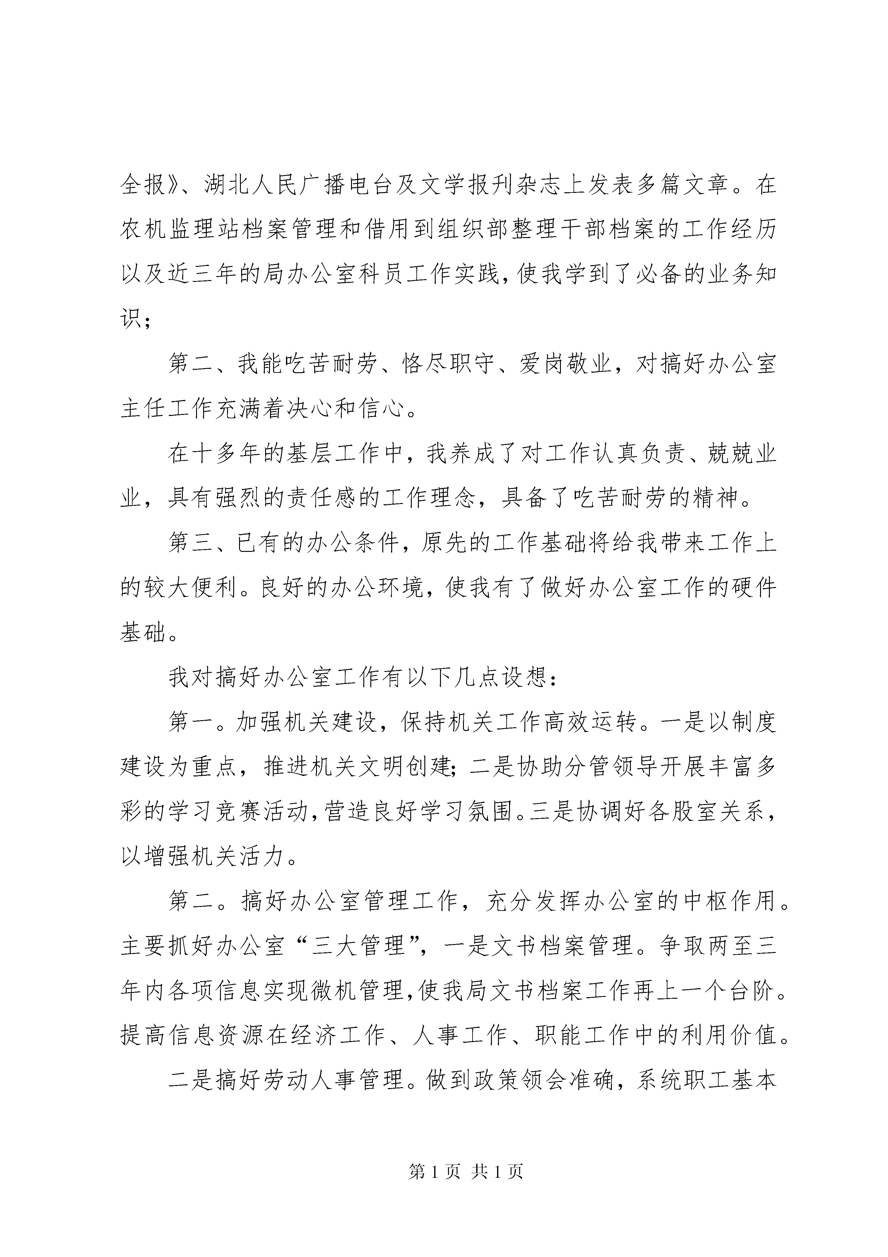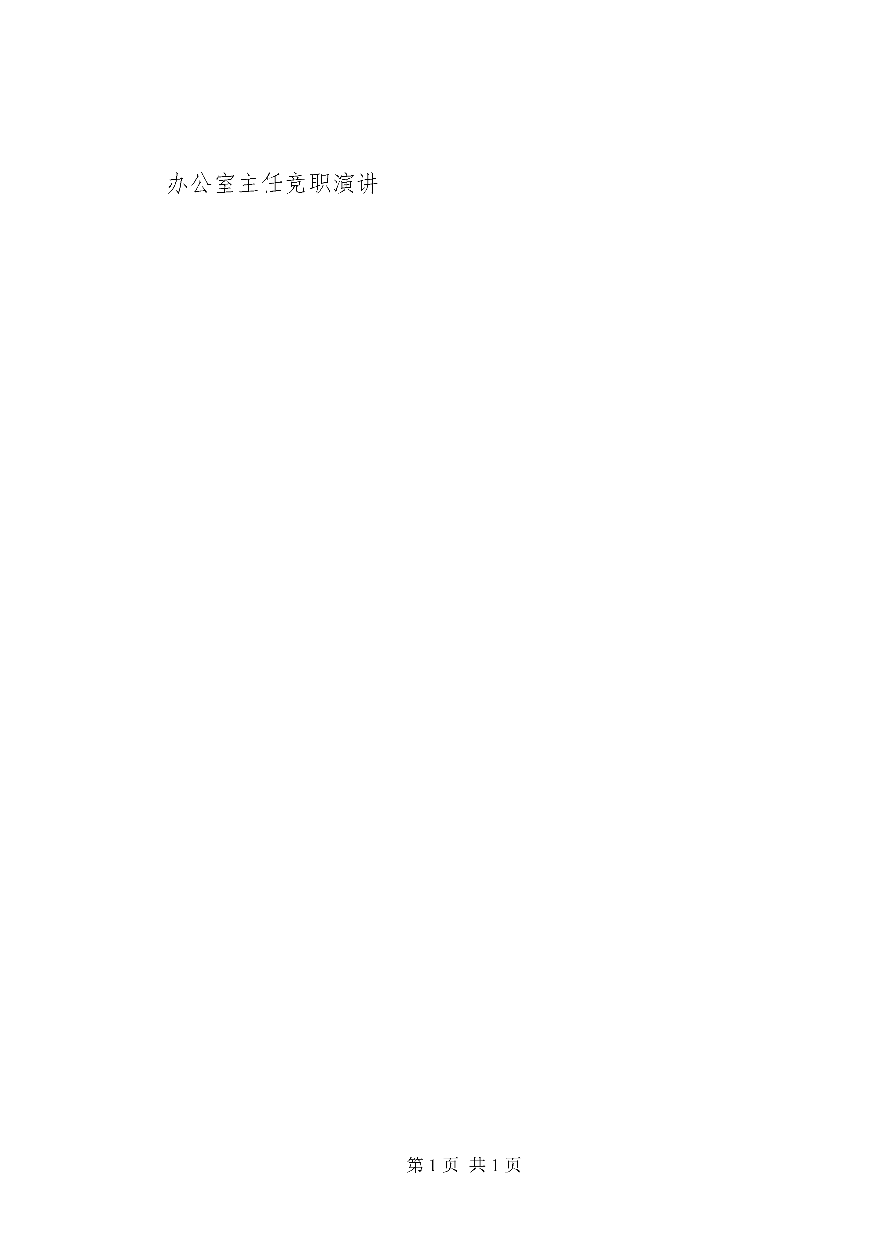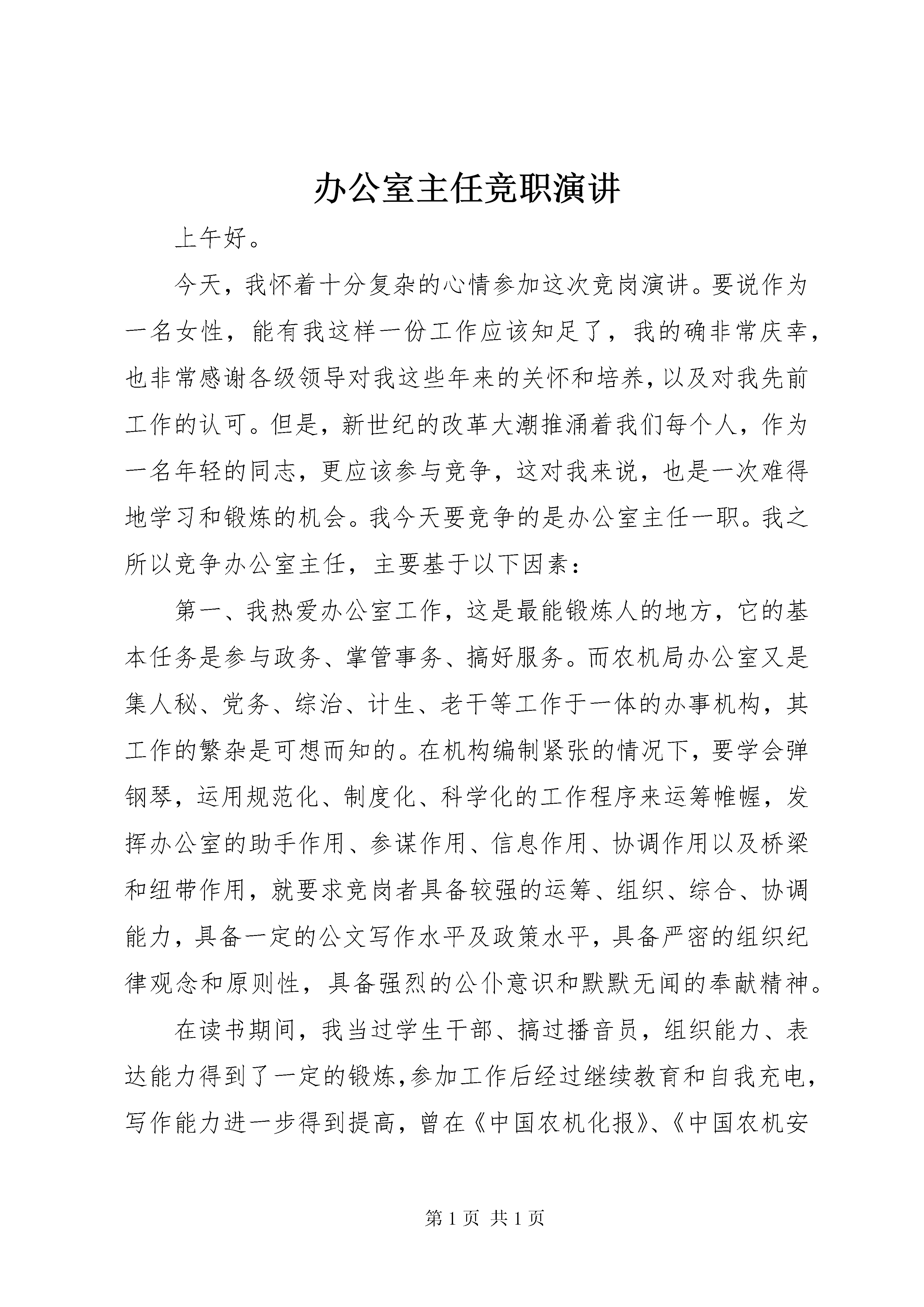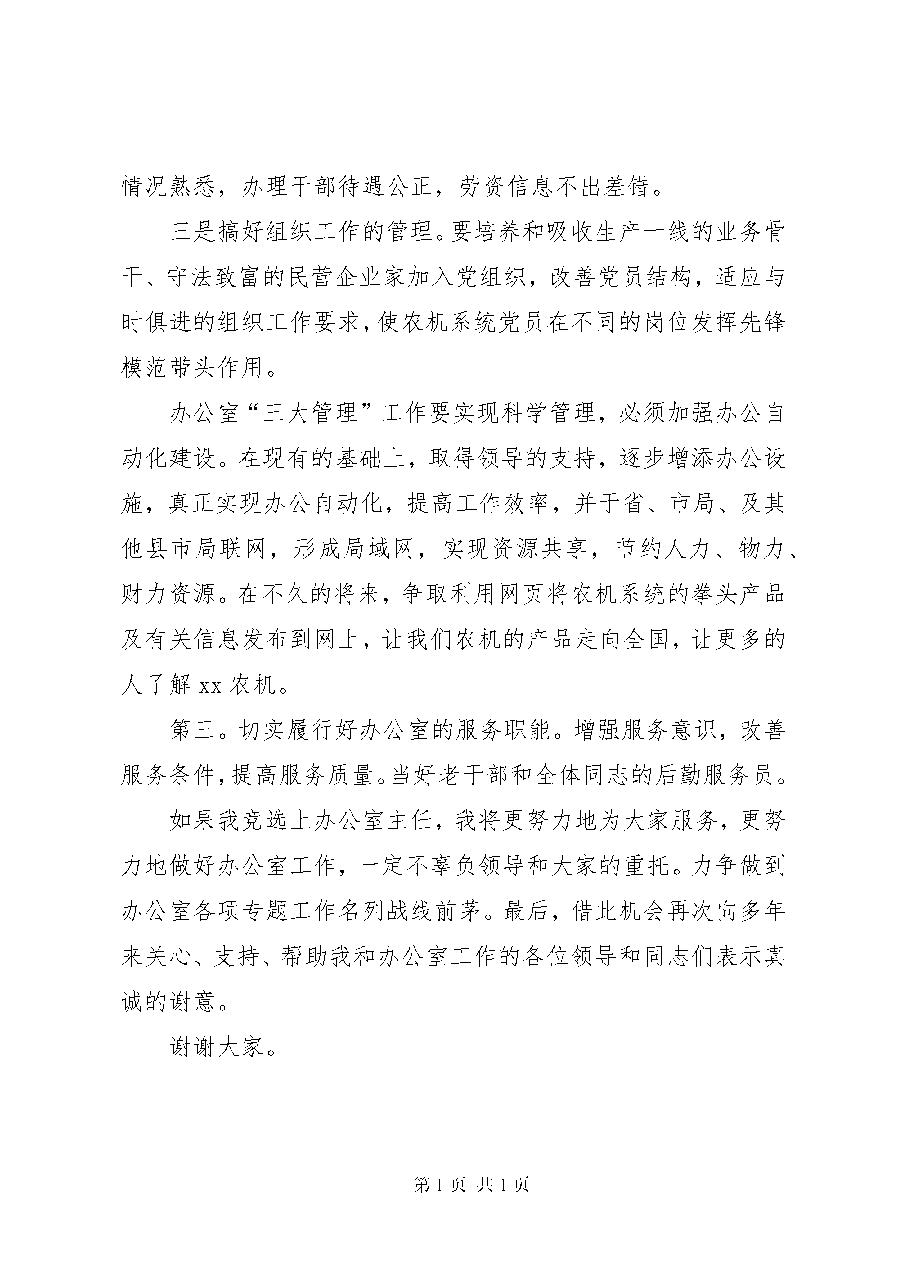 办公室主任竞职演讲上午好。今天,我怀着十分复杂的心情参加这次竞岗演讲。要说作为一名女性,能有我这样一份工作应该知足了,我的确非常庆幸,也非常感谢各级领导对我这些年来的关怀和培养,以及对我先前工作的认可。但是,新世纪的改革大潮推涌着我们每个人,作为一名年轻的同志,更应该参与竞争,这对我来说,也是一次难得地学习和锻炼的机会。我今天要竞争的是办公室主任一职。我之所以竞争办公室主任,主要基于以下因素:第一、我热爱办公室工作,这是最能锻炼人的地方,它的基本任务是参与政务、掌管事务、搞好服务。而农机局办公室又是集人秘、党务、综治、计生、老干等工作于一体的办事机构,其工作的繁杂是可想而知的。在机构编制紧张的情况下,要学会弹钢琴,运用规范化、制度化、科学化的工作程序来运筹帷幄,发挥办公室的助手作用、参谋作用、信息作用、协调作用以及桥梁和纽带作用,就要求竞岗者具备较强的运筹、组织、综合、协调能力,具备一定的公文写作水平及政策水平,具备严密的组织纪律观念和原则性,具备强烈的公仆意识和默默无闻的奉献精神。在读书期间,我当过学生干部、搞过播音员,组织能力、表达能力得到了一定的锻炼,参加工作后经过继续教育和自我充电,写作能力进一步得到提高,曾在《中国农机化报》、《中国农机安全报》、湖北人民广播电台及文学报刋杂志上发表多篇文章。在农机监理站档案管理和借用到组织部整理干部档案的工作经历以及近三年的局办公室科员工作实践,使我学到了必备的业务知识;第二、我能吃苦耐劳、恪尽职守、爱岗敬业,对搞好办公室主任工作充满着决心和信心。在十多年的基层工作中,我养成了对工作认真负责、兢兢业业,具有强烈的责任感的工作理念,具备了吃苦耐劳的精神。第三、已有的办公条件,原先的工作基础将给我带来工作上的较大便利。良好的办公环境,使我有了做好办公室工作的硬件基础。我对搞好办公室工作有以下几点设想:第一。加强机关建设,保持机关工作高效运转。一是以制度建设为重点,推进机关文明创建;二是协助分管领导开展丰富多彩的学习竞赛活动,营造良好学习氛围。三是协调好各股室关系,以增强机关活力。第二。搞好办公室管理工作,充分发挥办公室的中枢作用。主要抓好办公室“三大管理”,一是文书档案管理。争取两至三年内各项信息实现微机管理,使我局文书档案工作再上一个台阶。提高信息资源在经济工作、人事工作、职能工作中的利用价值。二是搞好劳动人事管理。做到政策领会准确,系统职工基本情况熟悉,办理干部待遇公正,劳资信息不出差错。三是搞好组织工作的管理。要培养和吸收生产一线的业务骨干、守法致富的民营企业家加入党组织,改善党员结构,适应与时俱进的组织工作要求,使农机系统党员在不同的岗位发挥先锋模范带头作用。办公室“三大管理”工作要实现科学管理,必须加强办公自动化建设。在现有的基础上,取得领导的支持,逐步增添办公设施,真正实现办公自动化,提高工作效率,并于省、市局、及其他县市局联网,形成局域网,实现资源共享,节约人力、物力、财力资源。在不久的将来,争取利用网页将农机系统的拳头产品及有关信息发布到网上,让我们农机的产品走向全国,让更多的人了解xx农机。第三。切实履行好办公室的服务职能。增强服务意识,改善服务条件,提高服务质量。当好老干部和全体同志的后勤服务员。如果我竞选上办公室主任,我将更努力地为大家服务,更努力地做好办公室工作,一定不辜负领导和大家的重托。力争做到办公室各项专题工作名列战线前茅。最后,借此机会再次向多年来关心、支持、帮助我和办公室工作的各位领导和同志们表示真诚的谢意。谢谢大家。办公室主任竞职演讲