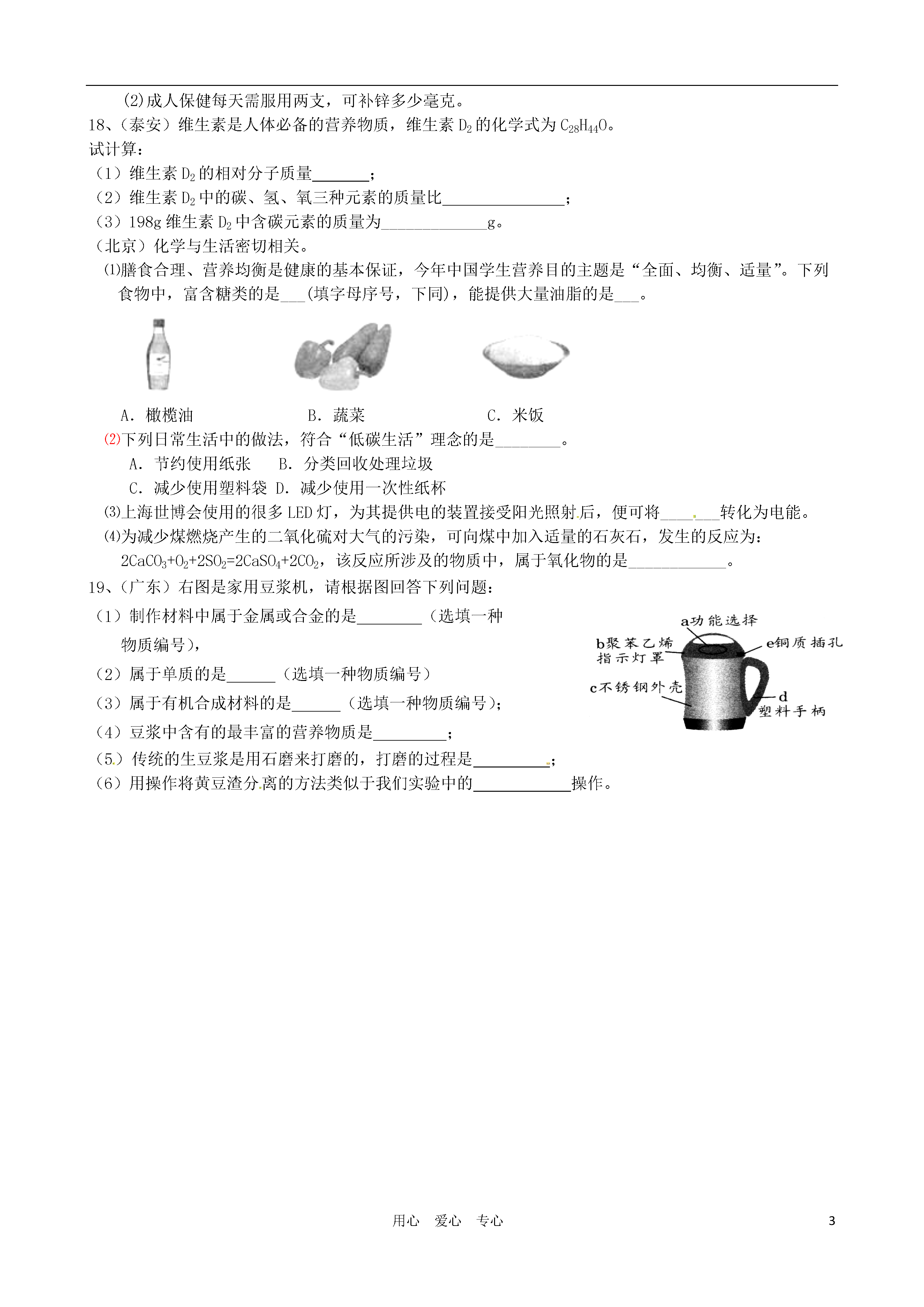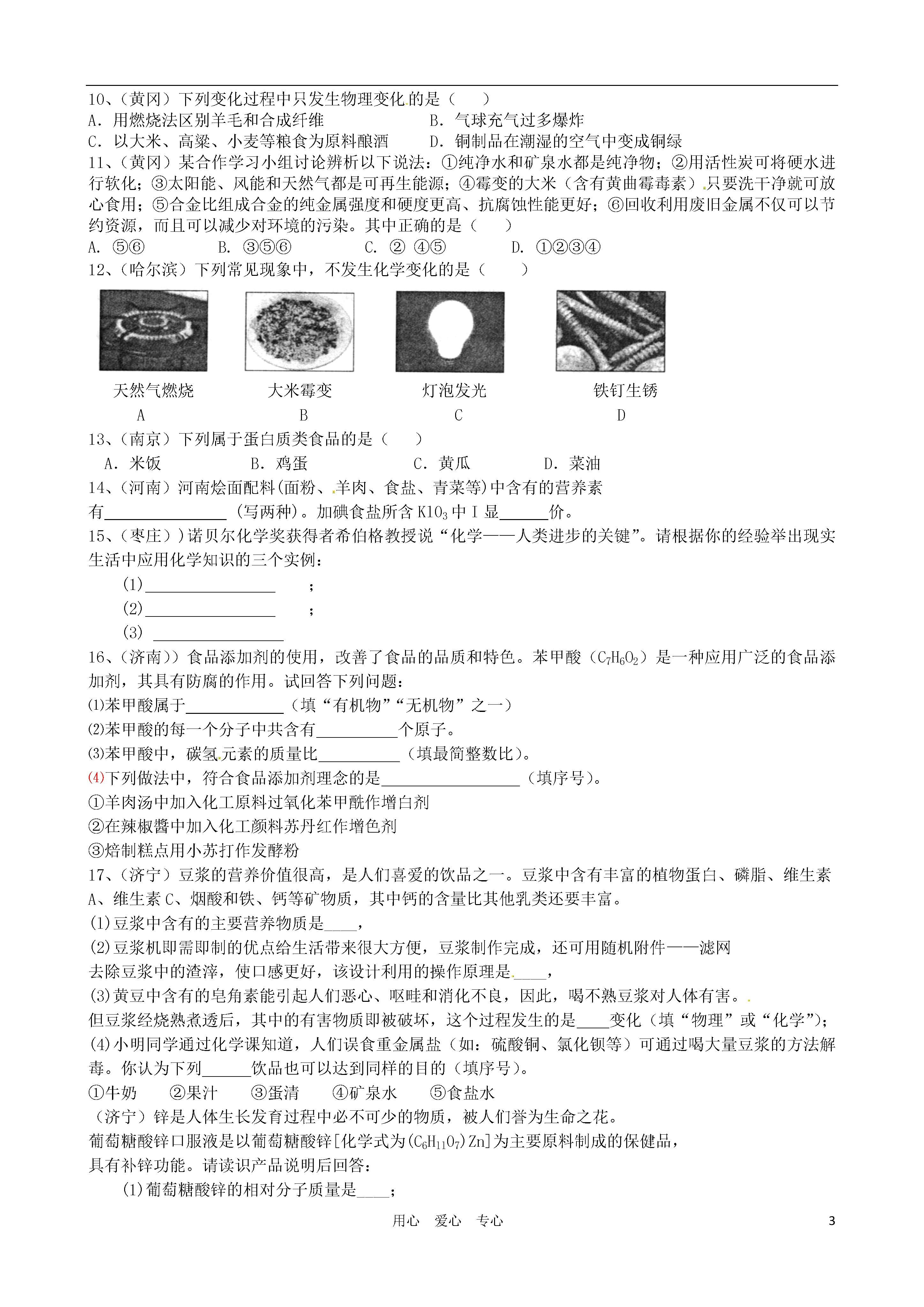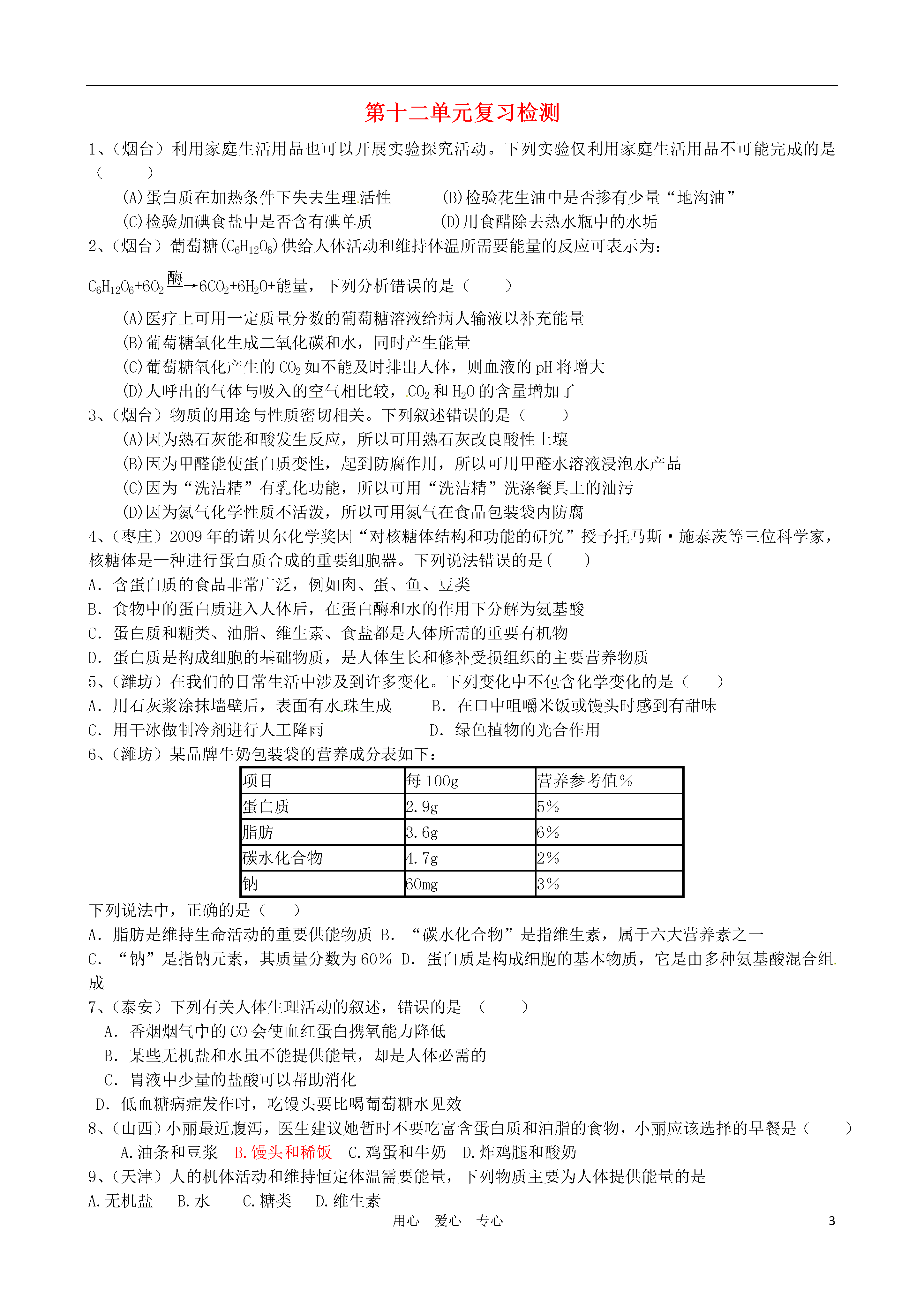 3用心爱心专心第十二单元复习检测1、(烟台)利用家庭生活用品也可以开展实验探究活动。下列实验仅利用家庭生活用品不可能完成的是()(A)蛋白质在加热条件下失去生理活性(B)检验花生油中是否掺有少量“地沟油”(C)检验加碘食盐中是否含有碘单质(D)用食醋除去热水瓶中的水垢2、(烟台)葡萄糖(C6H12O6)供给人体活动和维持体温所需要能量的反应可表示为:C6H12O6+6O2酶→6CO2+6H2O+能量,下列分析错误的是()(A)医疗上可用一定质量分数的葡萄糖溶液给病人输液以补充能量(B)葡萄糖氧化生成二氧化碳和水,同时产生能量(C)葡萄糖氧化产生的CO2如不能及时排出人体,则血液的pH将增大(D)人呼出的气体与吸入的空气相比较,CO2和H2O的含量增加了3、(烟台)物质的用途与性质密切相关。下列叙述错误的是()(A)因为熟石灰能和酸发生反应,所以可用熟石灰改良酸性土壤(B)因为甲醛能使蛋白质变性,起到防腐作用,所以可用甲醛水溶液浸泡水产品(C)因为“洗洁精”有乳化功能,所以可用“洗洁精”洗涤餐具上的油污(D)因为氮气化学性质不活泼,所以可用氮气在食品包装袋内防腐4、(枣庄)2009年的诺贝尔化学奖因“对核糖体结构和功能的研究”授予托马斯·施泰茨等三位科学家,核糖体是一种进行蛋白质合成的重要细胞器。下列说法错误的是()A.含蛋白质的食品非常广泛,例如肉、蛋、鱼、豆类B.食物中的蛋白质进入人体后,在蛋白酶和水的作用下分解为氨基酸C.蛋白质和糖类、油脂、维生素、食盐都是人体所需的重要有机物D.蛋白质是构成细胞的基础物质,是人体生长和修补受损组织的主要营养物质5、(潍坊)在我们的日常生活中涉及到许多变化。下列变化中不包含化学变化的是()A.用石灰浆涂抹墙壁后,表面有水珠生成B.在口中咀嚼米饭或馒头时感到有甜味C.用干冰做制冷剂进行人工降雨D.绿色植物的光合作用6、(潍坊)某品牌牛奶包装袋的营养成分表如下:项目每100g营养参考值%蛋白质2.9g5%脂肪3.6g6%碳水化合物4.7g2%钠60mg3%下列说法中,正确的是()A.脂肪是维持生命活动的重要供能物质B.“碳水化合物”是指维生素,属于六大营养素之一C.“钠”是指钠元素,其质量分数为60%D.蛋白质是构成细胞的基本物质,它是由多种氨基酸混合组成7、(泰安)下列有关人体生理活动的叙述,错误的是()A.香烟烟气中的CO会使血红蛋白携氧能力降低B.某些无机盐和水虽不能提供能量,却是人体必需的C.胃液中少量的盐酸可以帮助消化D.低血糖病症发作时,吃馒头要比喝葡萄糖水见效8、(山西)小丽最近腹泻,医生建议她暂时不要吃富含蛋白质和油脂的食物,小丽应该选择的早餐是()A.油条和豆浆B.馒头和稀饭C.鸡蛋和牛奶D.炸鸡腿和酸奶9、(天津)人的机体活动和维持恒定体温需要能量,下列物质主要为人体提供能量的是A.无机盐B.水C.糖类D.维生素10、(黄冈)下列变化过程中只发生物理变化的是()A.用燃烧法区别羊毛和合成纤维B.气球充气过多爆炸C.以大米、高粱、小麦等粮食为原料酿酒D.铜制品在潮湿的空气中变成铜绿11、(黄冈)某合作学习小组讨论辨析以下说法:①纯净水和矿泉水都是纯净物;②用活性炭可将硬水进行软化;③太阳能、风能和天然气都是可再生能源;④霉变的大米(含有黄曲霉毒素)只要洗干净就可放心食用;⑤合金比组成合金的纯金属强度和硬度更高、抗腐蚀性能更好;⑥回收利用废旧金属不仅可以节约资源,而且可以减少对环境的污染。其中正确的是()A.⑤⑥B.③⑤⑥C.②④⑤D.①②③④12、(哈尔滨)下列常见现象中,不发生化学变化的是()www.zk5u.com中考资源网天然气燃烧大米霉变灯泡发光铁钉生锈ABCD13、(南京)下列属于蛋白质类食品的是()A.米饭B.鸡蛋C.黄瓜D.菜油14、(河南)河南烩面配料(面粉、羊肉、食盐、青菜等)中含有的营养素有(写两种)。加碘食盐所含Kl03中I显价。15、(枣庄))诺贝尔化学奖获得者希伯格教授说“化学——人类进步的关键”。请根据你的经验举出现实生活中应用化学知识的三个实例:(1);(2);(3)16、(济南))食品添加剂的使用,改善了食品的品质和特色。苯甲酸(C7H6O2)是一种应用广泛的食品添加剂,其具有防腐的作用。试回答下列问题:⑴苯甲酸属于(填“有机物”“无机物”之一)⑵苯甲酸的每一个分子中共含有个原子。⑶苯甲酸中,碳氢元素的质量比(填最简整数比)。⑷下列做法中,符合食品添加剂理念的是(填序号)。①羊肉汤中加入化工原料过氧化苯甲酰作增白剂②在辣椒醬中加入化工颜料苏丹红作增色剂③焙制糕点用小苏打作发酵粉17、(济宁)豆浆的营养价值很高,是人们喜爱的