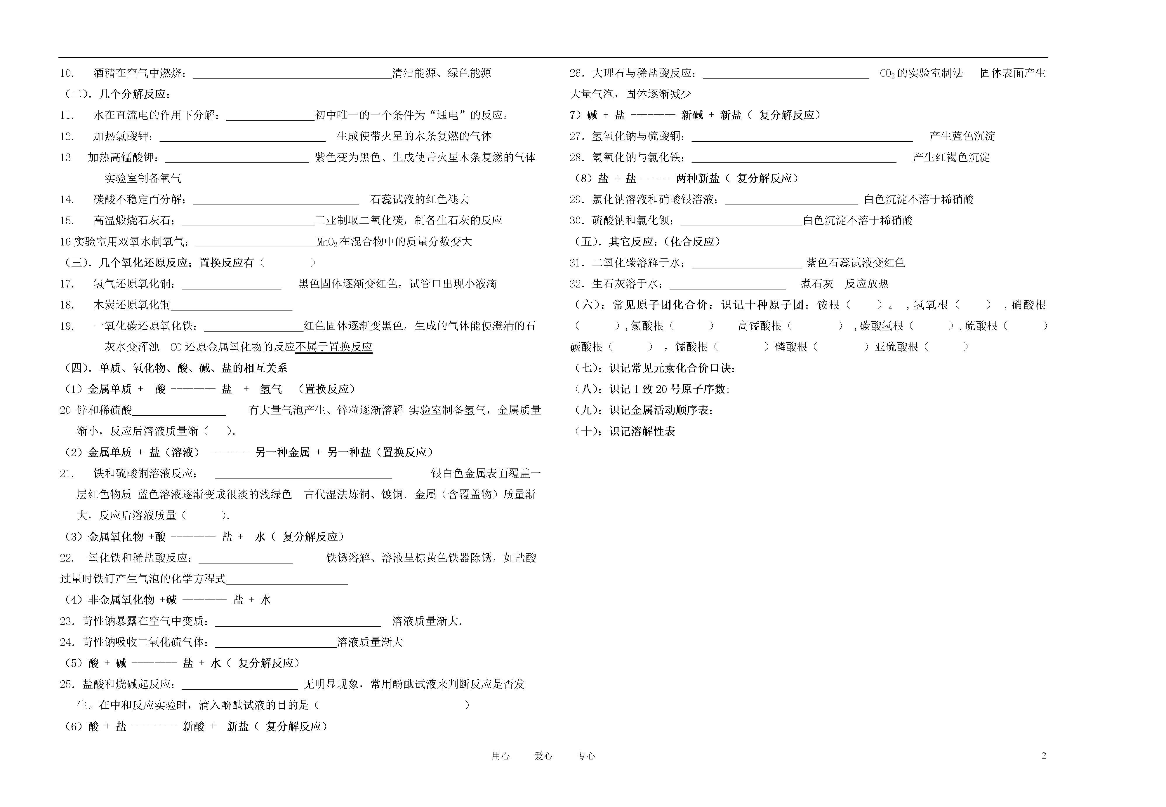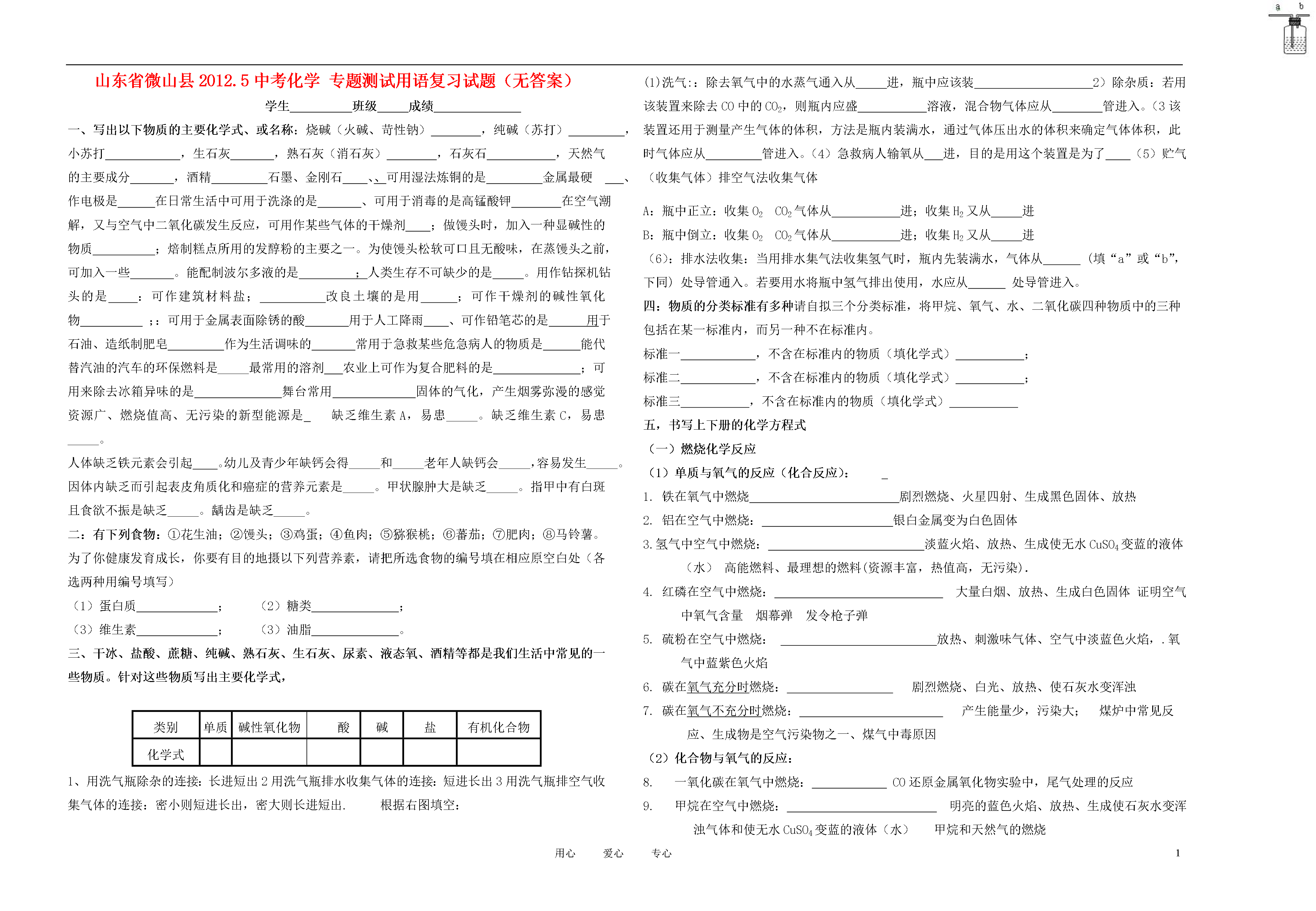 2用心爱心专心山东省微山县2012.5中考化学专题测试用语复习试题(无答案)学生班级成绩一、写出以下物质的主要化学式、或名称:烧碱(火碱、苛性钠),纯碱(苏打),小苏打,生石灰,熟石灰(消石灰),石灰石,天然气的主要成分,酒精石墨、金刚石、、可用湿法炼铜的是金属最硬、作电极是在日常生活中可用于洗涤的是、可用于消毒的是高锰酸钾在空气潮解,又与空气中二氧化碳发生反应,可用作某些气体的干燥剂;做馒头时,加入一种显碱性的物质;焙制糕点所用的发醇粉的主要之一。为使馒头松软可口且无酸味,在蒸馒头之前,可加入一些。能配制波尔多液的是;人类生存不可缺少的是。用作钻探机钻头的是:可作建筑材料盐;改良土壤的是用;可作干燥剂的碱性氧化物;:可用于金属表面除锈的酸用于人工降雨、可作铅笔芯的是用于石油、造纸制肥皂作为生活调味的常用于急救某些危急病人的物质是能代替汽油的汽车的环保燃料是_____最常用的溶剂农业上可作为复合肥料的是;可用来除去冰箱异味的是舞台常用固体的气化,产生烟雾弥漫的感觉资源广、燃烧值高、无污染的新型能源是缺乏维生素A,易患_____。缺乏维生素C,易患_____。人体缺乏铁元素会引起。幼儿及青少年缺钙会得_____和_____老年人缺钙会_____,容易发生_____。因体内缺乏而引起表皮角质化和癌症的营养元素是_____。甲状腺肿大是缺乏_____。指甲中有白斑且食欲不振是缺乏_____。龋齿是缺乏_____。二:有下列食物:①花生油;②馒头;③鸡蛋;④鱼肉;⑤猕猴桃;⑥蕃茄;⑦肥肉;⑧马铃薯。为了你健康发育成长,你要有目的地摄以下列营养素,请把所选食物的编号填在相应原空白处(各选两种用编号填写)(1)蛋白质;(2)糖类;(3)维生素;(3)油脂。三、干冰、盐酸、蔗糖、纯碱、熟石灰、生石灰、尿素、液态氧、酒精等都是我们生活中常见的一些物质。针对这些物质写出主要化学式,类别单质碱性氧化物酸碱盐有机化合物化学式1、用洗气瓶除杂的连接:长进短出2用洗气瓶排水收集气体的连接:短进长出3用洗气瓶排空气收集气体的连接:密小则短进长出,密大则长进短出.根据右图填空:(1)洗气::除去氧气中的水蒸气通入从进,瓶中应该装2)除杂质:若用该装置来除去CO中的CO2,则瓶内应盛溶液,混合物气体应从管进入。(3该装置还用于测量产生气体的体积,方法是瓶内装满水,通过气体压出水的体积来确定气体体积,此时气体应从管进入。(4)急救病人输氧从进,目的是用这个装置是为了(5)贮气(收集气体)排空气法收集气体A:瓶中正立:收集O2CO2气体从进;收集H2又从进B:瓶中倒立:收集O2CO2气体从进;收集H2又从进(6):排水法收集:当用排水集气法收集氢气时,瓶内先装满水,气体从(填“a”或“b”,下同)处导管通入。若要用水将瓶中氢气排出使用,水应从处导管进入。四:物质的分类标准有多种请自拟三个分类标准,将甲烷、氧气、水、二氧化碳四种物质中的三种包括在某一标准内,而另一种不在标准内。标准一,不含在标准内的物质(填化学式);标准二,不含在标准内的物质(填化学式);标准三,不含在标准内的物质(填化学式)五,书写上下册的化学方程式(一)燃烧化学反应(1)单质与氧气的反应(化合反应):1.铁在氧气中燃烧剧烈燃烧、火星四射、生成黑色固体、放热2.铝在空气中燃烧:银白金属变为白色固体3.氢气中空气中燃烧:淡蓝火焰、放热、生成使无水CuSO4变蓝的液体(水)高能燃料、最理想的燃料(资源丰富,热值高,无污染).4.红磷在空气中燃烧:大量白烟、放热、生成白色固体证明空气中氧气含量烟幕弹发令枪子弹5.硫粉在空气中燃烧:放热、刺激味气体、空气中淡蓝色火焰,.氧气中蓝紫色火焰6.碳在氧气充分时燃烧:剧烈燃烧、白光、放热、使石灰水变浑浊7.碳在氧气不充分时燃烧:产生能量少,污染大;煤炉中常见反应、生成物是空气污染物之一、煤气中毒原因(2)化合物与氧气的反应:8.一氧化碳在氧气中燃烧:CO还原金属氧化物实验中,尾气处理的反应9.甲烷在空气中燃烧:明亮的蓝色火焰、放热、生成使石灰水变浑浊气体和使无水CuSO4变蓝的液体(水)甲烷和天然气的燃烧10.酒精在空气中燃烧:清洁能源、绿色能源(二).几个分解反应:11.水在直流电的作用下分解:初中唯一的一个条件为“通电”的反应。12.加热氯酸钾:生成使带火星的木条复燃的气体13加热高锰酸钾:紫色变为黑色、生成使带火星木条复燃的气体实验室制备氧气14.碳酸不稳定而分解:石蕊试液的红色褪去15.高温煅烧石灰石:工业制取二氧化碳,制备生石灰的反应16实验室用双氧水制氧气:MnO2在混合物中的质量分数变大(三).几个氧化还原反应:置换反应有()17.氢气还原氧化铜:黑色固体逐渐变红色,试管口出现小液滴18.木炭还原氧化铜19.一氧化碳还原氧化铁:红色固体逐渐变黑色,