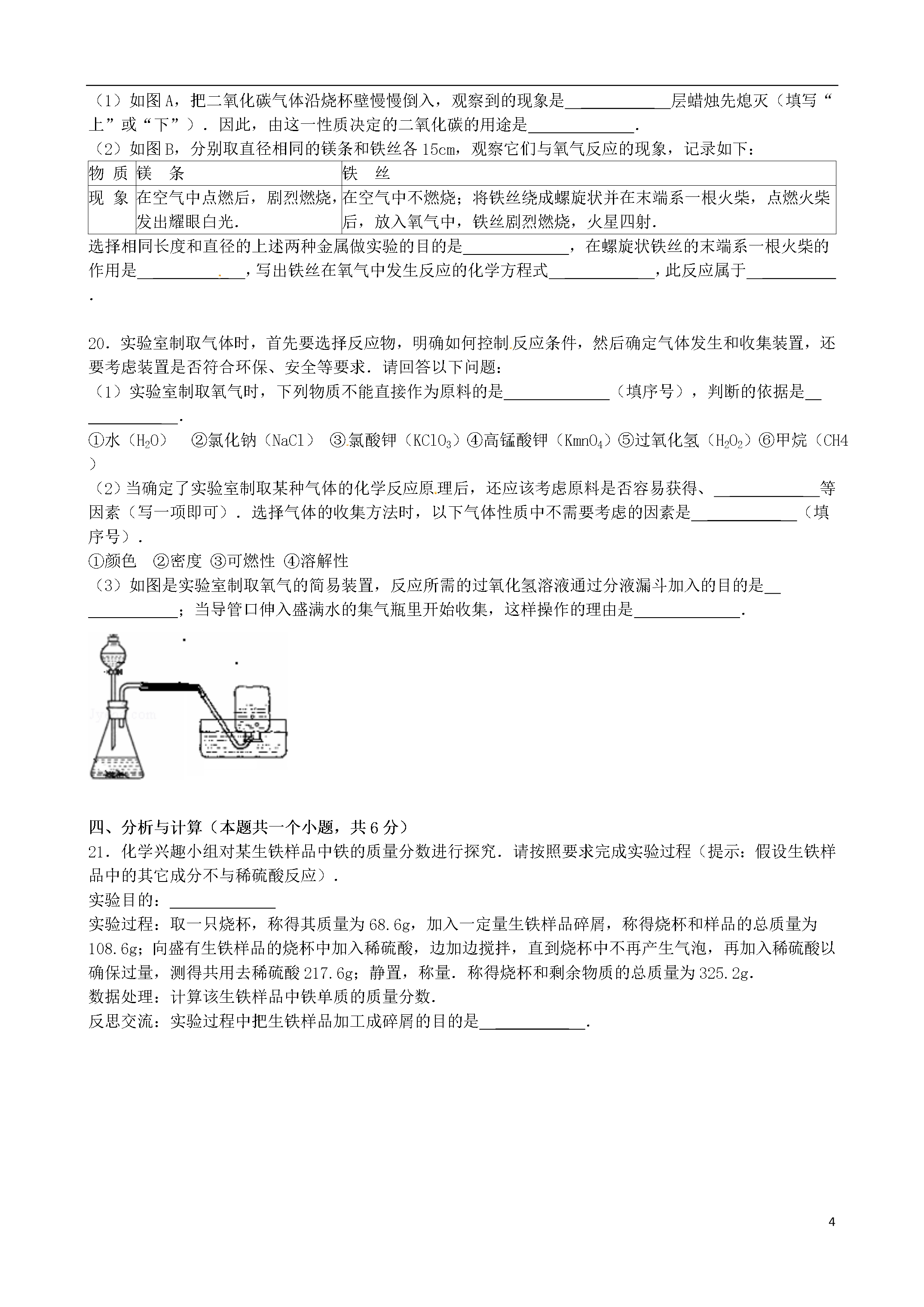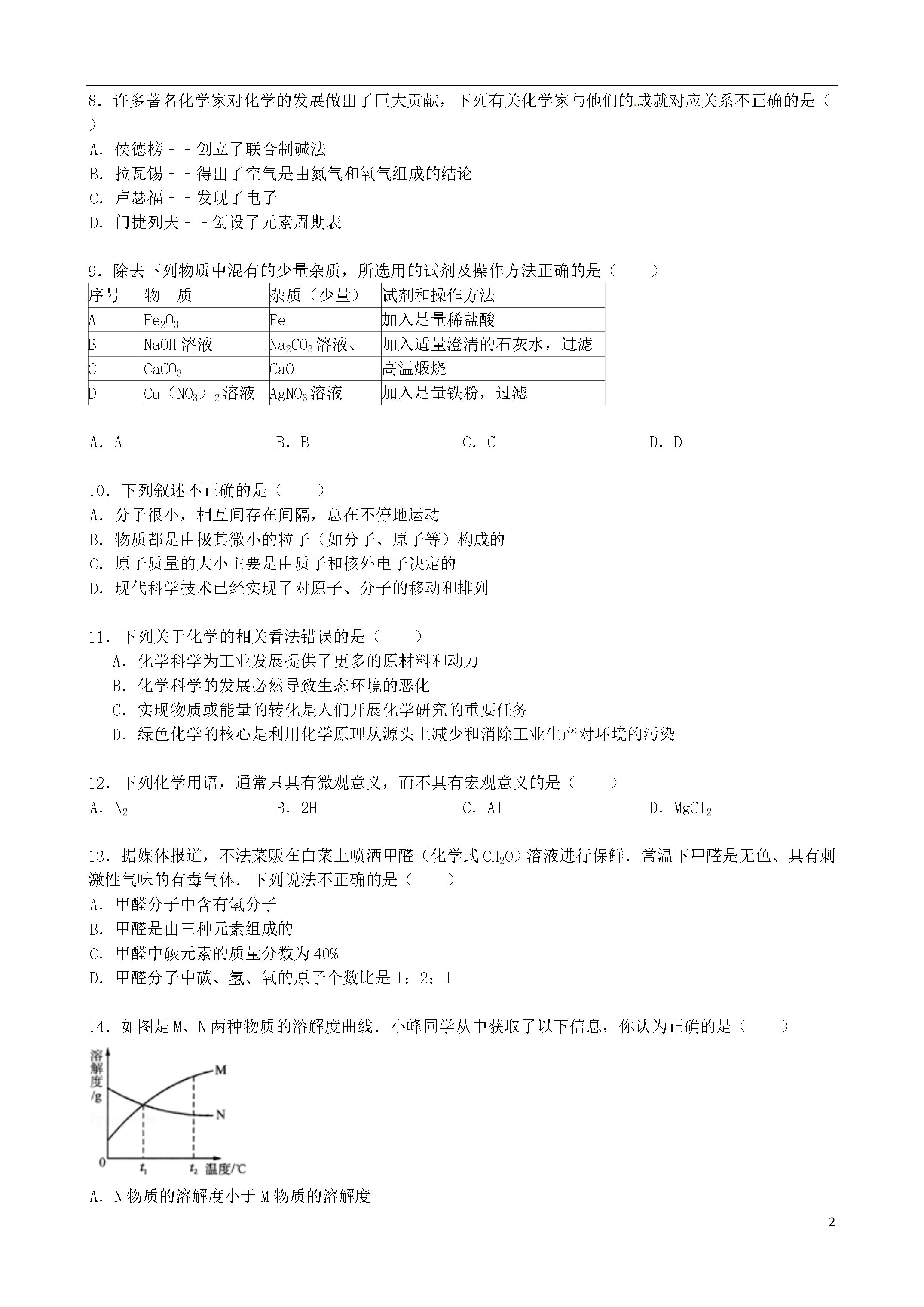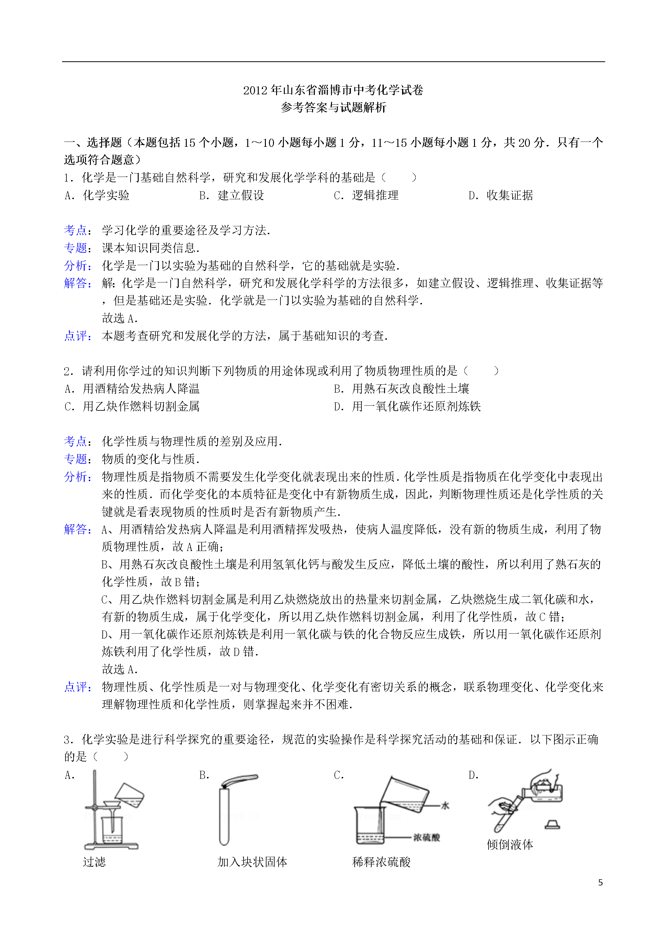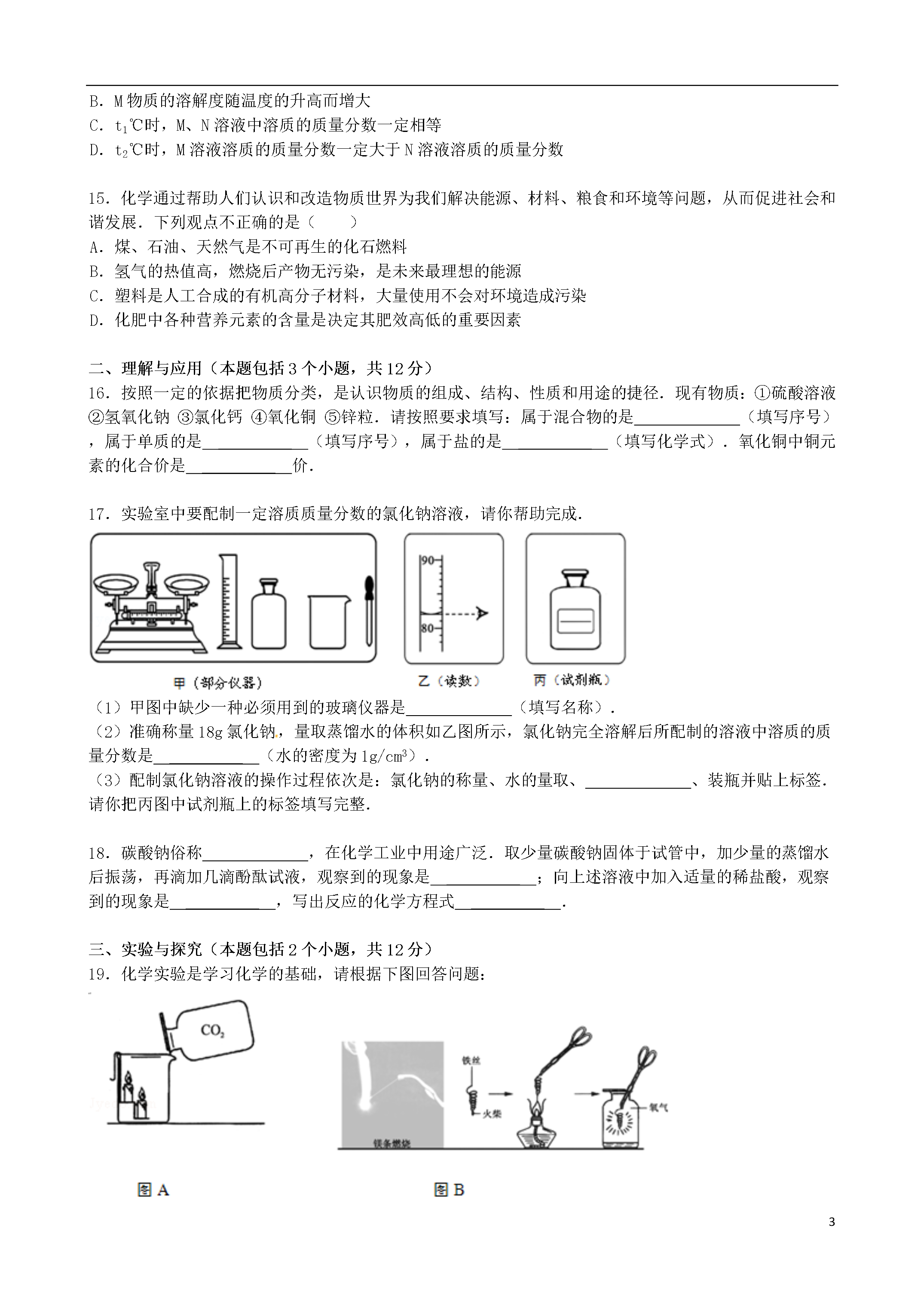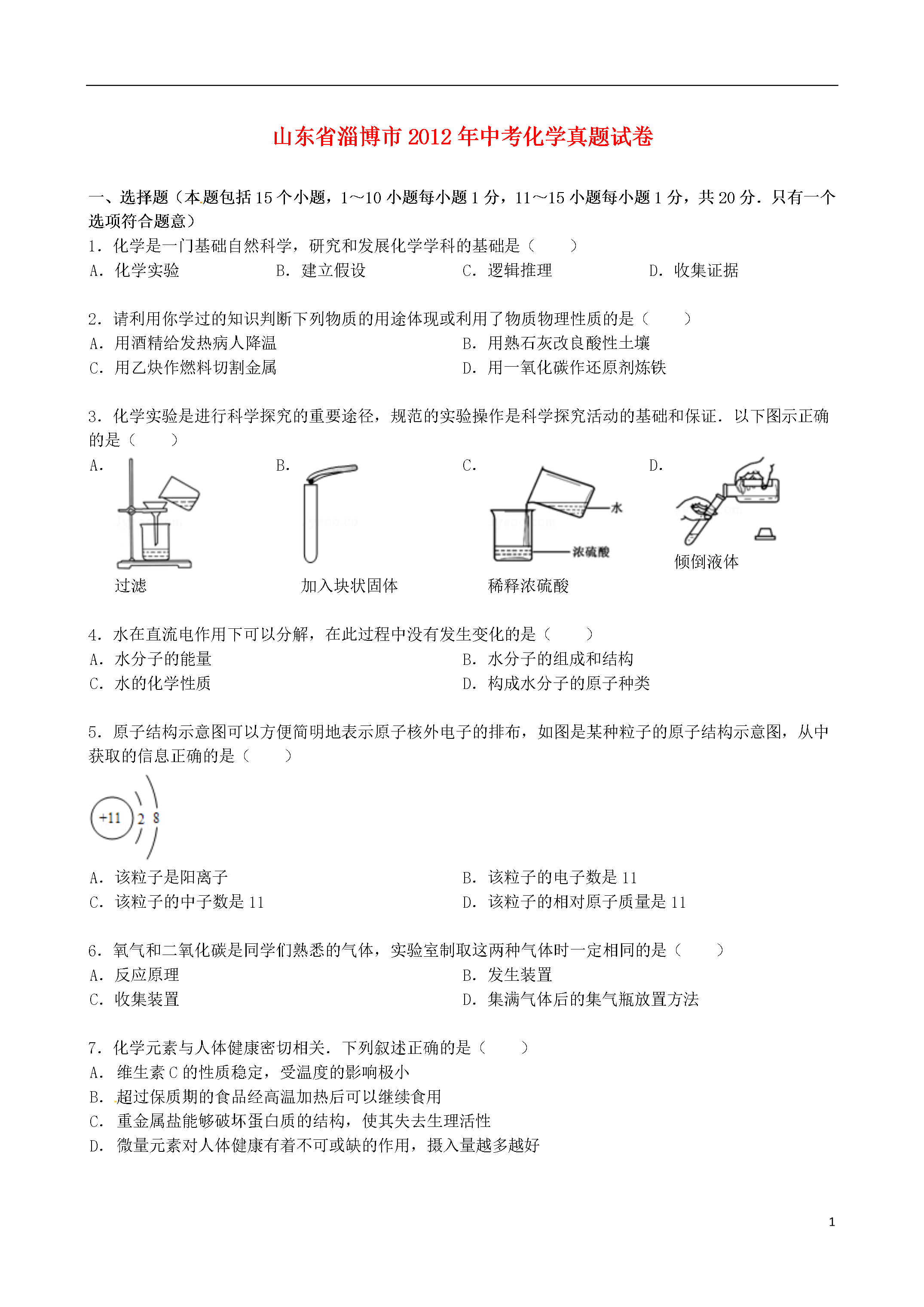 15山东省淄博市2012年中考化学真题试卷一、选择题(本题包括15个小题,1~10小题每小题1分,11~15小题每小题1分,共20分.只有一个选项符合题意)1.化学是一门基础自然科学,研究和发展化学学科的基础是()A.化学实验B.建立假设C.逻辑推理D.收集证据2.请利用你学过的知识判断下列物质的用途体现或利用了物质物理性质的是()A.用酒精给发热病人降温B.用熟石灰改良酸性土壤C.用乙炔作燃料切割金属D.用一氧化碳作还原剂炼铁3.化学实验是进行科学探究的重要途径,规范的实验操作是科学探究活动的基础和保证.以下图示正确的是()A.过滤B.加入块状固体C.稀释浓硫酸D.倾倒液体4.水在直流电作用下可以分解,在此过程中没有发生变化的是()A.水分子的能量B.水分子的组成和结构C.水的化学性质D.构成水分子的原子种类5.原子结构示意图可以方便简明地表示原子核外电子的排布,如图是某种粒子的原子结构示意图,从中获取的信息正确的是()A.该粒子是阳离子B.该粒子的电子数是11C.该粒子的中子数是11D.该粒子的相对原子质量是116.氧气和二氧化碳是同学们熟悉的气体,实验室制取这两种气体时一定相同的是()A.反应原理B.发生装置C.收集装置D.集满气体后的集气瓶放置方法7.化学元素与人体健康密切相关.下列叙述正确的是()A.维生素C的性质稳定,受温度的影响极小B.超过保质期的食品经高温加热后可以继续食用C.重金属盐能够破坏蛋白质的结构,使其失去生理活性D.微量元素对人体健康有着不可或缺的作用,摄入量越多越好8.许多著名化学家对化学的发展做出了巨大贡献,下列有关化学家与他们的成就对应关系不正确的是()A.侯德榜﹣﹣创立了联合制碱法B.拉瓦锡﹣﹣得出了空气是由氮气和氧气组成的结论C.卢瑟福﹣﹣发现了电子D.门捷列夫﹣﹣创设了元素周期表9.除去下列物质中混有的少量杂质,所选用的试剂及操作方法正确的是()序号物质杂质(少量)试剂和操作方法AFe2O3Fe加入足量稀盐酸BNaOH溶液Na2CO3溶液、加入适量澄清的石灰水,过滤CCaCO3CaO高温煅烧DCu(NO3)2溶液AgNO3溶液加入足量铁粉,过滤A.AB.BC.CD.D10.下列叙述不正确的是()A.分子很小,相互间存在间隔,总在不停地运动B.物质都是由极其微小的粒子(如分子、原子等)构成的C.原子质量的大小主要是由质子和核外电子决定的D.现代科学技术已经实现了对原子、分子的移动和排列11.下列关于化学的相关看法错误的是()A.化学科学为工业发展提供了更多的原材料和动力B.化学科学的发展必然导致生态环境的恶化C.实现物质或能量的转化是人们开展化学研究的重要任务D.绿色化学的核心是利用化学原理从源头上减少和消除工业生产对环境的污染12.下列化学用语,通常只具有微观意义,而不具有宏观意义的是()A.N2B.2HC.AlD.MgCl213.据媒体报道,不法菜贩在白菜上喷洒甲醛(化学式CH2O)溶液进行保鲜.常温下甲醛是无色、具有刺激性气味的有毒气体.下列说法不正确的是()A.甲醛分子中含有氢分子B.甲醛是由三种元素组成的C.甲醛中碳元素的质量分数为40%D.甲醛分子中碳、氢、氧的原子个数比是1:2:114.如图是M、N两种物质的溶解度曲线.小峰同学从中获取了以下信息,你认为正确的是()A.N物质的溶解度小于M物质的溶解度B.M物质的溶解度随温度的升高而增大C.t1℃时,M、N溶液中溶质的质量分数一定相等D.t2℃时,M溶液溶质的质量分数一定大于N溶液溶质的质量分数15.化学通过帮助人们认识和改造物质世界为我们解决能源、材料、粮食和环境等问题,从而促进社会和谐发展.下列观点不正确的是()A.煤、石油、天然气是不可再生的化石燃料B.氢气的热值高,燃烧后产物无污染,是未来最理想的能源C.塑料是人工合成的有机高分子材料,大量使用不会对环境造成污染D.化肥中各种营养元素的含量是决定其肥效高低的重要因素二、理解与应用(本题包括3个小题,共12分)16.按照一定的依据把物质分类,是认识物质的组成、结构、性质和用途的捷径.现有物质:①硫酸溶液②氢氧化钠③氯化钙④氧化铜⑤锌粒.请按照要求填写:属于混合物的是_________(填写序号),属于单质的是_________(填写序号),属于盐的是_________(填写化学式).氧化铜中铜元素的化合价是_________价.17.实验室中要配制一定溶质质量分数的氯化钠溶液,请你帮助完成.(1)甲图中缺少一种必须用到的玻璃仪器是_________(填写名称).(2)准确称量18g氯化钠,量取蒸馏水的体积如乙图所示,氯化钠完全溶解后所配制的溶液中溶质的质量分数是_________(水的密度为1g/cm3).(3)配制氯化钠溶液的操作过程依次是:氯化钠的称量、水的量取、___