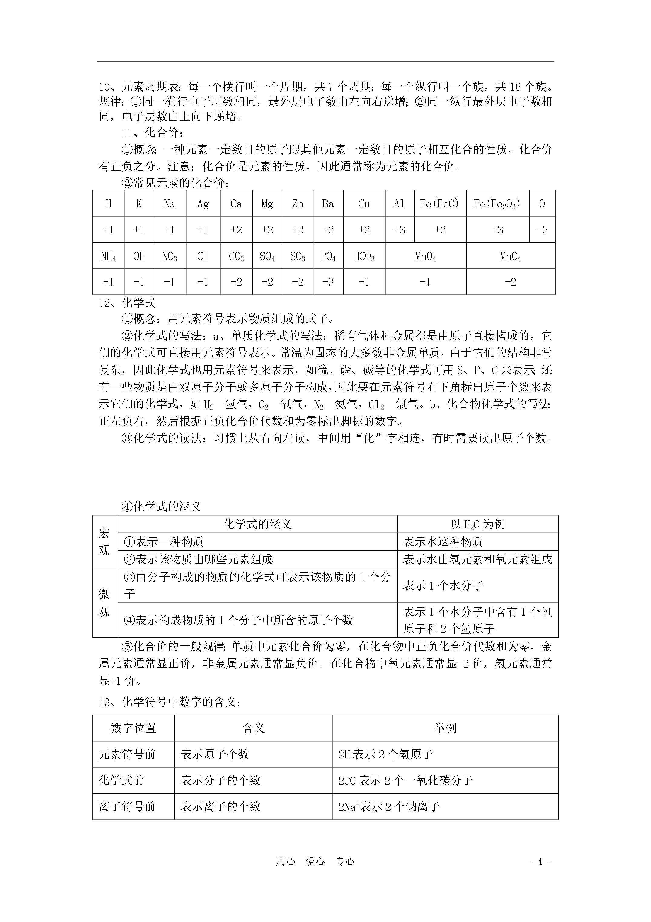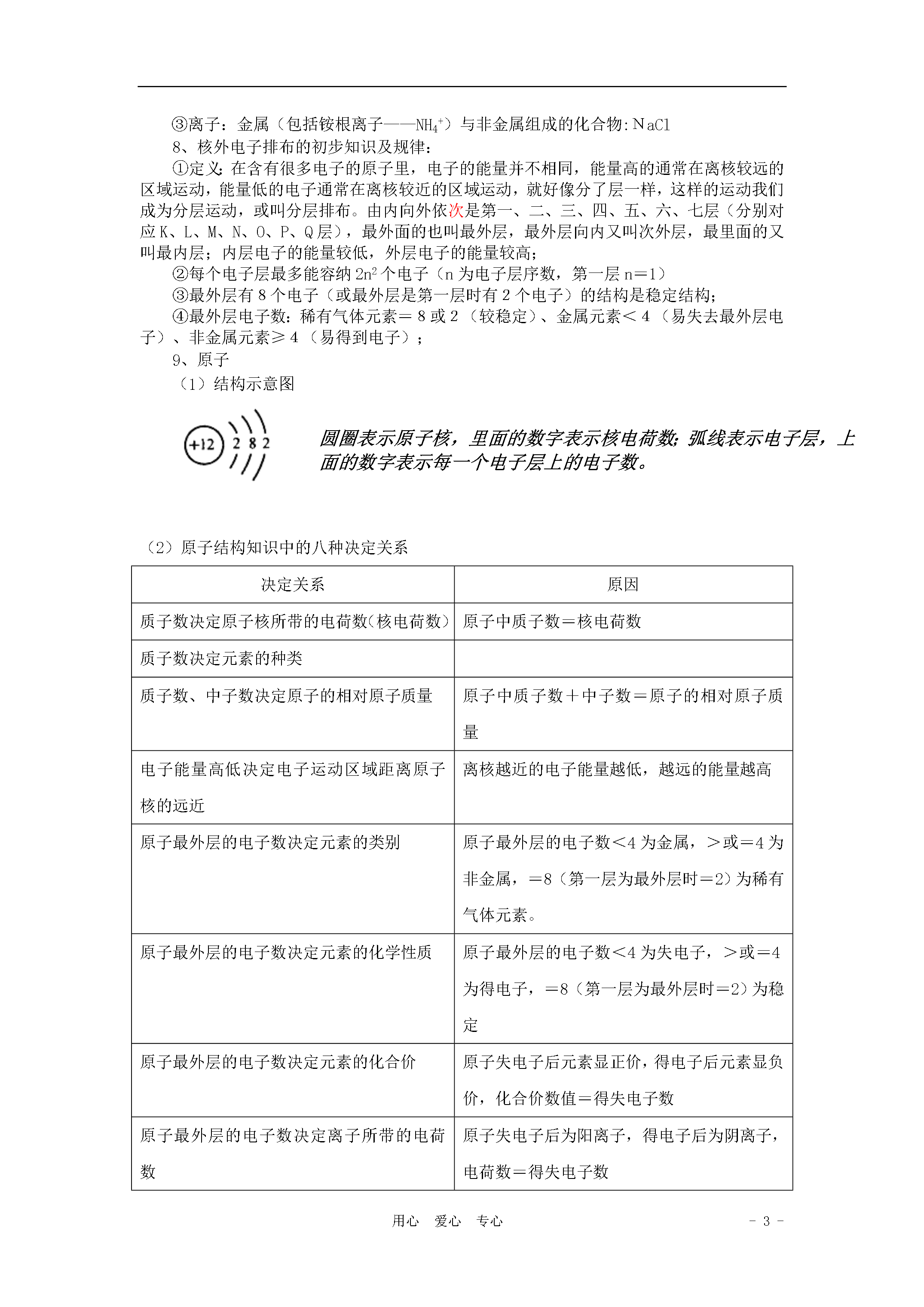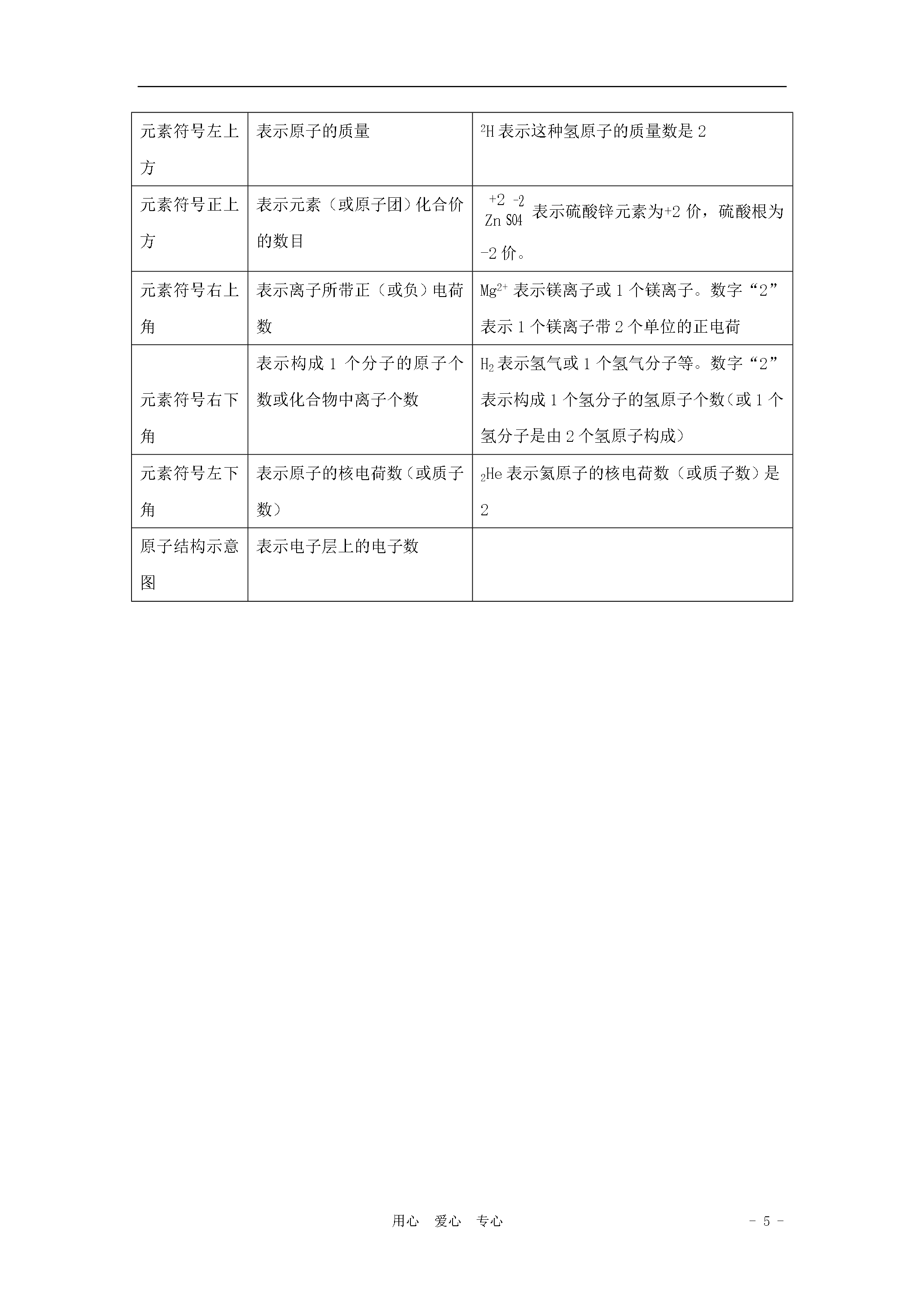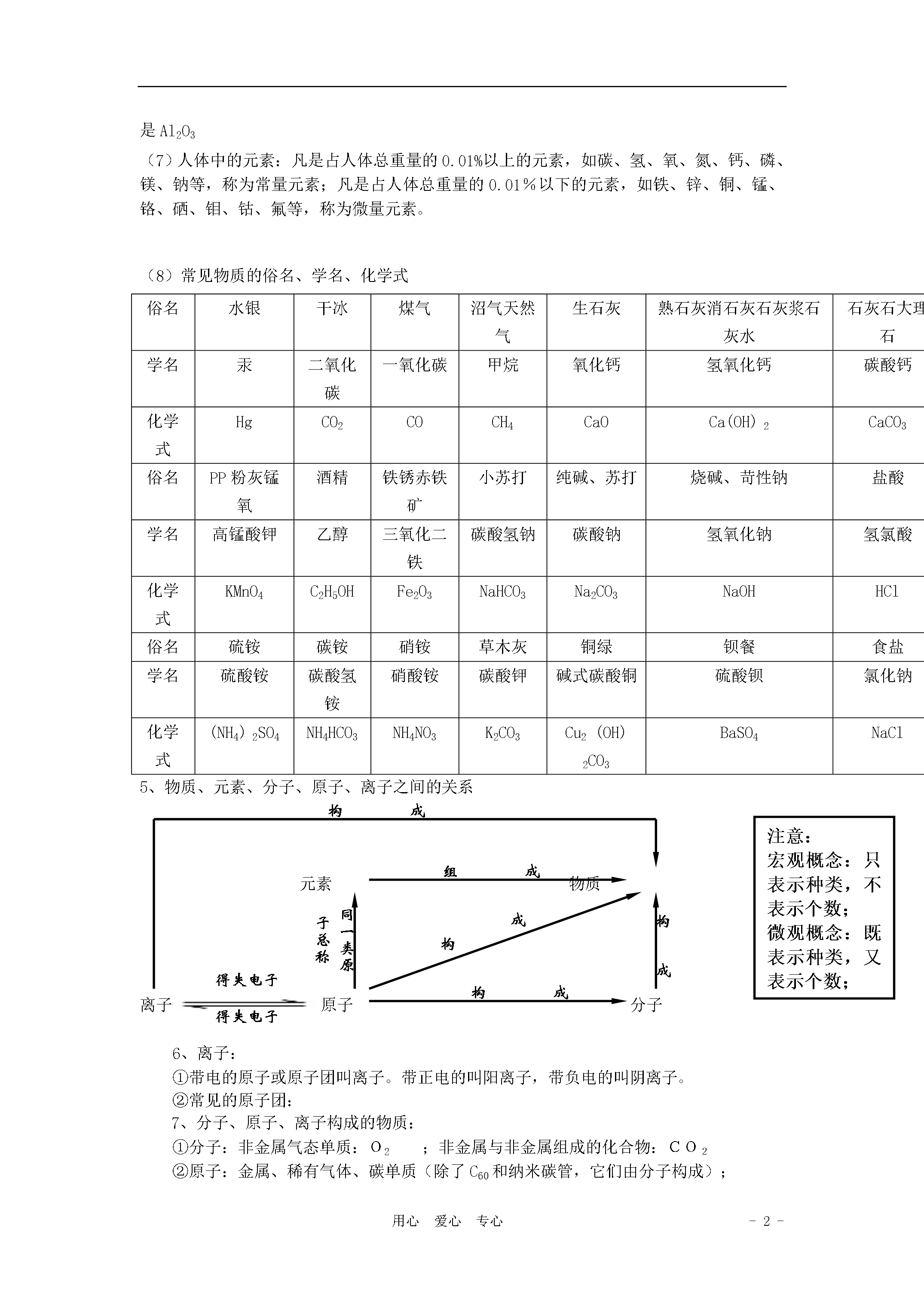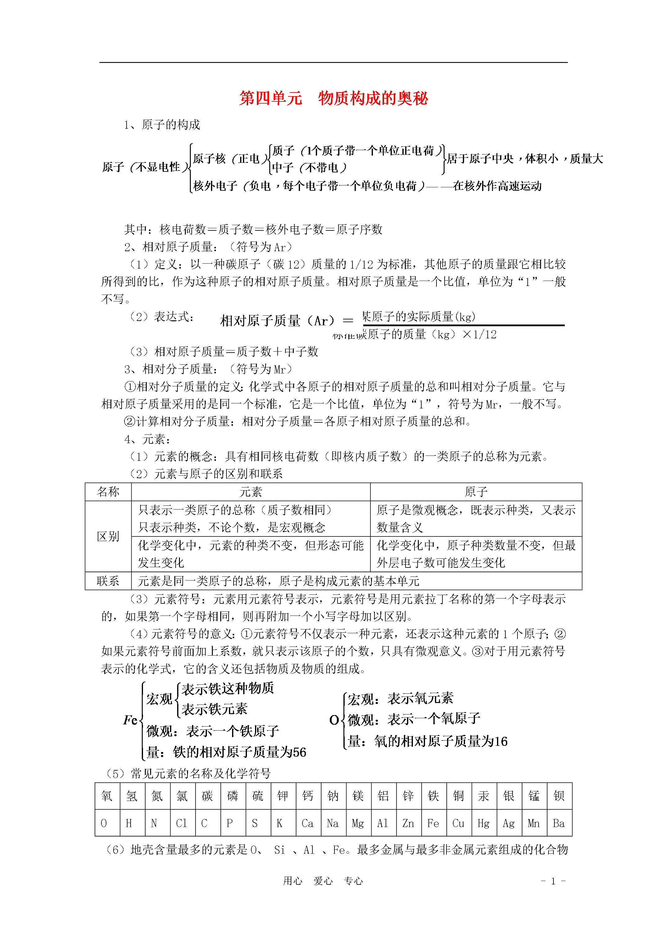 -5-用心爱心专心第四单元物质构成的奥秘1、原子的构成其中:核电荷数=质子数=核外电子数=原子序数2、相对原子质量:(符号为Ar)(1)定义:以一种碳原子(碳12)质量的1/12为标准,其他原子的质量跟它相比较所得到的比,作为这种原子的相对原子质量。相对原子质量是一个比值,单位为“1”一般不写。相对原子质量(Ar)=(2)表达式:某原子的实际质量(kg)标准碳原子的质量(kg)×1/12(3)相对原子质量=质子数+中子数3、相对分子质量:(符号为Mr)①相对分子质量的定义:化学式中各原子的相对原子质量的总和叫相对分子质量。它与相对原子质量采用的是同一个标准,它是一个比值,单位为“1”,符号为Mr,一般不写。②计算相对分子质量:相对分子质量=各原子相对原子质量的总和。4、元素:(1)元素的概念:具有相同核电荷数(即核内质子数)的一类原子的总称为元素。(2)元素与原子的区别和联系名称元素原子区别只表示一类原子的总称(质子数相同)只表示种类,不论个数,是宏观概念原子是微观概念,既表示种类,又表示数量含义化学变化中,元素的种类不变,但形态可能发生变化化学变化中,原子种类数量不变,但最外层电子数可能发生变化联系元素是同一类原子的总称,原子是构成元素的基本单元(3)元素符号:元素用元素符号表示,元素符号是用元素拉丁名称的第一个字母表示的,如果第一个字母相同,则再附加一个小写字母加以区别。(4)元素符号的意义:①元素符号不仅表示一种元素,还表示这种元素的1个原子;②如果元素符号前面加上系数,就只表示该原子的个数,只具有微观意义。③对于用元素符号表示的化学式,它的含义还包括物质及物质的组成。(5)常见元素的名称及化学符号氧氢氮氯碳磷硫钾钙钠镁铝锌铁铜汞银锰钡OHNClCPSKCaNaMgAlZnFeCuHgAgMnBa(6)地壳含量最多的元素是O、Si、Al、Fe。最多金属与最多非金属元素组成的化合物是Al2O3(7)人体中的元素:凡是占人体总重量的0.01%以上的元素,如碳、氢、氧、氮、钙、磷、镁、钠等,称为常量元素;凡是占人体总重量的0.01%以下的元素,如铁、锌、铜、锰、铬、硒、钼、钴、氟等,称为微量元素。(8)常见物质的俗名、学名、化学式俗名水银干冰煤气沼气天然气生石灰熟石灰消石灰石灰浆石灰水石灰石大理石学名汞二氧化碳一氧化碳甲烷氧化钙氢氧化钙碳酸钙化学式HgCO2COCH4CaOCa(OH)2CaCO3俗名PP粉灰锰氧酒精铁锈赤铁矿小苏打纯碱、苏打烧碱、苛性钠盐酸学名高锰酸钾乙醇三氧化二铁碳酸氢钠碳酸钠氢氧化钠氢氯酸化学式KMnO4C2H5OHFe2O3NaHCO3Na2CO3NaOHHCl俗名硫铵碳铵硝铵草木灰铜绿钡餐食盐学名硫酸铵碳酸氢铵硝酸铵碳酸钾碱式碳酸铜硫酸钡氯化钠化学式(NH4)2SO4NH4HCO3NH4NO3K2CO3Cu2(OH)2CO3BaSO4NaCl得失电子得失电子同一类原子总称构成组成构成构成构成5、物质、元素、分子、原子、离子之间的关系注意:宏观概念:只表示种类,不表示个数;微观概念:既表示种类,又表示个数;元素物质离子原子分子6、离子:①带电的原子或原子团叫离子。带正电的叫阳离子,带负电的叫阴离子。②常见的原子团:7、分子、原子、离子构成的物质:①分子:非金属气态单质:O2;非金属与非金属组成的化合物:CO2②原子:金属、稀有气体、碳单质(除了C60和纳米碳管,它们由分子构成);③离子:金属(包括铵根离子——NH4+)与非金属组成的化合物:NaCl8、核外电子排布的初步知识及规律:①定义:在含有很多电子的原子里,电子的能量并不相同,能量高的通常在离核较远的区域运动,能量低的电子通常在离核较近的区域运动,就好像分了层一样,这样的运动我们成为分层运动,或叫分层排布。由内向外依次是第一、二、三、四、五、六、七层(分别对应K、L、M、N、O、P、Q层),最外面的也叫最外层,最外层向内又叫次外层,最里面的又叫最内层;内层电子的能量较低,外层电子的能量较高;②每个电子层最多能容纳2n2个电子(n为电子层序数,第一层n=1)③最外层有8个电子(或最外层是第一层时有2个电子)的结构是稳定结构;④最外层电子数:稀有气体元素=8或2(较稳定)、金属元素<4(易失去最外层电子)、非金属元素≥4(易得到电子);9、原子(1)结构示意图圆圈表示原子核,里面的数字表示核电荷数;弧线表示电子层,上面的数字表示每一个电子层上的电子数。(2)原子结构知识中的八种决定关系决定关系原因质子数决定原子核所带的电荷数(核电荷数)原子中质子数=核电荷数质子数决定元素的种类质子数、中子数决定原子的相对原子质量原子中质子数+中子数=原子的相对原子质量电子能量高低决定电子运动区域距离原子核的远近离核越近的电子能量越低,越远的能量越高原子最外层的电子数决