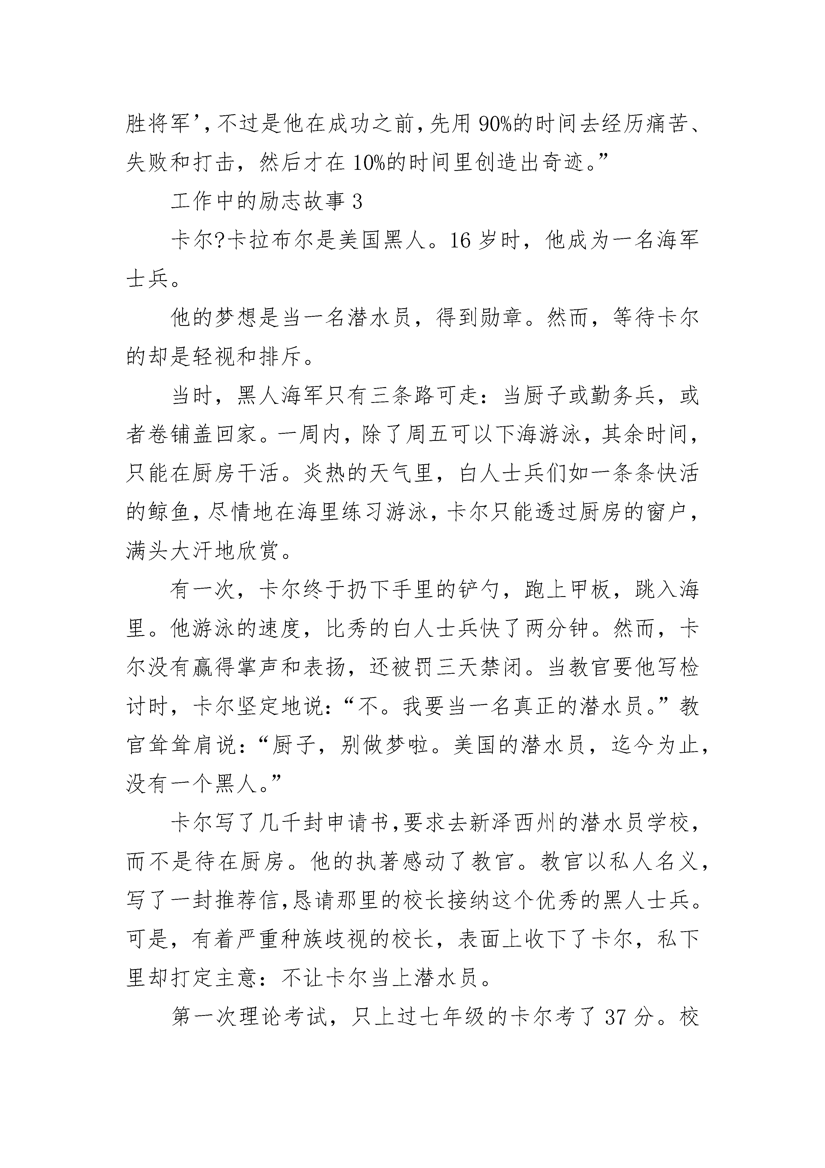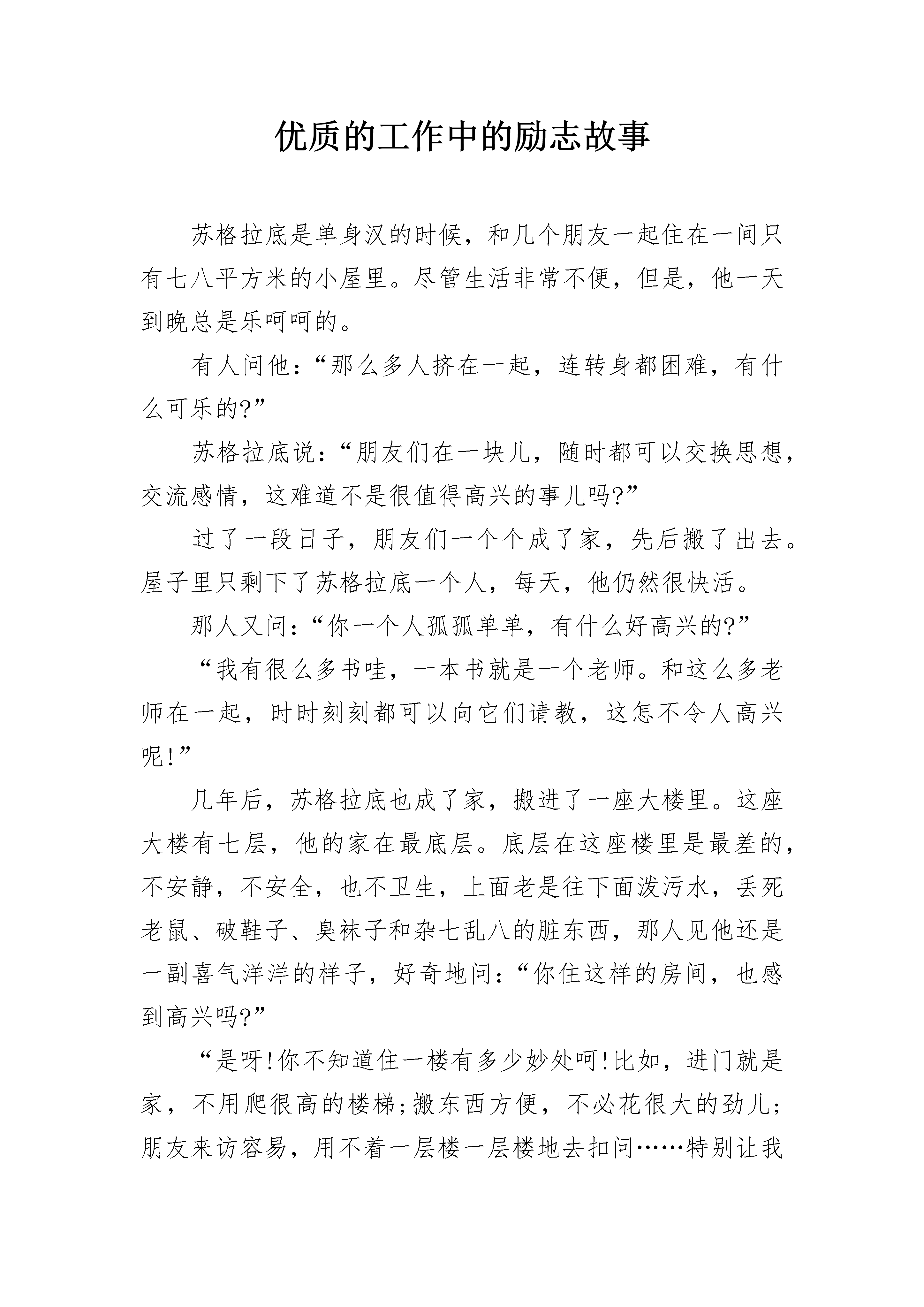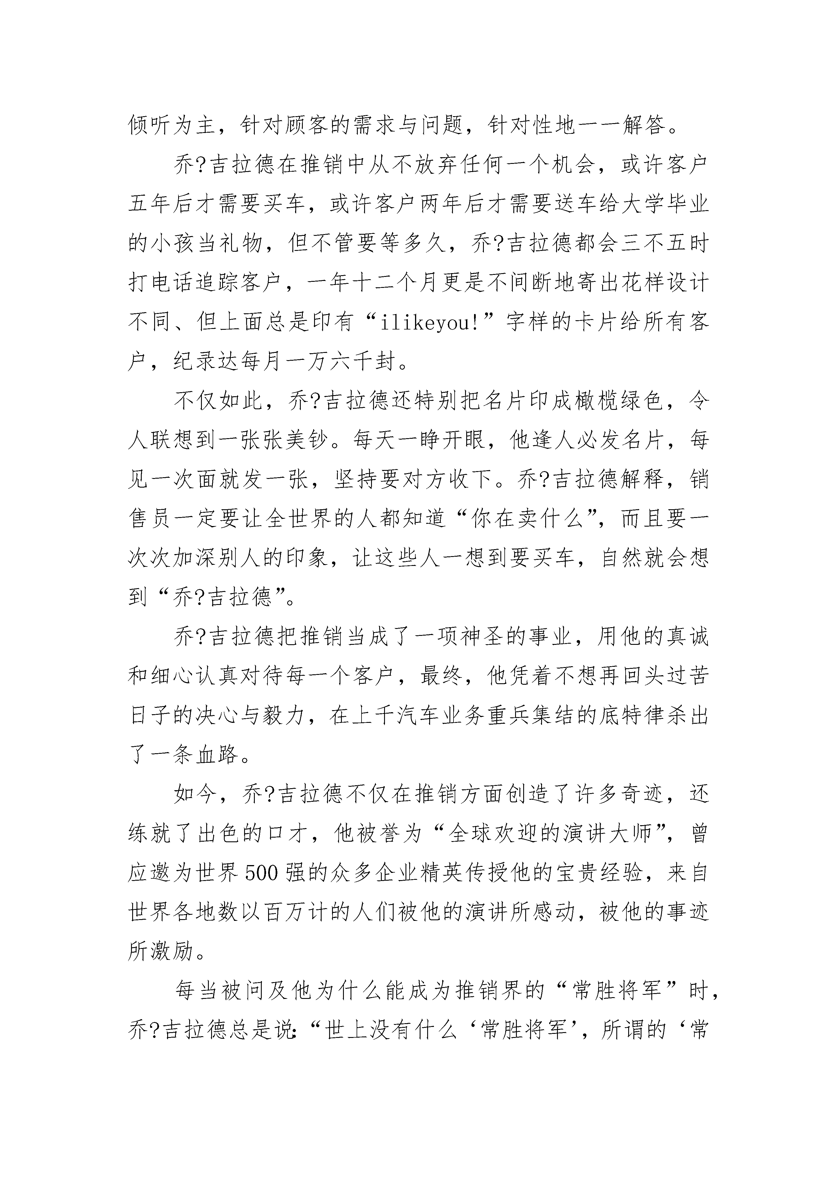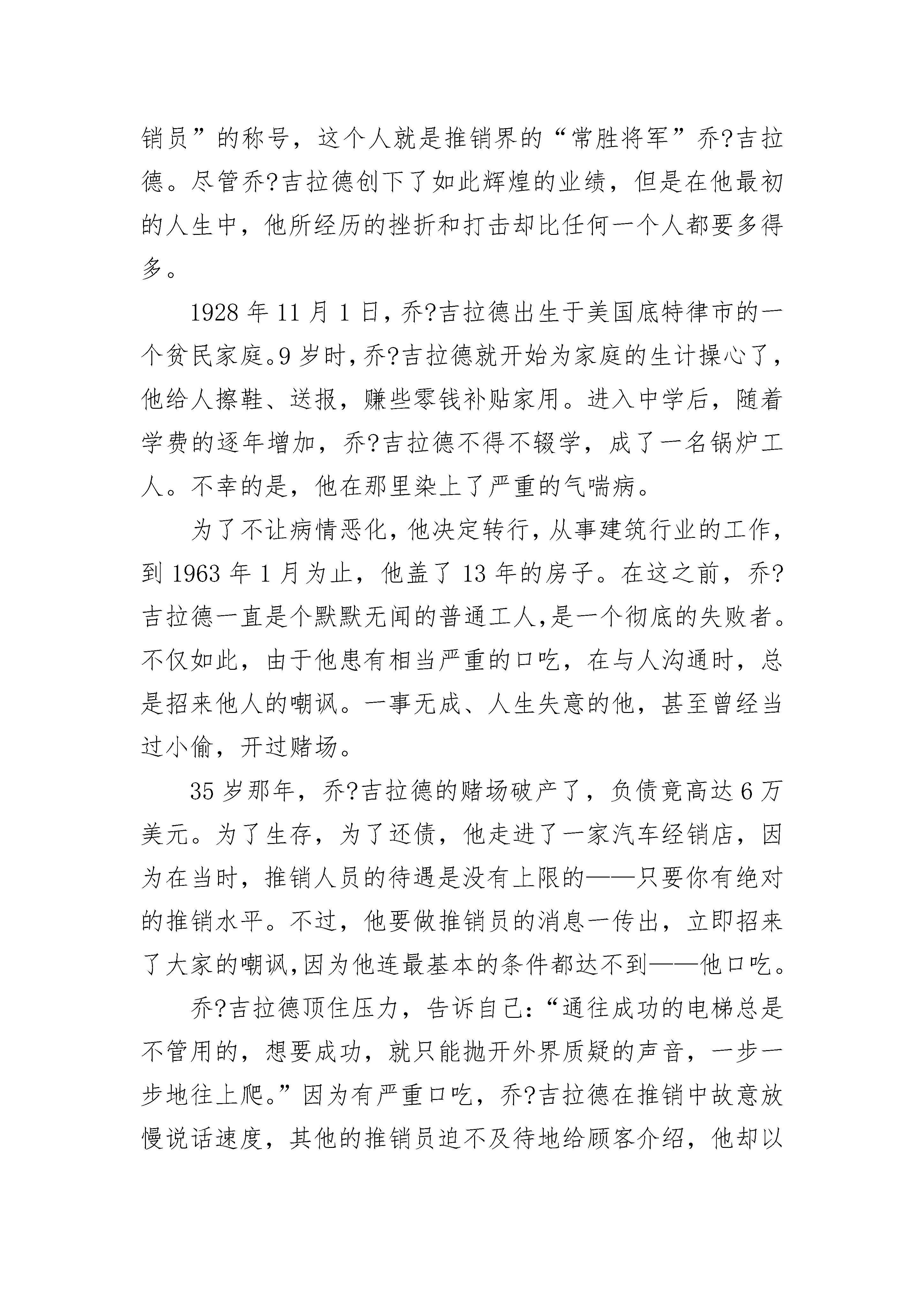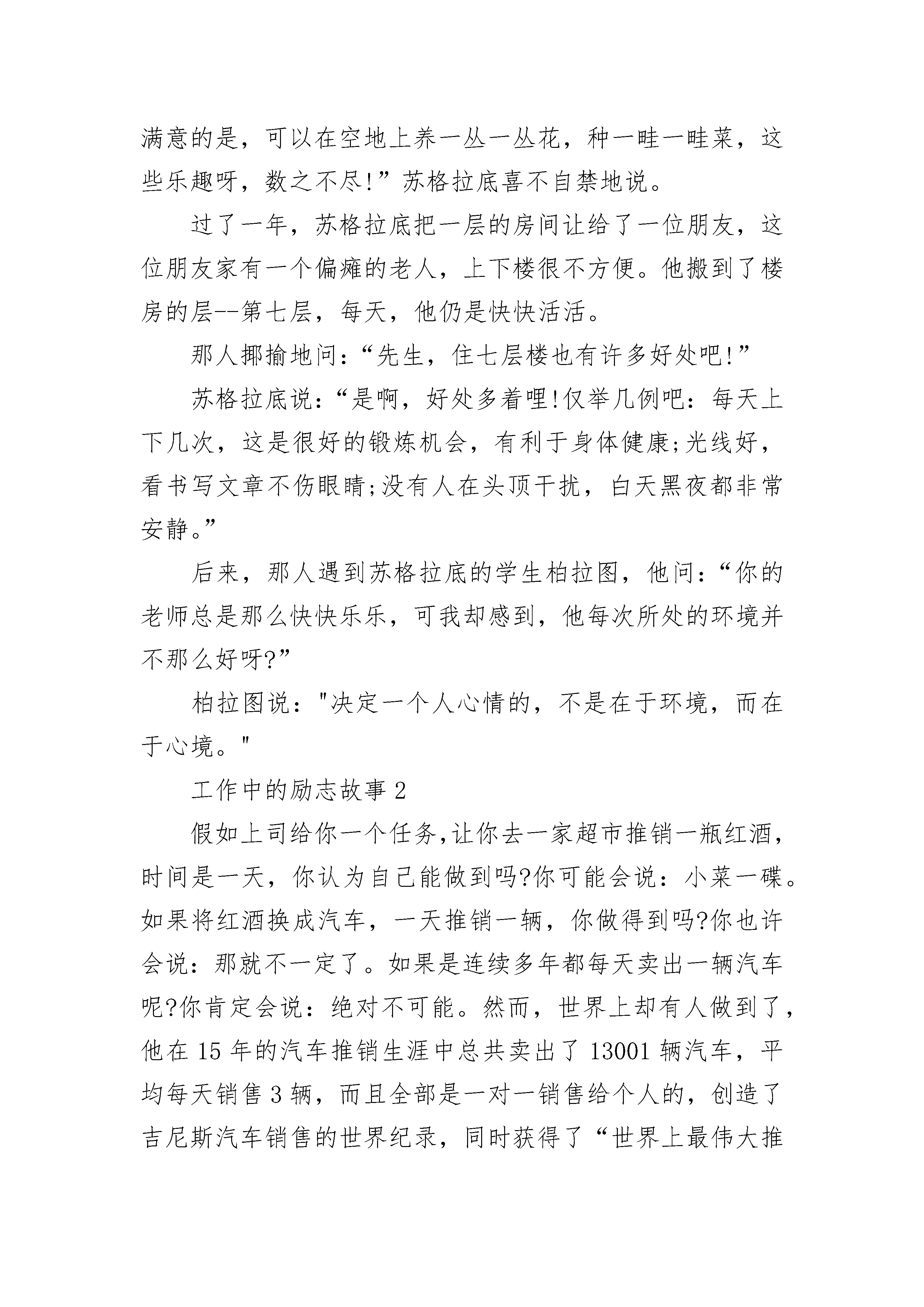 优质的工作中的励志故事苏格拉底是单身汉的时候,和几个朋友一起住在一间只有七八平方米的小屋里。尽管生活非常不便,但是,他一天到晚总是乐呵呵的。有人问他:“那么多人挤在一起,连转身都困难,有什么可乐的?”苏格拉底说:“朋友们在一块儿,随时都可以交换思想,交流感情,这难道不是很值得高兴的事儿吗?”过了一段日子,朋友们一个个成了家,先后搬了出去。屋子里只剩下了苏格拉底一个人,每天,他仍然很快活。那人又问:“你一个人孤孤单单,有什么好高兴的?”“我有很么多书哇,一本书就是一个老师。和这么多老师在一起,时时刻刻都可以向它们请教,这怎不令人高兴呢!”几年后,苏格拉底也成了家,搬进了一座大楼里。这座大楼有七层,他的家在最底层。底层在这座楼里是最差的,不安静,不安全,也不卫生,上面老是往下面泼污水,丢死老鼠、破鞋子、臭袜子和杂七乱八的脏东西,那人见他还是一副喜气洋洋的样子,好奇地问:“你住这样的房间,也感到高兴吗?”“是呀!你不知道住一楼有多少妙处呵!比如,进门就是家,不用爬很高的楼梯;搬东西方便,不必花很大的劲儿;朋友来访容易,用不着一层楼一层楼地去扣问……特别让我满意的是,可以在空地上养一丛一丛花,种一畦一畦菜,这些乐趣呀,数之不尽!”苏格拉底喜不自禁地说。过了一年,苏格拉底把一层的房间让给了一位朋友,这位朋友家有一个偏瘫的老人,上下楼很不方便。他搬到了楼房的层--第七层,每天,他仍是快快活活。那人揶揄地问:“先生,住七层楼也有许多好处吧!”苏格拉底说:“是啊,好处多着哩!仅举几例吧:每天上下几次,这是很好的锻炼机会,有利于身体健康;光线好,看书写文章不伤眼睛;没有人在头顶干扰,白天黑夜都非常安静。”后来,那人遇到苏格拉底的学生柏拉图,他问:“你的老师总是那么快快乐乐,可我却感到,他每次所处的环境并不那么好呀?”柏拉图说:"决定一个人心情的,不是在于环境,而在于心境。"工作中的励志故事2假如上司给你一个任务,让你去一家超市推销一瓶红酒,时间是一天,你认为自己能做到吗?你可能会说:小菜一碟。如果将红酒换成汽车,一天推销一辆,你做得到吗?你也许会说:那就不一定了。如果是连续多年都每天卖出一辆汽车呢?你肯定会说:绝对不可能。然而,世界上却有人做到了,他在15年的汽车推销生涯中总共卖出了13001辆汽车,平均每天销售3辆,而且全部是一对一销售给个人的,创造了吉尼斯汽车销售的世界纪录,同时获得了“世界上最伟大推销员”的称号,这个人就是推销界的“常胜将军”乔?吉拉德。尽管乔?吉拉德创下了如此辉煌的业绩,但是在他最初的人生中,他所经历的挫折和打击却比任何一个人都要多得多。1928年11月1日,乔?吉拉德出生于美国底特律市的一个贫民家庭。9岁时,乔?吉拉德就开始为家庭的生计操心了,他给人擦鞋、送报,赚些零钱补贴家用。进入中学后,随着学费的逐年增加,乔?吉拉德不得不辍学,成了一名锅炉工人。不幸的是,他在那里染上了严重的气喘病。为了不让病情恶化,他决定转行,从事建筑行业的工作,到1963年1月为止,他盖了13年的房子。在这之前,乔?吉拉德一直是个默默无闻的普通工人,是一个彻底的失败者。不仅如此,由于他患有相当严重的口吃,在与人沟通时,总是招来他人的嘲讽。一事无成、人生失意的他,甚至曾经当过小偷,开过赌场。35岁那年,乔?吉拉德的赌场破产了,负债竟高达6万美元。为了生存,为了还债,他走进了一家汽车经销店,因为在当时,推销人员的待遇是没有上限的——只要你有绝对的推销水平。不过,他要做推销员的消息一传出,立即招来了大家的嘲讽,因为他连最基本的条件都达不到——他口吃。乔?吉拉德顶住压力,告诉自己:“通往成功的电梯总是不管用的,想要成功,就只能抛开外界质疑的声音,一步一步地往上爬。”因为有严重口吃,乔?吉拉德在推销中故意放慢说话速度,其他的推销员迫不及待地给顾客介绍,他却以倾听为主,针对顾客的需求与问题,针对性地一一解答。乔?吉拉德在推销中从不放弃任何一个机会,或许客户五年后才需要买车,或许客户两年后才需要送车给大学毕业的小孩当礼物,但不管要等多久,乔?吉拉德都会三不五时打电话追踪客户,一年十二个月更是不间断地寄出花样设计不同、但上面总是印有“ilikeyou!”字样的卡片给所有客户,纪录达每月一万六千封。不仅如此,乔?吉拉德还特别把名片印成橄榄绿色,令人联想到一张张美钞。每天一睁开眼,他逢人必发名片,每见一次面就发一张,坚持要对方收下。乔?吉拉德解释,销售员一定要让全世界的人都知道“你在卖什么”,而且要一次次加深别人的印象,让这些人一想到要买车,自然就会想到“乔?吉拉德”。乔?吉拉德把推销当成了一项神圣的事业,用他的真诚和细心认真对待每一个客户,最终,他凭着不想再回头过苦日子的决心与毅力,在上千汽车业务重兵集结的底特律杀出了一条血路。如今,乔?吉拉德不仅在推销方面