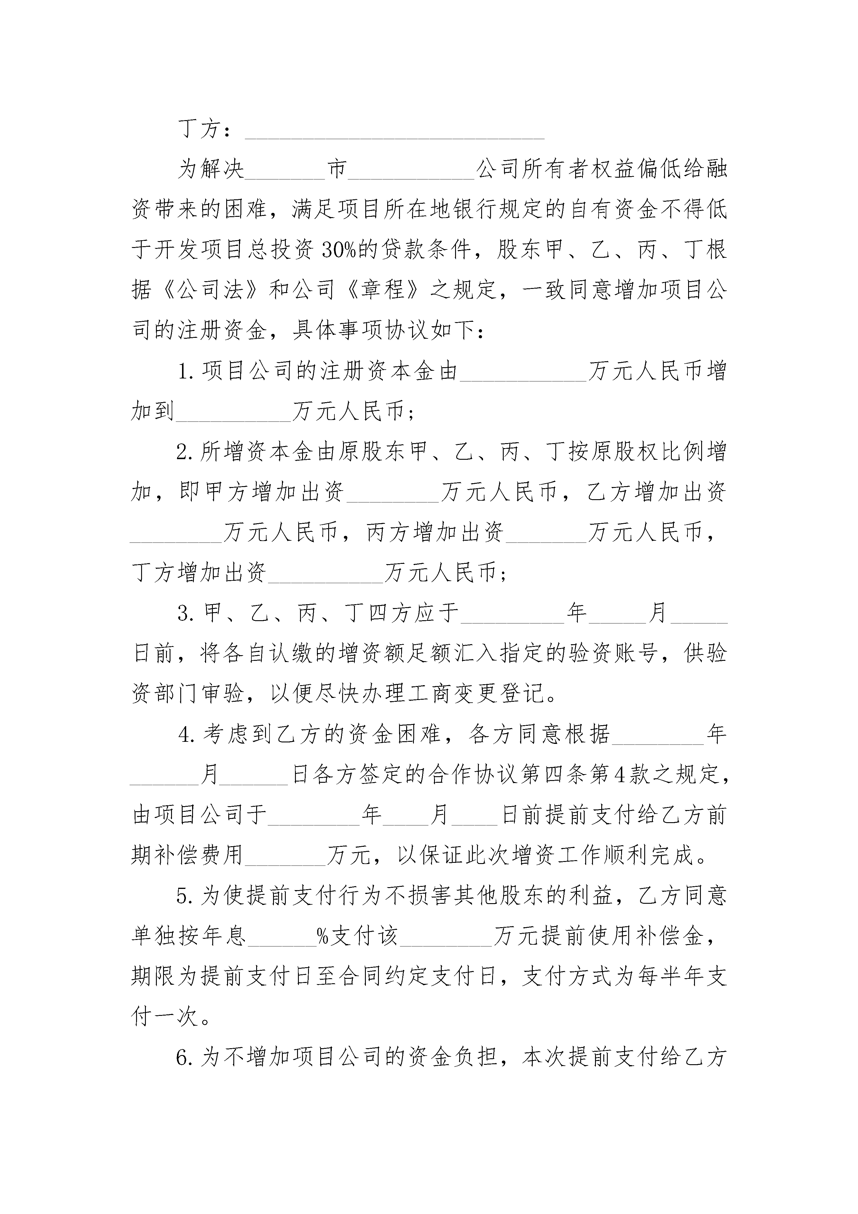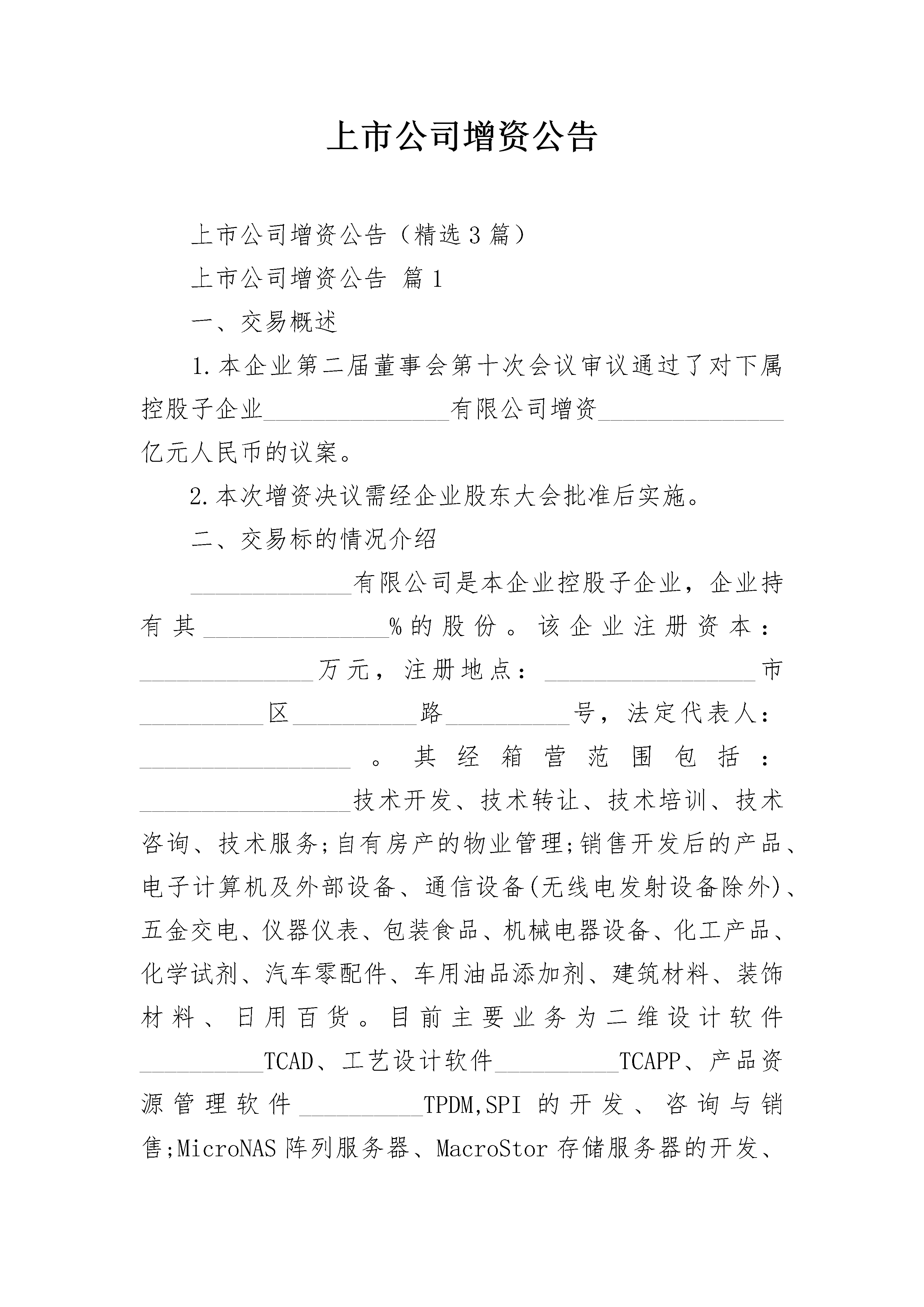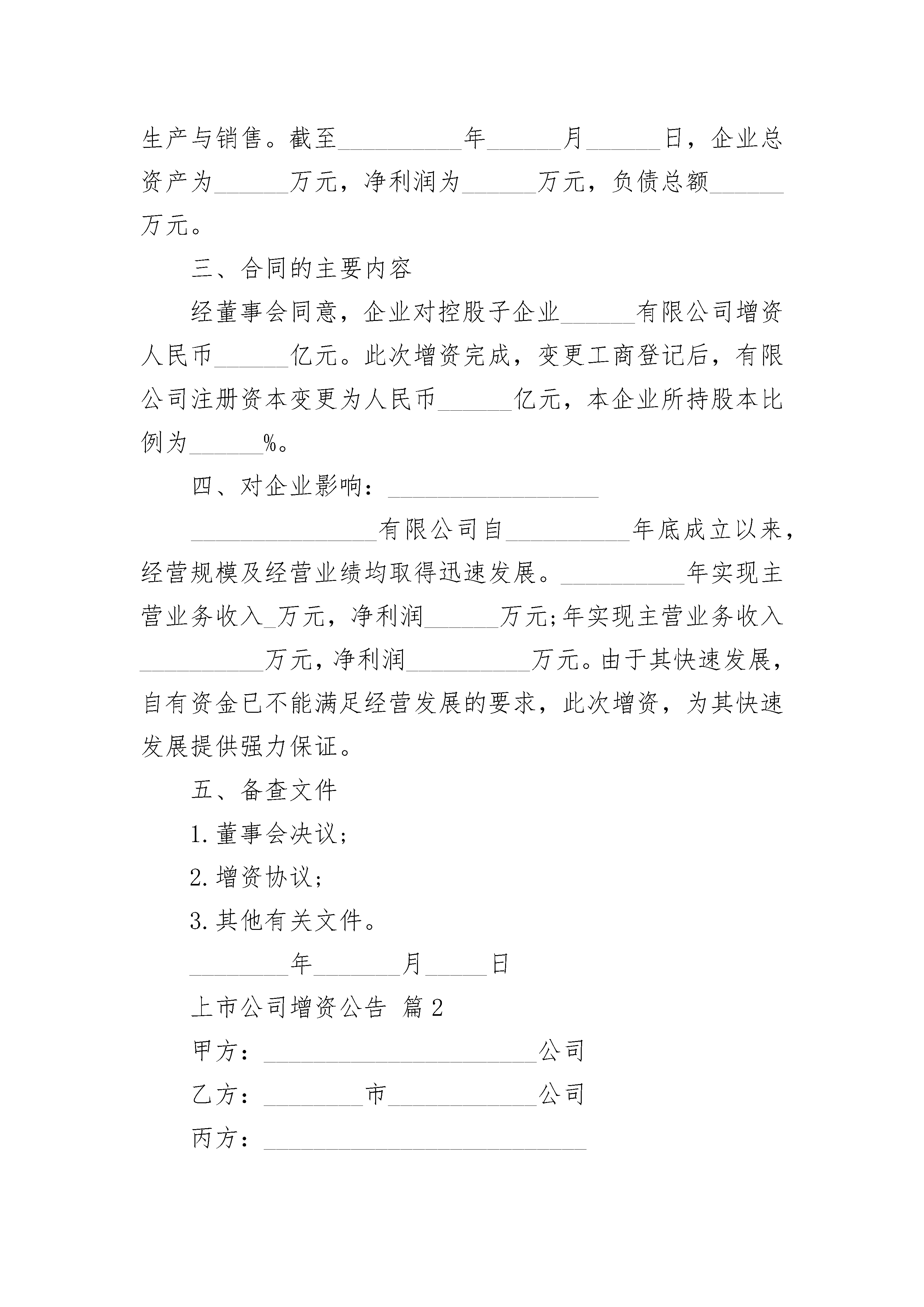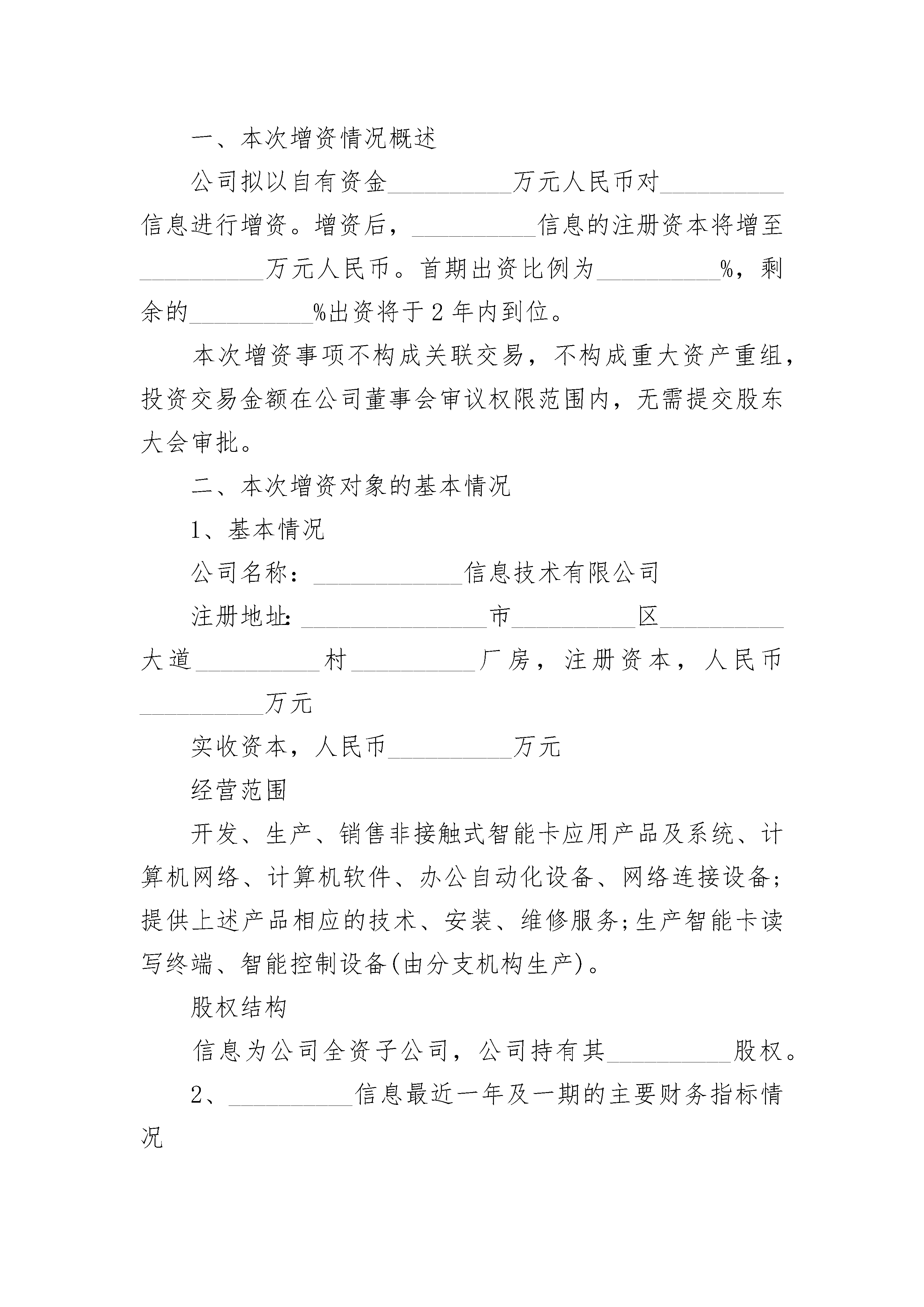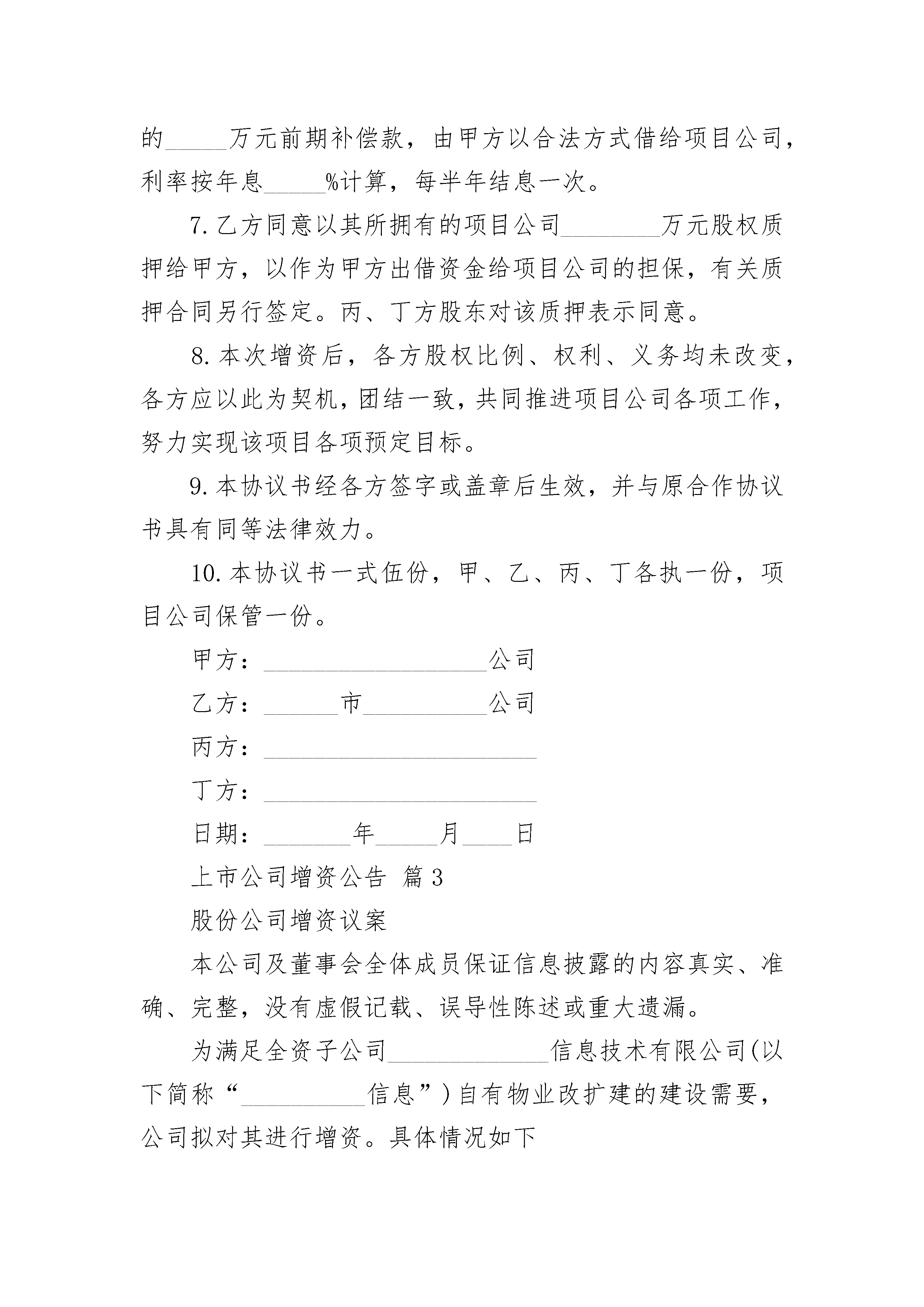 上市公司增资公告上市公司增资公告(精选3篇)上市公司增资公告篇1一、交易概述1.本企业第二届董事会第十次会议审议通过了对下属控股子企业_______________有限公司增资_______________亿元人民币的议案。2.本次增资决议需经企业股东大会批准后实施。二、交易标的情况介绍_____________有限公司是本企业控股子企业,企业持有其_______________%的股份。该企业注册资本:______________万元,注册地点:_________________市__________区__________路__________号,法定代表人:_________________。其经箱营范围包括:_________________技术开发、技术转让、技术培训、技术咨询、技术服务;自有房产的物业管理;销售开发后的产品、电子计算机及外部设备、通信设备(无线电发射设备除外)、五金交电、仪器仪表、包装食品、机械电器设备、化工产品、化学试剂、汽车零配件、车用油品添加剂、建筑材料、装饰材料、日用百货。目前主要业务为二维设计软件__________TCAD、工艺设计软件__________TCAPP、产品资源管理软件__________TPDM,SPI的开发、咨询与销售;MicroNAS阵列服务器、MacroStor存储服务器的开发、生产与销售。截至__________年______月______日,企业总资产为______万元,净利润为______万元,负债总额______万元。三、合同的主要内容经董事会同意,企业对控股子企业______有限公司增资人民币______亿元。此次增资完成,变更工商登记后,有限公司注册资本变更为人民币______亿元,本企业所持股本比例为______%。四、对企业影响:________________________________有限公司自__________年底成立以来,经营规模及经营业绩均取得迅速发展。__________年实现主营业务收入_万元,净利润______万元;年实现主营业务收入__________万元,净利润__________万元。由于其快速发展,自有资金已不能满足经营发展的要求,此次增资,为其快速发展提供强力保证。五、备查文件1.董事会决议;2.增资协议;3.其他有关文件。________年_______月_____日上市公司增资公告篇2甲方:______________________公司乙方:________市____________公司丙方:__________________________丁方:__________________________为解决_______市___________公司所有者权益偏低给融资带来的困难,满足项目所在地银行规定的自有资金不得低于开发项目总投资30%的贷款条件,股东甲、乙、丙、丁根据《公司法》和公司《章程》之规定,一致同意增加项目公司的注册资金,具体事项协议如下:1.项目公司的注册资本金由___________万元人民币增加到__________万元人民币;2.所增资本金由原股东甲、乙、丙、丁按原股权比例增加,即甲方增加出资________万元人民币,乙方增加出资________万元人民币,丙方增加出资_______万元人民币,丁方增加出资__________万元人民币;3.甲、乙、丙、丁四方应于_________年_____月_____日前,将各自认缴的增资额足额汇入指定的验资账号,供验资部门审验,以便尽快办理工商变更登记。4.考虑到乙方的资金困难,各方同意根据________年______月______日各方签定的合作协议第四条第4款之规定,由项目公司于________年____月____日前提前支付给乙方前期补偿费用_______万元,以保证此次增资工作顺利完成。5.为使提前支付行为不损害其他股东的利益,乙方同意单独按年息______%支付该________万元提前使用补偿金,期限为提前支付日至合同约定支付日,支付方式为每半年支付一次。6.为不增加项目公司的资金负担,本次提前支付给乙方的_____万元前期补偿款,由甲方以合法方式借给项目公司,利率按年息_____%计算,每半年结息一次。7.乙方同意以其所拥有的项目公司________万元股权质押给甲方,以作为甲方出借资金给项目公司的担保,有关质押合同另行签定。丙、丁方股东对该质押表示同意。8.本次增资后,各方股权比例、权利、义务均未改变,各方应以此为契机,团结一致,共同推进项目公司各项工作,努力实现该项目各项预定目标。9.本协议书经各方签字或盖章后生效,并与原合作协议书具有同等法律效力。10.本协议书一式伍份,甲、乙、丙、丁各执一份,项目公司保管一份。甲方:_____