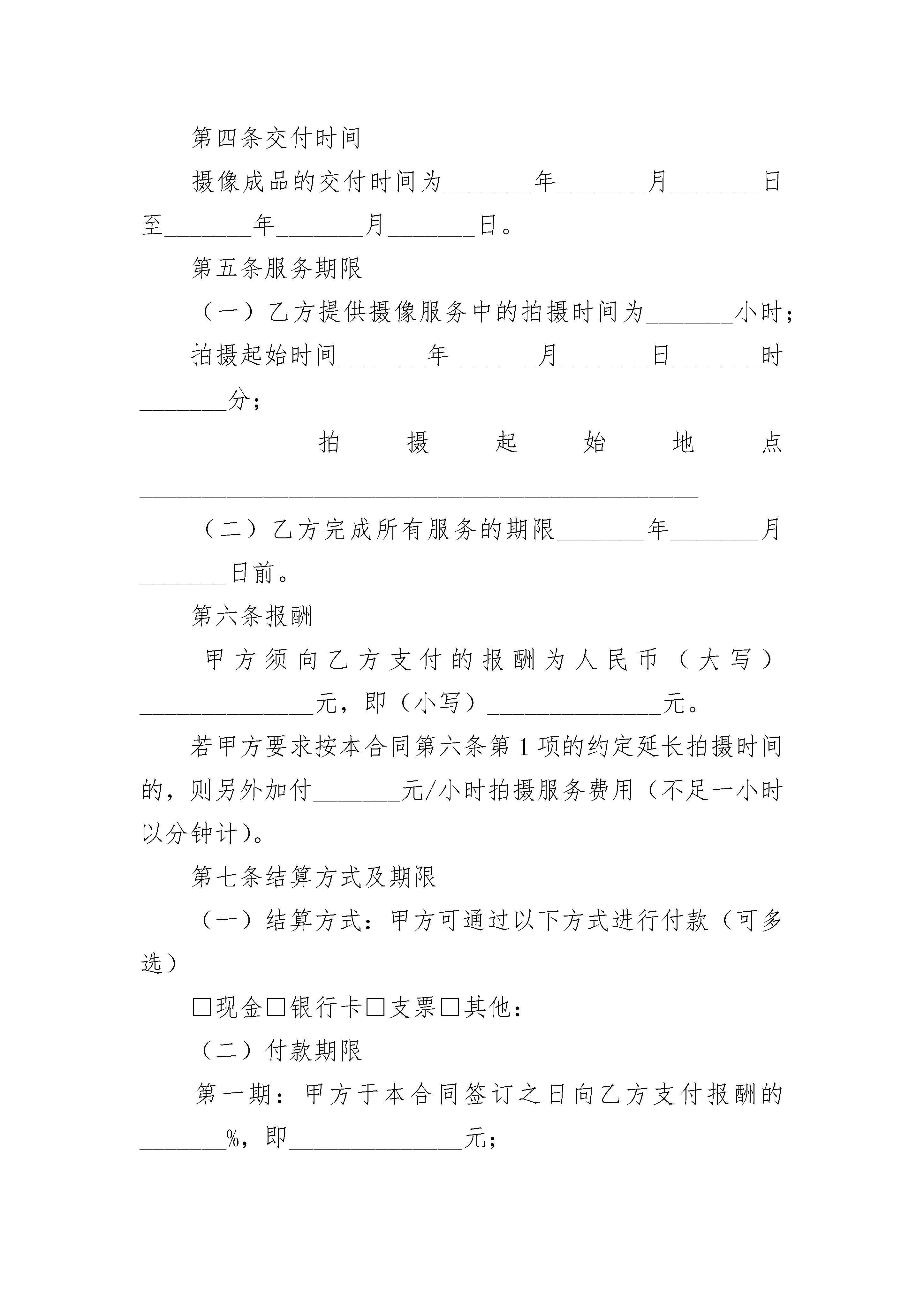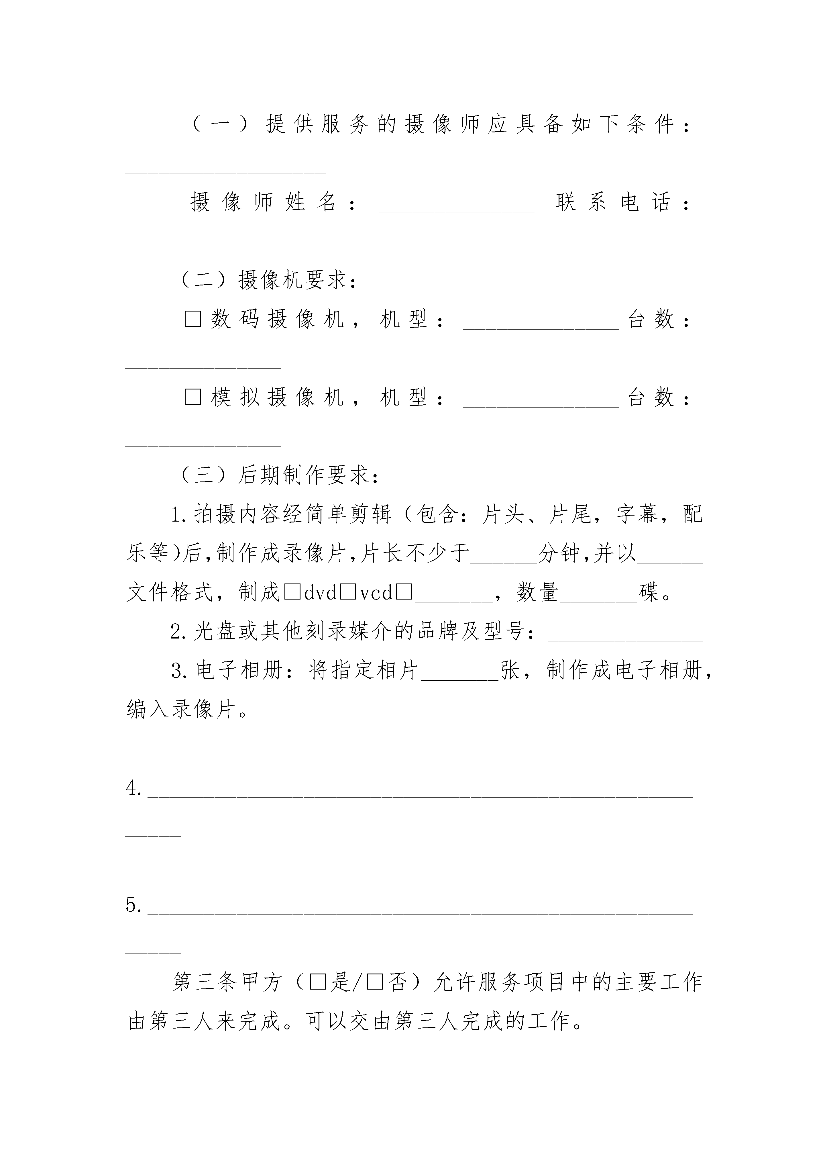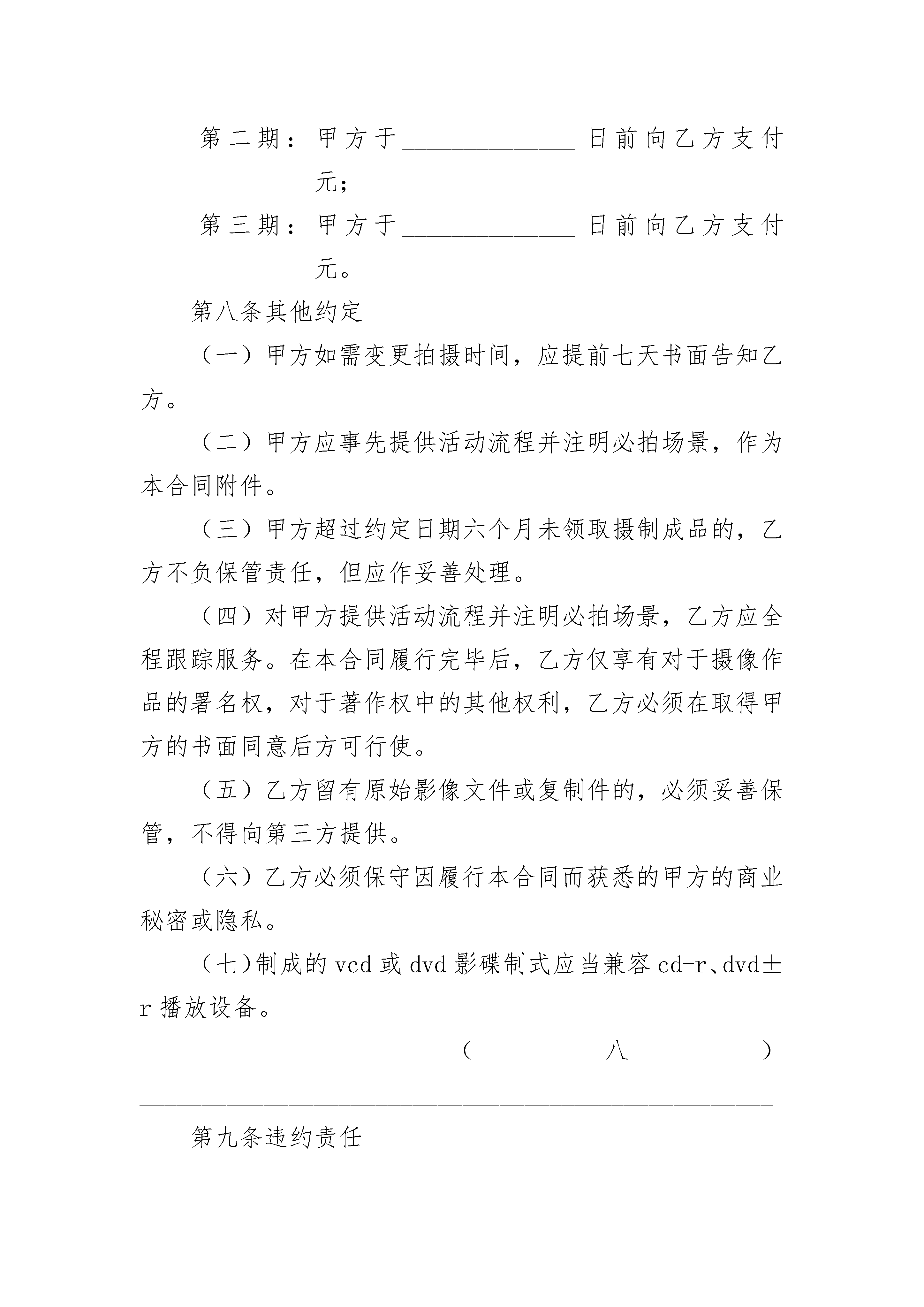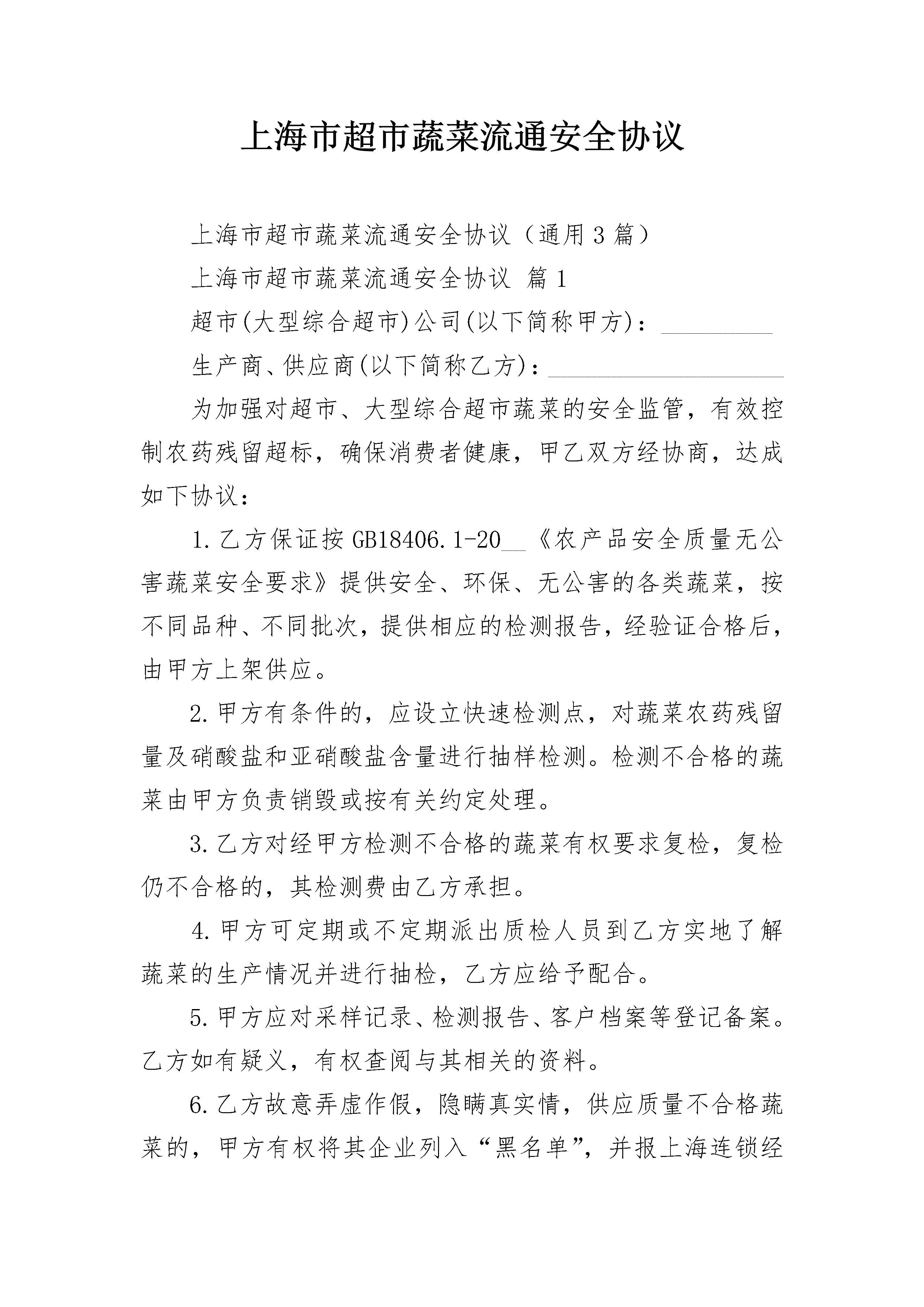 上海市超市蔬菜流通安全协议上海市超市蔬菜流通安全协议(通用3篇)上海市超市蔬菜流通安全协议篇1超市(大型综合超市)公司(以下简称甲方):_________生产商、供应商(以下简称乙方):___________________为加强对超市、大型综合超市蔬菜的安全监管,有效控制农药残留超标,确保消费者健康,甲乙双方经协商,达成如下协议:1.乙方保证按GB18406.1-20__《农产品安全质量无公害蔬菜安全要求》提供安全、环保、无公害的各类蔬菜,按不同品种、不同批次,提供相应的检测报告,经验证合格后,由甲方上架供应。2.甲方有条件的,应设立快速检测点,对蔬菜农药残留量及硝酸盐和亚硝酸盐含量进行抽样检测。检测不合格的蔬菜由甲方负责销毁或按有关约定处理。3.乙方对经甲方检测不合格的蔬菜有权要求复检,复检仍不合格的,其检测费由乙方承担。4.甲方可定期或不定期派出质检人员到乙方实地了解蔬菜的生产情况并进行抽检,乙方应给予配合。5.甲方应对采样记录、检测报告、客户档案等登记备案。乙方如有疑义,有权查阅与其相关的资料。6.乙方故意弄虚作假,隐瞒真实情,供应质量不合格蔬菜的,甲方有权将其企业列入“黑名单”,并报上海连锁经营协会及有关食品监管部门备案。7.乙方违反本协议约定应承担相应的经济责任和法律责任。8.本协议作为超市(大型综合超市)产品购销合同的补充协议。本协议一式两份,甲乙双方各执一份,自双方签字盖章之日起生效。甲方代表(盖章):__________________年______月______日乙方代表(盖章):__________________年______月______日上海市超市蔬菜流通安全协议篇2合同编号:____________接受服务者(甲方):_________________________提供服务者(乙方):_________________________依照《中华人民共和国民法典》及其他有关法律法规的规定,经双方协商一致,签订本合同。为使合同内容具体确定,请在选定项目前的□内打√,空置内容请划去。第一条服务项目乙方提供摄像师:_______________提供服务者(乙方):_____名,在甲方举办的□婚礼□会议□聚会□_____活动时,提供纪实摄像服务,并进行后期制作第二条服务标准及要求(一)提供服务的摄像师应具备如下条件:__________________摄像师姓名:______________联系电话:__________________(二)摄像机要求:□数码摄像机,机型:______________台数:______________□模拟摄像机,机型:______________台数:______________(三)后期制作要求:1.拍摄内容经简单剪辑(包含:片头、片尾,字幕,配乐等)后,制作成录像片,片长不少于______分钟,并以______文件格式,制成□dvd□vcd□_______,数量_______碟。2.光盘或其他刻录媒介的品牌及型号:______________3.电子相册:将指定相片_______张,制作成电子相册,编入录像片。4.______________________________________________________5.______________________________________________________第三条甲方(□是/□否)允许服务项目中的主要工作由第三人来完成。可以交由第三人完成的工作。第四条交付时间摄像成品的交付时间为_______年_______月_______日至_______年_______月_______日。第五条服务期限(一)乙方提供摄像服务中的拍摄时间为_______小时;拍摄起始时间_______年_______月_______日_______时_______分;拍摄起始地点_____________________________________________(二)乙方完成所有服务的期限_______年_______月_______日前。第六条报酬甲方须向乙方支付的报酬为人民币(大写)______________元,即(小写)______________元。若甲方要求按本合同第六条第1项的约定延长拍摄时间的,则另外加付_______元/小时拍摄服务费用(不足一小时以分钟计)。第七条结算方式及期限(一)结算方式:甲方可通过以下方式进行付款(可多选)□现金□银行卡□支票□其他:(二)付款期限第一期:甲方于本合同签订之日向乙方支付报酬的_______%,即______________元;第二期:甲方于______________日前向乙方支付______________元;第三期:甲方于_______