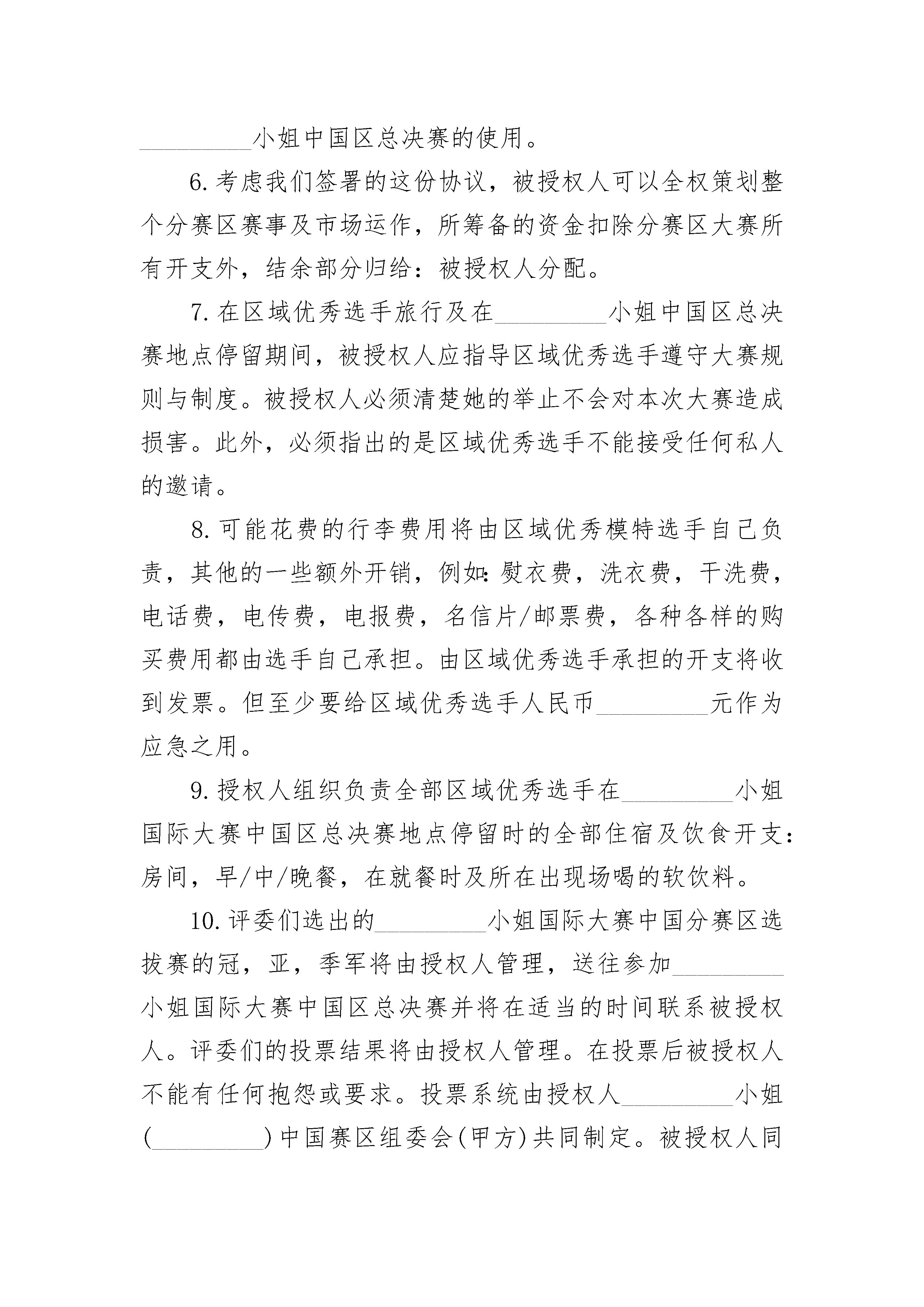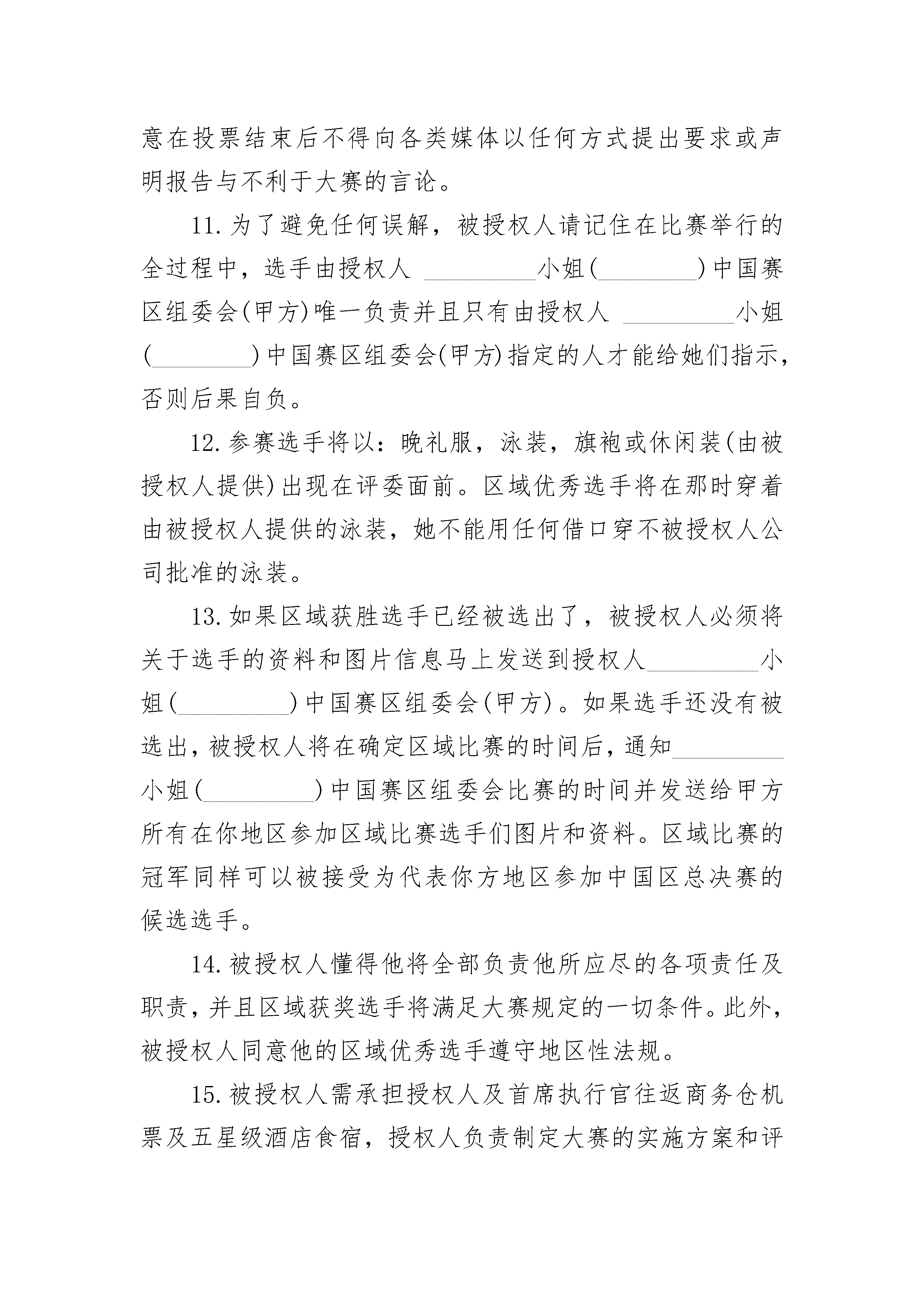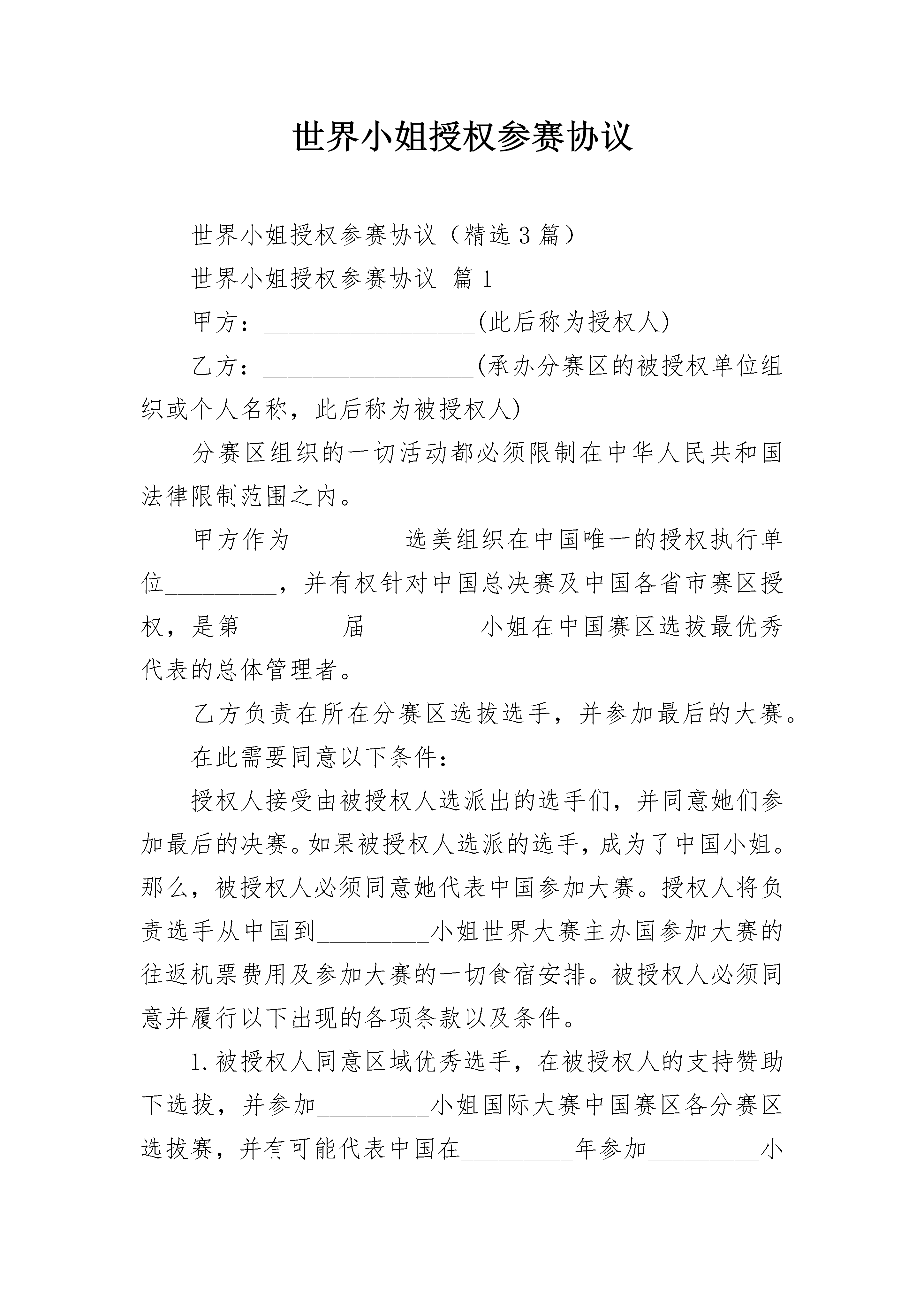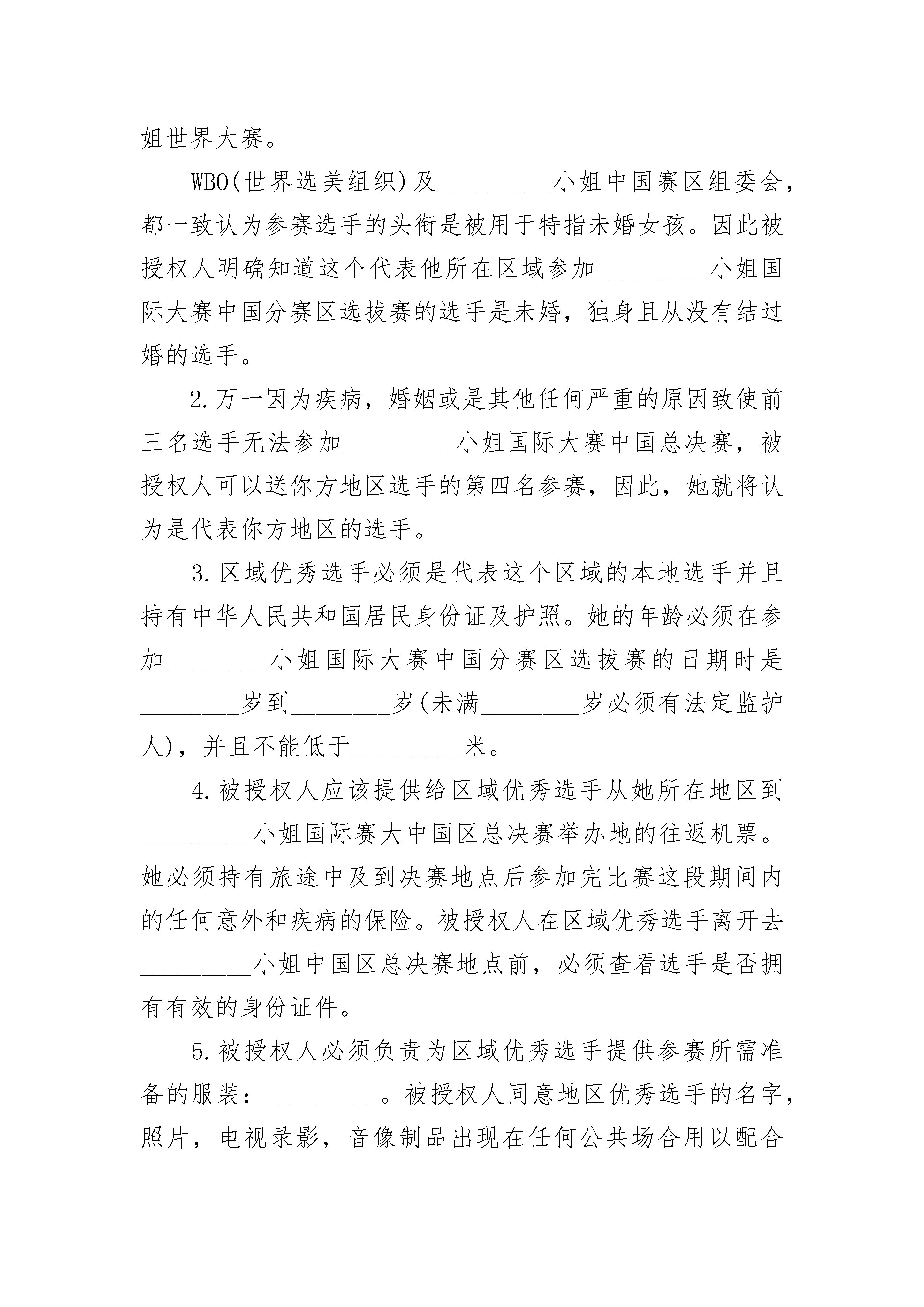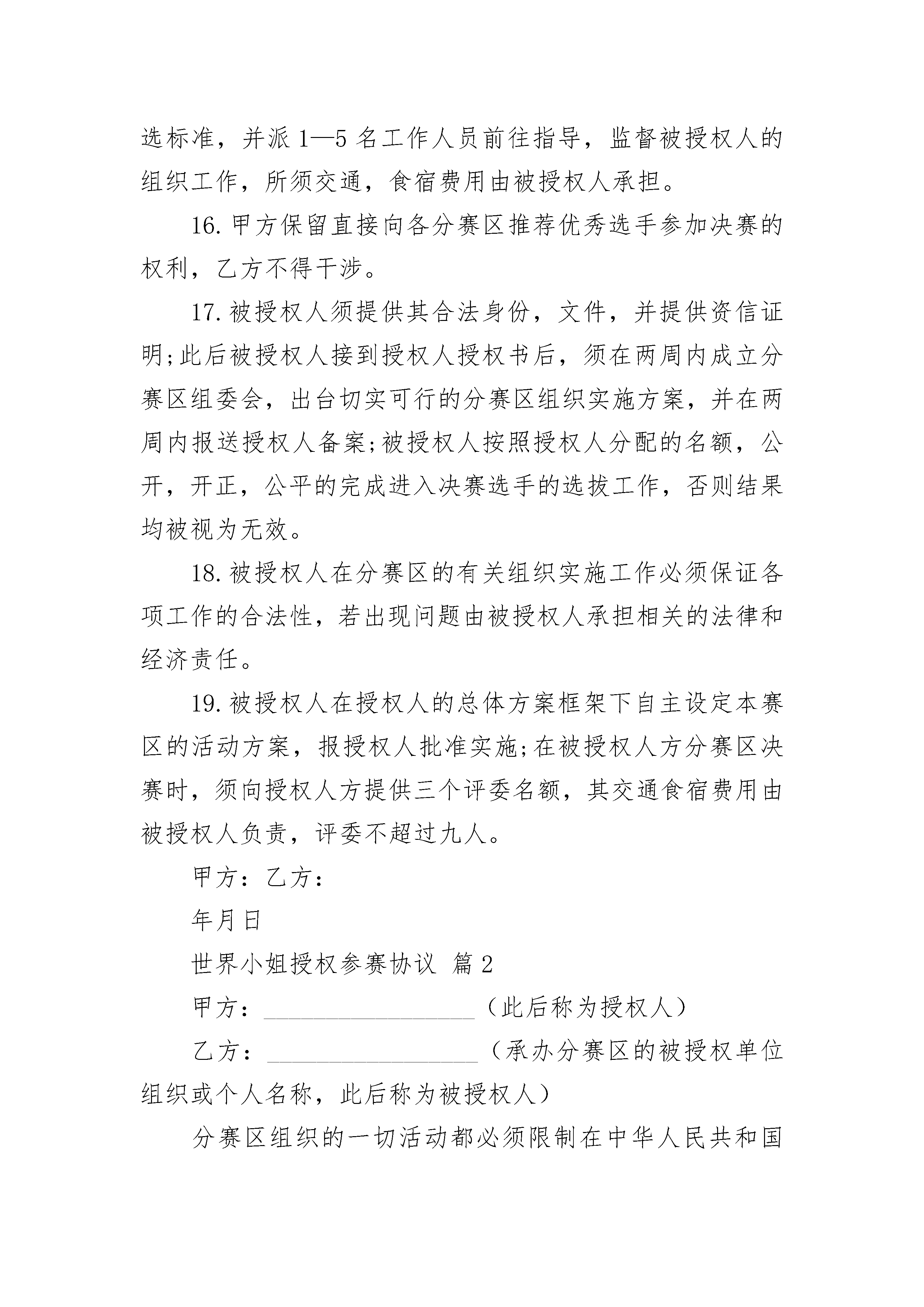 世界小姐授权参赛协议世界小姐授权参赛协议(精选3篇)世界小姐授权参赛协议篇1甲方:_________________(此后称为授权人)乙方:_________________(承办分赛区的被授权单位组织或个人名称,此后称为被授权人)分赛区组织的一切活动都必须限制在中华人民共和国法律限制范围之内。甲方作为_________选美组织在中国唯一的授权执行单位_________,并有权针对中国总决赛及中国各省市赛区授权,是第________届_________小姐在中国赛区选拔最优秀代表的总体管理者。乙方负责在所在分赛区选拔选手,并参加最后的大赛。在此需要同意以下条件:授权人接受由被授权人选派出的选手们,并同意她们参加最后的决赛。如果被授权人选派的选手,成为了中国小姐。那么,被授权人必须同意她代表中国参加大赛。授权人将负责选手从中国到_________小姐世界大赛主办国参加大赛的往返机票费用及参加大赛的一切食宿安排。被授权人必须同意并履行以下出现的各项条款以及条件。1.被授权人同意区域优秀选手,在被授权人的支持赞助下选拔,并参加_________小姐国际大赛中国赛区各分赛区选拔赛,并有可能代表中国在_________年参加_________小姐世界大赛。WBO(世界选美组织)及_________小姐中国赛区组委会,都一致认为参赛选手的头衔是被用于特指未婚女孩。因此被授权人明确知道这个代表他所在区域参加_________小姐国际大赛中国分赛区选拔赛的选手是未婚,独身且从没有结过婚的选手。2.万一因为疾病,婚姻或是其他任何严重的原因致使前三名选手无法参加_________小姐国际大赛中国总决赛,被授权人可以送你方地区选手的第四名参赛,因此,她就将认为是代表你方地区的选手。3.区域优秀选手必须是代表这个区域的本地选手并且持有中华人民共和国居民身份证及护照。她的年龄必须在参加________小姐国际大赛中国分赛区选拔赛的日期时是________岁到________岁(未满________岁必须有法定监护人),并且不能低于_________米。4.被授权人应该提供给区域优秀选手从她所在地区到_________小姐国际赛大中国区总决赛举办地的往返机票。她必须持有旅途中及到决赛地点后参加完比赛这段期间内的任何意外和疾病的保险。被授权人在区域优秀选手离开去_________小姐中国区总决赛地点前,必须查看选手是否拥有有效的身份证件。5.被授权人必须负责为区域优秀选手提供参赛所需准备的服装:_________。被授权人同意地区优秀选手的名字,照片,电视录影,音像制品出现在任何公共场合用以配合_________小姐中国区总决赛的使用。6.考虑我们签署的这份协议,被授权人可以全权策划整个分赛区赛事及市场运作,所筹备的资金扣除分赛区大赛所有开支外,结余部分归给:被授权人分配。7.在区域优秀选手旅行及在_________小姐中国区总决赛地点停留期间,被授权人应指导区域优秀选手遵守大赛规则与制度。被授权人必须清楚她的举止不会对本次大赛造成损害。此外,必须指出的是区域优秀选手不能接受任何私人的邀请。8.可能花费的行李费用将由区域优秀模特选手自己负责,其他的一些额外开销,例如:熨衣费,洗衣费,干洗费,电话费,电传费,电报费,名信片/邮票费,各种各样的购买费用都由选手自己承担。由区域优秀选手承担的开支将收到发票。但至少要给区域优秀选手人民币_________元作为应急之用。9.授权人组织负责全部区域优秀选手在_________小姐国际大赛中国区总决赛地点停留时的全部住宿及饮食开支:房间,早/中/晚餐,在就餐时及所在出现场喝的软饮料。10.评委们选出的_________小姐国际大赛中国分赛区选拔赛的冠,亚,季军将由授权人管理,送往参加_________小姐国际大赛中国区总决赛并将在适当的时间联系被授权人。评委们的投票结果将由授权人管理。在投票后被授权人不能有任何抱怨或要求。投票系统由授权人_________小姐(_________)中国赛区组委会(甲方)共同制定。被授权人同意在投票结束后不得向各类媒体以任何方式提出要求或声明报告与不利于大赛的言论。11.为了避免任何误解,被授权人请记住在比赛举行的全过程中,选手由授权人_________小姐(________)中国赛区组委会(甲方)唯一负责并且只有由授权人_________小姐(________)中国赛区组委会(甲方)指定的人才能给她们指示,否则后果自负。12.参赛选手将以:晚礼服,泳装,旗袍或休闲装(由被授权人提供)出现在评委面前。区域优秀选手将在那时穿着由被授权人提供的泳装,她不能用任何借口穿不被授权人公司批准的泳装。13.如果区域获胜选手已经被选出了,被授权人必须将关于选手的资料和图片信息马上发送到授权人___