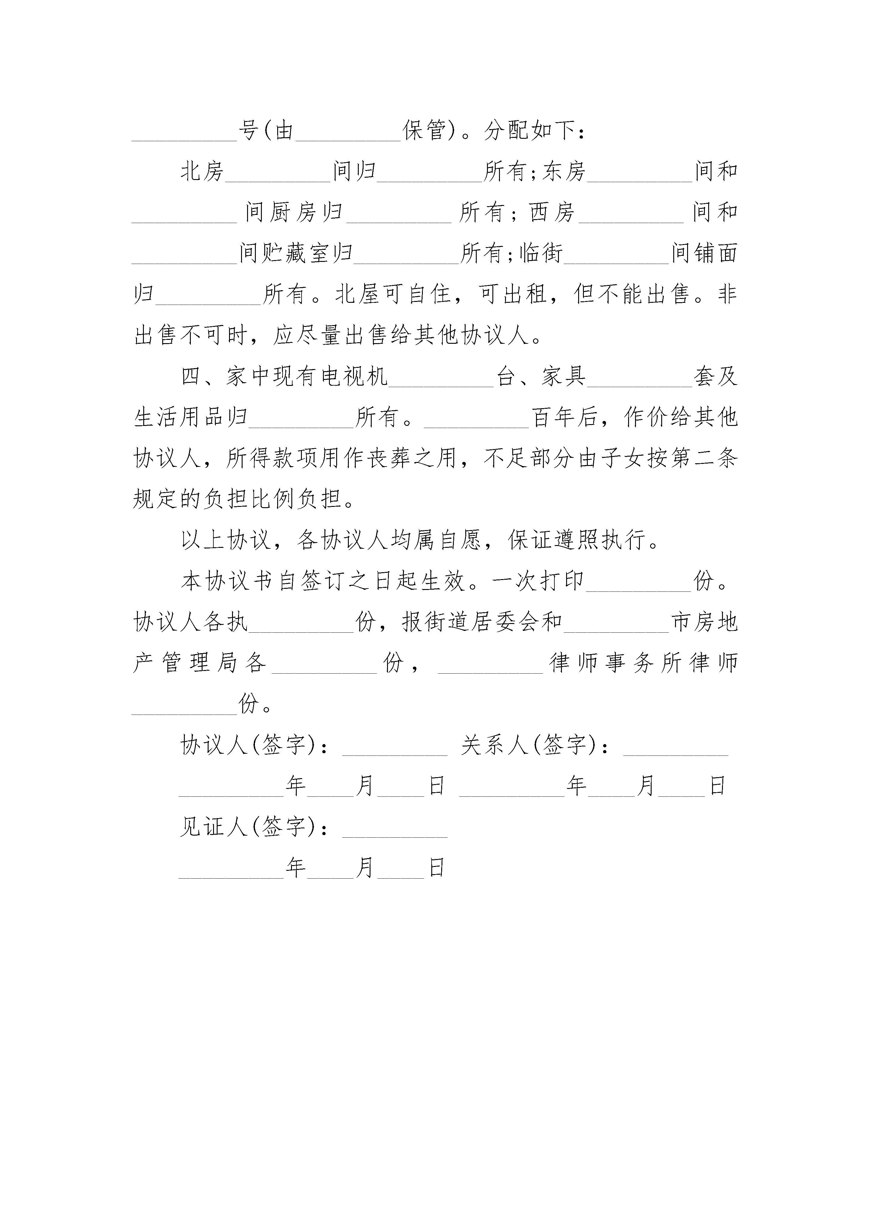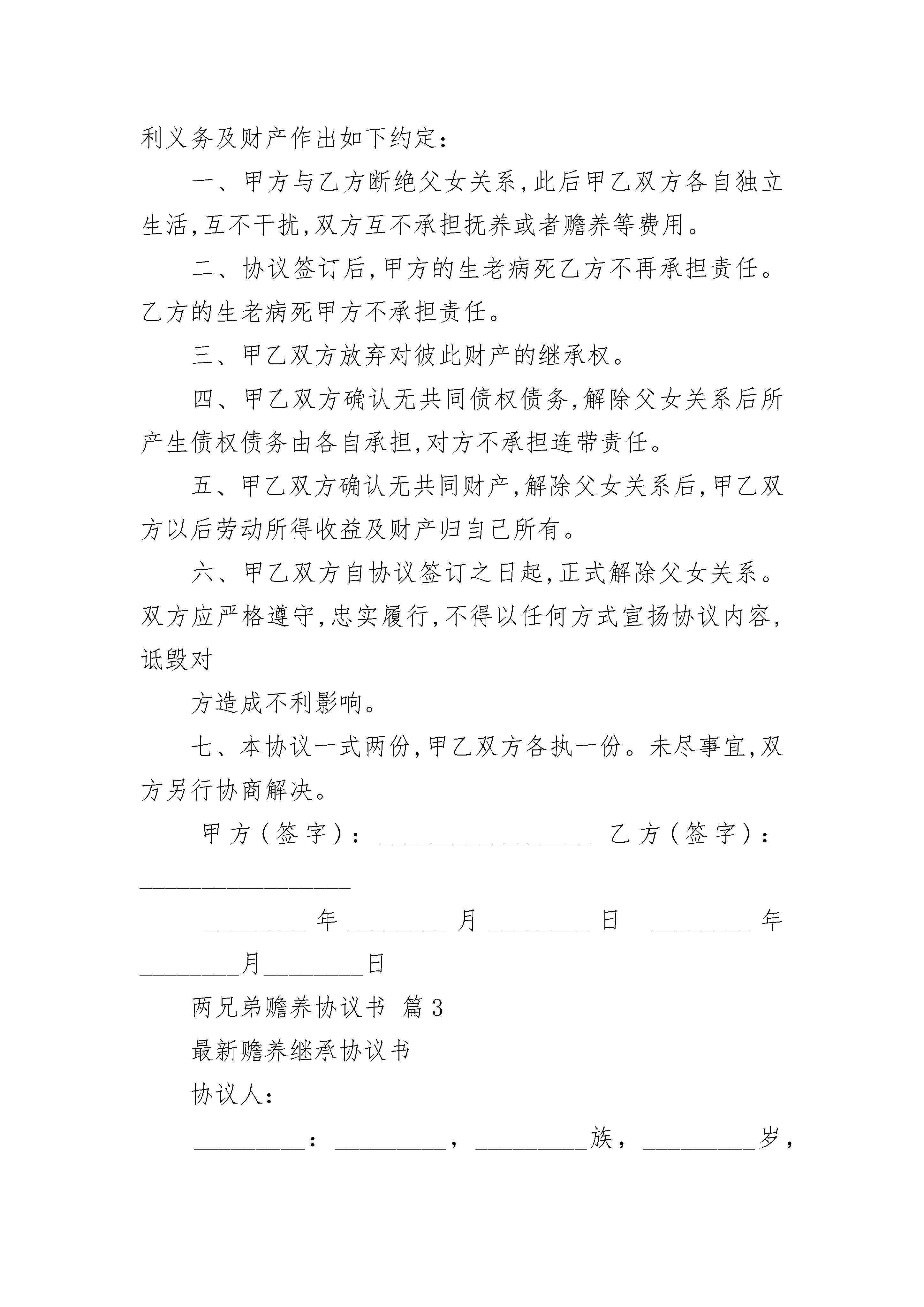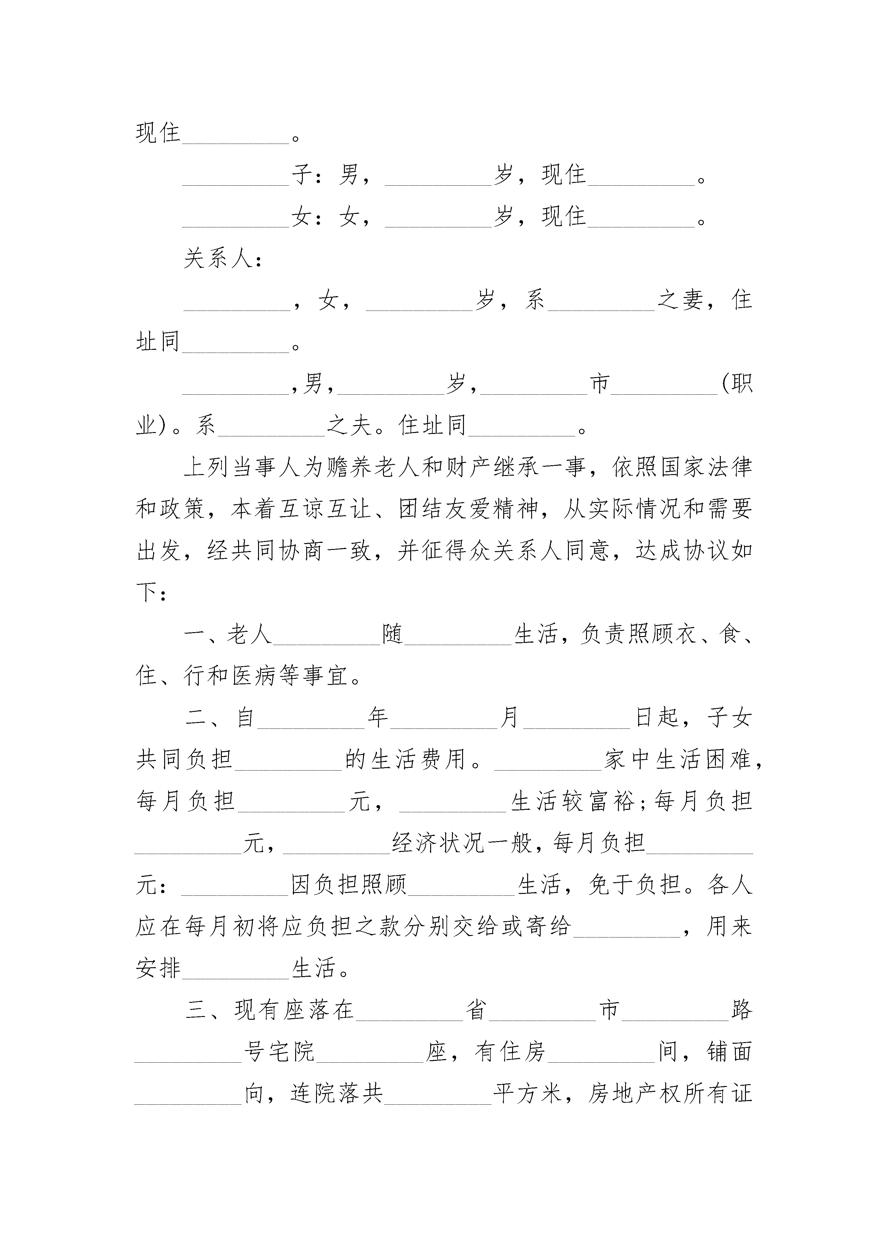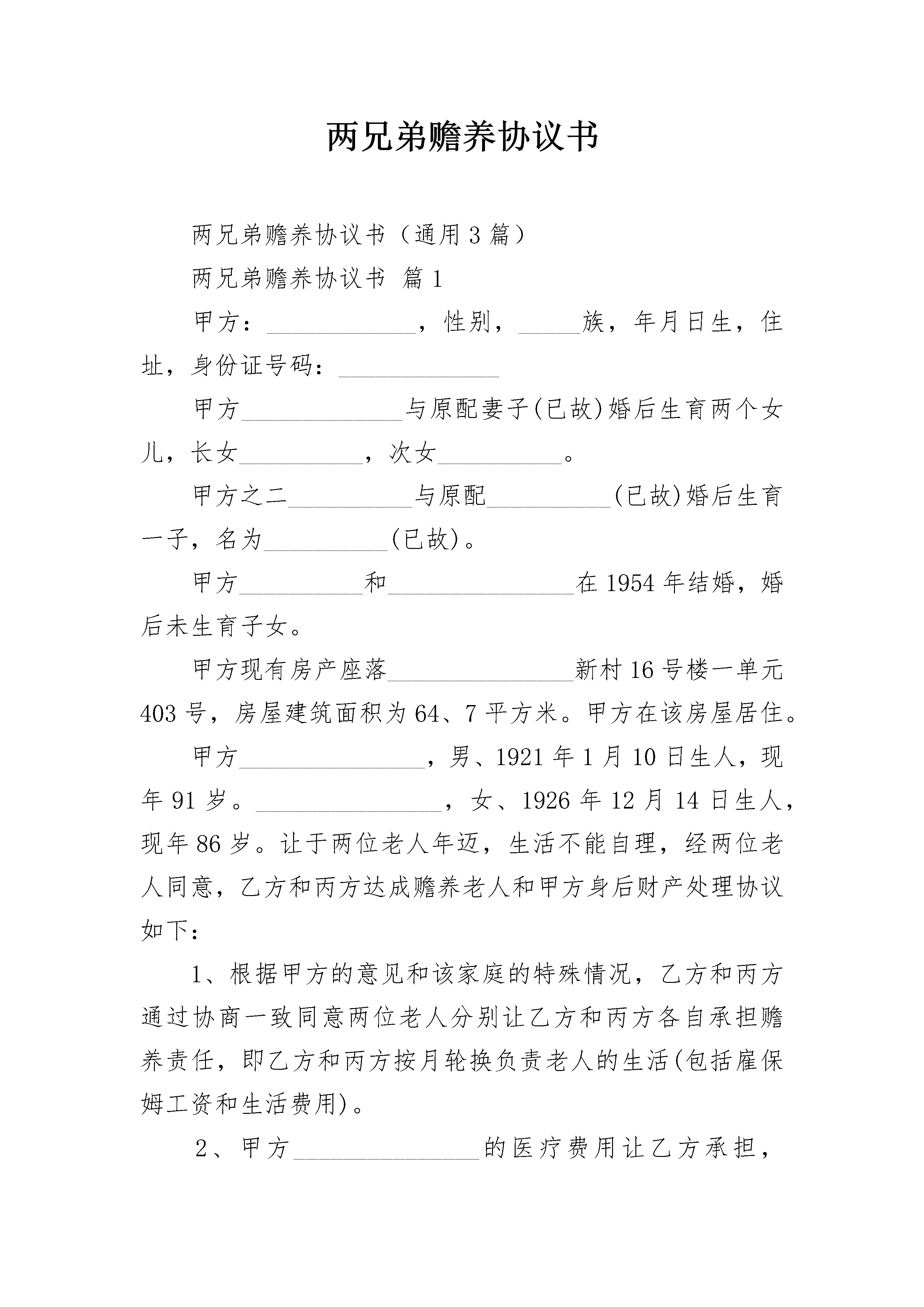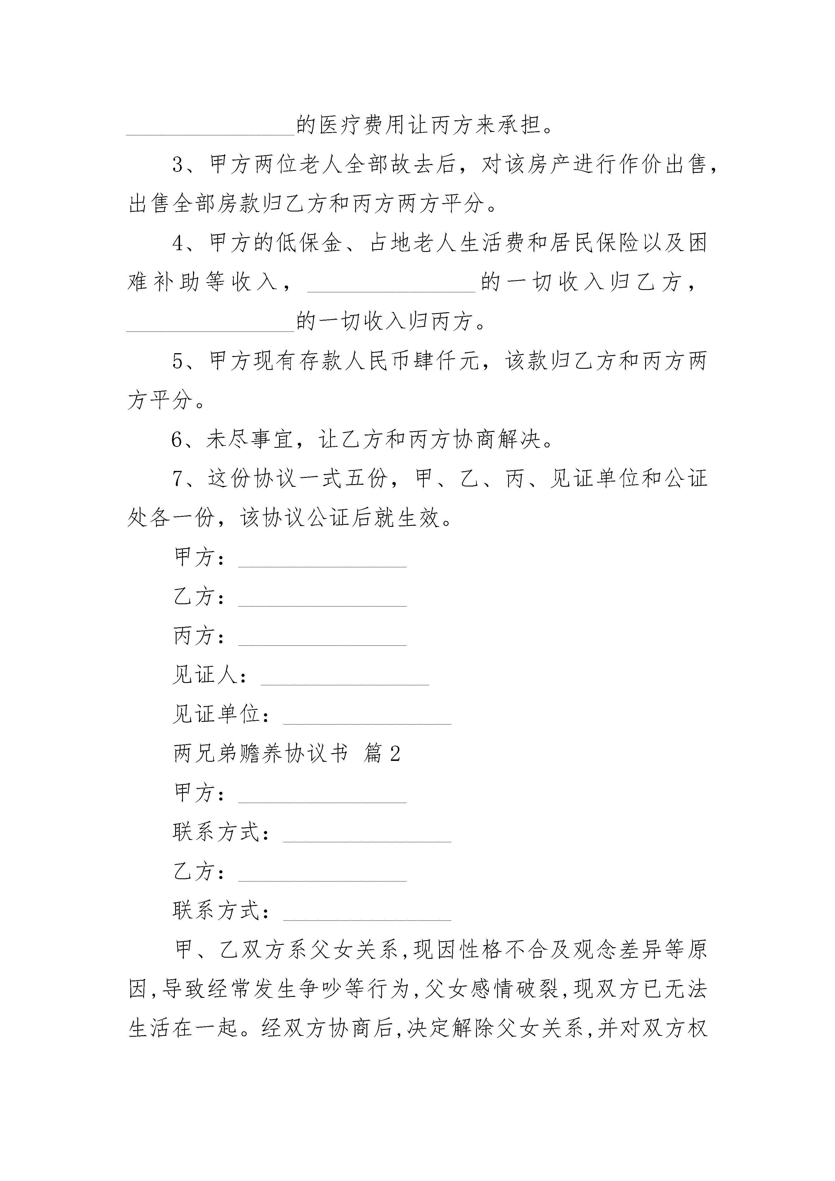 两兄弟赡养协议书两兄弟赡养协议书(通用3篇)两兄弟赡养协议书篇1甲方:____________,性别,_____族,年月日生,住址,身份证号码:_____________甲方_____________与原配妻子(已故)婚后生育两个女儿,长女__________,次女__________。甲方之二__________与原配__________(已故)婚后生育一子,名为__________(已故)。甲方__________和_______________在1954年结婚,婚后未生育子女。甲方现有房产座落_______________新村16号楼一单元403号,房屋建筑面积为64、7平方米。甲方在该房屋居住。甲方_______________,男、1921年1月10日生人,现年91岁。_______________,女、1926年12月14日生人,现年86岁。让于两位老人年迈,生活不能自理,经两位老人同意,乙方和丙方达成赡养老人和甲方身后财产处理协议如下:1、根据甲方的意见和该家庭的特殊情况,乙方和丙方通过协商一致同意两位老人分别让乙方和丙方各自承担赡养责任,即乙方和丙方按月轮换负责老人的生活(包括雇保姆工资和生活费用)。2、甲方_______________的医疗费用让乙方承担,_______________的医疗费用让丙方来承担。3、甲方两位老人全部故去后,对该房产进行作价出售,出售全部房款归乙方和丙方两方平分。4、甲方的低保金、占地老人生活费和居民保险以及困难补助等收入,_______________的一切收入归乙方,_______________的一切收入归丙方。5、甲方现有存款人民币肆仟元,该款归乙方和丙方两方平分。6、未尽事宜,让乙方和丙方协商解决。7、这份协议一式五份,甲、乙、丙、见证单位和公证处各一份,该协议公证后就生效。甲方:_______________乙方:_______________丙方:_______________见证人:_______________见证单位:_______________两兄弟赡养协议书篇2甲方:_______________联系方式:_______________乙方:_______________联系方式:_______________甲、乙双方系父女关系,现因性格不合及观念差异等原因,导致经常发生争吵等行为,父女感情破裂,现双方已无法生活在一起。经双方协商后,决定解除父女关系,并对双方权利义务及财产作出如下约定:一、甲方与乙方断绝父女关系,此后甲乙双方各自独立生活,互不干扰,双方互不承担抚养或者赡养等费用。二、协议签订后,甲方的生老病死乙方不再承担责任。乙方的生老病死甲方不承担责任。三、甲乙双方放弃对彼此财产的继承权。四、甲乙双方确认无共同债权债务,解除父女关系后所产生债权债务由各自承担,对方不承担连带责任。五、甲乙双方确认无共同财产,解除父女关系后,甲乙双方以后劳动所得收益及财产归自己所有。六、甲乙双方自协议签订之日起,正式解除父女关系。双方应严格遵守,忠实履行,不得以任何方式宣扬协议内容,诋毁对方造成不利影响。七、本协议一式两份,甲乙双方各执一份。未尽事宜,双方另行协商解决。甲方(签字):_________________乙方(签字):_________________________年________月________日________年________月________日两兄弟赡养协议书篇3最新赡养继承协议书协议人:_________:_________,_________族,_________岁,现住_________。_________子:男,_________岁,现住_________。_________女:女,_________岁,现住_________。关系人:_________,女,_________岁,系_________之妻,住址同_________。_________,男,_________岁,_________市_________(职业)。系_________之夫。住址同_________。上列当事人为赡养老人和财产继承一事,依照国家法律和政策,本着互谅互让、团结友爱精神,从实际情况和需要出发,经共同协商一致,并征得众关系人同意,达成协议如下:一、老人_________随_________生活,负责照顾衣、食、住、行和医病等事宜。二、自_________年_________月_________日起,子女共同负担_________的生活费用。_________家中生活困难,每月负担_________元,_________生活较富裕;每月负担_________元,_________经济状况一般,每月负担_________元:_________因负担照