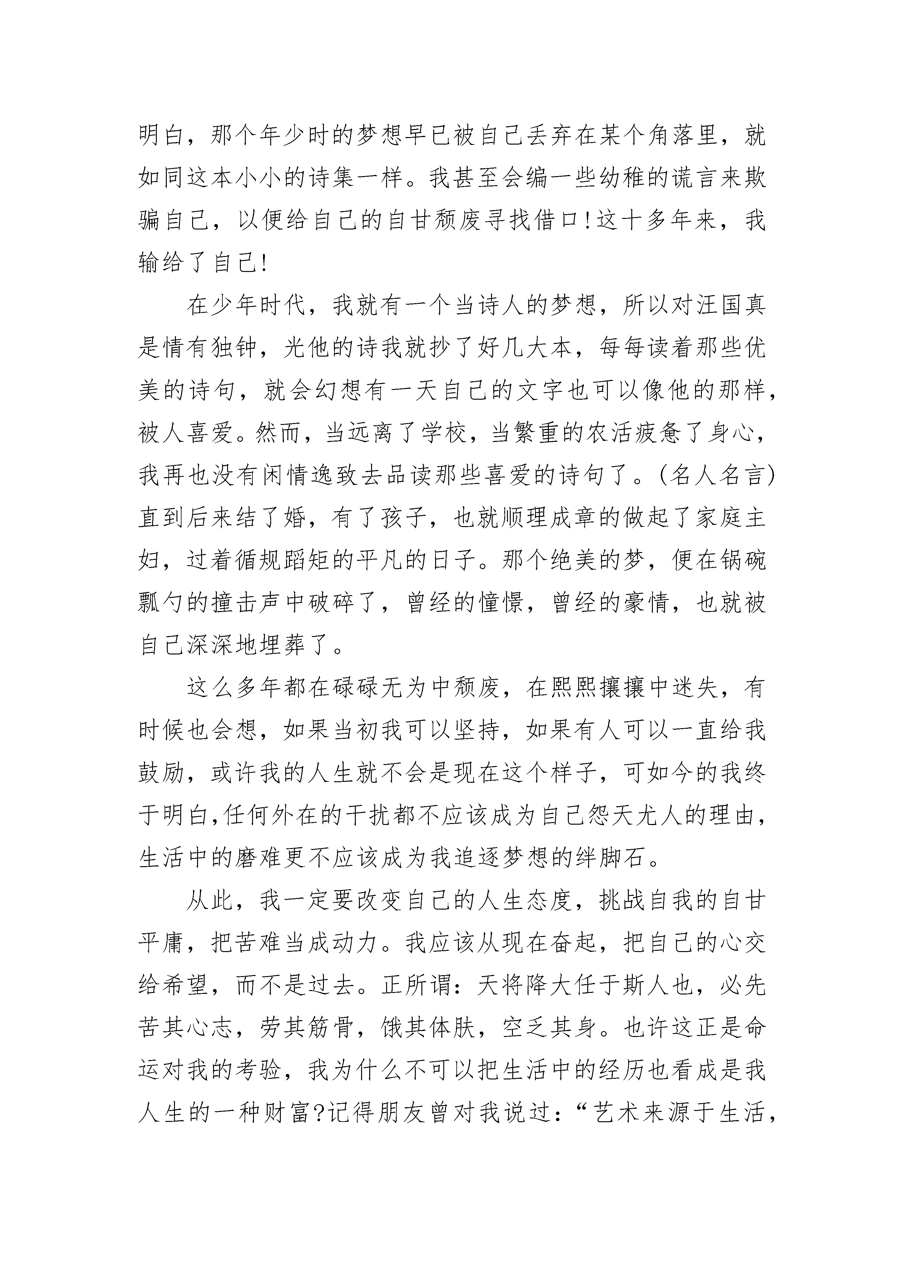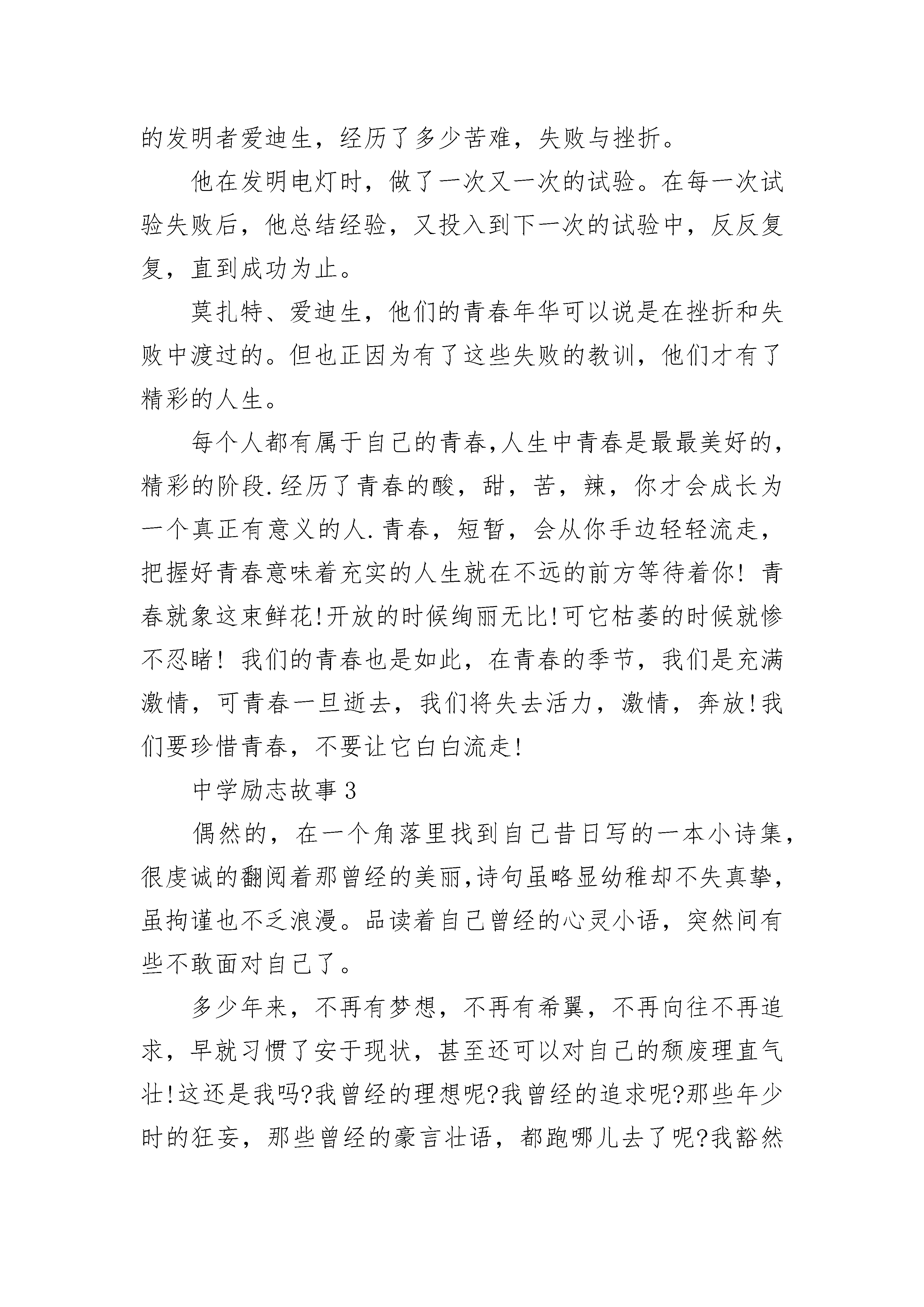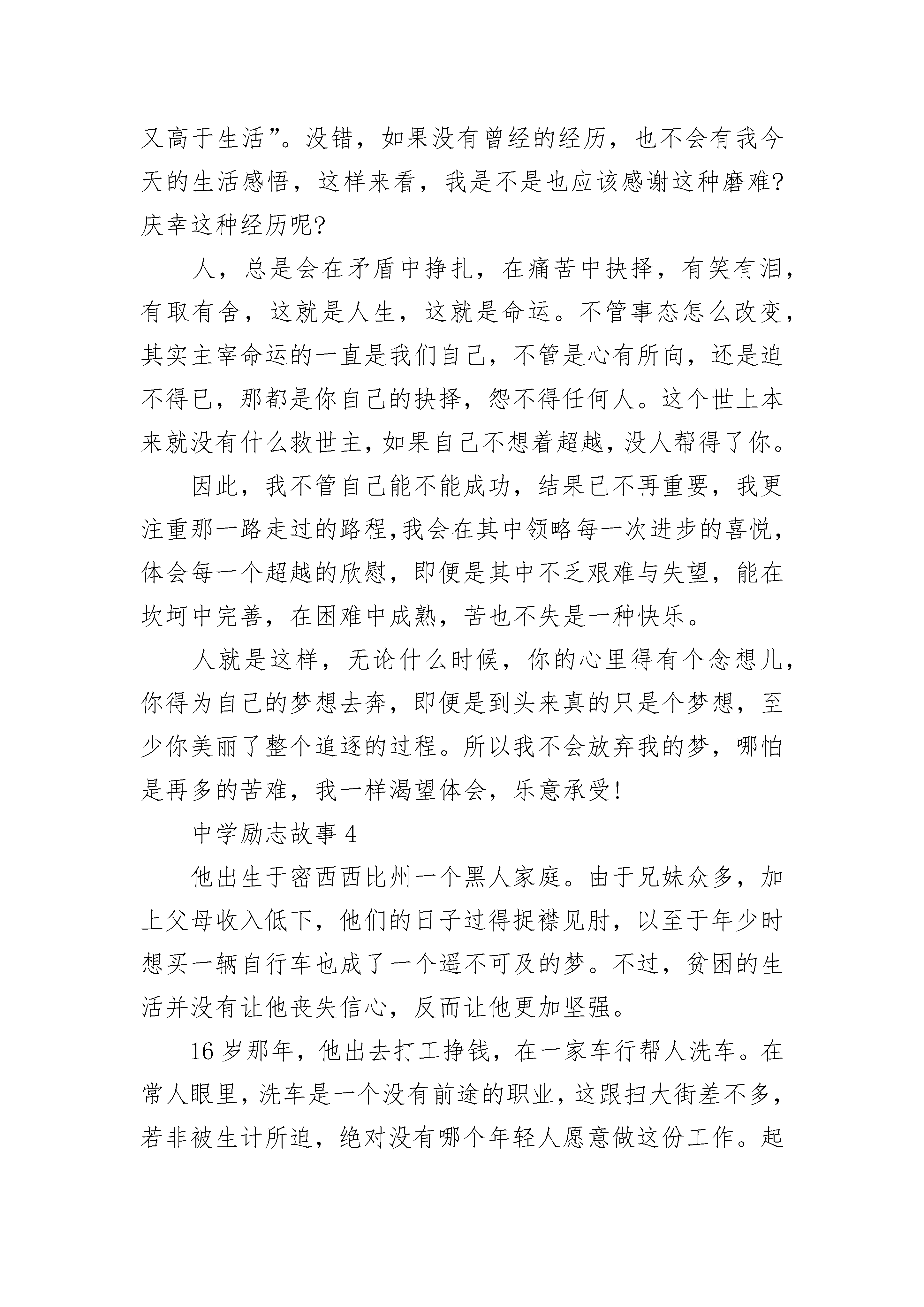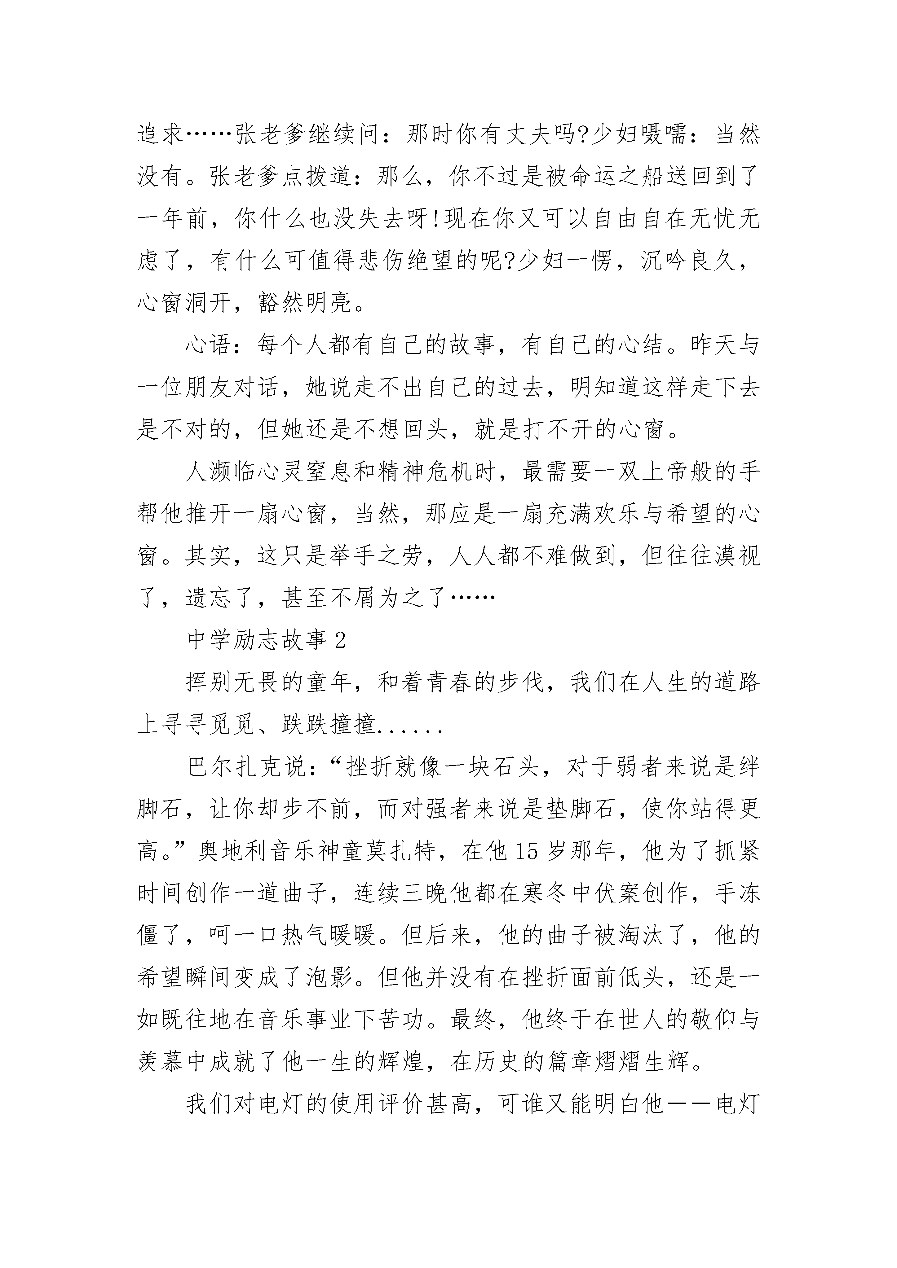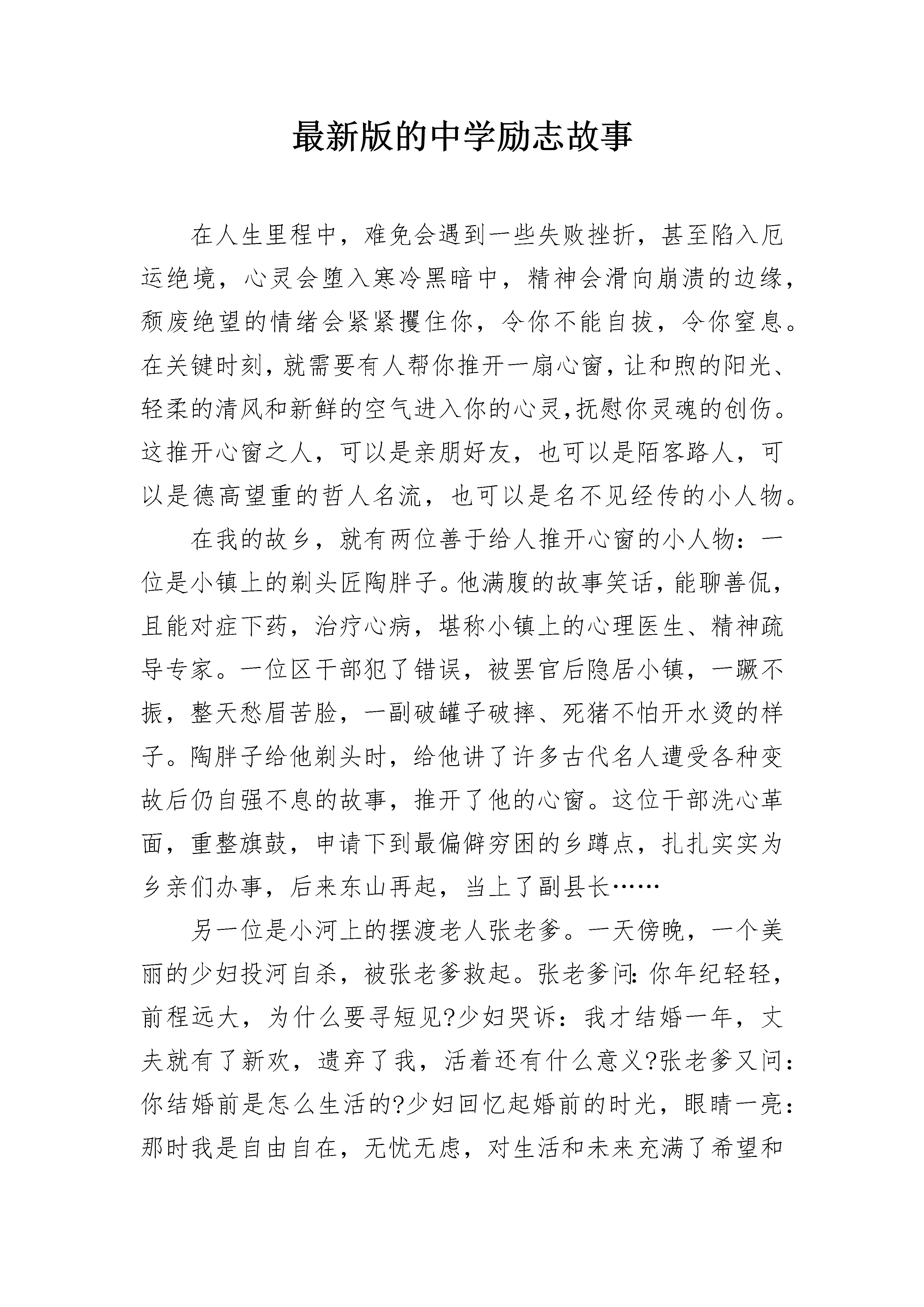 最新版的中学励志故事在人生里程中,难免会遇到一些失败挫折,甚至陷入厄运绝境,心灵会堕入寒冷黑暗中,精神会滑向崩溃的边缘,颓废绝望的情绪会紧紧攫住你,令你不能自拔,令你窒息。在关键时刻,就需要有人帮你推开一扇心窗,让和煦的阳光、轻柔的清风和新鲜的空气进入你的心灵,抚慰你灵魂的创伤。这推开心窗之人,可以是亲朋好友,也可以是陌客路人,可以是德高望重的哲人名流,也可以是名不见经传的小人物。在我的故乡,就有两位善于给人推开心窗的小人物:一位是小镇上的剃头匠陶胖子。他满腹的故事笑话,能聊善侃,且能对症下药,治疗心病,堪称小镇上的心理医生、精神疏导专家。一位区干部犯了错误,被罢官后隐居小镇,一蹶不振,整天愁眉苦脸,一副破罐子破摔、死猪不怕开水烫的样子。陶胖子给他剃头时,给他讲了许多古代名人遭受各种变故后仍自强不息的故事,推开了他的心窗。这位干部洗心革面,重整旗鼓,申请下到最偏僻穷困的乡蹲点,扎扎实实为乡亲们办事,后来东山再起,当上了副县长……另一位是小河上的摆渡老人张老爹。一天傍晚,一个美丽的少妇投河自杀,被张老爹救起。张老爹问:你年纪轻轻,前程远大,为什么要寻短见?少妇哭诉:我才结婚一年,丈夫就有了新欢,遗弃了我,活着还有什么意义?张老爹又问:你结婚前是怎么生活的?少妇回忆起婚前的时光,眼睛一亮:那时我是自由自在,无忧无虑,对生活和未来充满了希望和追求……张老爹继续问:那时你有丈夫吗?少妇嗫嚅:当然没有。张老爹点拨道:那么,你不过是被命运之船送回到了一年前,你什么也没失去呀!现在你又可以自由自在无忧无虑了,有什么可值得悲伤绝望的呢?少妇一愣,沉吟良久,心窗洞开,豁然明亮。心语:每个人都有自己的故事,有自己的心结。昨天与一位朋友对话,她说走不出自己的过去,明知道这样走下去是不对的,但她还是不想回头,就是打不开的心窗。人濒临心灵窒息和精神危机时,最需要一双上帝般的手帮他推开一扇心窗,当然,那应是一扇充满欢乐与希望的心窗。其实,这只是举手之劳,人人都不难做到,但往往漠视了,遗忘了,甚至不屑为之了……中学励志故事2挥别无畏的童年,和着青春的步伐,我们在人生的道路上寻寻觅觅、跌跌撞撞......巴尔扎克说:“挫折就像一块石头,对于弱者来说是绊脚石,让你却步不前,而对强者来说是垫脚石,使你站得更高。”奥地利音乐神童莫扎特,在他15岁那年,他为了抓紧时间创作一道曲子,连续三晚他都在寒冬中伏案创作,手冻僵了,呵一口热气暖暖。但后来,他的曲子被淘汰了,他的希望瞬间变成了泡影。但他并没有在挫折面前低头,还是一如既往地在音乐事业下苦功。最终,他终于在世人的敬仰与羡慕中成就了他一生的辉煌,在历史的篇章熠熠生辉。我们对电灯的使用评价甚高,可谁又能明白他――电灯的发明者爱迪生,经历了多少苦难,失败与挫折。他在发明电灯时,做了一次又一次的试验。在每一次试验失败后,他总结经验,又投入到下一次的试验中,反反复复,直到成功为止。莫扎特、爱迪生,他们的青春年华可以说是在挫折和失败中渡过的。但也正因为有了这些失败的教训,他们才有了精彩的人生。每个人都有属于自己的青春,人生中青春是最最美好的,精彩的阶段.经历了青春的酸,甜,苦,辣,你才会成长为一个真正有意义的人.青春,短暂,会从你手边轻轻流走,把握好青春意味着充实的人生就在不远的前方等待着你!青春就象这束鲜花!开放的时候绚丽无比!可它枯萎的时候就惨不忍睹!我们的青春也是如此,在青春的季节,我们是充满激情,可青春一旦逝去,我们将失去活力,激情,奔放!我们要珍惜青春,不要让它白白流走!中学励志故事3偶然的,在一个角落里找到自己昔日写的一本小诗集,很虔诚的翻阅着那曾经的美丽,诗句虽略显幼稚却不失真挚,虽拘谨也不乏浪漫。品读着自己曾经的心灵小语,突然间有些不敢面对自己了。多少年来,不再有梦想,不再有希翼,不再向往不再追求,早就习惯了安于现状,甚至还可以对自己的颓废理直气壮!这还是我吗?我曾经的理想呢?我曾经的追求呢?那些年少时的狂妄,那些曾经的豪言壮语,都跑哪儿去了呢?我豁然明白,那个年少时的梦想早已被自己丢弃在某个角落里,就如同这本小小的诗集一样。我甚至会编一些幼稚的谎言来欺骗自己,以便给自己的自甘颓废寻找借口!这十多年来,我输给了自己!在少年时代,我就有一个当诗人的梦想,所以对汪国真是情有独钟,光他的诗我就抄了好几大本,每每读着那些优美的诗句,就会幻想有一天自己的文字也可以像他的那样,被人喜爱。然而,当远离了学校,当繁重的农活疲惫了身心,我再也没有闲情逸致去品读那些喜爱的诗句了。(名人名言)直到后来结了婚,有了孩子,也就顺理成章的做起了家庭主妇,过着循规蹈矩的平凡的日子。那个绝美的梦,便在锅碗瓢勺的撞击声中破碎了,曾经的憧憬,曾经的豪情,也就被自己深深地埋葬了。这么多年都在碌碌无为中颓废,在熙熙攘攘中迷失,有时候也会想,如果当初