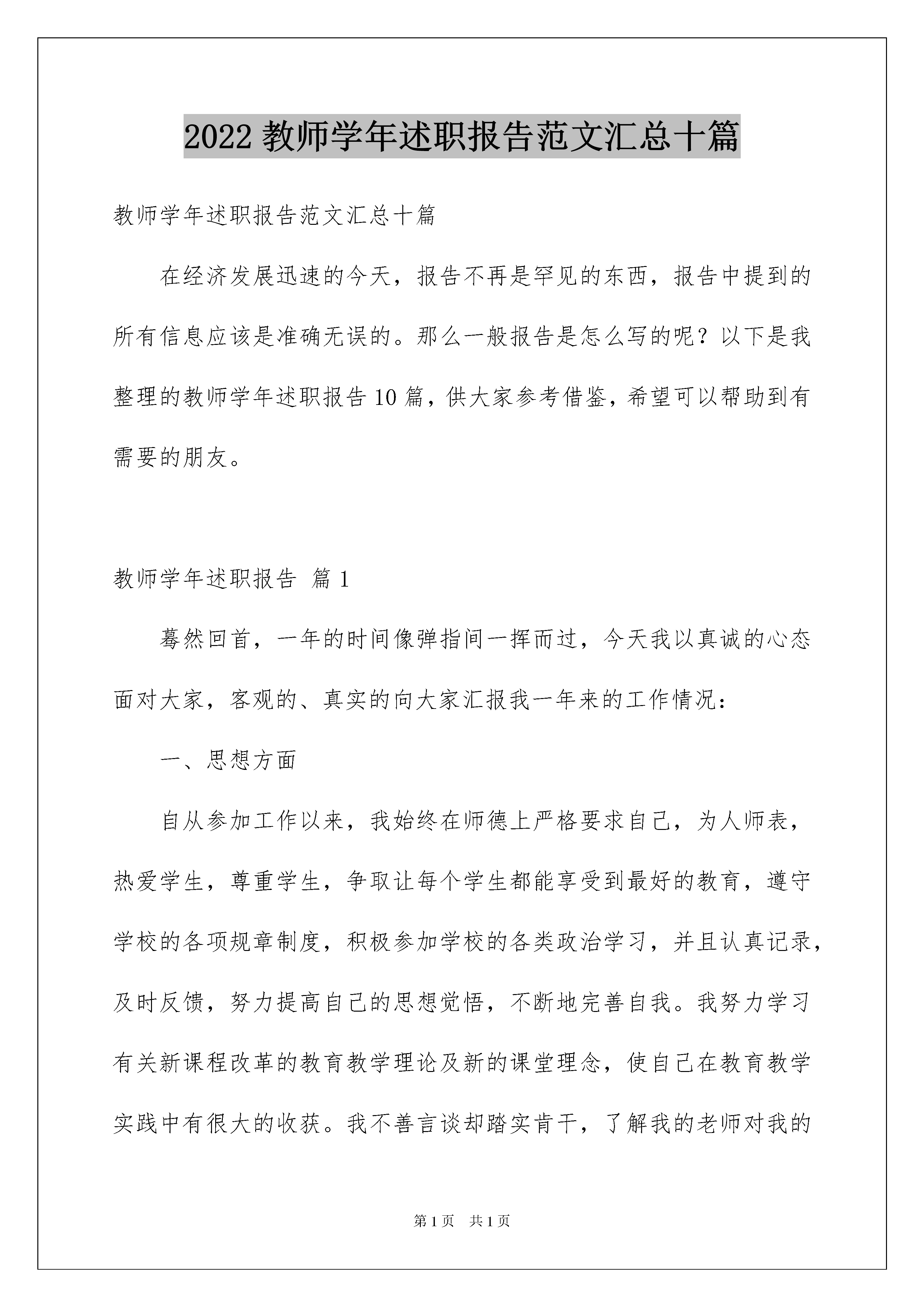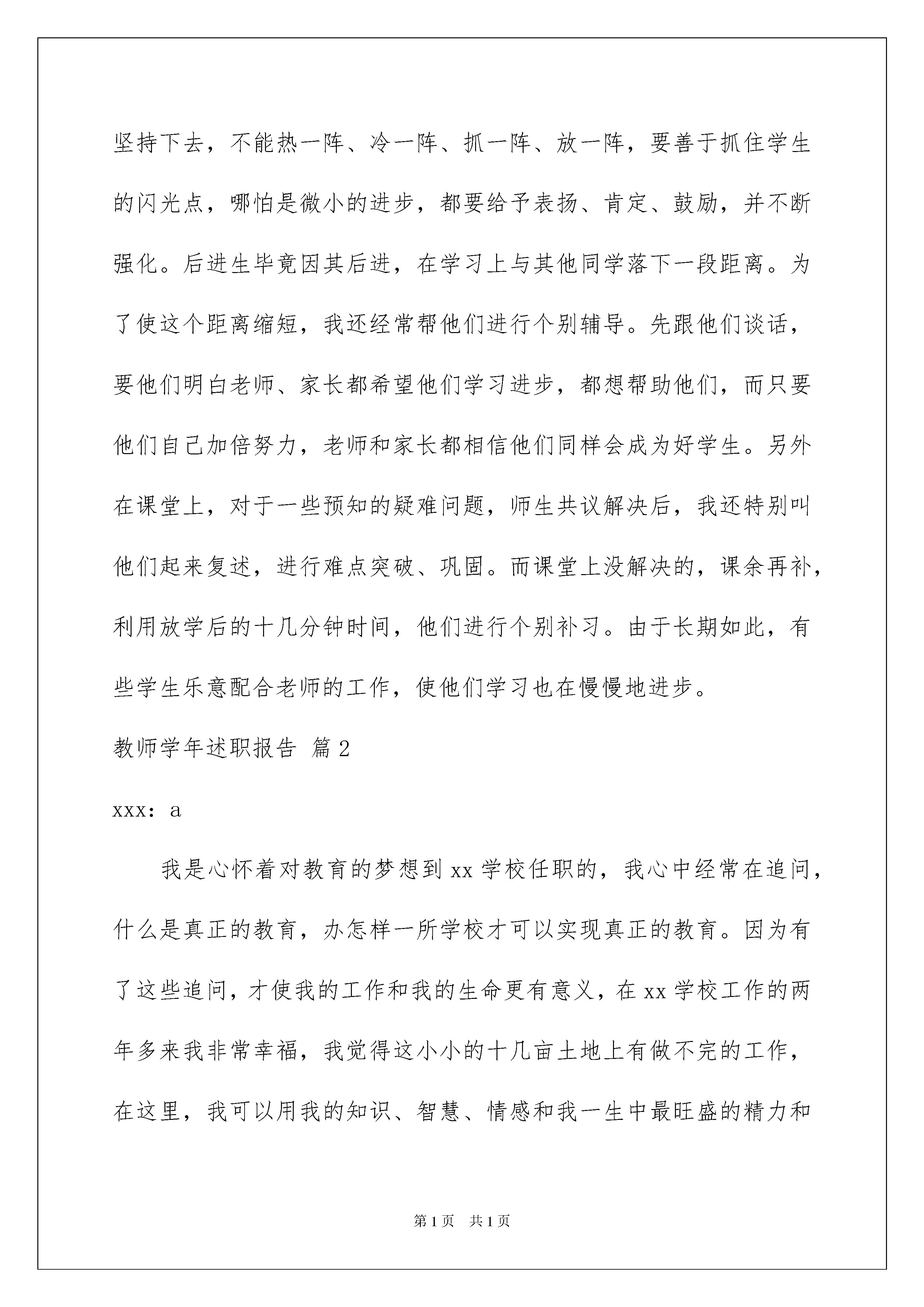 2022教师学年述职报告范文汇总十篇教师学年述职报告范文汇总十篇在经济发展迅速的今天,报告不再是罕见的东西,报告中提到的所有信息应该是准确无误的。那么一般报告是怎么写的呢?以下是我整理的教师学年述职报告10篇,供大家参考借鉴,希望可以帮助到有需要的朋友。教师学年述职报告篇1蓦然回首,一年的时间像弹指间一挥而过,今天我以真诚的心态面对大家,客观的、真实的向大家汇报我一年来的工作情况:一、思想方面自从参加工作以来,我始终在师德上严格要求自己,为人师表,热爱学生,尊重学生,争取让每个学生都能享受到最好的教育,遵守学校的各项规章制度,积极参加学校的各类政治学习,并且认真记录,及时反馈,努力提高自己的思想觉悟,不断地完善自我。我努力学习有关新课程改革的教育教学理论及新的课堂理念,使自己在教育教学实践中有很大的收获。我不善言谈却踏实肯干,了解我的老师对我的评价大都是两个字:实在。我相信再笨拙的行动都能使一切华美的语言黯然失色,只有求真务实才能有真正的收获。我的真诚换来的是老师们的信任与照顾,在学校与大家和睦相处,团结协作,做到大事讲原则,小事讲风格,服从安排,尽心尽职做好自己的本职工作。二、班主任工作本学年我接任一年级(1)班。都说低年级学生好摆弄、听话,其实不是外人所想象的那样。从开学那天起有“艰苦卓绝”的军训和日常排队的训练,运动会、阳光大课间、流动红旗班级评比、家长会等各种活动,这路走来,我用心做好这份工作。我们班有很多孩子是从幼儿园直接进入小学,没有学前班的过渡,无论知识储备还是良好行为习惯几乎都是零。我最初的工作重点是培养最基本课堂规范,养成最基本的学习习惯。现在学生学习状态良好,积极向上的班风初步形成,我在学生的进步中体会到幸福的快乐!在坚持教好书的同时,我从未放弃过育人工作,班主任工作中,我努力做到“爱”和“严”并存。想要教好每一个孩子,就必须对他们有更深的了解,这就必须和他们的家长进行更多的交流。我知道家庭是所更大的学校,不能放松家庭教育。为此,我经常找家长进行交流,和他们谈怎样给孩子创设一个良好的家庭环境,和他们谈怎样教育孩子成为一个高尚的人,和他们谈怎样改正孩子的每一个小毛病。1、在班级中开展竞争意识在班级管理中,老师往往希望全体学生向最好的学生看齐,是不利于调动全体学生的积极性。实施素质教育首要问是面向全体学生,使每个学生的素质都得到提高。班主任必须关注班中的每一名学生,调动他们的积极性。用同一个标准去衡量全体学生是不科学的。试想:在同一次考试中,一名向来不低于九十分的优秀学生只得七十五分,而另一名向来不超过六十分的学生却得了七十分,那么,谁更值得称赞?基于这种认识,为了使班中每一个学生获得不同程度的发展,本学年我在班中开展“比一比谁最棒、我进步了”的教育活动。在全面了解学生的思想状况,学生基础,智力状况,身体素质,性格爱好的基础上,确定每一个学生的奋斗目标,同时,要求每一个学生都客观地、全面地总结自己过去,充分认识自我,然后在思想、学习、纪律、文体劳动、爱好特长等方面确定今后的奋斗目标,并坚持每月写班主任综述表。对不同程度的学生提出不同的要求和奋斗目标,对学生来讲是切合实际,可以接受的。虽然是自己与自己比,但实际上也存在同学之间的相互竞争,这种竞争就是比谁的进步大。这样的竞争是人人都可以争取的,因而,学生谁也没有太重的心理负担,只要努力就有进步,就能实现目标。这样进步和成功的喜悦感,经常在他们心中,班中开展这些活动,使后进生不再消极、气馁,信心十足地面对每一天,优生谦虚谨慎,戒骄戒躁,不断实现自我超越。2、在班级学生转化工作中,要抓得准,做得细,要有恒心,要乐于帮助。准是指在做学生思想工作时,要抓准会出现过错的原因,有针对性地开展思想教育。学生出错的原因是多种多样。例如:好心办错事;出于好奇心而干了错事;受人唆使帮助互相打闹、偷别人的东西;自我要求不严格而违反纪律;家庭教育不良。要仔细分析,找准原因,区别对待,因事因人而异,力求通过正确的教育方法引导学生朝健康的方面发展。细心指导。班级德育工作在于调动学生的积极因素,克服消极因素,提高学生的自觉性,帮助他们健康成长。任何学生都有闪光点,差生也不例外,只要细心留意,就不难发现他们身上的闪光点。班主任要善于抓住学生学习、劳动、班级活动中闪光点,激发他们的上进心和求知欲。恒是指恒心。对转化工作要按计划持之以恒,长期坚持下去,不能热一阵、冷一阵、抓一阵、放一阵,要善于抓住学生的闪光点,哪怕是微小的进步,都要给予表扬、肯定、鼓励,并不断强化。后进生毕竟因其后进,在学习上与其他同学落下一段距离。为了使这个距离缩短,我还经常