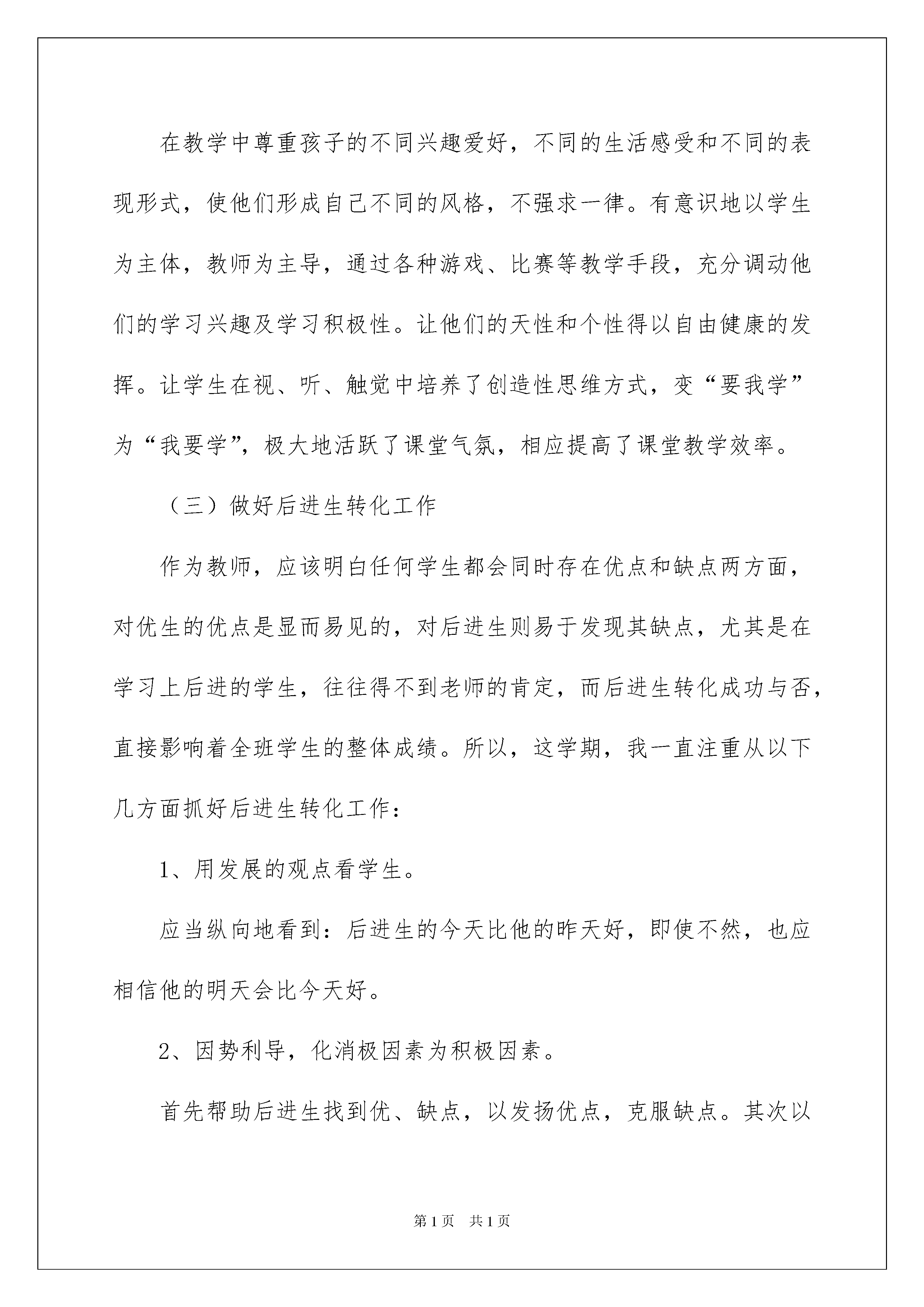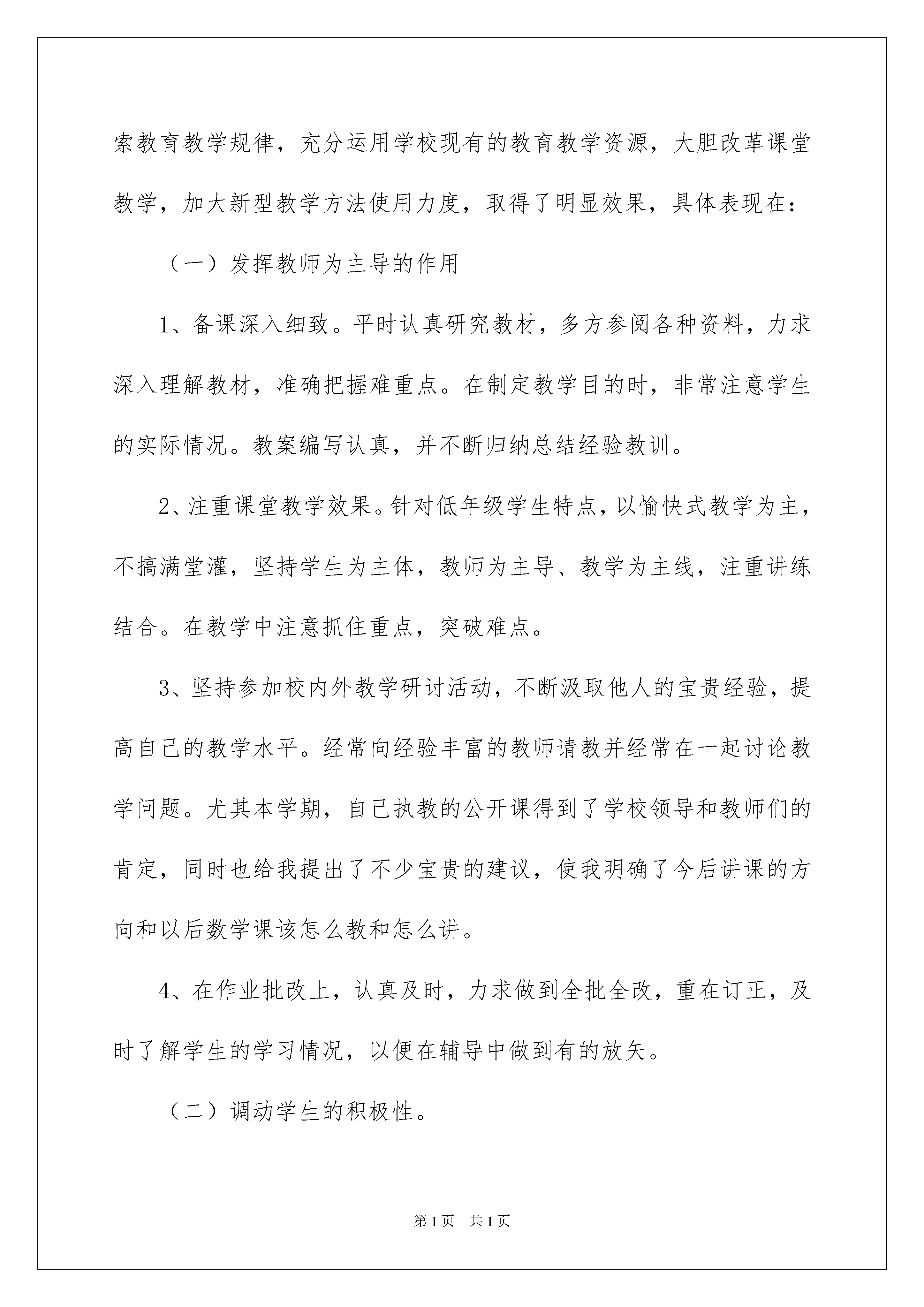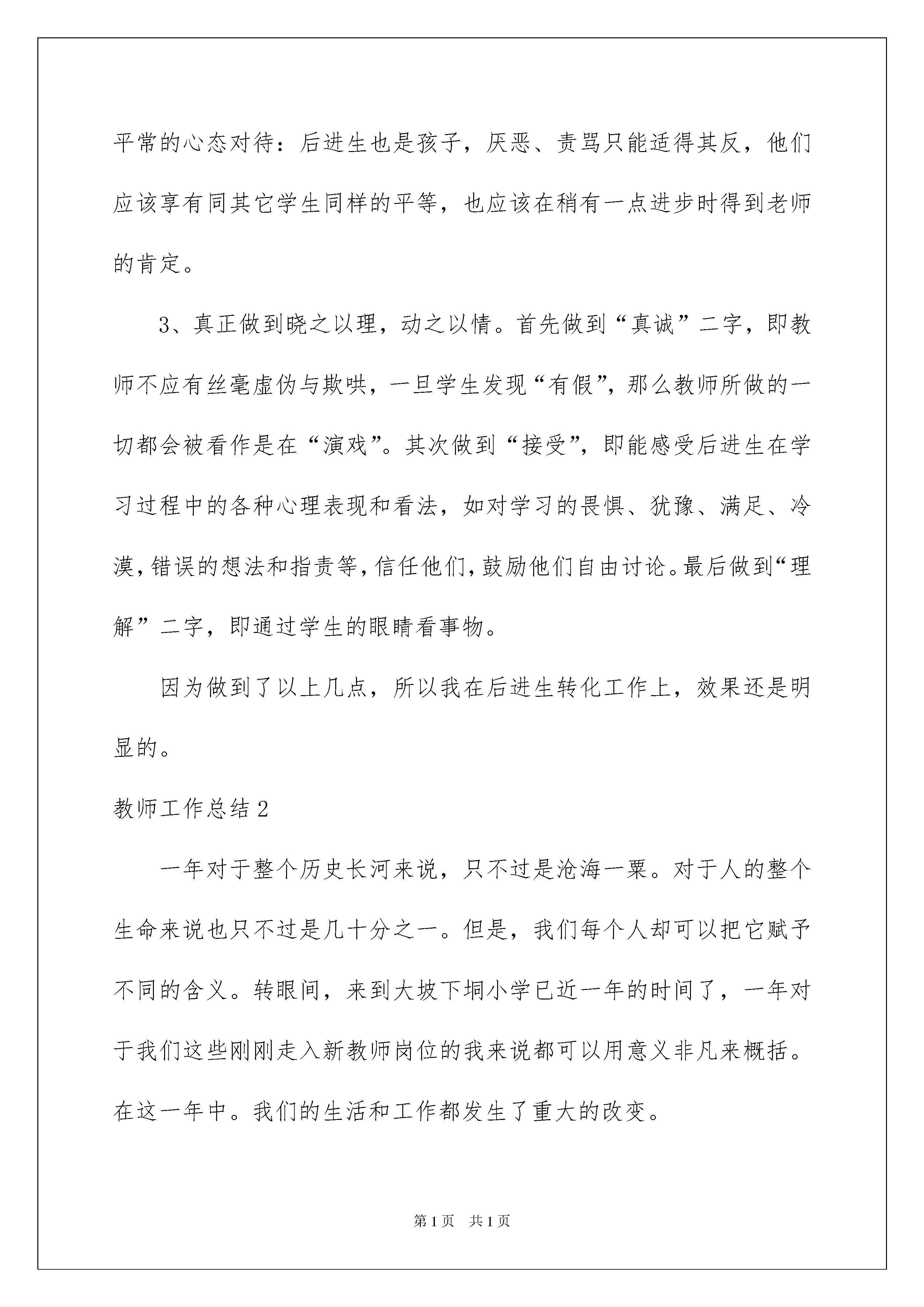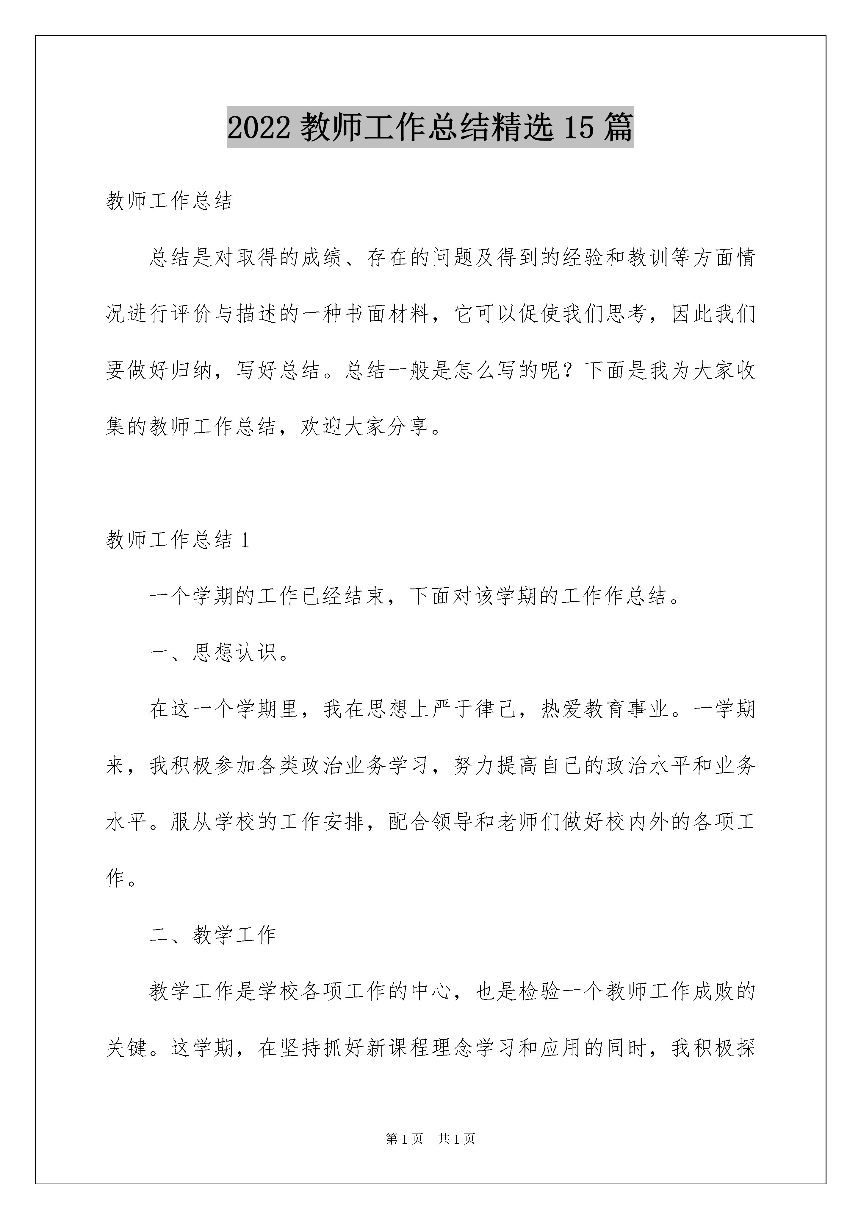 2022教师工作总结精选15篇教师工作总结总结是对取得的成绩、存在的问题及得到的经验和教训等方面情况进行评价与描述的一种书面材料,它可以促使我们思考,因此我们要做好归纳,写好总结。总结一般是怎么写的呢?下面是我为大家收集的教师工作总结,欢迎大家分享。教师工作总结1一个学期的工作已经结束,下面对该学期的工作作总结。一、思想认识。在这一个学期里,我在思想上严于律己,热爱教育事业。一学期来,我积极参加各类政治业务学习,努力提高自己的政治水平和业务水平。服从学校的工作安排,配合领导和老师们做好校内外的各项工作。二、教学工作教学工作是学校各项工作的中心,也是检验一个教师工作成败的关键。这学期,在坚持抓好新课程理念学习和应用的同时,我积极探索教育教学规律,充分运用学校现有的教育教学资源,大胆改革课堂教学,加大新型教学方法使用力度,取得了明显效果,具体表现在:(一)发挥教师为主导的作用1、备课深入细致。平时认真研究教材,多方参阅各种资料,力求深入理解教材,准确把握难重点。在制定教学目的时,非常注意学生的实际情况。教案编写认真,并不断归纳总结经验教训。2、注重课堂教学效果。针对低年级学生特点,以愉快式教学为主,不搞满堂灌,坚持学生为主体,教师为主导、教学为主线,注重讲练结合。在教学中注意抓住重点,突破难点。3、坚持参加校内外教学研讨活动,不断汲取他人的宝贵经验,提高自己的教学水平。经常向经验丰富的教师请教并经常在一起讨论教学问题。尤其本学期,自己执教的公开课得到了学校领导和教师们的肯定,同时也给我提出了不少宝贵的建议,使我明确了今后讲课的方向和以后数学课该怎么教和怎么讲。4、在作业批改上,认真及时,力求做到全批全改,重在订正,及时了解学生的学习情况,以便在辅导中做到有的放矢。(二)调动学生的积极性。在教学中尊重孩子的不同兴趣爱好,不同的生活感受和不同的表现形式,使他们形成自己不同的风格,不强求一律。有意识地以学生为主体,教师为主导,通过各种游戏、比赛等教学手段,充分调动他们的学习兴趣及学习积极性。让他们的天性和个性得以自由健康的发挥。让学生在视、听、触觉中培养了创造性思维方式,变“要我学”为“我要学”,极大地活跃了课堂气氛,相应提高了课堂教学效率。(三)做好后进生转化工作作为教师,应该明白任何学生都会同时存在优点和缺点两方面,对优生的优点是显而易见的,对后进生则易于发现其缺点,尤其是在学习上后进的学生,往往得不到老师的肯定,而后进生转化成功与否,直接影响着全班学生的整体成绩。所以,这学期,我一直注重从以下几方面抓好后进生转化工作:1、用发展的观点看学生。应当纵向地看到:后进生的今天比他的昨天好,即使不然,也应相信他的明天会比今天好。2、因势利导,化消极因素为积极因素。首先帮助后进生找到优、缺点,以发扬优点,克服缺点。其次以平常的心态对待:后进生也是孩子,厌恶、责骂只能适得其反,他们应该享有同其它学生同样的平等,也应该在稍有一点进步时得到老师的肯定。3、真正做到晓之以理,动之以情。首先做到“真诚”二字,即教师不应有丝毫虚伪与欺哄,一旦学生发现“有假”,那么教师所做的一切都会被看作是在“演戏”。其次做到“接受”,即能感受后进生在学习过程中的各种心理表现和看法,如对学习的畏惧、犹豫、满足、冷漠,错误的想法和指责等,信任他们,鼓励他们自由讨论。最后做到“理解”二字,即通过学生的眼睛看事物。因为做到了以上几点,所以我在后进生转化工作上,效果还是明显的。教师工作总结2一年对于整个历史长河来说,只不过是沧海一粟。对于人的整个生命来说也只不过是几十分之一。但是,我们每个人却可以把它赋予不同的含义。转眼间,来到大坡下垌小学已近一年的时间了,一年对于我们这些刚刚走入新教师岗位的我来说都可以用意义非凡来概括。在这一年中。我们的生活和工作都发生了重大的改变。人生最快乐是事就是做自己喜欢做的事。我很庆幸能走上向往已久的三尺讲台。我理想要用我的知识,我的理念去教育一批有理想、有担当、敢作敢为的时代精英,要成为学生们永生难忘的良师益友。然而,这一切美好的想法还没走上讲台,高州新教师培训就给我敲响了警钟。十天的新教师培训告诉我此刻所应具备的不仅仅是激情,而是对教师这一职业有一个清醒的认识:教师,任重而道远;成为学生的良师益友,难上加难;作为老师,只有爱是不行的。认识到自己肩上的责任,了解到以后道路的艰难,并没有挫伤我的积极性,而是让我在有心理准备的情况下多了一把干尽。找到理想与现实的切合点,快速完成从学生到教师这一社会职责的转变。作为一名新教师,最重要的就是通过学习和实践锻炼掌握各项教育技能,成为一名合格的人民教师。为