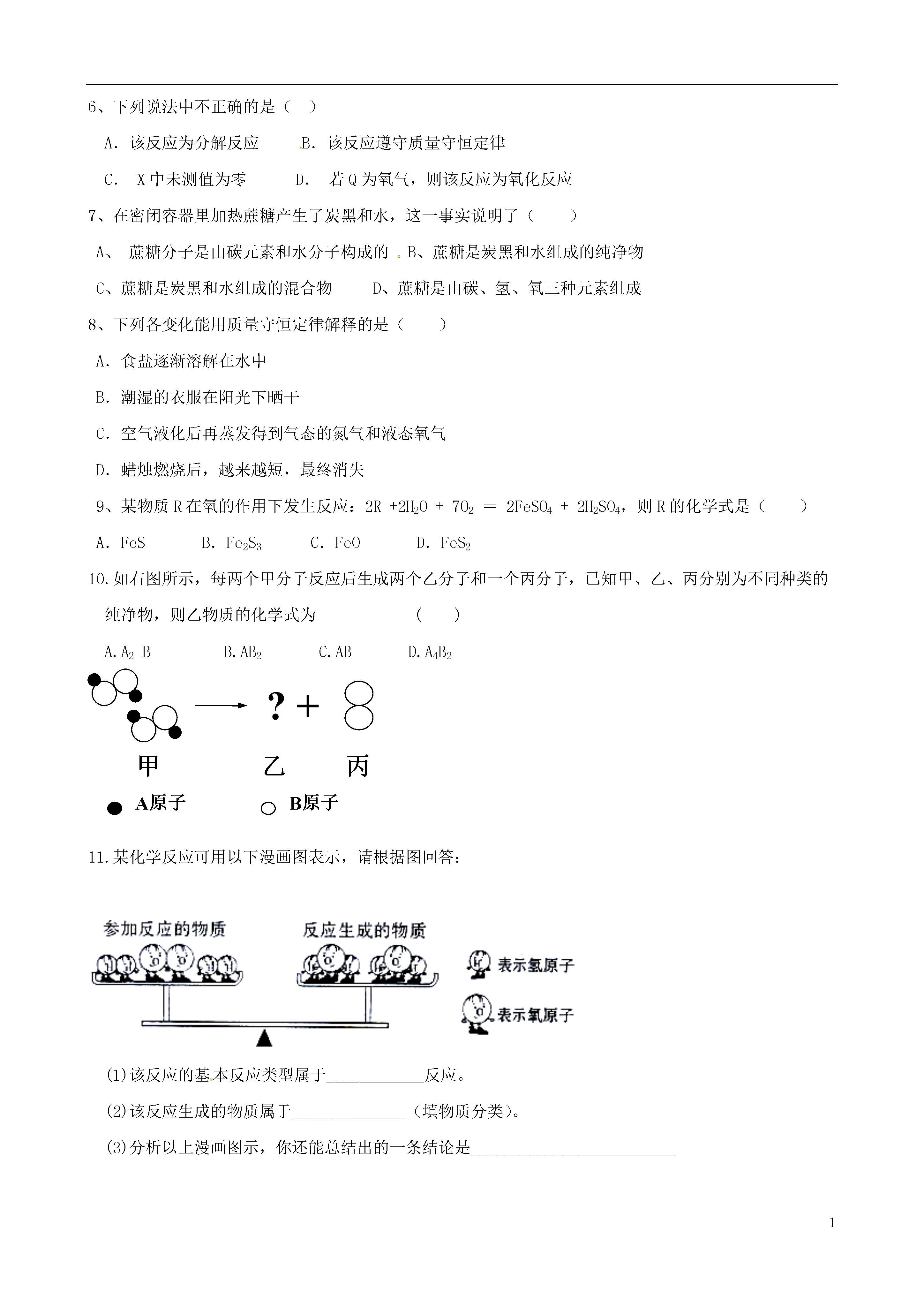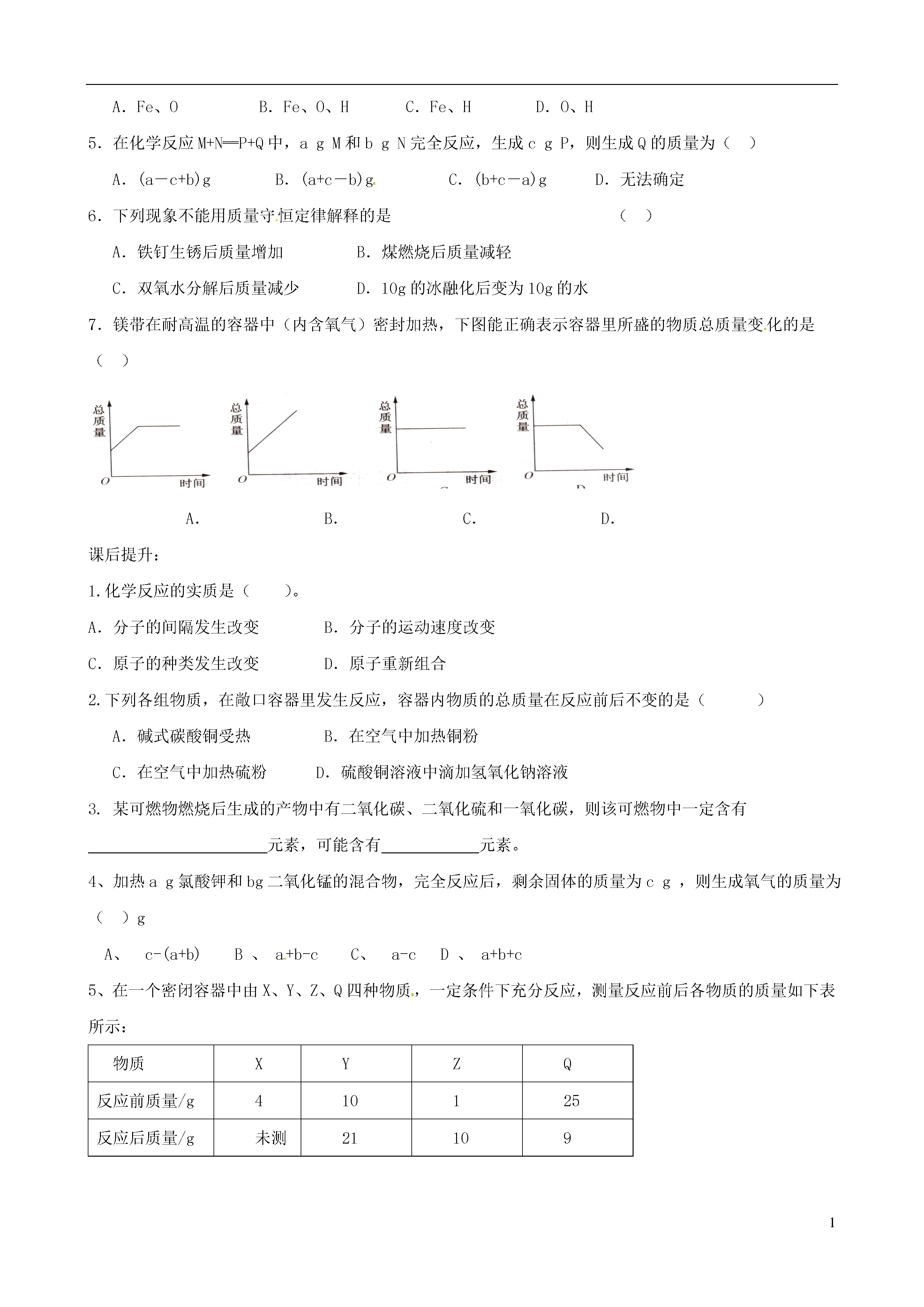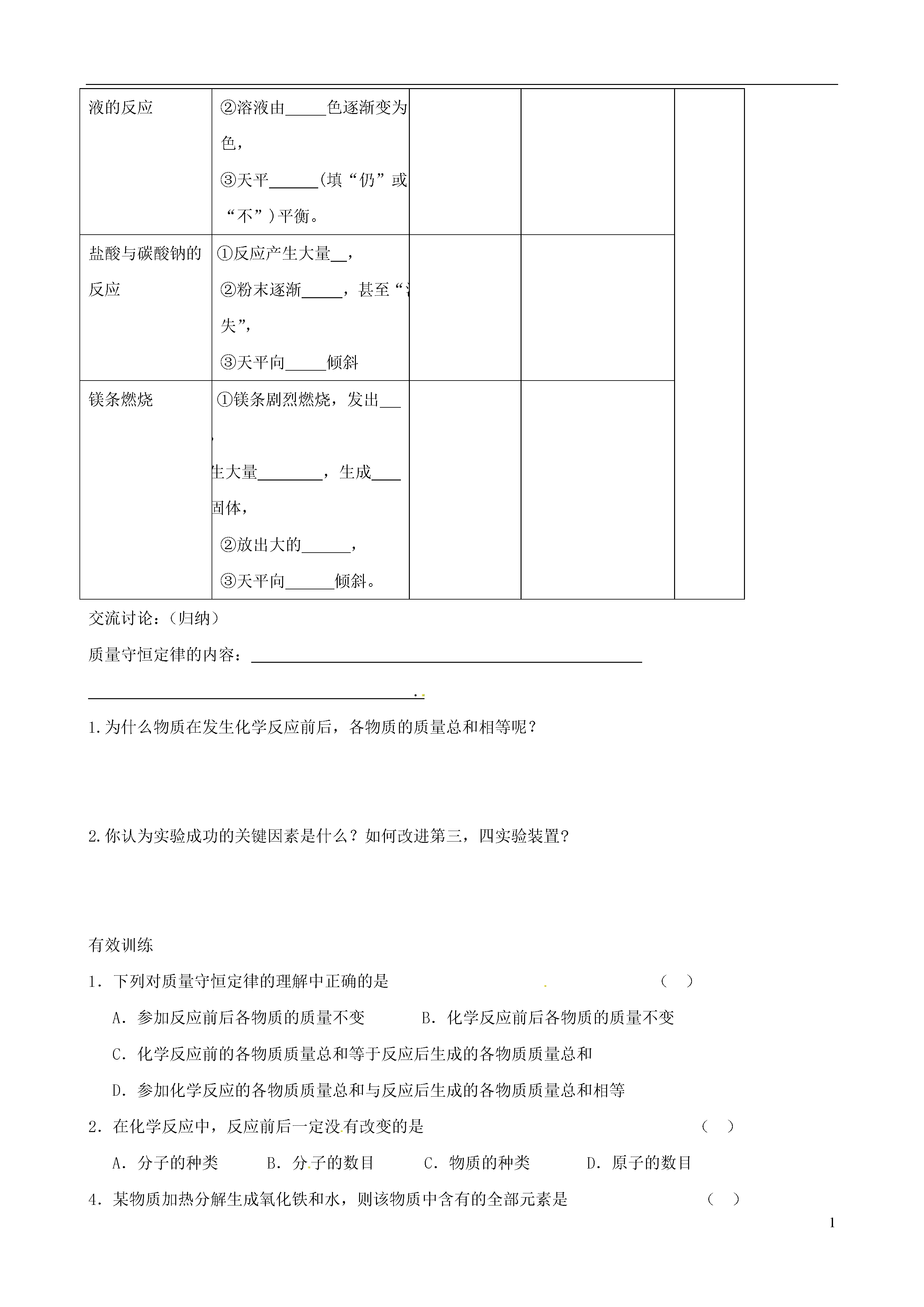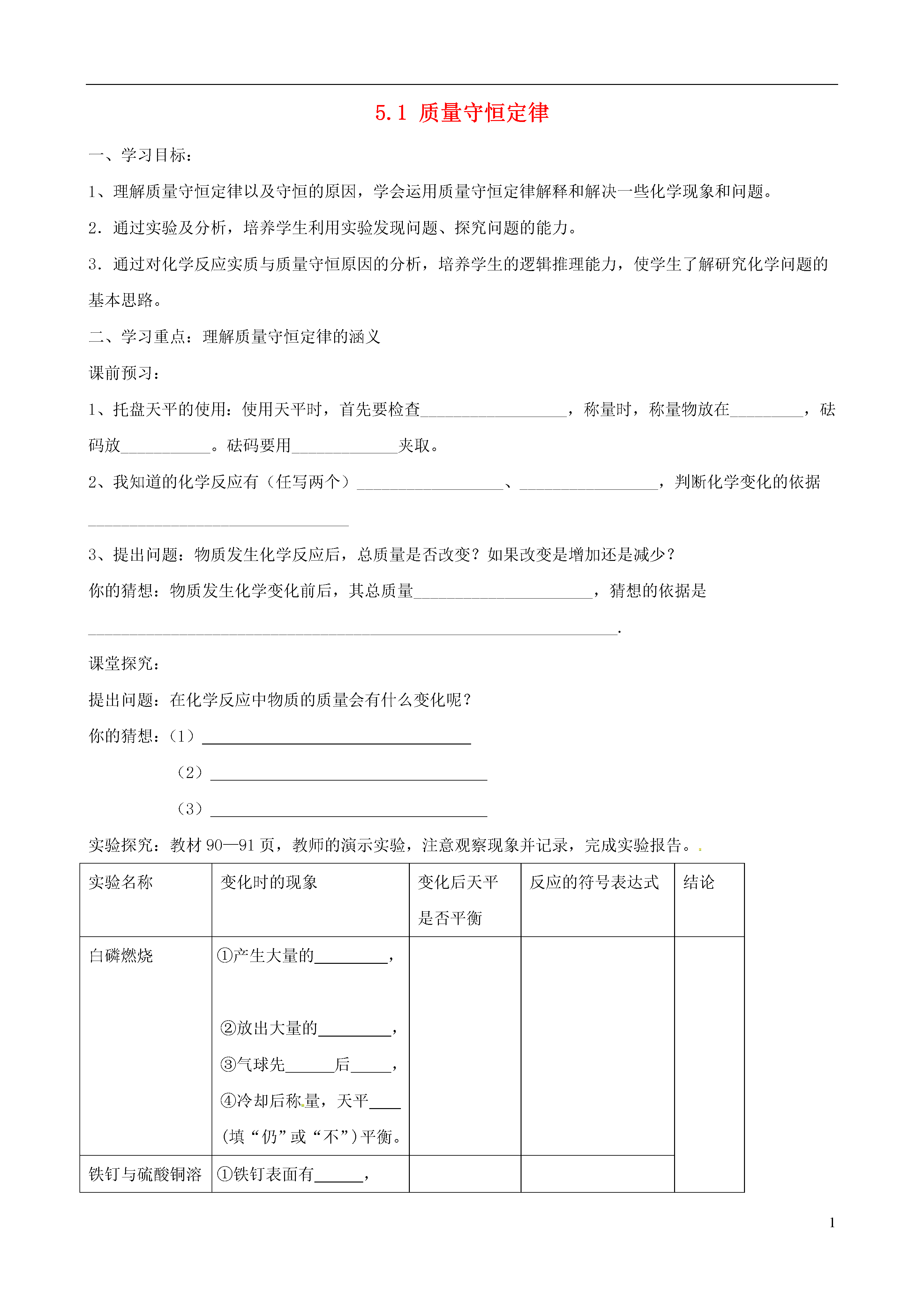 15.1质量守恒定律学习目标:1、理解质量守恒定律以及守恒的原因,学会运用质量守恒定律解释和解决一些化学现象和问题。2.通过实验及分析,培养学生利用实验发现问题、探究问题的能力。3.通过对化学反应实质与质量守恒原因的分析,培养学生的逻辑推理能力,使学生了解研究化学问题的基本思路。学习重点:理解质量守恒定律的涵义课前预习:1、托盘天平的使用:使用天平时,首先要检查__________________,称量时,称量物放在_________,砝码放___________。砝码要用_____________夹取。2、我知道的化学反应有(任写两个)__________________、_________________,判断化学变化的依据________________________________3、提出问题:物质发生化学反应后,总质量是否改变?如果改变是增加还是减少?你的猜想:物质发生化学变化前后,其总质量______________________,猜想的依据是_________________________________________________________________.课堂探究:提出问题:在化学反应中物质的质量会有什么变化呢?你的猜想:(1)(2)(3)实验探究:教材90—91页,教师的演示实验,注意观察现象并记录,完成实验报告。实验名称变化时的现象变化后天平是否平衡反应的符号表达式结论白磷燃烧①产生大量的,②放出大量的,③气球先后,④冷却后称量,天平(填“仍”或“不”)平衡。铁钉与硫酸铜溶液的反应①铁钉表面有,②溶液由色逐渐变为色,③天平(填“仍”或“不”)平衡。盐酸与碳酸钠的反应①反应产生大量,②粉末逐渐,甚至“消失”,③天平向倾斜镁条燃烧①镁条剧烈燃烧,发出光,产生大量,生成色固体,②放出大的,③天平向倾斜。交流讨论:(归纳)质量守恒定律的内容:.1.为什么物质在发生化学反应前后,各物质的质量总和相等呢?2.你认为实验成功的关键因素是什么?如何改进第三,四实验装置?有效训练1.下列对质量守恒定律的理解中正确的是()A.参加反应前后各物质的质量不变B.化学反应前后各物质的质量不变C.化学反应前的各物质质量总和等于反应后生成的各物质质量总和D.参加化学反应的各物质质量总和与反应后生成的各物质质量总和相等2.在化学反应中,反应前后一定没有改变的是()A.分子的种类B.分子的数目C.物质的种类D.原子的数目4.某物质加热分解生成氧化铁和水,则该物质中含有的全部元素是()A.Fe、OB.Fe、O、HC.Fe、HD.O、H5.在化学反应M+N═P+Q中,agM和bgN完全反应,生成cgP,则生成Q的质量为()A.(a-c+b)gB.(a+c-b)gC.(b+c-a)gD.无法确定6.下列现象不能用质量守恒定律解释的是()A.铁钉生锈后质量增加B.煤燃烧后质量减轻C.双氧水分解后质量减少D.10g的冰融化后变为10g的水7.镁带在耐高温的容器中(内含氧气)密封加热,下图能正确表示容器里所盛的物质总质量变化的是()A.B.C.D.课后提升:1.化学反应的实质是()。A.分子的间隔发生改变B.分子的运动速度改变C.原子的种类发生改变D.原子重新组合2.下列各组物质,在敞口容器里发生反应,容器内物质的总质量在反应前后不变的是()A.碱式碳酸铜受热B.在空气中加热铜粉C.在空气中加热硫粉D.硫酸铜溶液中滴加氢氧化钠溶液3.某可燃物燃烧后生成的产物中有二氧化碳、二氧化硫和一氧化碳,则该可燃物中一定含有元素,可能含有元素。4、加热ag氯酸钾和bg二氧化锰的混合物,完全反应后,剩余固体的质量为cg,则生成氧气的质量为()gA、c-(a+b)B、a+b-cC、a-cD、a+b+c5、在一个密闭容器中由X、Y、Z、Q四种物质,一定条件下充分反应,测量反应前后各物质的质量如下表所示:物质XYZQ反应前质量/g410125反应后质量/g未测211096、下列说法中不正确的是()A.该反应为分解反应B.该反应遵守质量守恒定律C.X中未测值为零D.若Q为氧气,则该反应为氧化反应7、在密闭容器里加热蔗糖产生了炭黑和水,这一事实说明了()A、蔗糖分子是由碳元素和水分子构成的B、蔗糖是炭黑和水组成的纯净物C、蔗糖是炭黑和水组成的混合物D、蔗糖是由碳、氢、氧三种元素组成8、下列各变化能用质量守恒定律解释的是()A.食盐逐渐溶解在水中B.潮湿的衣服在阳光下晒干C.空气液化后再蒸发得到气态的氮气和液态氧气D.蜡烛燃烧后,越来越短,最终消失9、