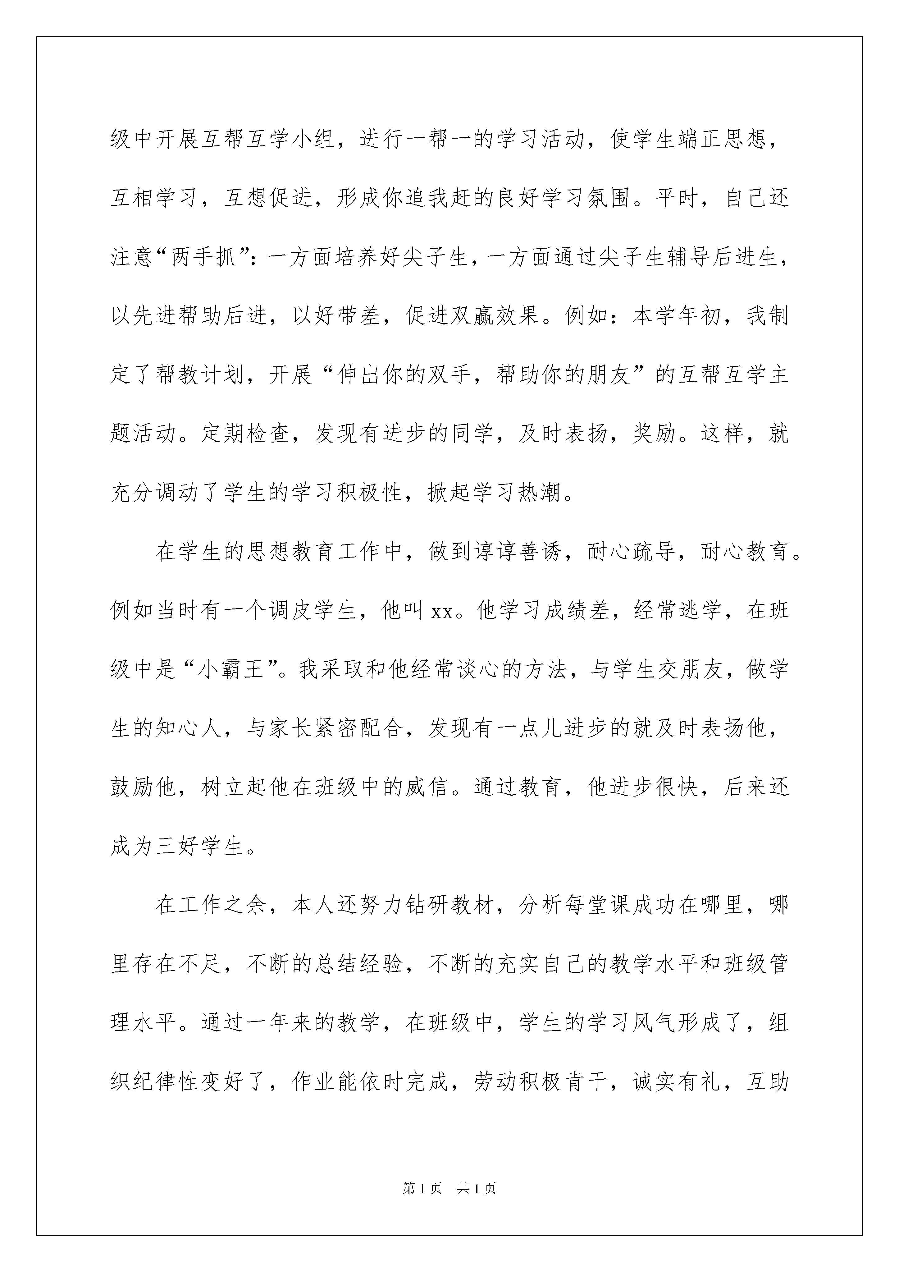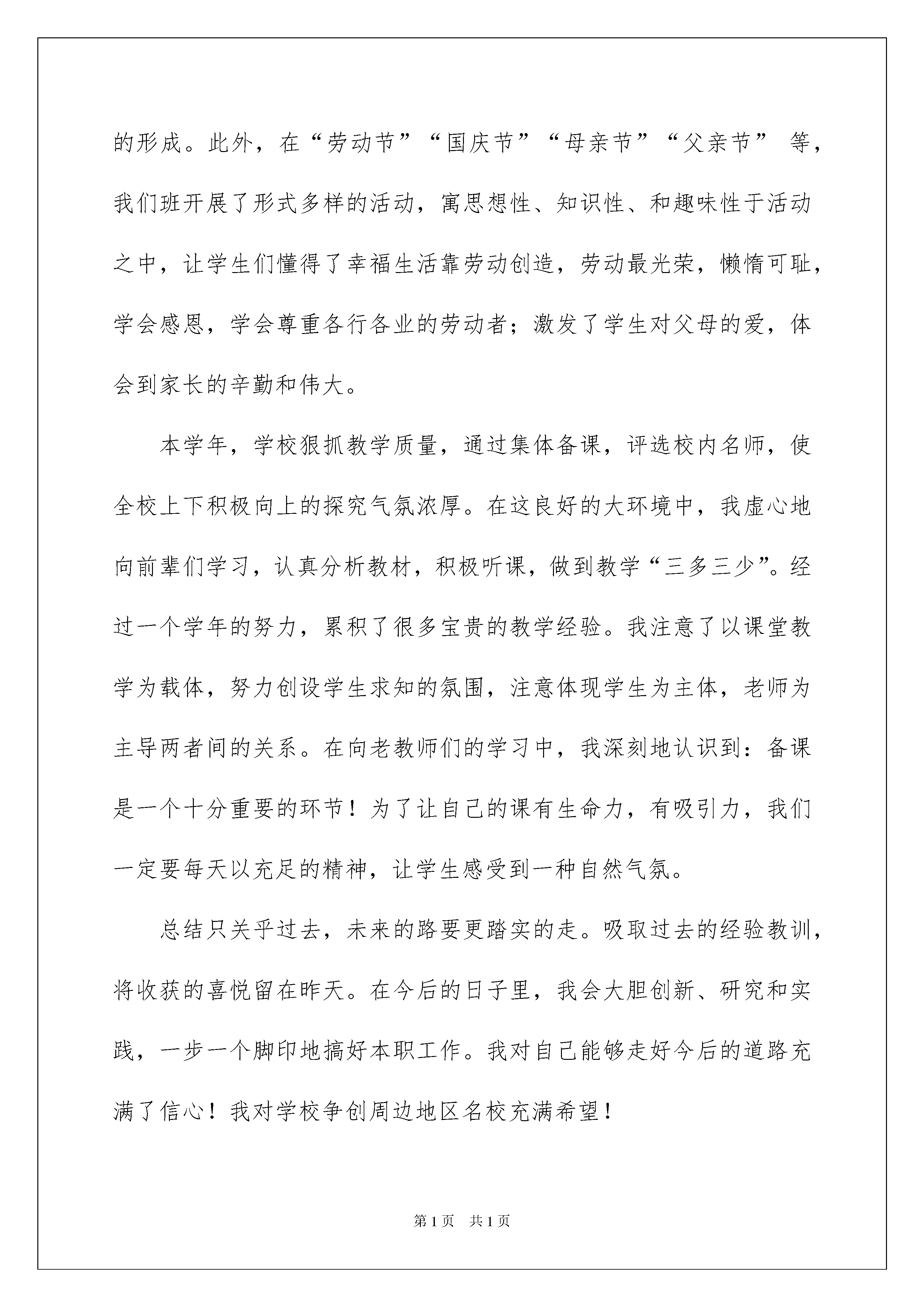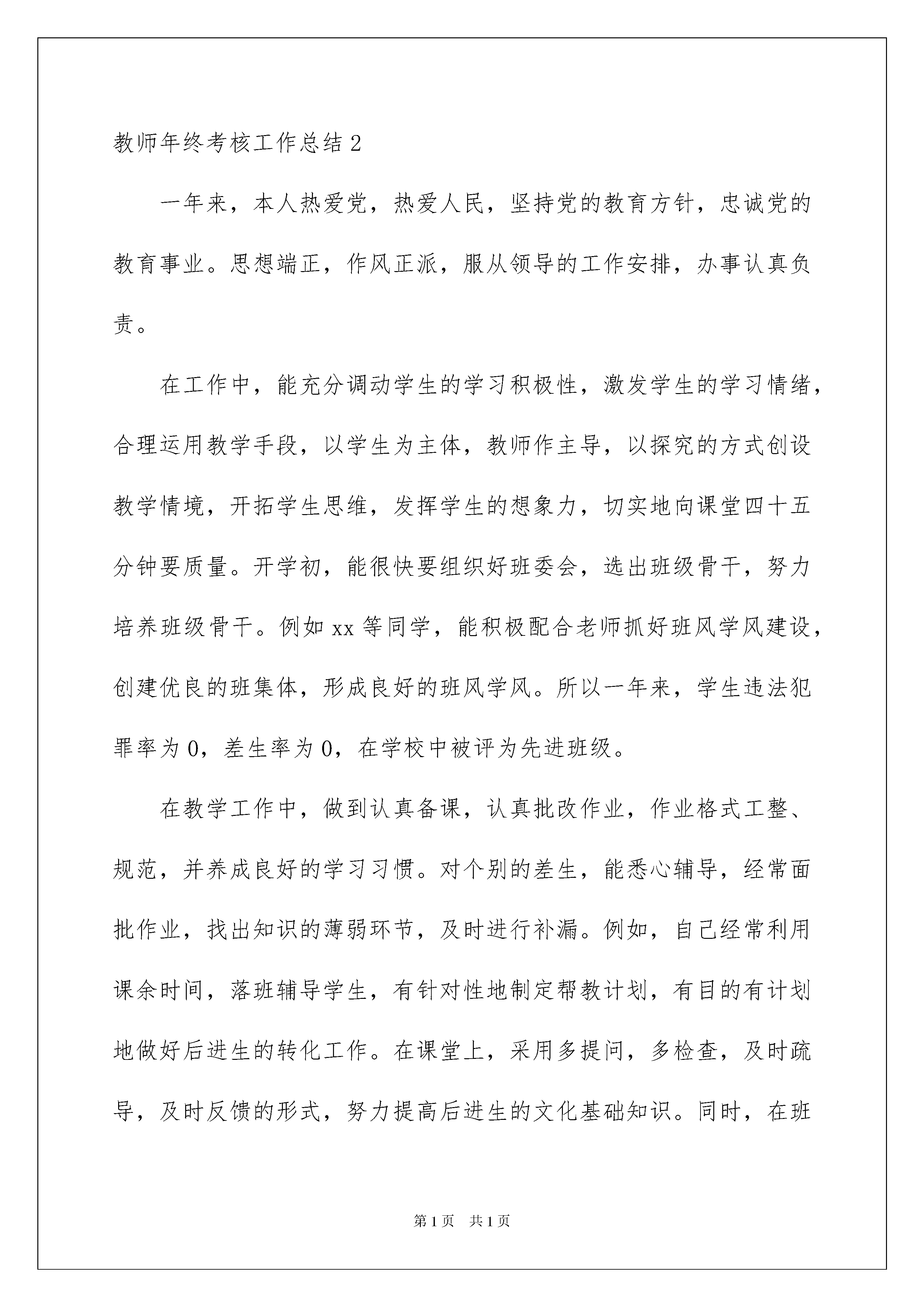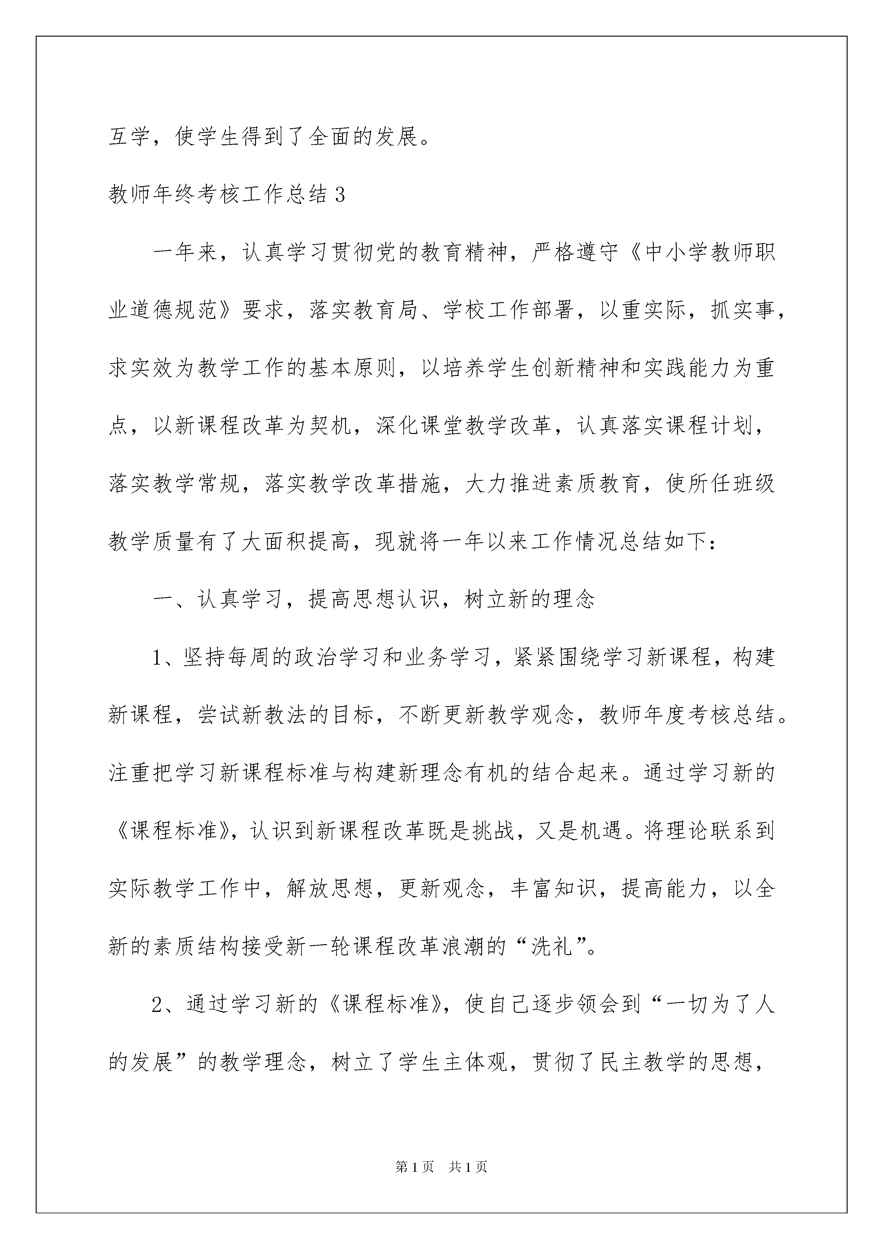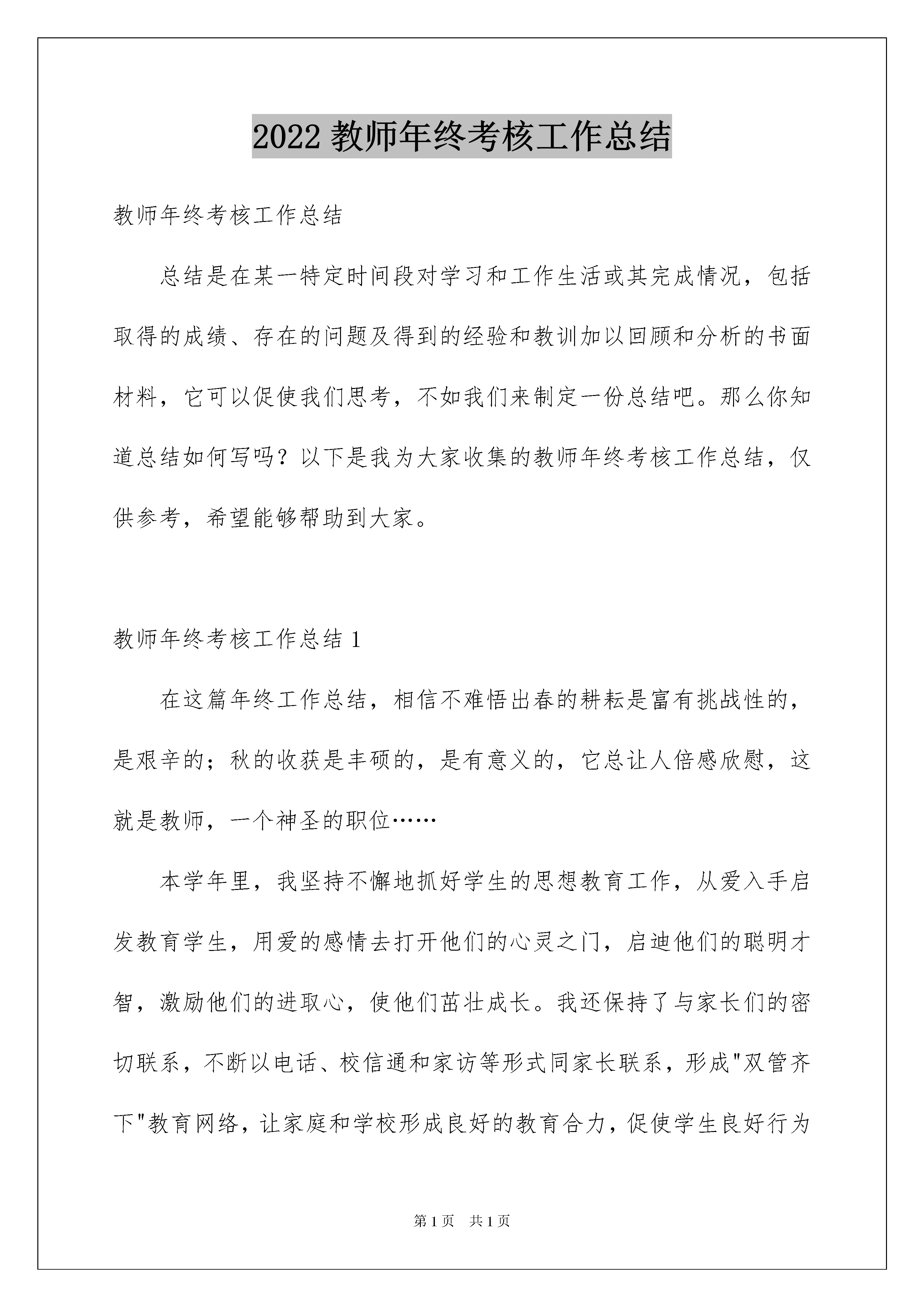 2022教师年终考核工作总结教师年终考核工作总结总结是在某一特定时间段对学习和工作生活或其完成情况,包括取得的成绩、存在的问题及得到的经验和教训加以回顾和分析的书面材料,它可以促使我们思考,不如我们来制定一份总结吧。那么你知道总结如何写吗?以下是我为大家收集的教师年终考核工作总结,仅供参考,希望能够帮助到大家。教师年终考核工作总结1在这篇年终工作总结,相信不难悟出春的耕耘是富有挑战性的,是艰辛的;秋的收获是丰硕的,是有意义的,它总让人倍感欣慰,这就是教师,一个神圣的职位……本学年里,我坚持不懈地抓好学生的思想教育工作,从爱入手启发教育学生,用爱的感情去打开他们的心灵之门,启迪他们的聪明才智,激励他们的进取心,使他们茁壮成长。我还保持了与家长们的密切联系,不断以电话、校信通和家访等形式同家长联系,形成"双管齐下"教育网络,让家庭和学校形成良好的教育合力,促使学生良好行为的形成。此外,在“劳动节”“国庆节”“母亲节”“父亲节”等,我们班开展了形式多样的活动,寓思想性、知识性、和趣味性于活动之中,让学生们懂得了幸福生活靠劳动创造,劳动最光荣,懒惰可耻,学会感恩,学会尊重各行各业的劳动者;激发了学生对父母的爱,体会到家长的辛勤和伟大。本学年,学校狠抓教学质量,通过集体备课,评选校内名师,使全校上下积极向上的探究气氛浓厚。在这良好的大环境中,我虚心地向前辈们学习,认真分析教材,积极听课,做到教学“三多三少”。经过一个学年的努力,累积了很多宝贵的教学经验。我注意了以课堂教学为载体,努力创设学生求知的氛围,注意体现学生为主体,老师为主导两者间的关系。在向老教师们的学习中,我深刻地认识到:备课是一个十分重要的环节!为了让自己的课有生命力,有吸引力,我们一定要每天以充足的精神,让学生感受到一种自然气氛。总结只关乎过去,未来的路要更踏实的走。吸取过去的经验教训,将收获的喜悦留在昨天。在今后的日子里,我会大胆创新、研究和实践,一步一个脚印地搞好本职工作。我对自己能够走好今后的道路充满了信心!我对学校争创周边地区名校充满希望!教师年终考核工作总结2一年来,本人热爱党,热爱人民,坚持党的教育方针,忠诚党的教育事业。思想端正,作风正派,服从领导的工作安排,办事认真负责。在工作中,能充分调动学生的学习积极性,激发学生的学习情绪,合理运用教学手段,以学生为主体,教师作主导,以探究的方式创设教学情境,开拓学生思维,发挥学生的想象力,切实地向课堂四十五分钟要质量。开学初,能很快要组织好班委会,选出班级骨干,努力培养班级骨干。例如xx等同学,能积极配合老师抓好班风学风建设,创建优良的班集体,形成良好的班风学风。所以一年来,学生违法犯罪率为0,差生率为0,在学校中被评为先进班级。在教学工作中,做到认真备课,认真批改作业,作业格式工整、规范,并养成良好的学习习惯。对个别的差生,能悉心辅导,经常面批作业,找出知识的薄弱环节,及时进行补漏。例如,自己经常利用课余时间,落班辅导学生,有针对性地制定帮教计划,有目的有计划地做好后进生的转化工作。在课堂上,采用多提问,多检查,及时疏导,及时反馈的形式,努力提高后进生的文化基础知识。同时,在班级中开展互帮互学小组,进行一帮一的学习活动,使学生端正思想,互相学习,互想促进,形成你追我赶的良好学习氛围。平时,自己还注意“两手抓”:一方面培养好尖子生,一方面通过尖子生辅导后进生,以先进帮助后进,以好带差,促进双赢效果。例如:本学年初,我制定了帮教计划,开展“伸出你的双手,帮助你的朋友”的互帮互学主题活动。定期检查,发现有进步的同学,及时表扬,奖励。这样,就充分调动了学生的学习积极性,掀起学习热潮。在学生的思想教育工作中,做到谆谆善诱,耐心疏导,耐心教育。例如当时有一个调皮学生,他叫xx。他学习成绩差,经常逃学,在班级中是“小霸王”。我采取和他经常谈心的方法,与学生交朋友,做学生的知心人,与家长紧密配合,发现有一点儿进步的就及时表扬他,鼓励他,树立起他在班级中的威信。通过教育,他进步很快,后来还成为三好学生。在工作之余,本人还努力钻研教材,分析每堂课成功在哪里,哪里存在不足,不断的总结经验,不断的充实自己的教学水平和班级管理水平。通过一年来的教学,在班级中,学生的学习风气形成了,组织纪律性变好了,作业能依时完成,劳动积极肯干,诚实有礼,互助互学,使学生得到了全面的发展。教师年终考核工作总结3一年来,认真学习贯彻党的教育精神,严格遵守《中小学教师职业道德规范》要求,落实教育局、学校工作部署,以重实际,抓实事,求实效为教学工作的基本原则,以培养学生创新精神和实践能力为重点,以新课程改革为