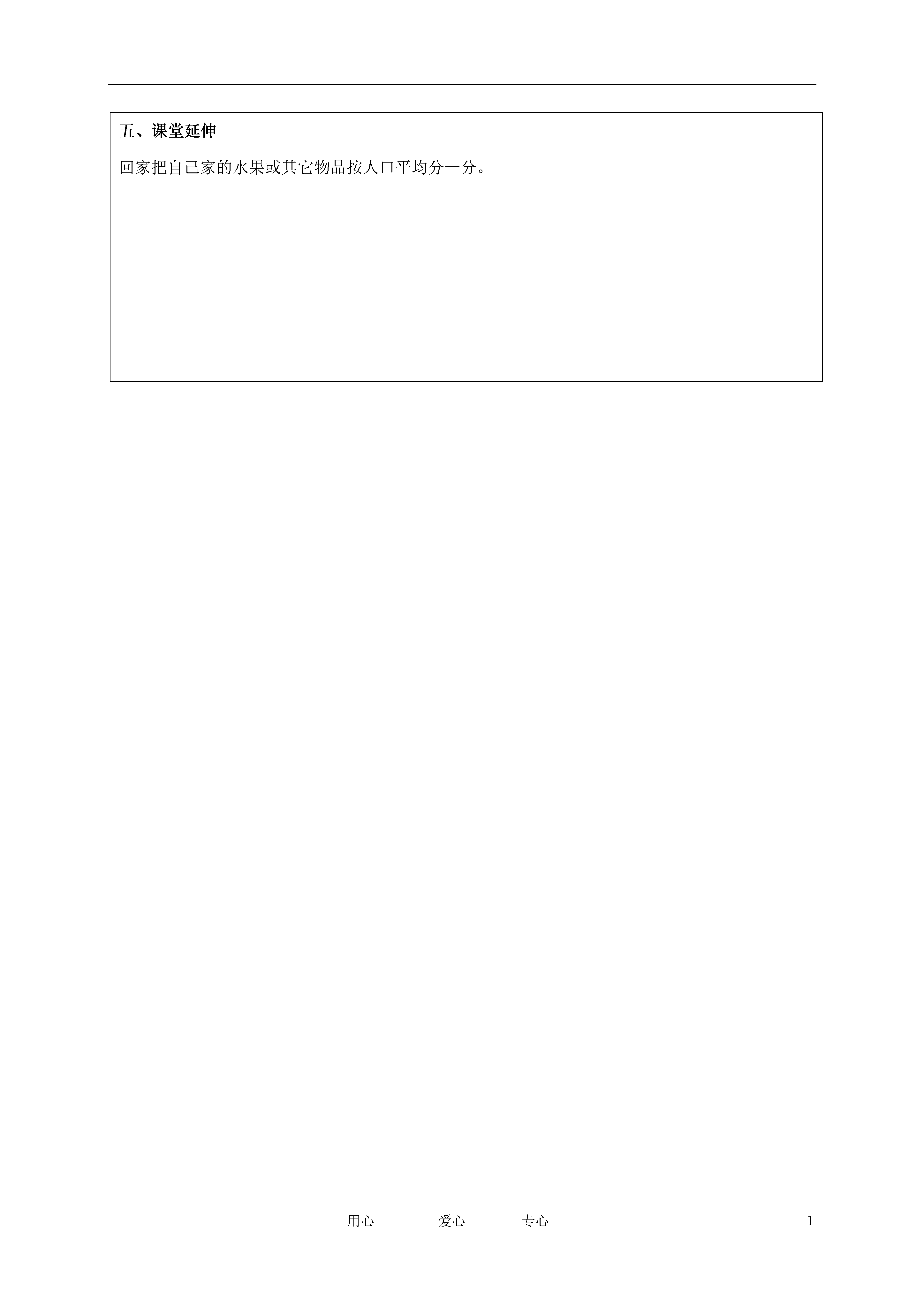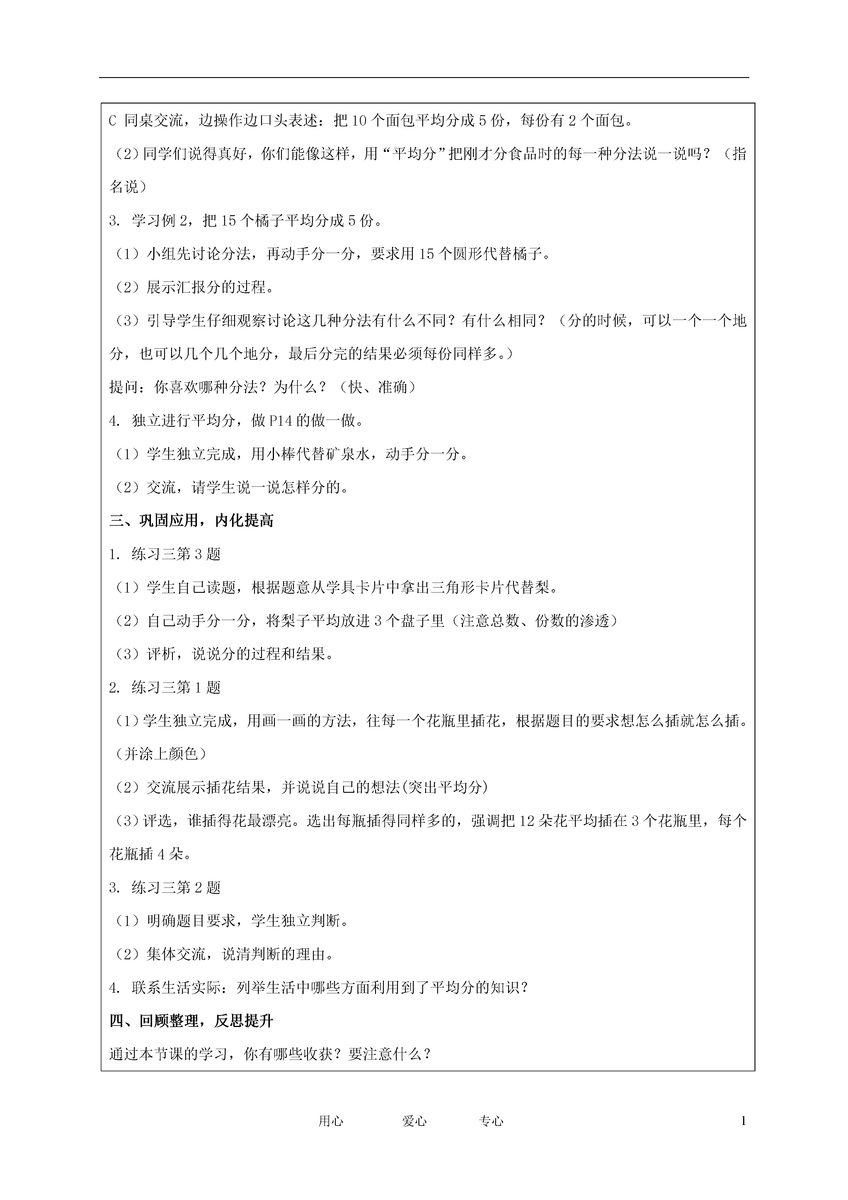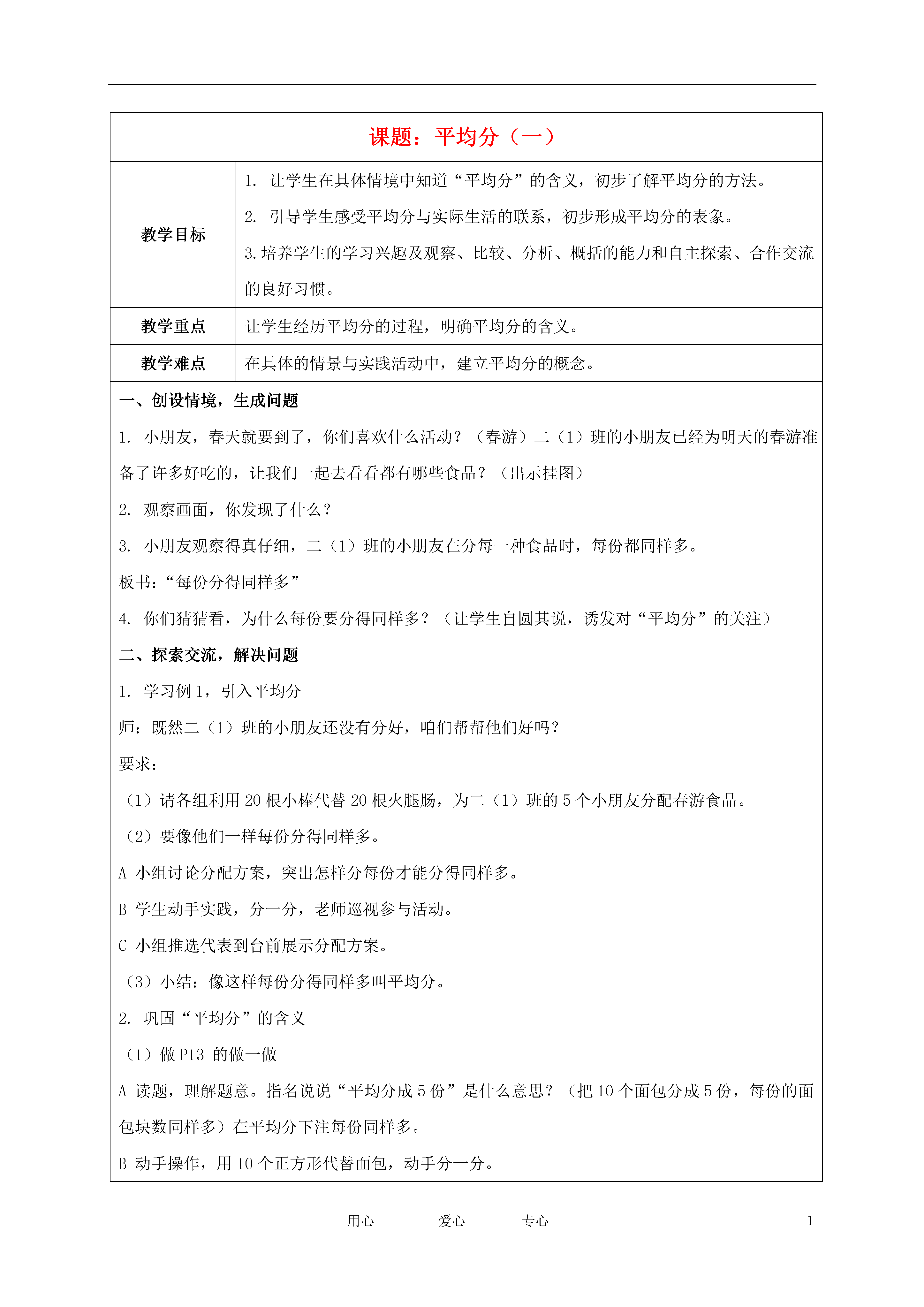 1用心爱心专心课题:平均分(一)教学目标1.让学生在具体情境中知道“平均分”的含义,初步了解平均分的方法。2.引导学生感受平均分与实际生活的联系,初步形成平均分的表象。3.培养学生的学习兴趣及观察、比较、分析、概括的能力和自主探索、合作交流的良好习惯。教学重点让学生经历平均分的过程,明确平均分的含义。教学难点在具体的情景与实践活动中,建立平均分的概念。一、创设情境,生成问题1.小朋友,春天就要到了,你们喜欢什么活动?(春游)二(1)班的小朋友已经为明天的春游准备了许多好吃的,让我们一起去看看都有哪些食品?(出示挂图)2.观察画面,你发现了什么?3.小朋友观察得真仔细,二(1)班的小朋友在分每一种食品时,每份都同样多。板书:“每份分得同样多”4.你们猜猜看,为什么每份要分得同样多?(让学生自圆其说,诱发对“平均分”的关注)二、探索交流,解决问题1.学习例1,引入平均分师:既然二(1)班的小朋友还没有分好,咱们帮帮他们好吗?要求:(1)请各组利用20根小棒代替20根火腿肠,为二(1)班的5个小朋友分配春游食品。(2)要像他们一样每份分得同样多。A小组讨论分配方案,突出怎样分每份才能分得同样多。B学生动手实践,分一分,老师巡视参与活动。C小组推选代表到台前展示分配方案。(3)小结:像这样每份分得同样多叫平均分。2.巩固“平均分”的含义(1)做P13的做一做A读题,理解题意。指名说说“平均分成5份”是什么意思?(把10个面包分成5份,每份的面包块数同样多)在平均分下注每份同样多。B动手操作,用10个正方形代替面包,动手分一分。C同桌交流,边操作边口头表述:把10个面包平均分成5份,每份有2个面包。(2)同学们说得真好,你们能像这样,用“平均分”把刚才分食品时的每一种分法说一说吗?(指名说)3.学习例2,把15个橘子平均分成5份。(1)小组先讨论分法,再动手分一分,要求用15个圆形代替橘子。(2)展示汇报分的过程。(3)引导学生仔细观察讨论这几种分法有什么不同?有什么相同?(分的时候,可以一个一个地分,也可以几个几个地分,最后分完的结果必须每份同样多。)提问:你喜欢哪种分法?为什么?(快、准确)4.独立进行平均分,做P14的做一做。(1)学生独立完成,用小棒代替矿泉水,动手分一分。(2)交流,请学生说一说怎样分的。三、巩固应用,内化提高1.练习三第3题(1)学生自己读题,根据题意从学具卡片中拿出三角形卡片代替梨。(2)自己动手分一分,将梨子平均放进3个盘子里(注意总数、份数的渗透)(3)评析,说说分的过程和结果。2.练习三第1题(1)学生独立完成,用画一画的方法,往每一个花瓶里插花,根据题目的要求想怎么插就怎么插。(并涂上颜色)(2)交流展示插花结果,并说说自己的想法(突出平均分)(3)评选,谁插得花最漂亮。选出每瓶插得同样多的,强调把12朵花平均插在3个花瓶里,每个花瓶插4朵。3.练习三第2题(1)明确题目要求,学生独立判断。(2)集体交流,说清判断的理由。4.联系生活实际:列举生活中哪些方面利用到了平均分的知识?四、回顾整理,反思提升通过本节课的学习,你有哪些收获?要注意什么?五、课堂延伸回家把自己家的水果或其它物品按人口平均分一分。