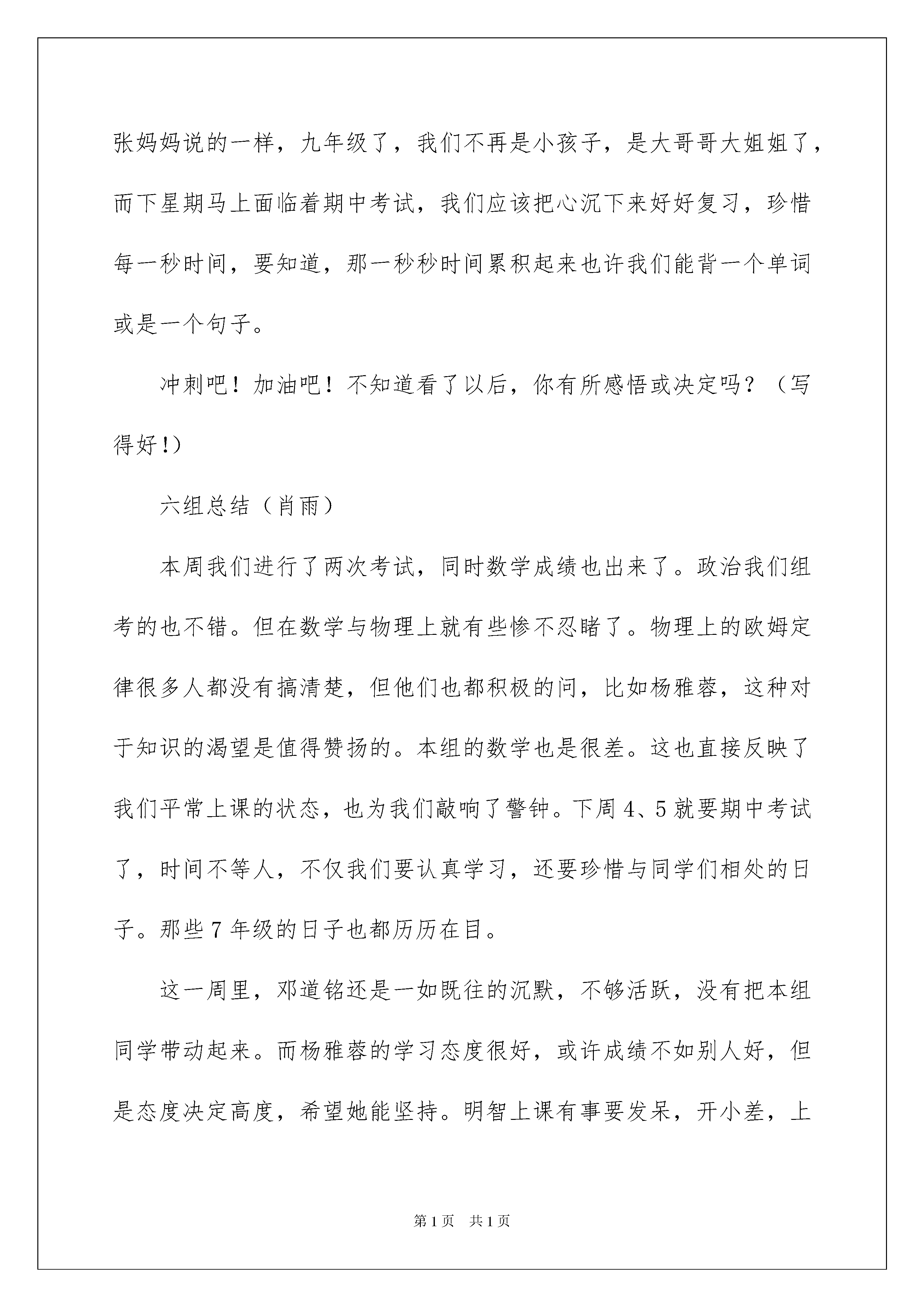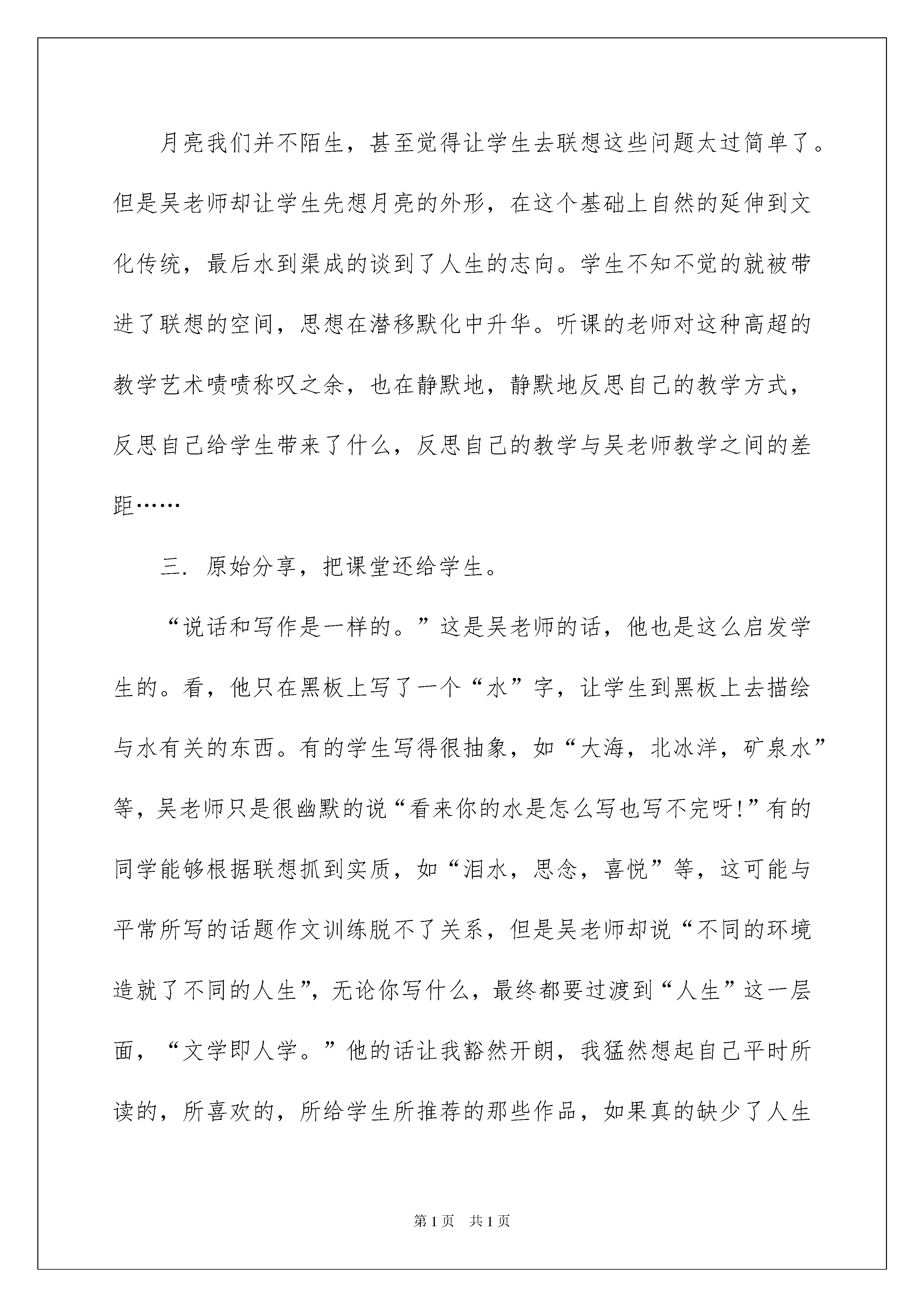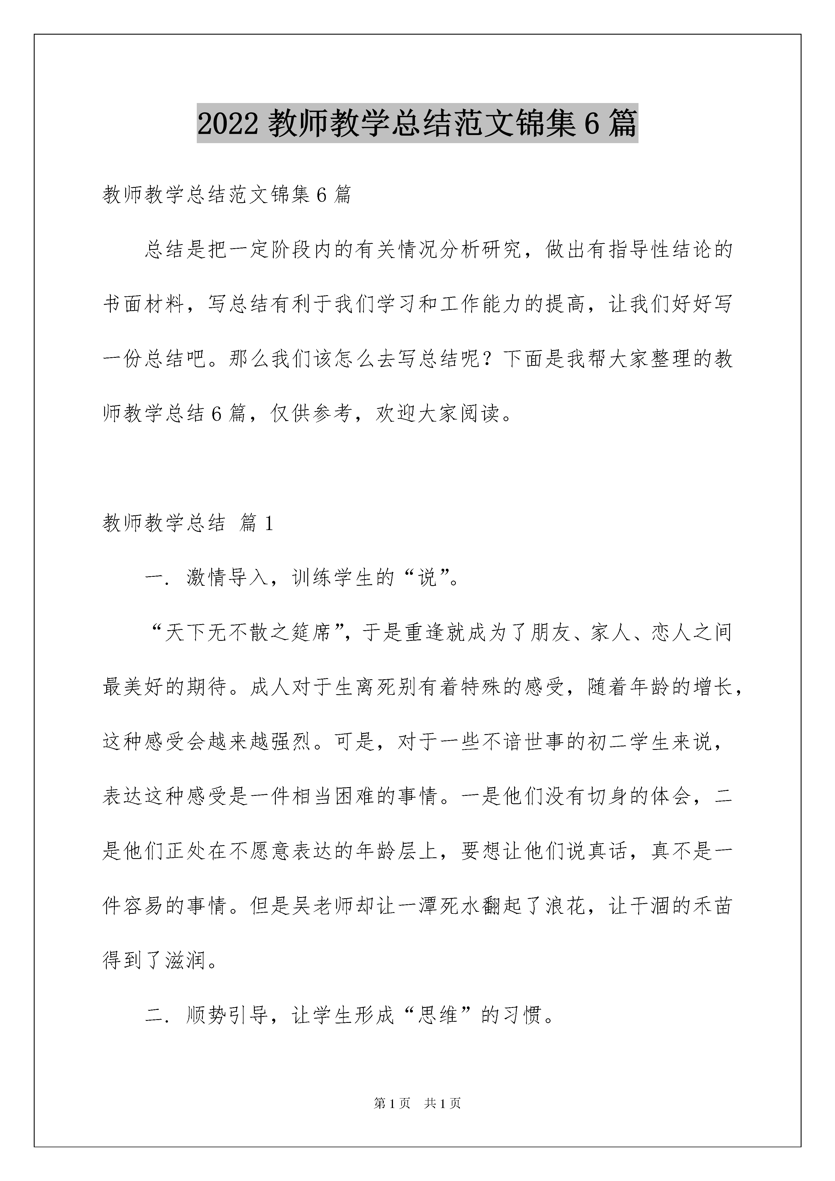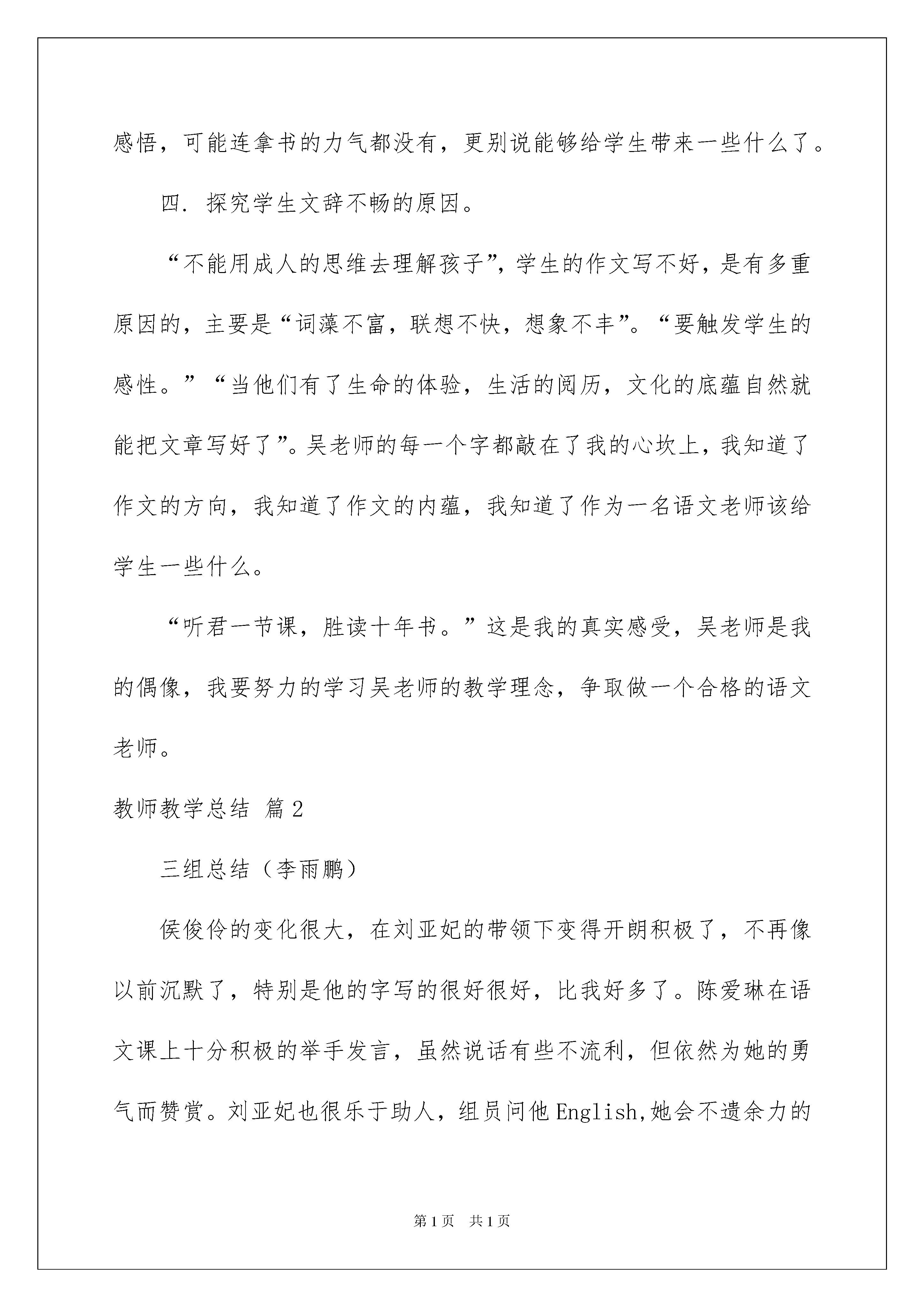 2022教师教学总结范文锦集6篇教师教学总结范文锦集6篇总结是把一定阶段内的有关情况分析研究,做出有指导性结论的书面材料,写总结有利于我们学习和工作能力的提高,让我们好好写一份总结吧。那么我们该怎么去写总结呢?下面是我帮大家整理的教师教学总结6篇,仅供参考,欢迎大家阅读。教师教学总结篇1一.激情导入,训练学生的“说”。“天下无不散之筵席”,于是重逢就成为了朋友、家人、恋人之间最美好的期待。成人对于生离死别有着特殊的感受,随着年龄的增长,这种感受会越来越强烈。可是,对于一些不谙世事的初二学生来说,表达这种感受是一件相当困难的事情。一是他们没有切身的体会,二是他们正处在不愿意表达的年龄层上,要想让他们说真话,真不是一件容易的事情。但是吴老师却让一潭死水翻起了浪花,让干涸的禾苗得到了滋润。二.顺势引导,让学生形成“思维”的习惯。月亮我们并不陌生,甚至觉得让学生去联想这些问题太过简单了。但是吴老师却让学生先想月亮的外形,在这个基础上自然的延伸到文化传统,最后水到渠成的谈到了人生的志向。学生不知不觉的就被带进了联想的空间,思想在潜移默化中升华。听课的老师对这种高超的教学艺术啧啧称叹之余,也在静默地,静默地反思自己的教学方式,反思自己给学生带来了什么,反思自己的教学与吴老师教学之间的差距……三.原始分享,把课堂还给学生。“说话和写作是一样的。”这是吴老师的话,他也是这么启发学生的。看,他只在黑板上写了一个“水”字,让学生到黑板上去描绘与水有关的东西。有的学生写得很抽象,如“大海,北冰洋,矿泉水”等,吴老师只是很幽默的说“看来你的水是怎么写也写不完呀!”有的同学能够根据联想抓到实质,如“泪水,思念,喜悦”等,这可能与平常所写的话题作文训练脱不了关系,但是吴老师却说“不同的环境造就了不同的人生”,无论你写什么,最终都要过渡到“人生”这一层面,“文学即人学。”他的话让我豁然开朗,我猛然想起自己平时所读的,所喜欢的,所给学生所推荐的那些作品,如果真的缺少了人生感悟,可能连拿书的力气都没有,更别说能够给学生带来一些什么了。四.探究学生文辞不畅的原因。“不能用成人的思维去理解孩子”,学生的作文写不好,是有多重原因的,主要是“词藻不富,联想不快,想象不丰”。“要触发学生的感性。”“当他们有了生命的体验,生活的阅历,文化的底蕴自然就能把文章写好了”。吴老师的每一个字都敲在了我的心坎上,我知道了作文的方向,我知道了作文的内蕴,我知道了作为一名语文老师该给学生一些什么。“听君一节课,胜读十年书。”这是我的真实感受,吴老师是我的偶像,我要努力的学习吴老师的教学理念,争取做一个合格的语文老师。教师教学总结篇2三组总结(李雨鹏)侯俊伶的变化很大,在刘亚妃的带领下变得开朗积极了,不再像以前沉默了,特别是他的字写的很好很好,比我好多了。陈爱琳在语文课上十分积极的举手发言,虽然说话有些不流利,但依然为她的勇气而赞赏。刘亚妃也很乐于助人,组员问他English,她会不遗余力的帮助我们。组长周煜博是个强悍并且负责的组长,我爱讲话的毛病都被他制服了,虽然我们两个有时有些矛盾,让我有些恨他,但我依然敬佩他。陆星耀便一直是井水不犯河水。他其实很开朗的,只不过表面看起来有一些文静,每次时政都是他搜的,也立了不少功。对于我来说,虽然和几个组员有些合不来,但组里依然是快乐的,我依然爱这个组,我希望我们这组能奋发向上,在期中得到好成绩,我也希望我们3组能一直得星,让星星闪耀。加油!八组总结(刘思浓)这周进行了两次考试,政治和物理。政治八组的全体同学都还理想,全部上了32分(80分),尤其是李臻睿和陈伟航同学是40分的满分,为八组的其他同学树立了一个学习的好榜样,在这里对彭宇同学提出特别表扬,有非常大的进步!物理考试就不是非常的理想了,大概是因为大家不够仔细,心不够沉静吧!试卷发下来,大家也对试卷进行了分析,望大家在期中考试中考出理想的好成绩!我们能够好好学习的时间不多了,在校的时间也在一点点的缩短,同学们也应该有紧迫感,毕竟中考决定着我们以后的学习生涯,就像张妈妈说的一样,九年级了,我们不再是小孩子,是大哥哥大姐姐了,而下星期马上面临着期中考试,我们应该把心沉下来好好复习,珍惜每一秒时间,要知道,那一秒秒时间累积起来也许我们能背一个单词或是一个句子。冲刺吧!加油吧!不知道看了以后,你有所感悟或决定吗?(写得好!)六组总结(肖雨)本周我们进行了两次考试,同时数学成绩也出来了。政治我们组考的也不错。但在数学与物理上就有些惨不忍睹了。物理上的欧姆定律很多人都没有搞清楚,但他们也都积极的问,比如杨雅蓉,这种对于知识的渴望是值得赞扬的。本组的