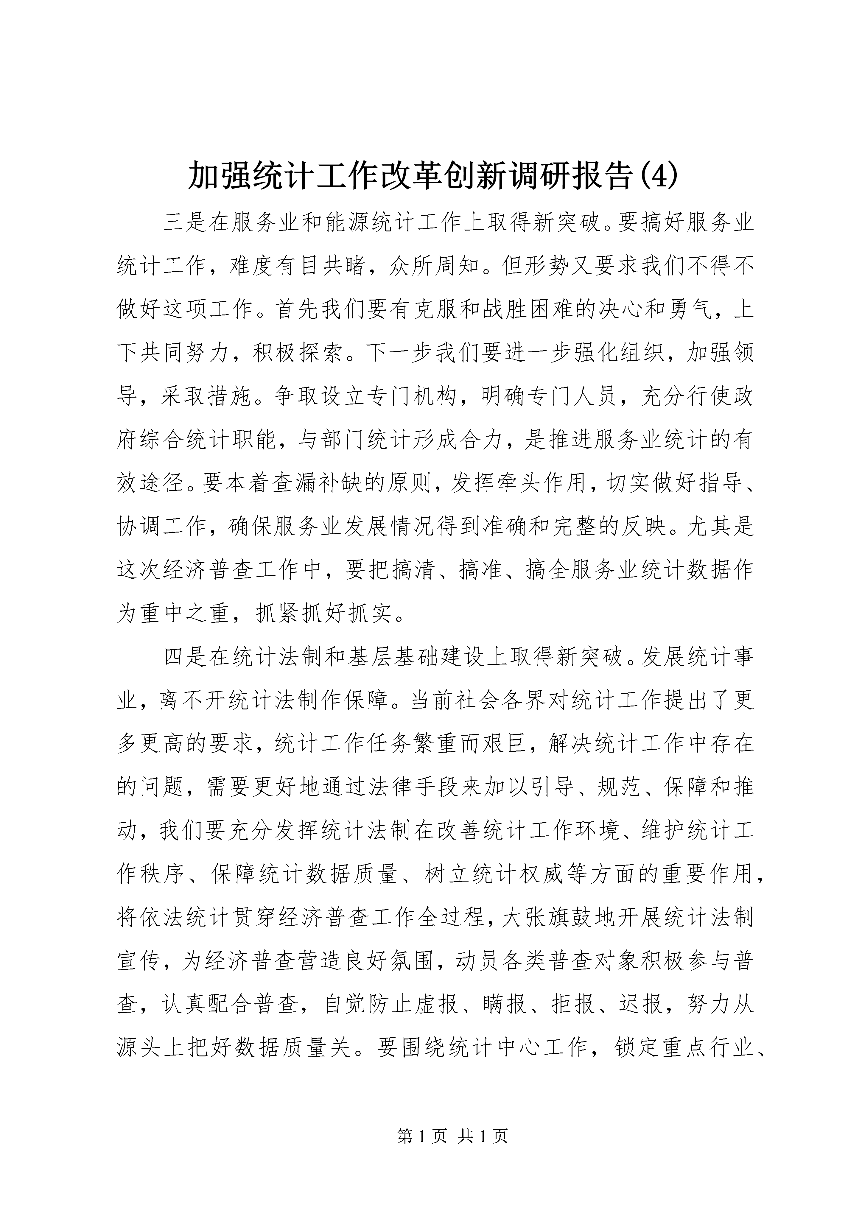 加强统计工作改革创新调研报告(4)三是在服务业和能源统计工作上取得新突破。要搞好服务业统计工作,难度有目共睹,众所周知。但形势又要求我们不得不做好这项工作。首先我们要有克服和战胜困难的决心和勇气,上下共同努力,积极探索。下一步我们要进一步强化组织,加强领导,采取措施。争取设立专门机构,明确专门人员,充分行使政府综合统计职能,与部门统计形成合力,是推进服务业统计的有效途径。要本着查漏补缺的原则,发挥牵头作用,切实做好指导、协调工作,确保服务业发展情况得到准确和完整的反映。尤其是这次经济普查工作中,要把搞清、搞准、搞全服务业统计数据作为重中之重,抓紧抓好抓实。四是在统计法制和基层基础建设上取得新突破。发展统计事业,离不开统计法制作保障。当前社会各界对统计工作提出了更多更高的要求,统计工作任务繁重而艰巨,解决统计工作中存在的问题,需要更好地通过法律手段来加以引导、规范、保障和推动,我们要充分发挥统计法制在改善统计工作环境、维护统计工作秩序、保障统计数据质量、树立统计权威等方面的重要作用,将依法统计贯穿经济普查工作全过程,大张旗鼓地开展统计法制宣传,为经济普查营造良好氛围,动员各类普查对象积极参与普查,认真配合普查,自觉防止虚报、瞒报、拒报、迟报,努力从源头上把好数据质量关。要围绕统计中心工作,锁定重点行业、重点单位、重点指标开展执法检查,既要查虚报,更要查瞒报和漏报,注重执法的针对性,努力提高执法效能,为经济普查,为统计改革和发展保驾护航。统计基层基础建设是统计事业长远发展的根基,对于提高统计数据质量,特别是源头数据质量至关重要。基础不牢,地动山摇。我们必须从统计事业发展的全局出发,充分认识加强统计基层基础建设的极端重要性,坚持把重心放在基层,把功夫下在基层。要不断提高统计手段的现代化,运用信息技术不断提高工作效率和源头数据质量。各地要利用这次经济普查的有利时机,提高应用水平,加强乡镇联网、企业统计直报网络、统计数据在线处理和统计综合数据库等建设工作。五是在队伍建设和强化考核上取得新突破。继续加强干部队伍综合素质和专业知识培训工作,把计算机知识、统计业务培训、综合素质能力的提升放在突出的位置。不断加大年轻干部的培养力度,把那些能吃苦、想干事、善干事、干成事的人推到一线岗位、关键岗位,在实践中得到磨练、成长。继续完善内部考核机制,细化考核措施,通过考核,进一步激发全体人员的工作积极性和主动性,较好地完成统计工作任务。加大对乡镇的考核力度,把各项考核措施落到实处,不断推进基层基础建设,不断提升乡镇统计工作水平,完善统计工作机制,增强服务能力和服务意识,从而全面促进统计工作的开展。