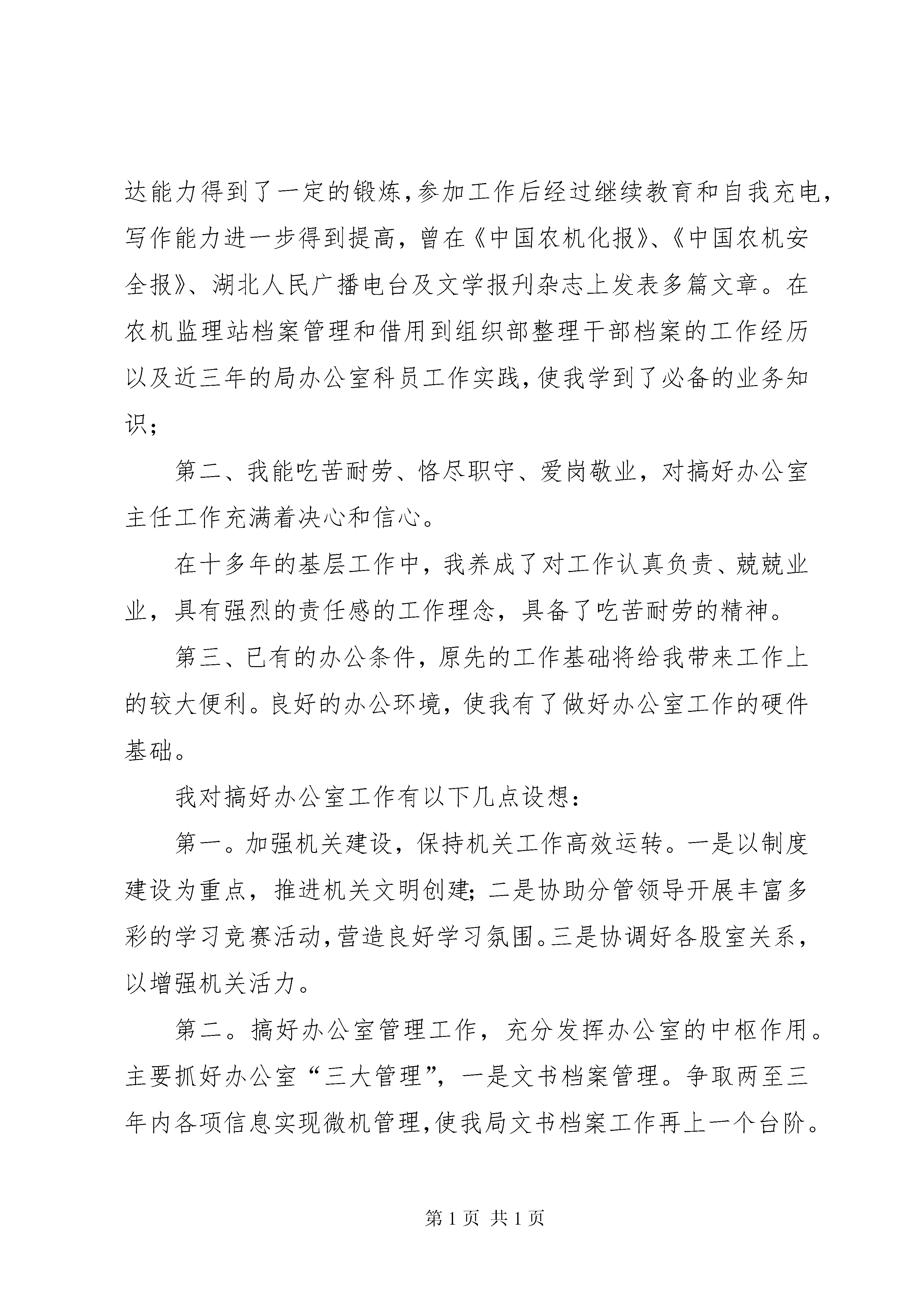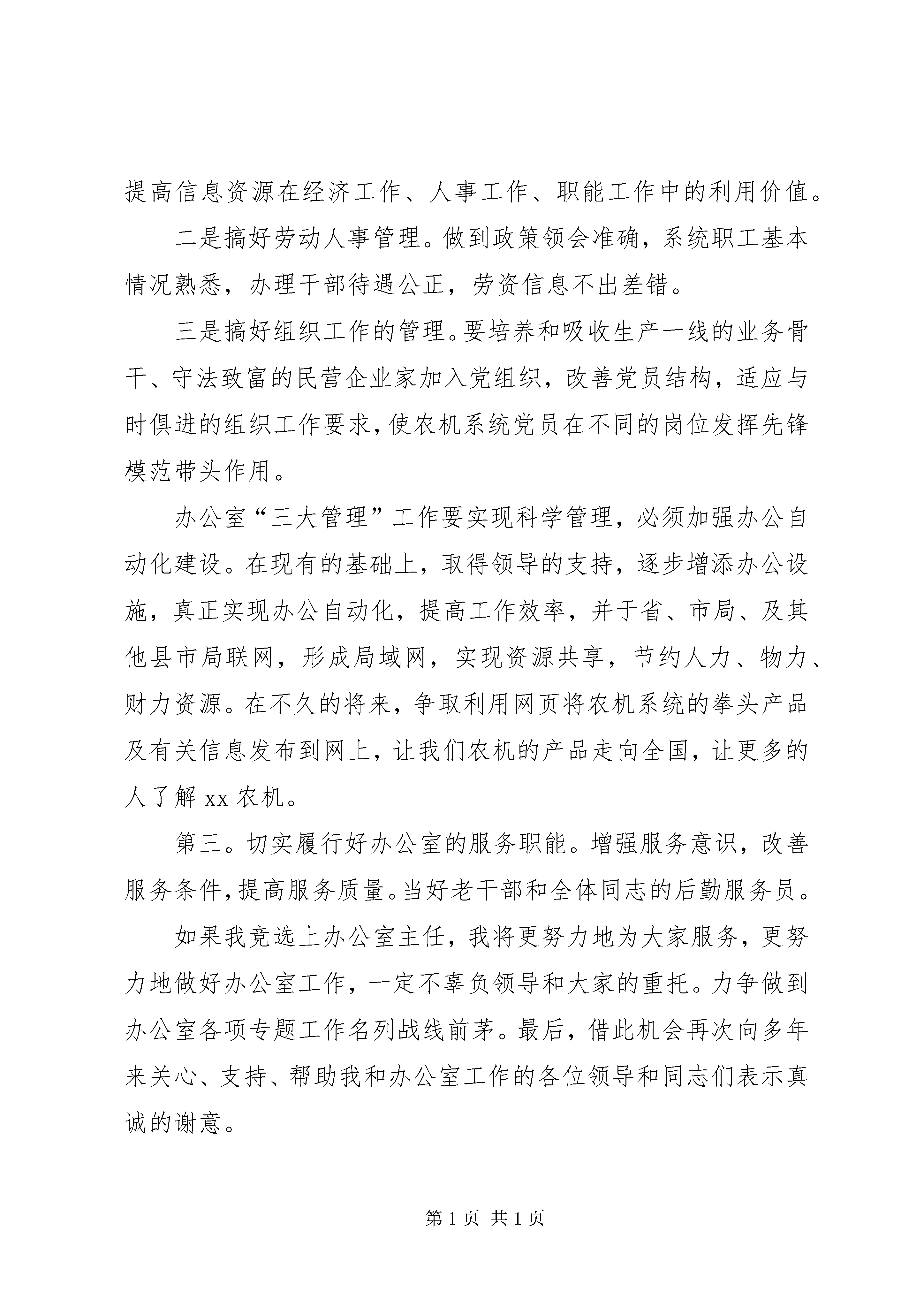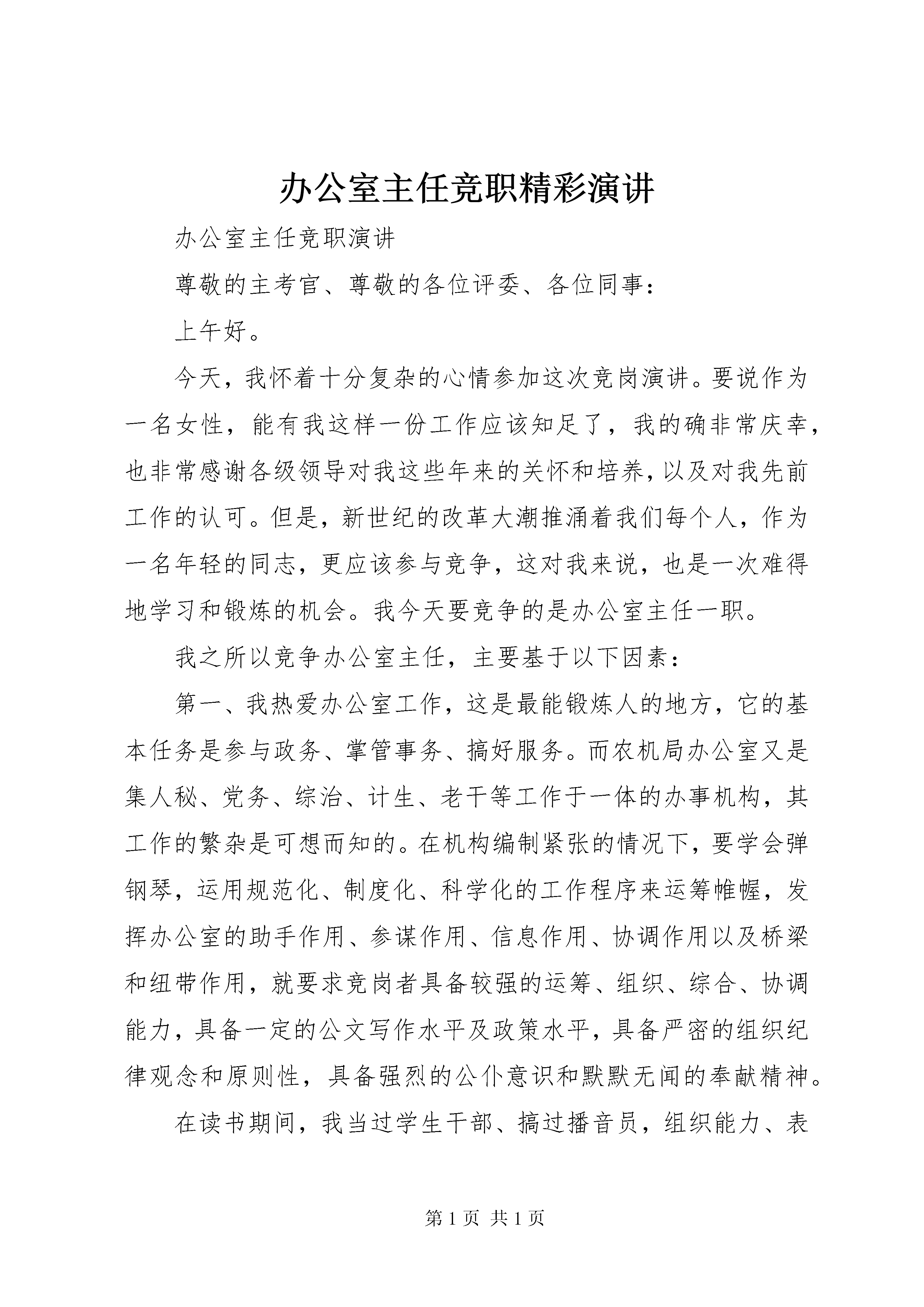 办公室主任竞职精彩演讲办公室主任竞职演讲尊敬的主考官、尊敬的各位评委、各位同事:上午好。今天,我怀着十分复杂的心情参加这次竞岗演讲。要说作为一名女性,能有我这样一份工作应该知足了,我的确非常庆幸,也非常感谢各级领导对我这些年来的关怀和培养,以及对我先前工作的认可。但是,新世纪的改革大潮推涌着我们每个人,作为一名年轻的同志,更应该参与竞争,这对我来说,也是一次难得地学习和锻炼的机会。我今天要竞争的是办公室主任一职。我之所以竞争办公室主任,主要基于以下因素:第一、我热爱办公室工作,这是最能锻炼人的地方,它的基本任务是参与政务、掌管事务、搞好服务。而农机局办公室又是集人秘、党务、综治、计生、老干等工作于一体的办事机构,其工作的繁杂是可想而知的。在机构编制紧张的情况下,要学会弹钢琴,运用规范化、制度化、科学化的工作程序来运筹帷幄,发挥办公室的助手作用、参谋作用、信息作用、协调作用以及桥梁和纽带作用,就要求竞岗者具备较强的运筹、组织、综合、协调能力,具备一定的公文写作水平及政策水平,具备严密的组织纪律观念和原则性,具备强烈的公仆意识和默默无闻的奉献精神。在读书期间,我当过学生干部、搞过播音员,组织能力、表达能力得到了一定的锻炼,参加工作后经过继续教育和自我充电,写作能力进一步得到提高,曾在《中国农机化报》、《中国农机安全报》、湖北人民广播电台及文学报刋杂志上发表多篇文章。在农机监理站档案管理和借用到组织部整理干部档案的工作经历以及近三年的局办公室科员工作实践,使我学到了必备的业务知识;第二、我能吃苦耐劳、恪尽职守、爱岗敬业,对搞好办公室主任工作充满着决心和信心。在十多年的基层工作中,我养成了对工作认真负责、兢兢业业,具有强烈的责任感的工作理念,具备了吃苦耐劳的精神。第三、已有的办公条件,原先的工作基础将给我带来工作上的较大便利。良好的办公环境,使我有了做好办公室工作的硬件基础。我对搞好办公室工作有以下几点设想:第一。加强机关建设,保持机关工作高效运转。一是以制度建设为重点,推进机关文明创建;二是协助分管领导开展丰富多彩的学习竞赛活动,营造良好学习氛围。三是协调好各股室关系,以增强机关活力。第二。搞好办公室管理工作,充分发挥办公室的中枢作用。主要抓好办公室“三大管理”,一是文书档案管理。争取两至三年内各项信息实现微机管理,使我局文书档案工作再上一个台阶。提高信息资源在经济工作、人事工作、职能工作中的利用价值。二是搞好劳动人事管理。做到政策领会准确,系统职工基本情况熟悉,办理干部待遇公正,劳资信息不出差错。三是搞好组织工作的管理。要培养和吸收生产一线的业务骨干、守法致富的民营企业家加入党组织,改善党员结构,适应与时俱进的组织工作要求,使农机系统党员在不同的岗位发挥先锋模范带头作用。办公室“三大管理”工作要实现科学管理,必须加强办公自动化建设。在现有的基础上,取得领导的支持,逐步增添办公设施,真正实现办公自动化,提高工作效率,并于省、市局、及其他县市局联网,形成局域网,实现资源共享,节约人力、物力、财力资源。在不久的将来,争取利用网页将农机系统的拳头产品及有关信息发布到网上,让我们农机的产品走向全国,让更多的人了解xx农机。第三。切实履行好办公室的服务职能。增强服务意识,改善服务条件,提高服务质量。当好老干部和全体同志的后勤服务员。如果我竞选上办公室主任,我将更努力地为大家服务,更努力地做好办公室工作,一定不辜负领导和大家的重托。力争做到办公室各项专题工作名列战线前茅。最后,借此机会再次向多年来关心、支持、帮助我和办公室工作的各位领导和同志们表示真诚的谢意。谢谢大家。