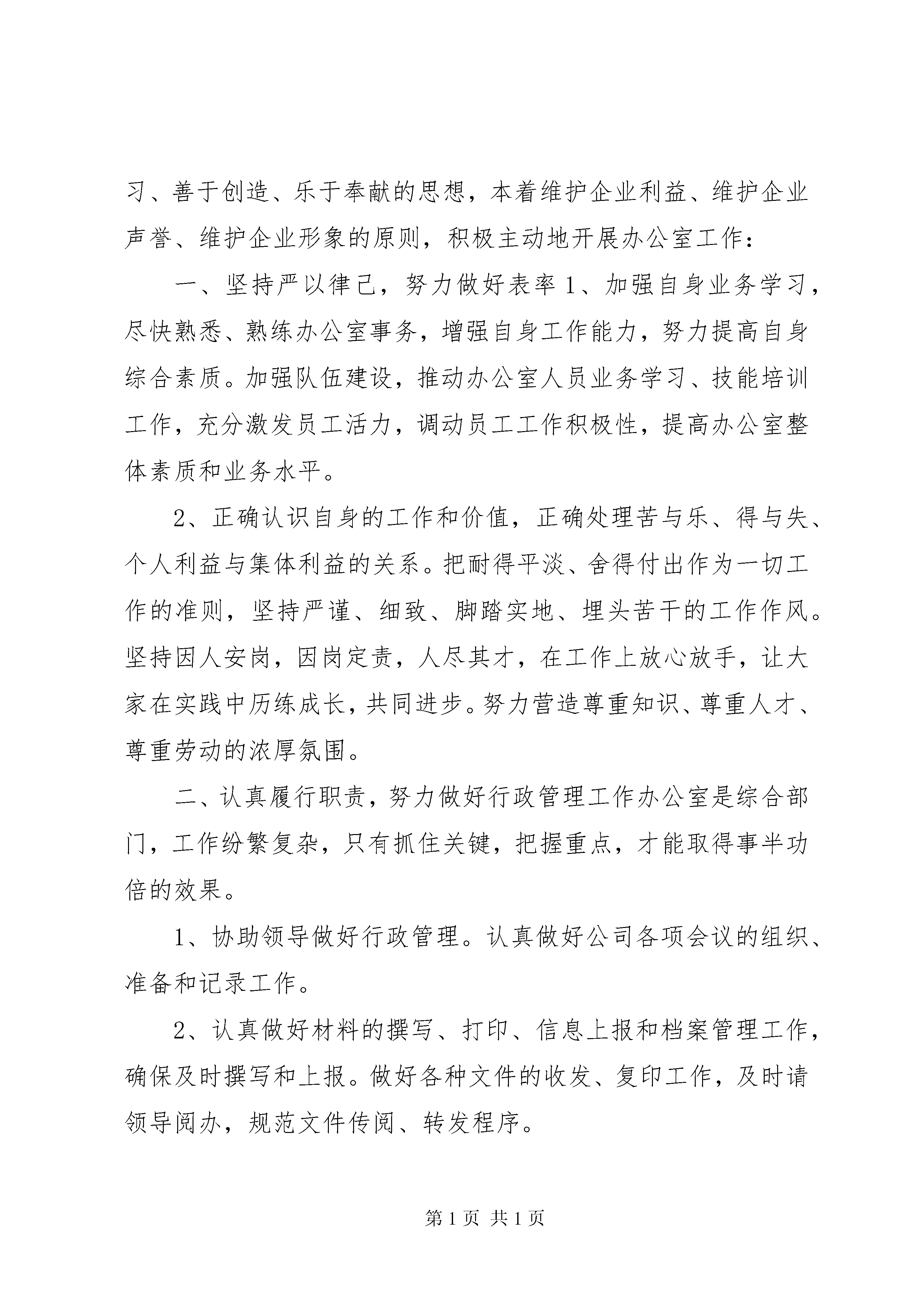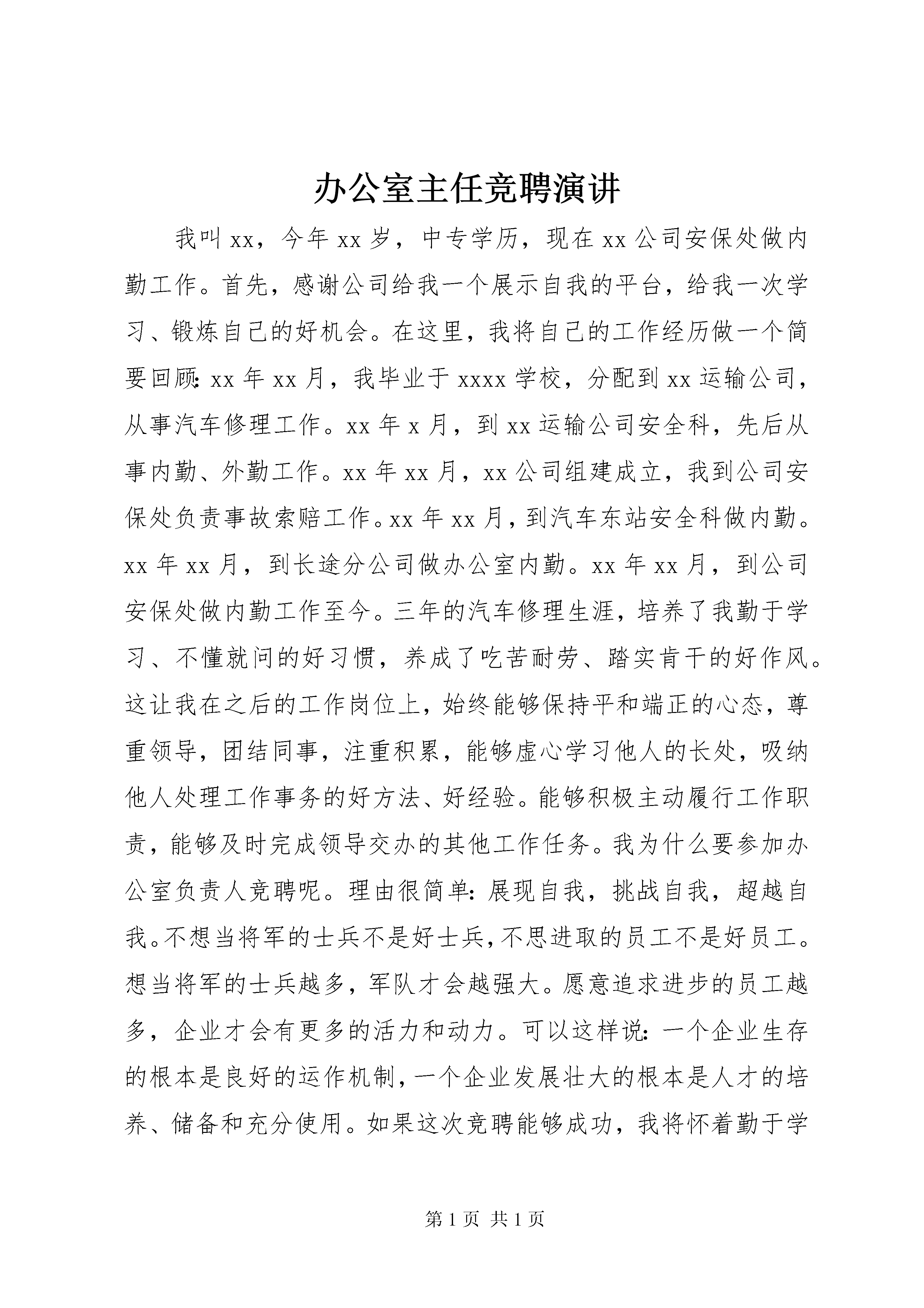 办公室主任竞聘演讲我叫xx,今年xx岁,中专学历,现在xx公司安保处做内勤工作。首先,感谢公司给我一个展示自我的平台,给我一次学习、锻炼自己的好机会。在这里,我将自己的工作经历做一个简要回顾:xx年xx月,我毕业于xxxx学校,分配到xx运输公司,从事汽车修理工作。xx年x月,到xx运输公司安全科,先后从事内勤、外勤工作。xx年xx月,xx公司组建成立,我到公司安保处负责事故索赔工作。xx年xx月,到汽车东站安全科做内勤。xx年xx月,到长途分公司做办公室内勤。xx年xx月,到公司安保处做内勤工作至今。三年的汽车修理生涯,培养了我勤于学习、不懂就问的好习惯,养成了吃苦耐劳、踏实肯干的好作风。这让我在之后的工作岗位上,始终能够保持平和端正的心态,尊重领导,团结同事,注重积累,能够虚心学习他人的长处,吸纳他人处理工作事务的好方法、好经验。能够积极主动履行工作职责,能够及时完成领导交办的其他工作任务。我为什么要参加办公室负责人竞聘呢。理由很简单:展现自我,挑战自我,超越自我。不想当将军的士兵不是好士兵,不思进取的员工不是好员工。想当将军的士兵越多,军队才会越强大。愿意追求进步的员工越多,企业才会有更多的活力和动力。可以这样说:一个企业生存的根本是良好的运作机制,一个企业发展壮大的根本是人才的培养、储备和充分使用。如果这次竞聘能够成功,我将怀着勤于学习、善于创造、乐于奉献的思想,本着维护企业利益、维护企业声誉、维护企业形象的原则,积极主动地开展办公室工作:一、坚持严以律己,努力做好表率1、加强自身业务学习,尽快熟悉、熟练办公室事务,增强自身工作能力,努力提高自身综合素质。加强队伍建设,推动办公室人员业务学习、技能培训工作,充分激发员工活力,调动员工工作积极性,提高办公室整体素质和业务水平。2、正确认识自身的工作和价值,正确处理苦与乐、得与失、个人利益与集体利益的关系。把耐得平淡、舍得付出作为一切工作的准则,坚持严谨、细致、脚踏实地、埋头苦干的工作作风。坚持因人安岗,因岗定责,人尽其才,在工作上放心放手,让大家在实践中历练成长,共同进步。努力营造尊重知识、尊重人才、尊重劳动的浓厚氛围。二、认真履行职责,努力做好行政管理工作办公室是综合部门,工作纷繁复杂,只有抓住关键,把握重点,才能取得事半功倍的效果。1、协助领导做好行政管理。认真做好公司各项会议的组织、准备和记录工作。2、认真做好材料的撰写、打印、信息上报和档案管理工作,确保及时撰写和上报。做好各种文件的收发、复印工作,及时请领导阅办,规范文件传阅、转发程序。3、本着严格、周密、可操作的原则,在原有各项制度的基础上,进一步修订完善办公室工作规范、考核制度、保密制度、文件管理制度。明确各岗位工作职责和工作责任。明确办文、办事、办会程序和质量要求。严明劳动纪律、工作纪律,力求做到处理工作事务程序化,服务标准化,协调联络规范化。建立工作质量责任追究制度,保证各项工作的高效运转。4、协调办公室内部工作,合理调配人员,及时、保质保量完成领导交办的工作任务。认真做好员工考勤、考核工作。认真做好电脑、印刷设备的维护和耗材管理工作。三、强化服务意识,把握服务重心,充分发挥办公室职能作用办公室所处的地位和所属的工作性质,决定着办公室的实质就是一个单位的服务中枢,办公室工作的核心就是服务。1、从抓学习教育,提高思想认识着手,带领办公室同事找准工作位置,明确工作性质,树立窗口形象。2、拓宽视野,广泛收集情报信息,及时上报,为领导决策当好参谋和助手。3、高效办事,当好管家。在办文中狠抓收发、阅办、归档三个环节,确保公文快速有序地流转。在办会中,做到统筹考虑,合理安排,加强协调,努力提高会务质量。在日常工作中,力求把每一件事都考虑周全,安排细致,处理完善,坚持高效率、快节奏,雷厉风行,急事急办、特事特办、快事快办原则,明显提高办公室工作效率。各位领导,各位同事,位卑不敢忘忧国,那是对国家而言。我作为公司普通一员,在公司学习、工作将近8年时间了,对公司有着深厚的情感,不管我这次竞聘的结果如何,不管今后处在哪个岗位,我都将一如既往地认真履行工作职责,并为之奉献自己的最大力量。在此,我真心祝愿公司能够打造一支团结协作,奋发向上的管理团队。我相信,只要全司员工上下一心,携手共进,xx公司一定会迎来更加光辉的明天。我的陈述完毕。谢谢大家。