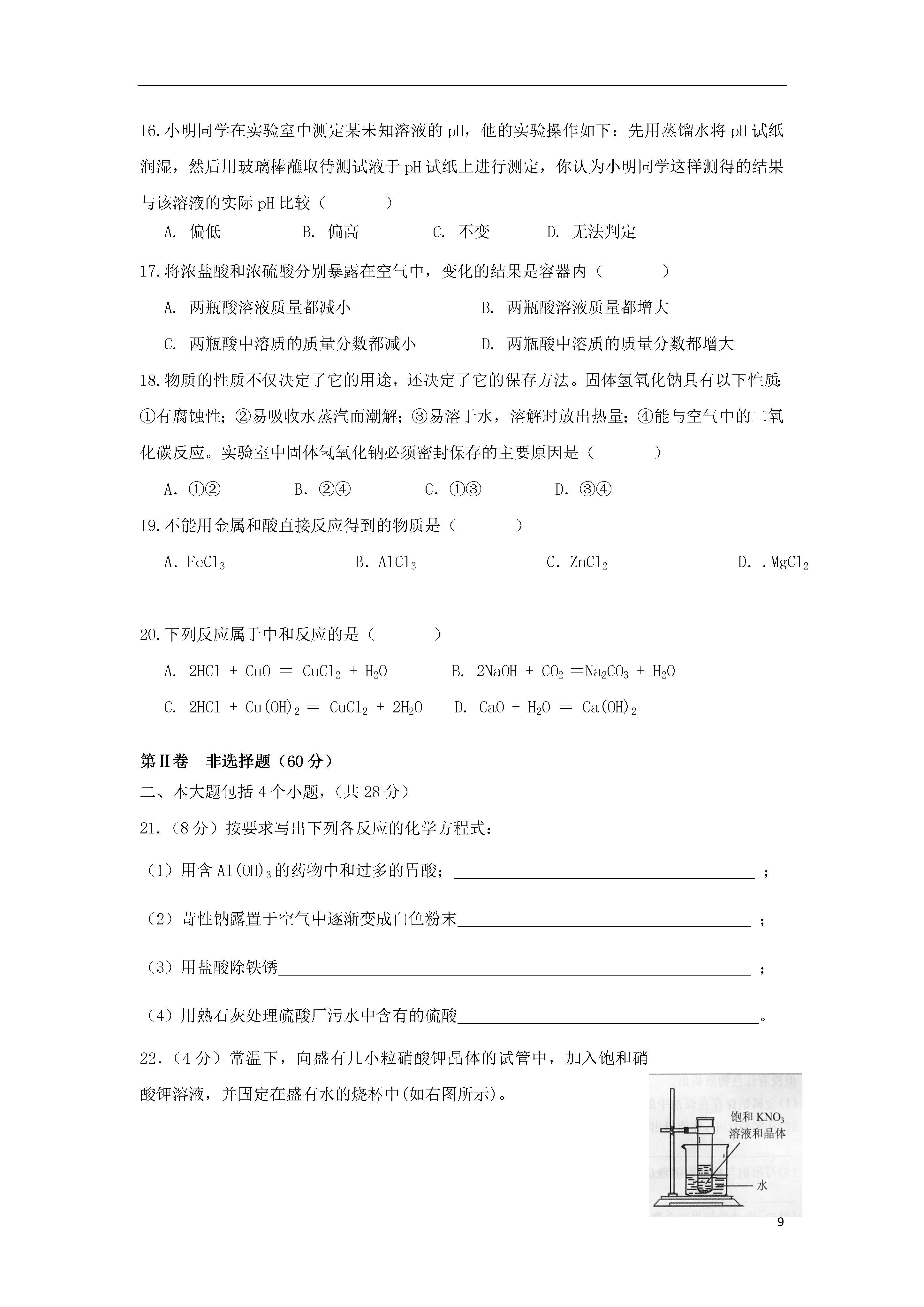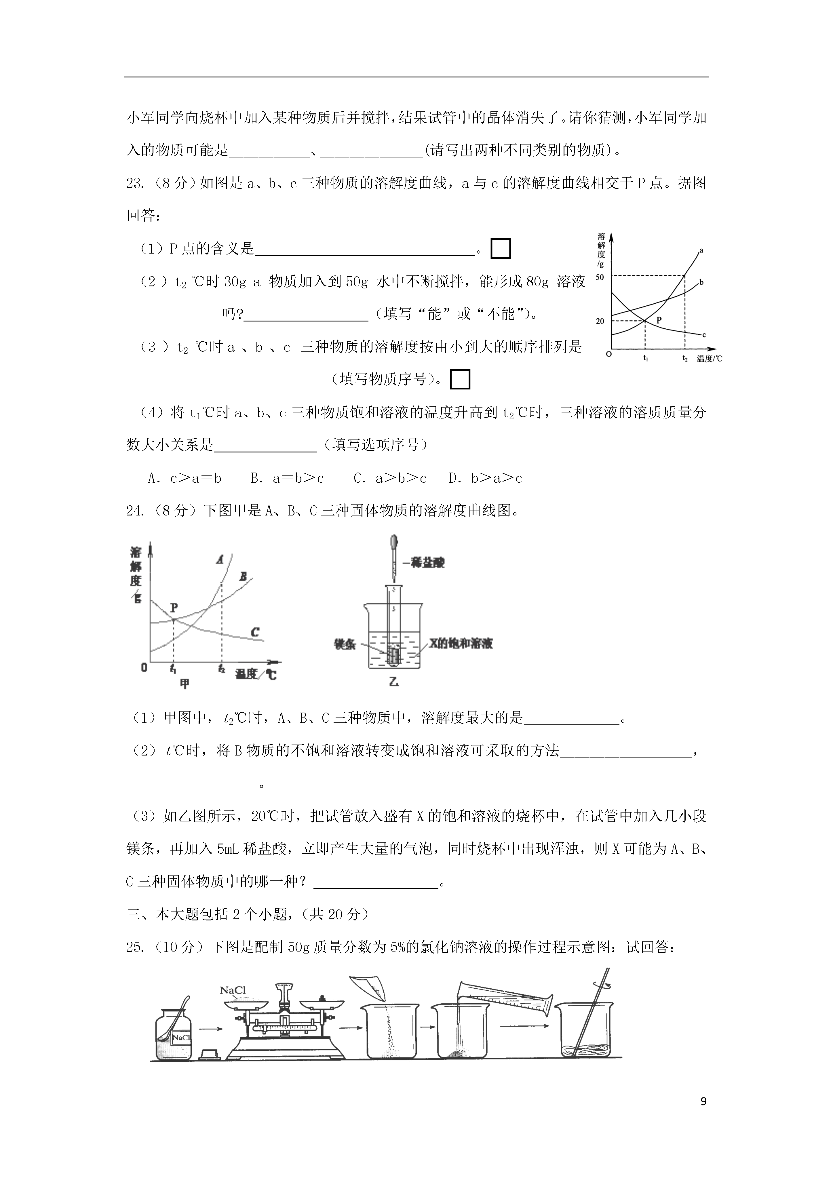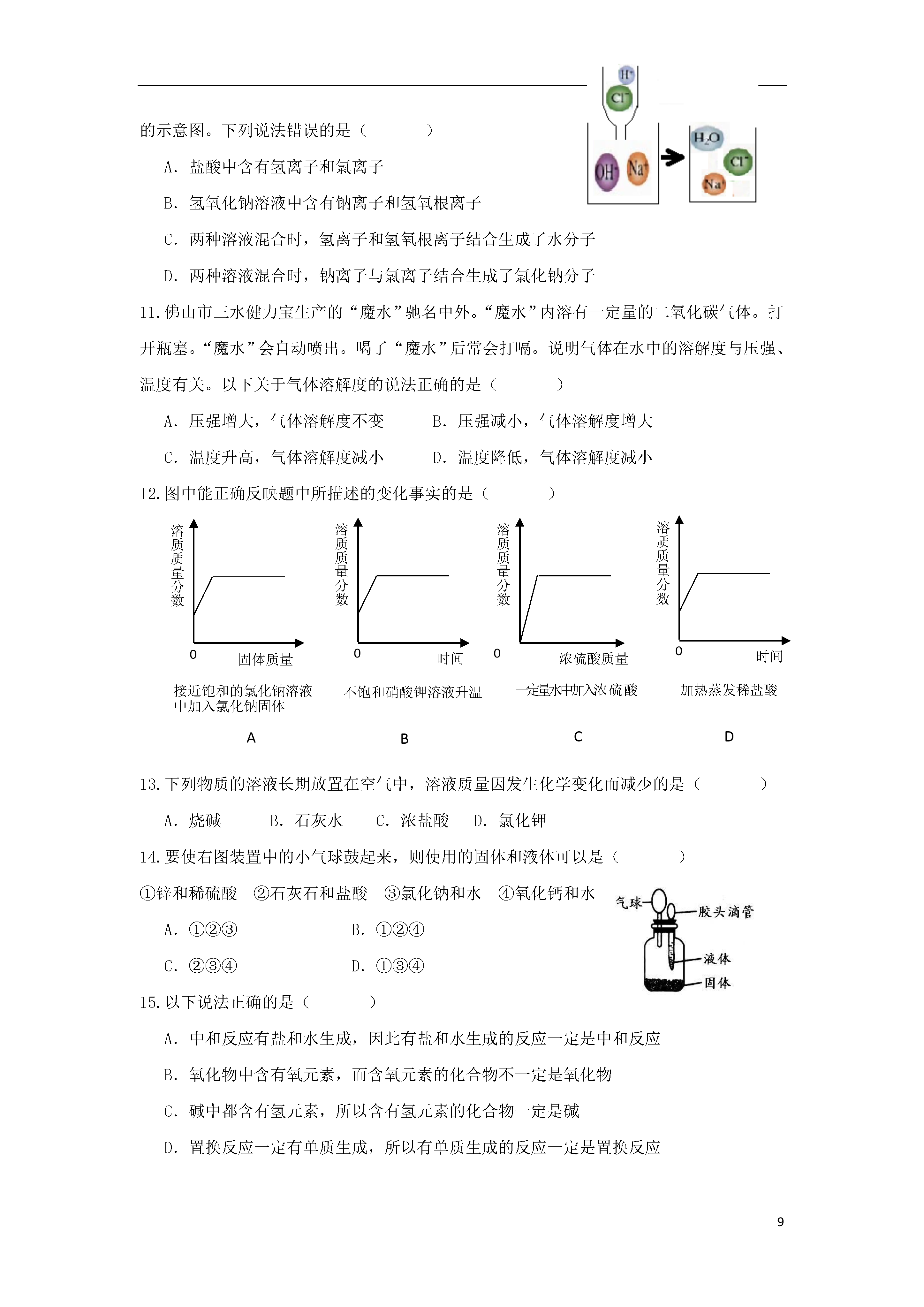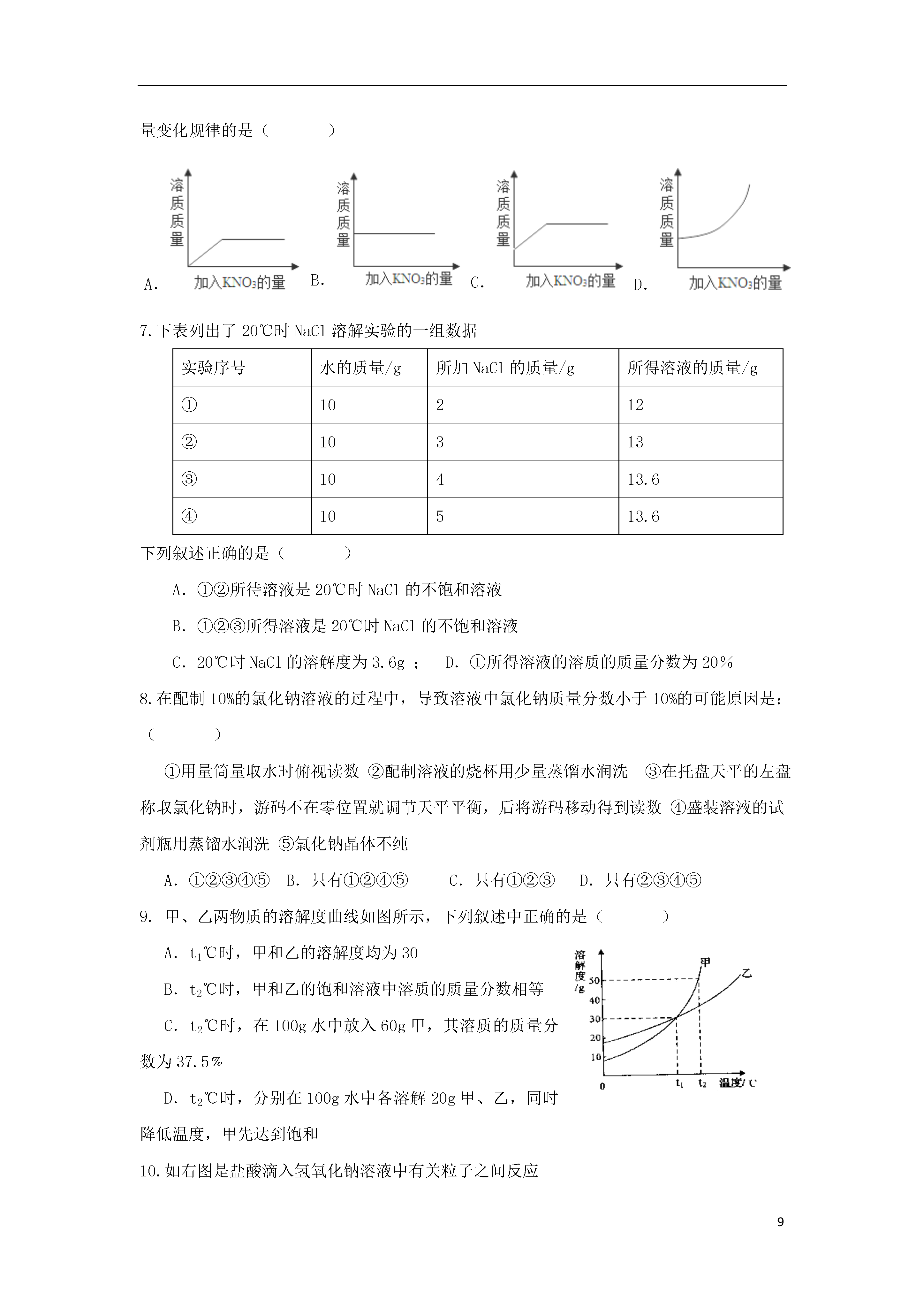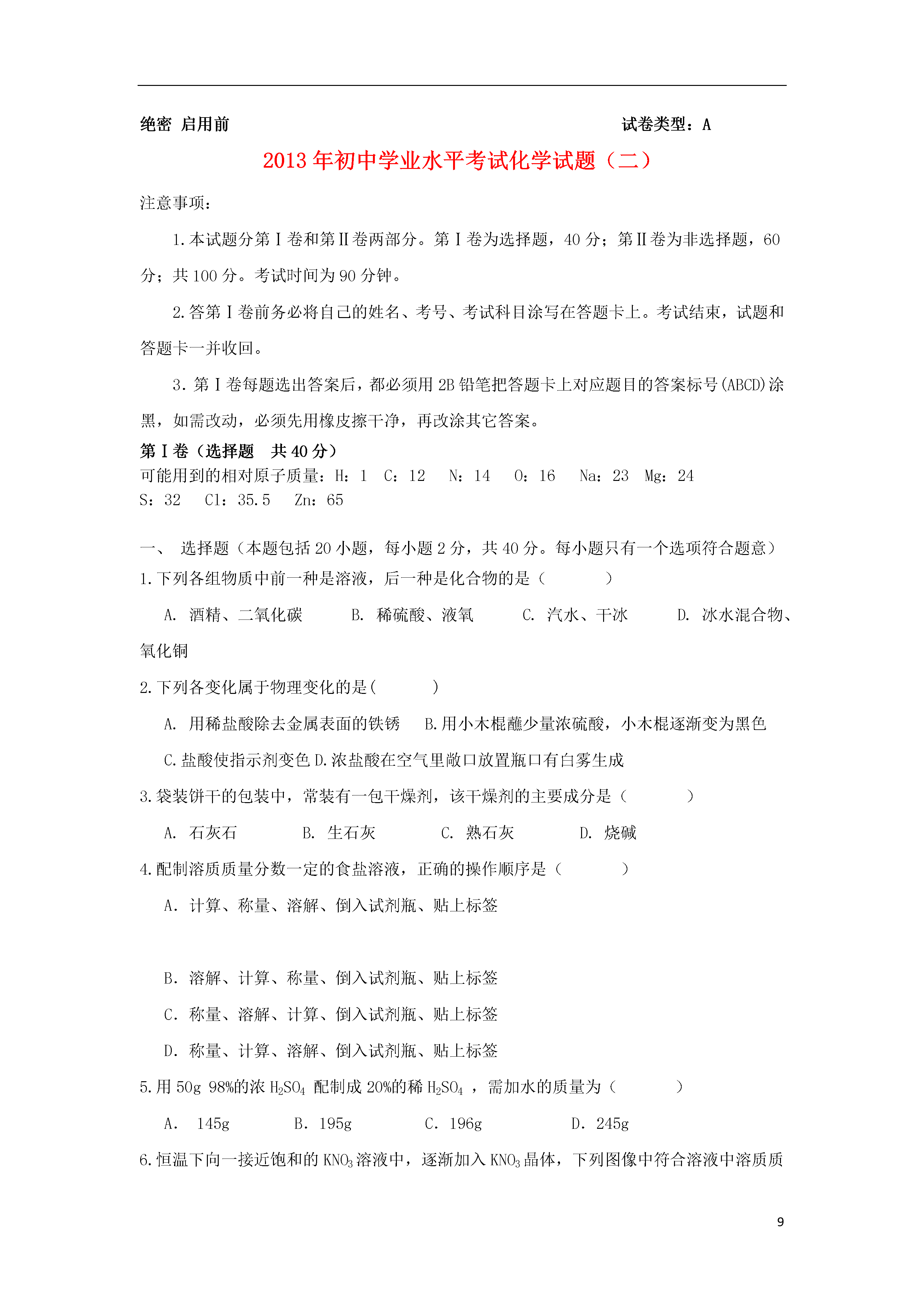 9绝密启用前试卷类型:A2013年初中学业水平考试化学试题(二)注意事项:1.本试题分第Ⅰ卷和第Ⅱ卷两部分。第Ⅰ卷为选择题,40分;第Ⅱ卷为非选择题,60分;共100分。考试时间为90分钟。2.答第Ⅰ卷前务必将自己的姓名、考号、考试科目涂写在答题卡上。考试结束,试题和答题卡一并收回。3.第Ⅰ卷每题选出答案后,都必须用2B铅笔把答题卡上对应题目的答案标号(ABCD)涂黑,如需改动,必须先用橡皮擦干净,再改涂其它答案。第Ⅰ卷(选择题共40分)可能用到的相对原子质量:H:1C:12N:14O:16Na:23Mg:24S:32Cl:35.5Zn:65一、选择题(本题包括20小题,每小题2分,共40分。每小题只有一个选项符合题意)1.下列各组物质中前一种是溶液,后一种是化合物的是()A.酒精、二氧化碳B.稀硫酸、液氧C.汽水、干冰D.冰水混合物、氧化铜2.下列各变化属于物理变化的是()A.用稀盐酸除去金属表面的铁锈B.用小木棍蘸少量浓硫酸,小木棍逐渐变为黑色C.盐酸使指示剂变色D.浓盐酸在空气里敞口放置瓶口有白雾生成3.袋装饼干的包装中,常装有一包干燥剂,该干燥剂的主要成分是()A.石灰石B.生石灰C.熟石灰D.烧碱4.配制溶质质量分数一定的食盐溶液,正确的操作顺序是()A.计算、称量、溶解、倒入试剂瓶、贴上标签B.溶解、计算、称量、倒入试剂瓶、贴上标签C.称量、溶解、计算、倒入试剂瓶、贴上标签D.称量、计算、溶解、倒入试剂瓶、贴上标签5.用50g98%的浓H2SO4配制成20%的稀H2SO4,需加水的质量为()A.145gB.195gC.196gD.245g6.恒温下向一接近饱和的KNO3溶液中,逐渐加入KNO3晶体,下列图像中符合溶液中溶质质量变化规律的是()A.B.C.D.7.下表列出了20℃时NaCl溶解实验的一组数据实验序号水的质量/g所加NaCl的质量/g所得溶液的质量/g①10212②10313③10413.6④10513.6下列叙述正确的是()A.①②所待溶液是20℃时NaCl的不饱和溶液B.①②③所得溶液是20℃时NaCl的不饱和溶液C.20℃时NaCl的溶解度为3.6g;D.①所得溶液的溶质的质量分数为20%8.在配制10%的氯化钠溶液的过程中,导致溶液中氯化钠质量分数小于10%的可能原因是:()①用量筒量取水时俯视读数②配制溶液的烧杯用少量蒸馏水润洗③在托盘天平的左盘称取氯化钠时,游码不在零位置就调节天平平衡,后将游码移动得到读数④盛装溶液的试剂瓶用蒸馏水润洗⑤氯化钠晶体不纯A.①②③④⑤B.只有①②④⑤C.只有①②③D.只有②③④⑤9.甲、乙两物质的溶解度曲线如图所示,下列叙述中正确的是()A.t1℃时,甲和乙的溶解度均为30B.t2℃时,甲和乙的饱和溶液中溶质的质量分数相等C.t2℃时,在100g水中放入60g甲,其溶质的质量分数为37.5﹪D.t2℃时,分别在100g水中各溶解20g甲、乙,同时降低温度,甲先达到饱和10.如右图是盐酸滴入氢氧化钠溶液中有关粒子之间反应的示意图。下列说法错误的是()A.盐酸中含有氢离子和氯离子B.氢氧化钠溶液中含有钠离子和氢氧根离子C.两种溶液混合时,氢离子和氢氧根离子结合生成了水分子D.两种溶液混合时,钠离子与氯离子结合生成了氯化钠分子11.佛山市三水健力宝生产的“魔水”驰名中外。“魔水”内溶有一定量的二氧化碳气体。打开瓶塞。“魔水”会自动喷出。喝了“魔水”后常会打嗝。说明气体在水中的溶解度与压强、温度有关。以下关于气体溶解度的说法正确的是()A.压强增大,气体溶解度不变B.压强减小,气体溶解度增大C.温度升高,气体溶解度减小D.温度降低,气体溶解度减小12.图中能正确反映题中所描述的变化事实的是()固体质量溶质质量分数0时间溶质质量分数0时间溶质质量分数%0接近饱和的氯化钠溶液中加入氯化钠固体AA不饱和硝酸钾溶液升温B一定量水中加入浓硫酸C加热蒸发稀盐酸D0浓硫酸质量溶质质量分数13.下列物质的溶液长期放置在空气中,溶液质量因发生化学变化而减少的是()A.烧碱B.石灰水C.浓盐酸D.氯化钾14.要使右图装置中的小气球鼓起来,则使用的固体和液体可以是()①锌和稀硫酸②石灰石和盐酸③氯化钠和水④氧化钙和水A.①②③B.①②④C.②③④D.①③④15.以下说法正确的是()A.中和反应有盐和水生成,因此有盐和水生成的反应一定是中和反应B.氧化物中含有氧元素,而含氧元素的化合物不一定是氧化物