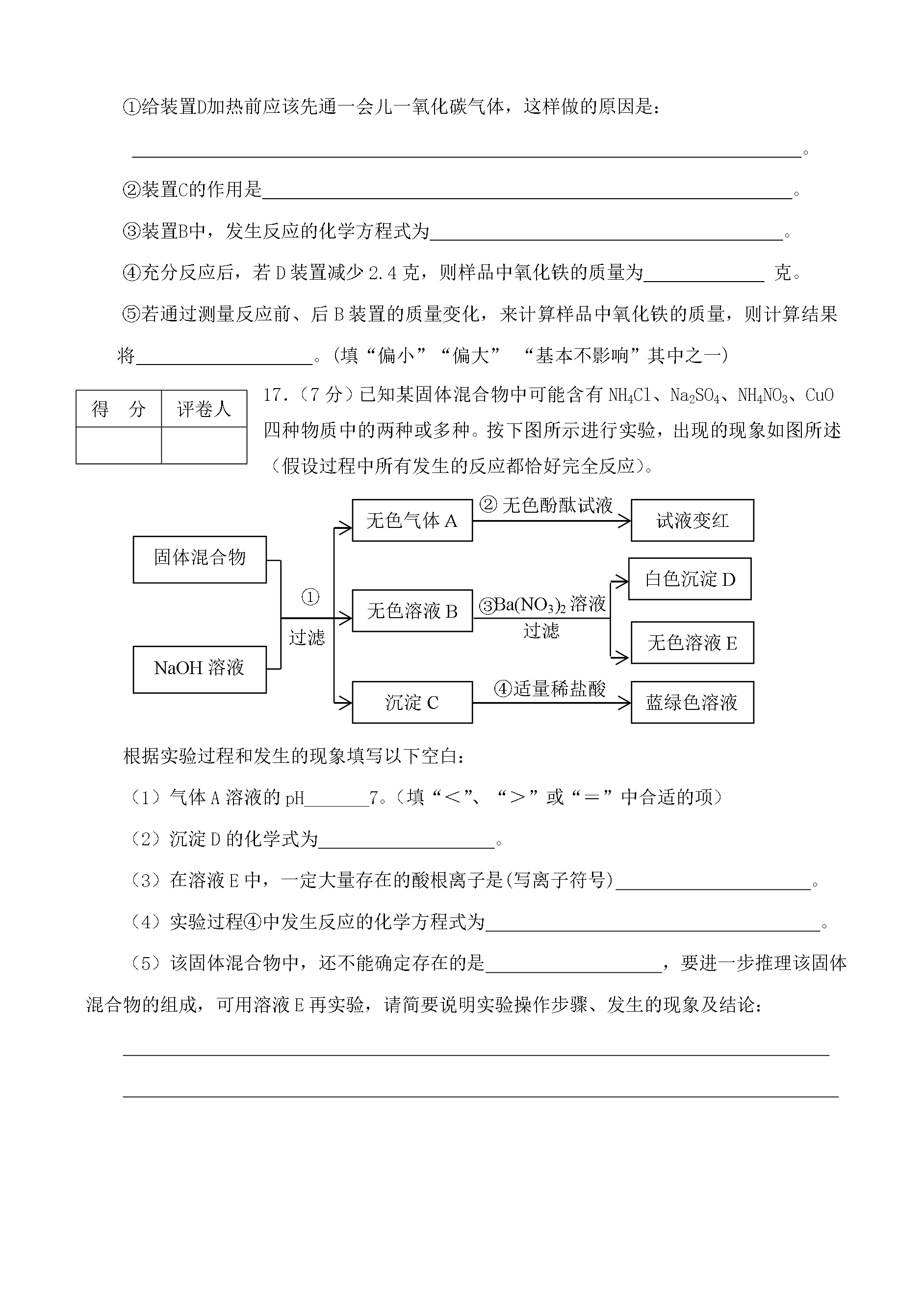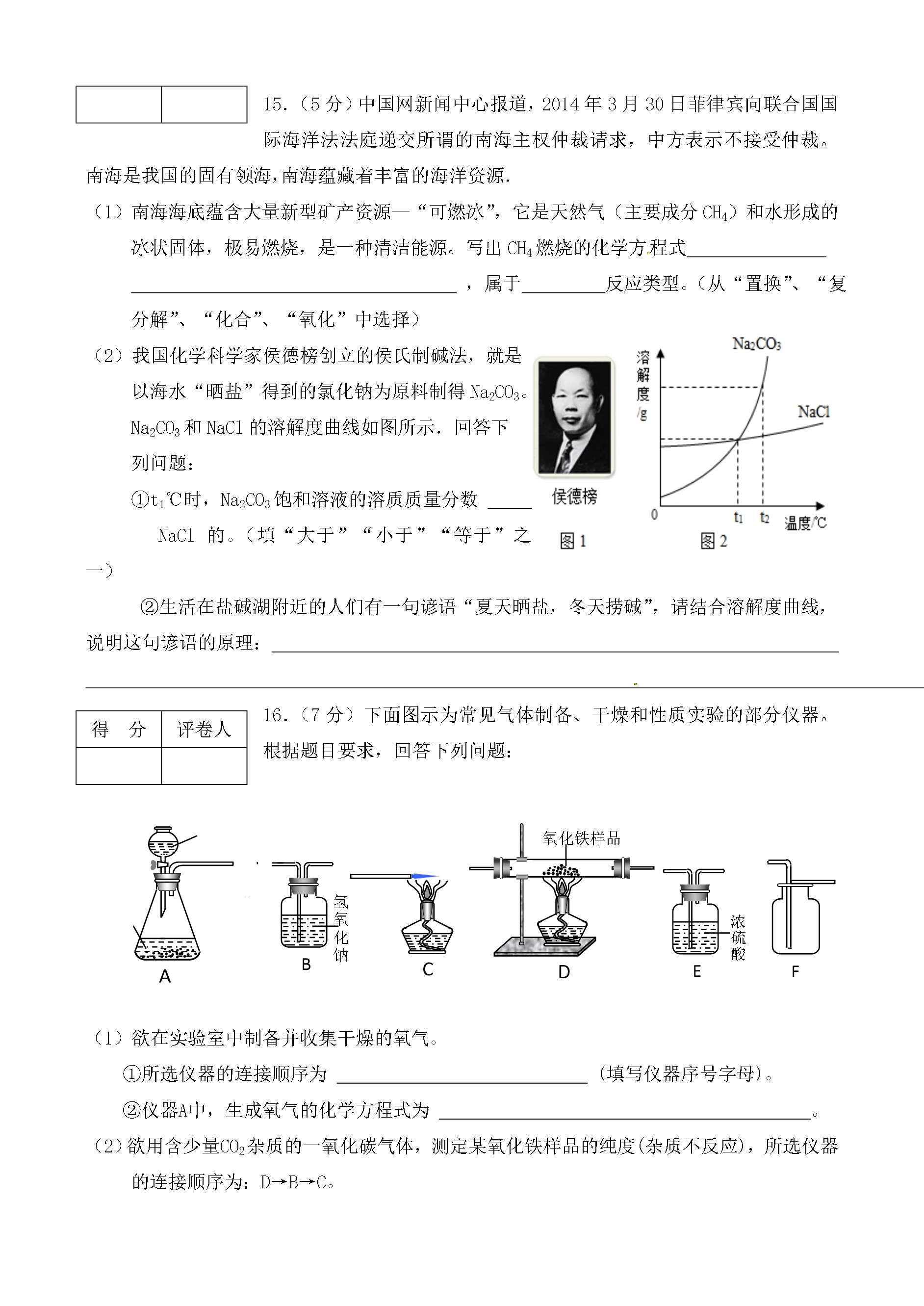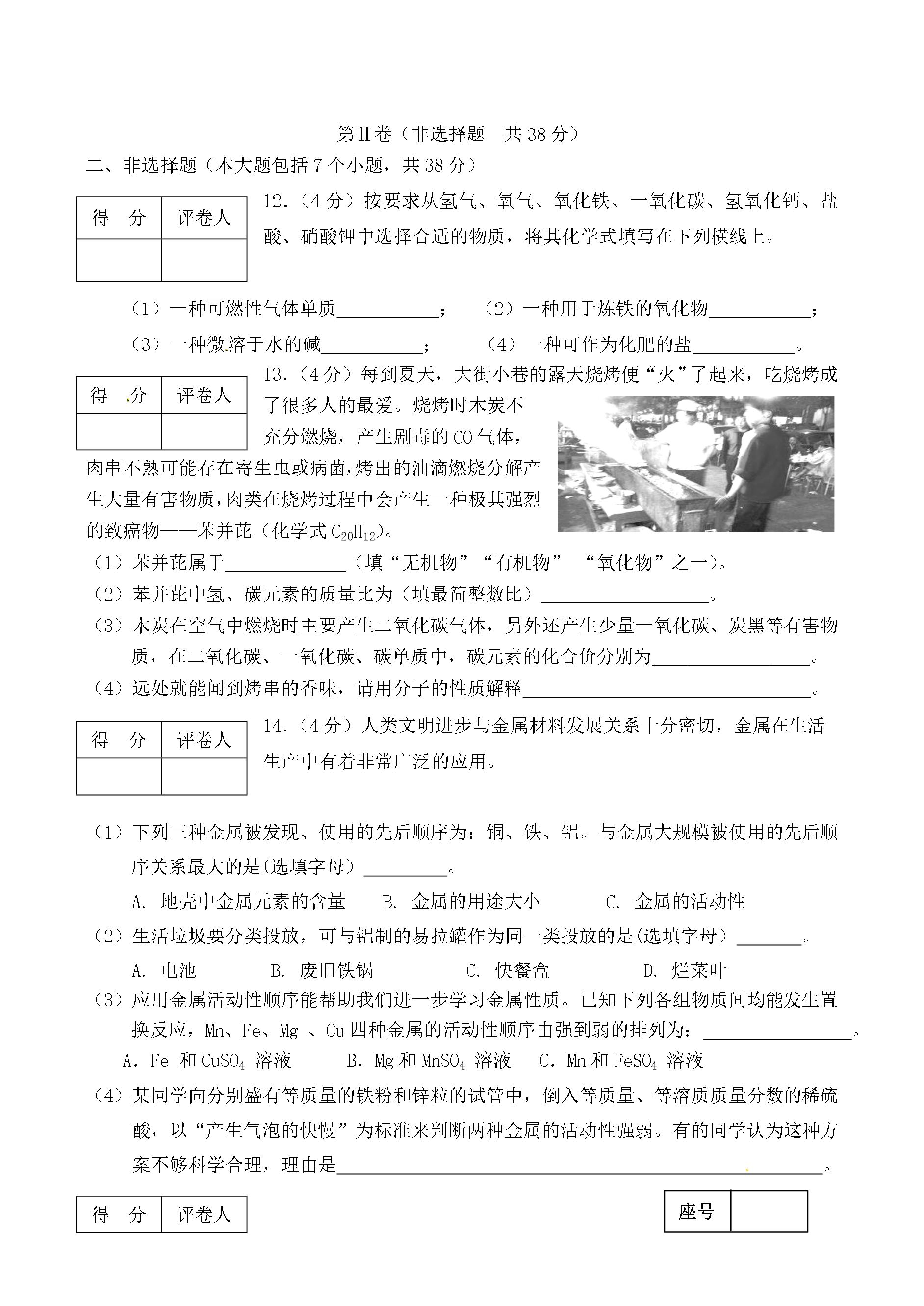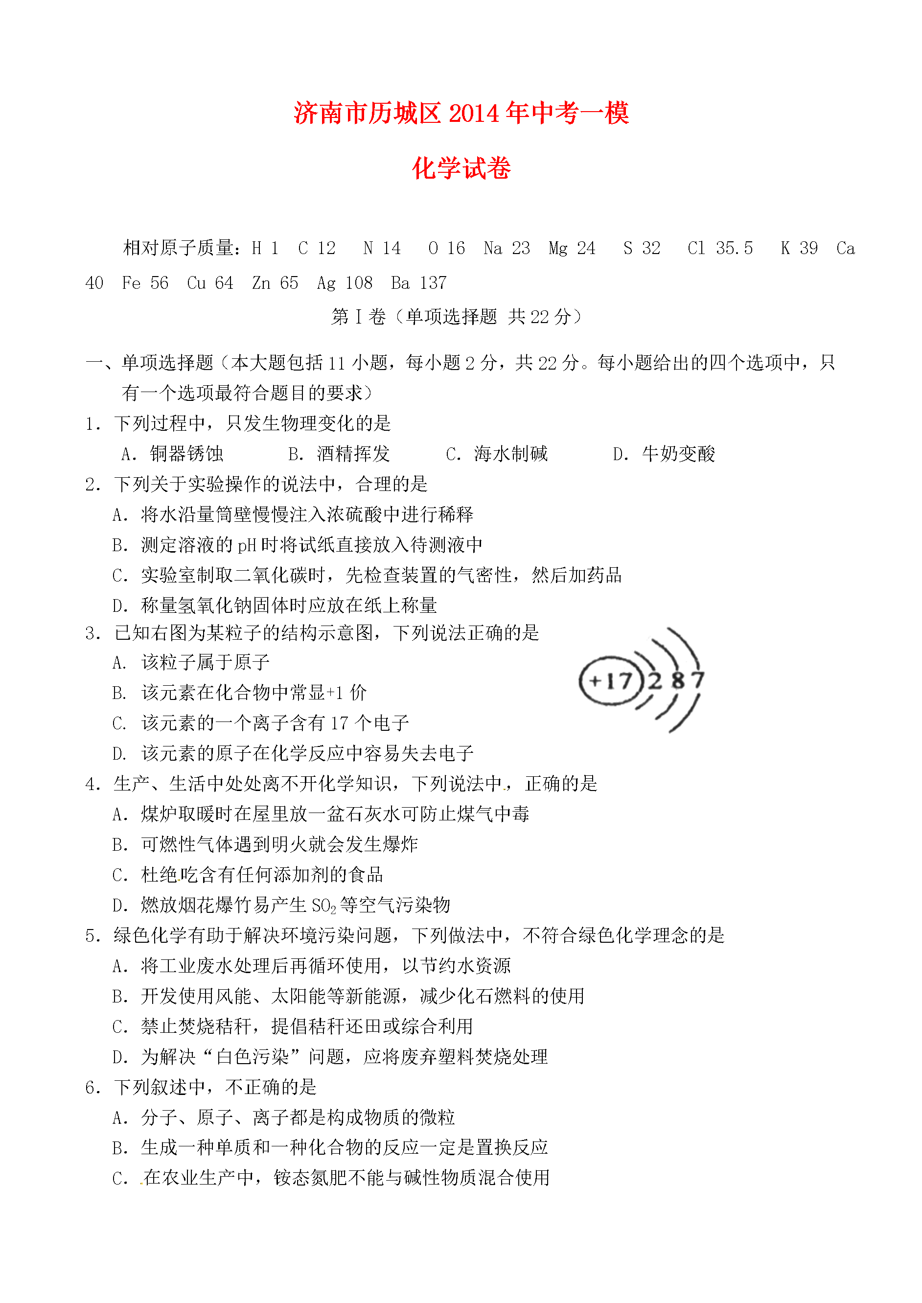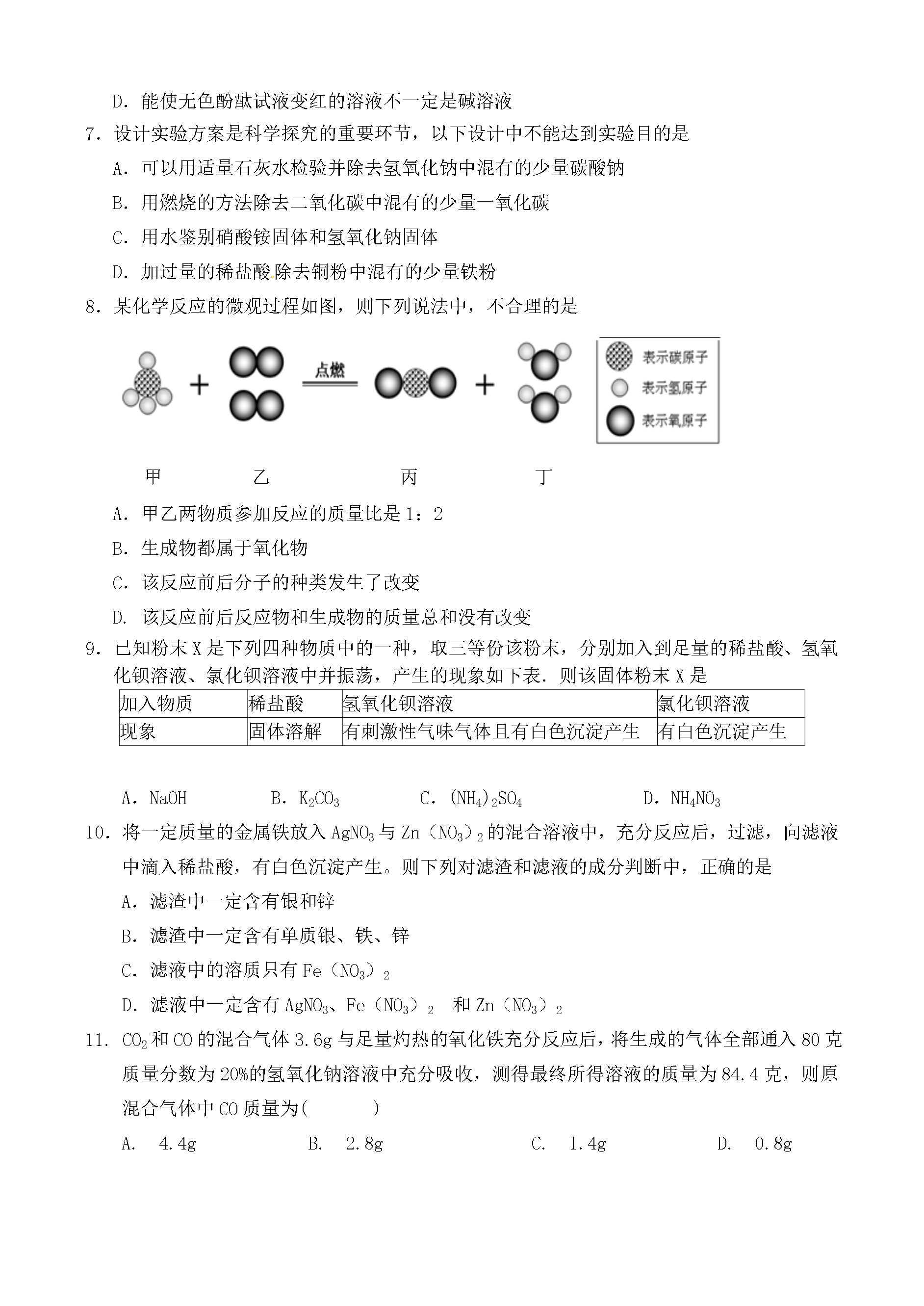 济南市历城区2014年中考一模化学试卷相对原子质量:H1C12N14O16Na23Mg24S32Cl35.5K39Ca40Fe56Cu64Zn65Ag108Ba137第Ⅰ卷(单项选择题共22分)一、单项选择题(本大题包括11小题,每小题2分,共22分。每小题给出的四个选项中,只有一个选项最符合题目的要求)1.下列过程中,只发生物理变化的是A.铜器锈蚀B.酒精挥发C.海水制碱D.牛奶变酸2.下列关于实验操作的说法中,合理的是A.将水沿量筒壁慢慢注入浓硫酸中进行稀释B.测定溶液的pH时将试纸直接放入待测液中C.实验室制取二氧化碳时,先检查装置的气密性,然后加药品D.称量氢氧化钠固体时应放在纸上称量3.已知右图为某粒子的结构示意图,下列说法正确的是A.该粒子属于原子B.该元素在化合物中常显+1价C.该元素的一个离子含有17个电子D.该元素的原子在化学反应中容易失去电子4.生产、生活中处处离不开化学知识,下列说法中,正确的是A.煤炉取暖时在屋里放一盆石灰水可防止煤气中毒B.可燃性气体遇到明火就会发生爆炸C.杜绝吃含有任何添加剂的食品D.燃放烟花爆竹易产生SO2等空气污染物5.绿色化学有助于解决环境污染问题,下列做法中,不符合绿色化学理念的是A.将工业废水处理后再循环使用,以节约水资源B.开发使用风能、太阳能等新能源,减少化石燃料的使用C.禁止焚烧秸秆,提倡秸秆还田或综合利用D.为解决“白色污染”问题,应将废弃塑料焚烧处理6.下列叙述中,不正确的是A.分子、原子、离子都是构成物质的微粒B.生成一种单质和一种化合物的反应一定是置换反应C.在农业生产中,铵态氮肥不能与碱性物质混合使用D.能使无色酚酞试液变红的溶液不一定是碱溶液7.设计实验方案是科学探究的重要环节,以下设计中不能达到实验目的是A.可以用适量石灰水检验并除去氢氧化钠中混有的少量碳酸钠B.用燃烧的方法除去二氧化碳中混有的少量一氧化碳C.用水鉴别硝酸铵固体和氢氧化钠固体D.加过量的稀盐酸除去铜粉中混有的少量铁粉8.某化学反应的微观过程如图,则下列说法中,不合理的是甲乙丙丁A.甲乙两物质参加反应的质量比是1:2B.生成物都属于氧化物C.该反应前后分子的种类发生了改变D.该反应前后反应物和生成物的质量总和没有改变9.已知粉末X是下列四种物质中的一种,取三等份该粉末,分别加入到足量的稀盐酸、氢氧化钡溶液、氯化钡溶液中并振荡,产生的现象如下表.则该固体粉末X是加入物质稀盐酸氢氧化钡溶液氯化钡溶液现象固体溶解有刺激性气味气体且有白色沉淀产生有白色沉淀产生A.NaOHB.K2CO3C.(NH4)2SO4D.NH4NO310.将一定质量的金属铁放入AgNO3与Zn(NO3)2的混合溶液中,充分反应后,过滤,向滤液中滴入稀盐酸,有白色沉淀产生。则下列对滤渣和滤液的成分判断中,正确的是A.滤渣中一定含有银和锌B.滤渣中一定含有单质银、铁、锌C.滤液中的溶质只有Fe(NO3)2D.滤液中一定含有AgNO3、Fe(NO3)2和Zn(NO3)211.CO2和CO的混合气体3.6g与足量灼热的氧化铁充分反应后,将生成的气体全部通入80克质量分数为20%的氢氧化钠溶液中充分吸收,测得最终所得溶液的质量为84.4克,则原混合气体中CO质量为()A.4.4gB.2.8gC.1.4gD.0.8g第Ⅱ卷(非选择题共38分)二、非选择题(本大题包括7个小题,共38分)得分评卷人12.(4分)按要求从氢气、氧气、氧化铁、一氧化碳、氢氧化钙、盐酸、硝酸钾中选择合适的物质,将其化学式填写在下列横线上。(1)一种可燃性气体单质;(2)一种用于炼铁的氧化物;(3)一种微溶于水的碱;(4)一种可作为化肥的盐。得分评卷人13.(4分)每到夏天,大街小巷的露天烧烤便“火”了起来,吃烧烤成了很多人的最爱。烧烤时木炭不充分燃烧,产生剧毒的CO气体,肉串不熟可能存在寄生虫或病菌,烤出的油滴燃烧分解产生大量有害物质,肉类在烧烤过程中会产生一种极其强烈的致癌物——苯并芘(化学式C20H12)。(1)苯并芘属于_____________(填“无机物”“有机物”“氧化物”之一)。(2)苯并芘中氢、碳元素的质量比为(填最简整数比)__________________。(3)木炭在空气中燃烧时主要产生二氧化碳气体,另外还产生少量一氧化碳、炭黑等有害物质,在二氧化碳、一氧化碳、碳单质中,碳元素的化合价分别为__________。(4)远处就能闻到烤串的香味,请用分子的性质解释。得分评卷人14.(4分)人类文明进步与金属材料发展关系十分密切,金属在生活生产中有着非常广泛的应用。(1)下列三种金属被发现、使用的先后顺序为:铜、铁、铝。与金属大规模被使用的先后顺序关系最大的是(选填字母)。A.地壳中金属元素的含量B.金属的用途大小C.金属的活动性(2)生活垃圾