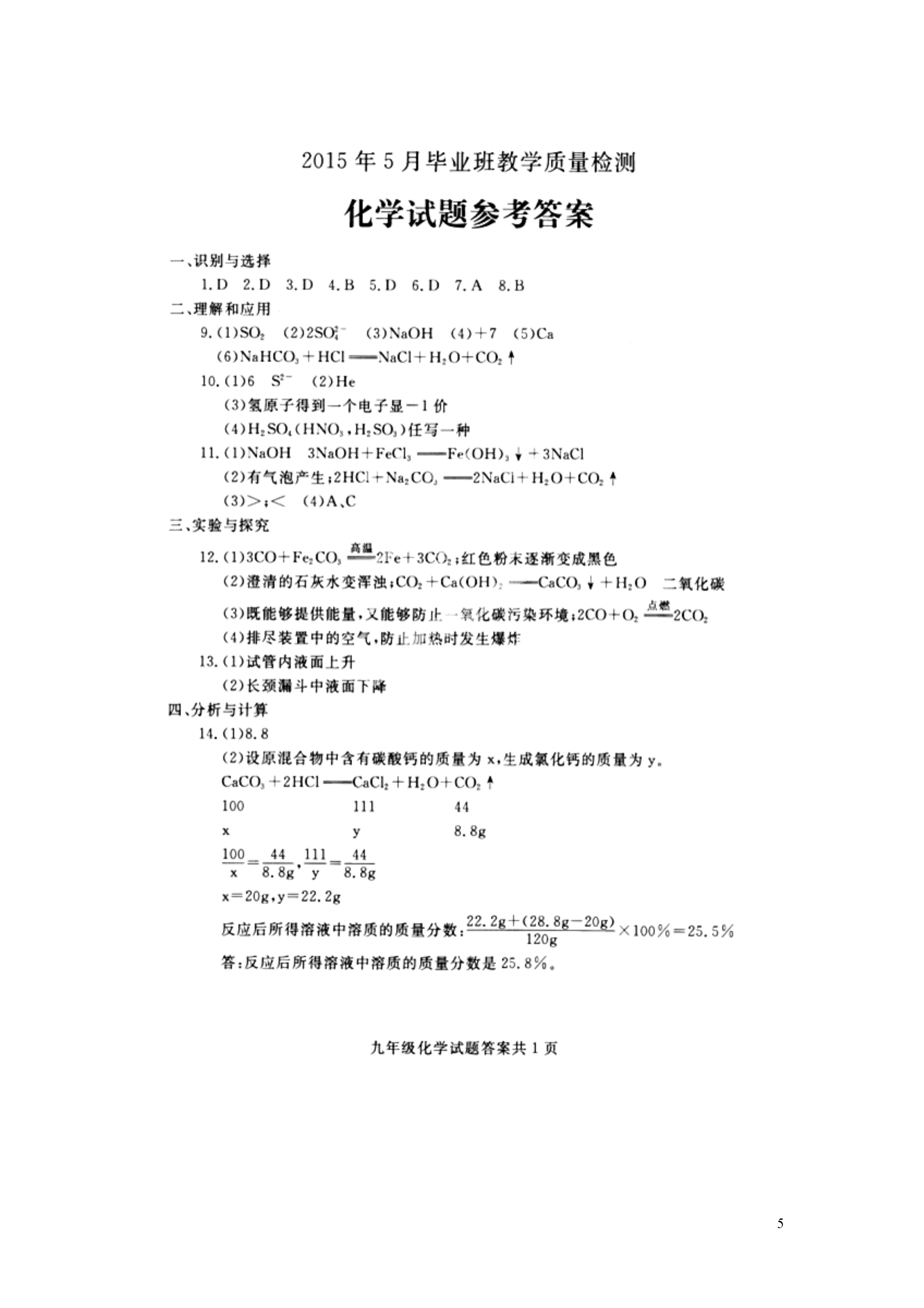 5山东省曹县2015届九年级化学5月教学质量检测(二模)试题