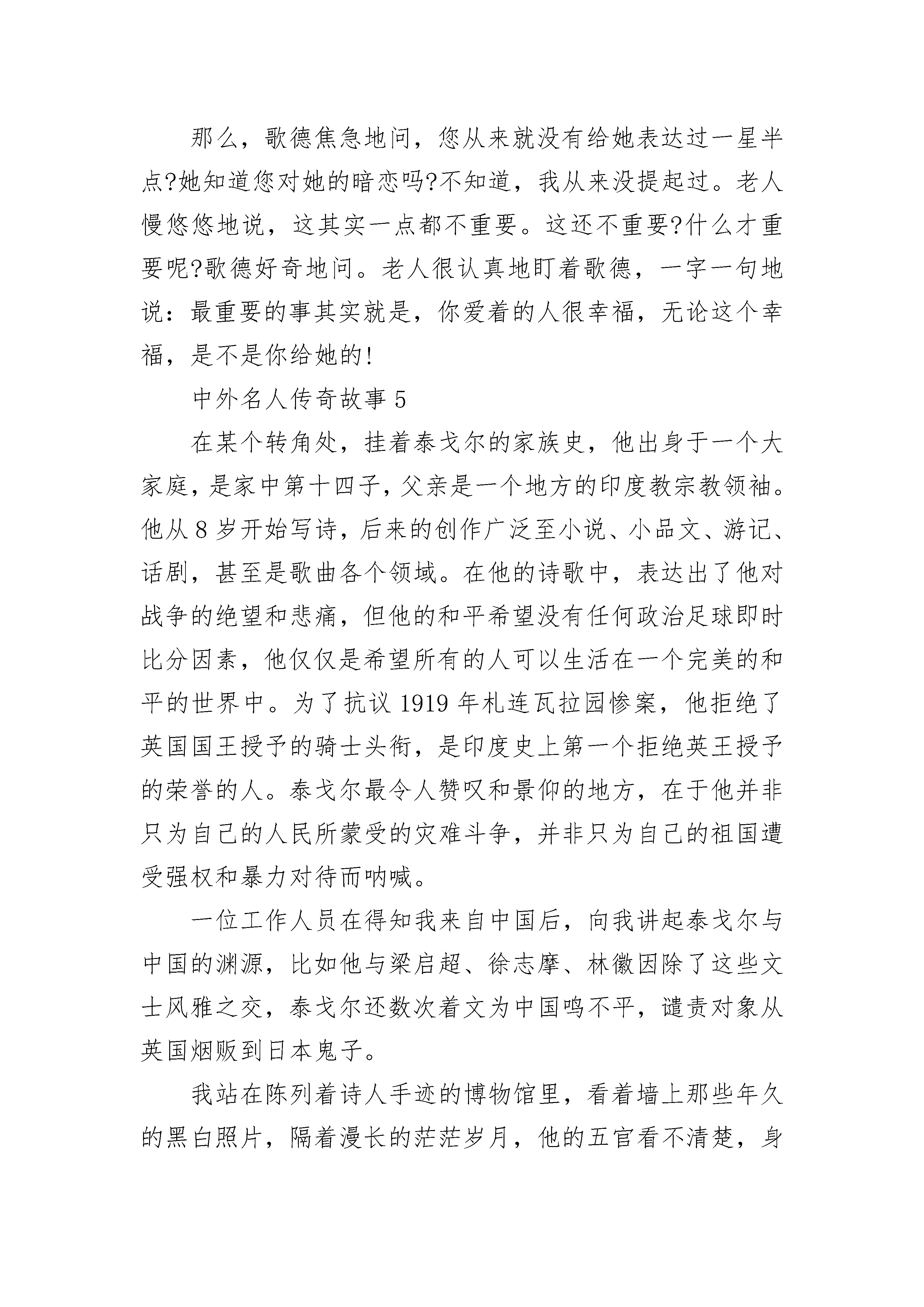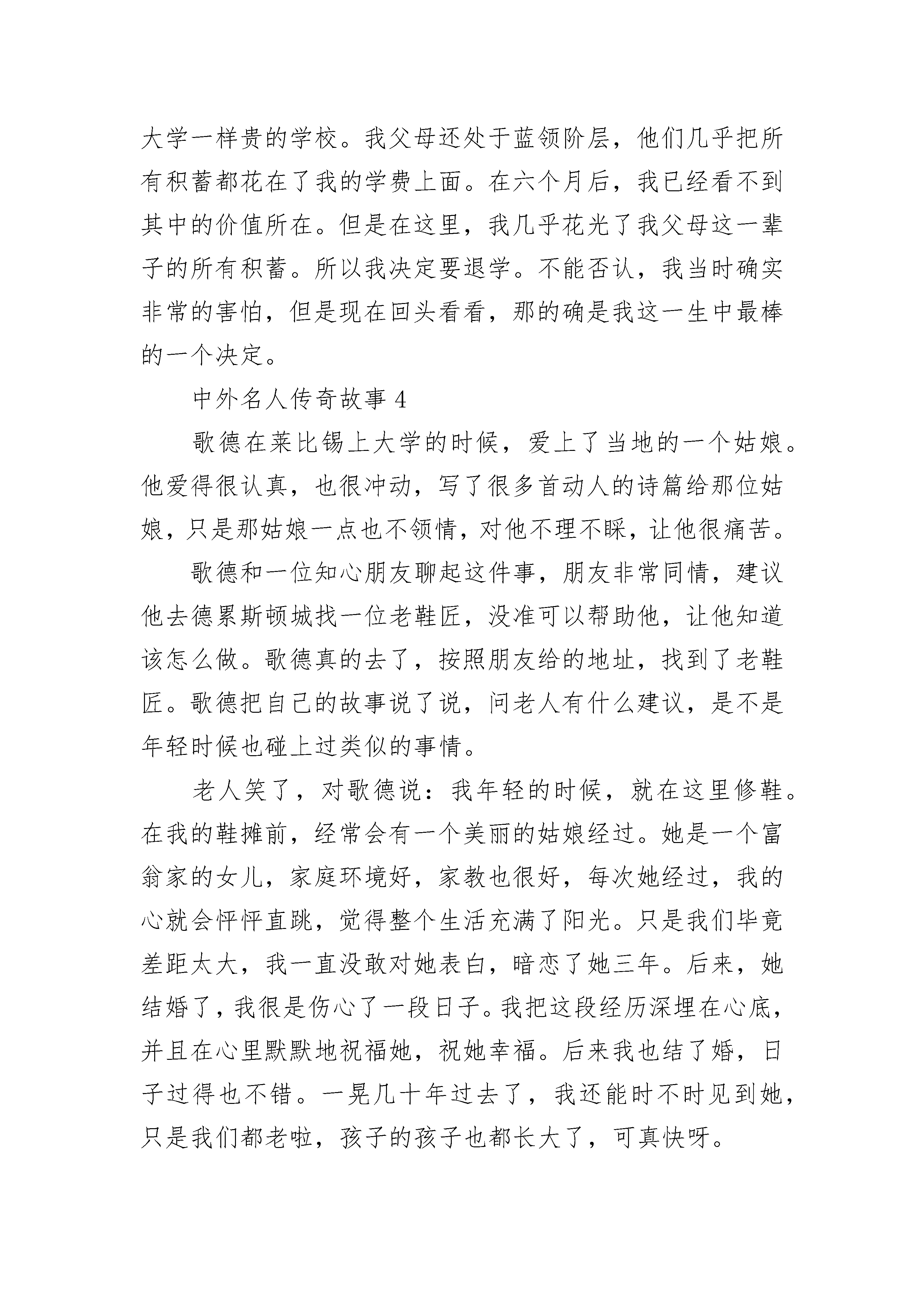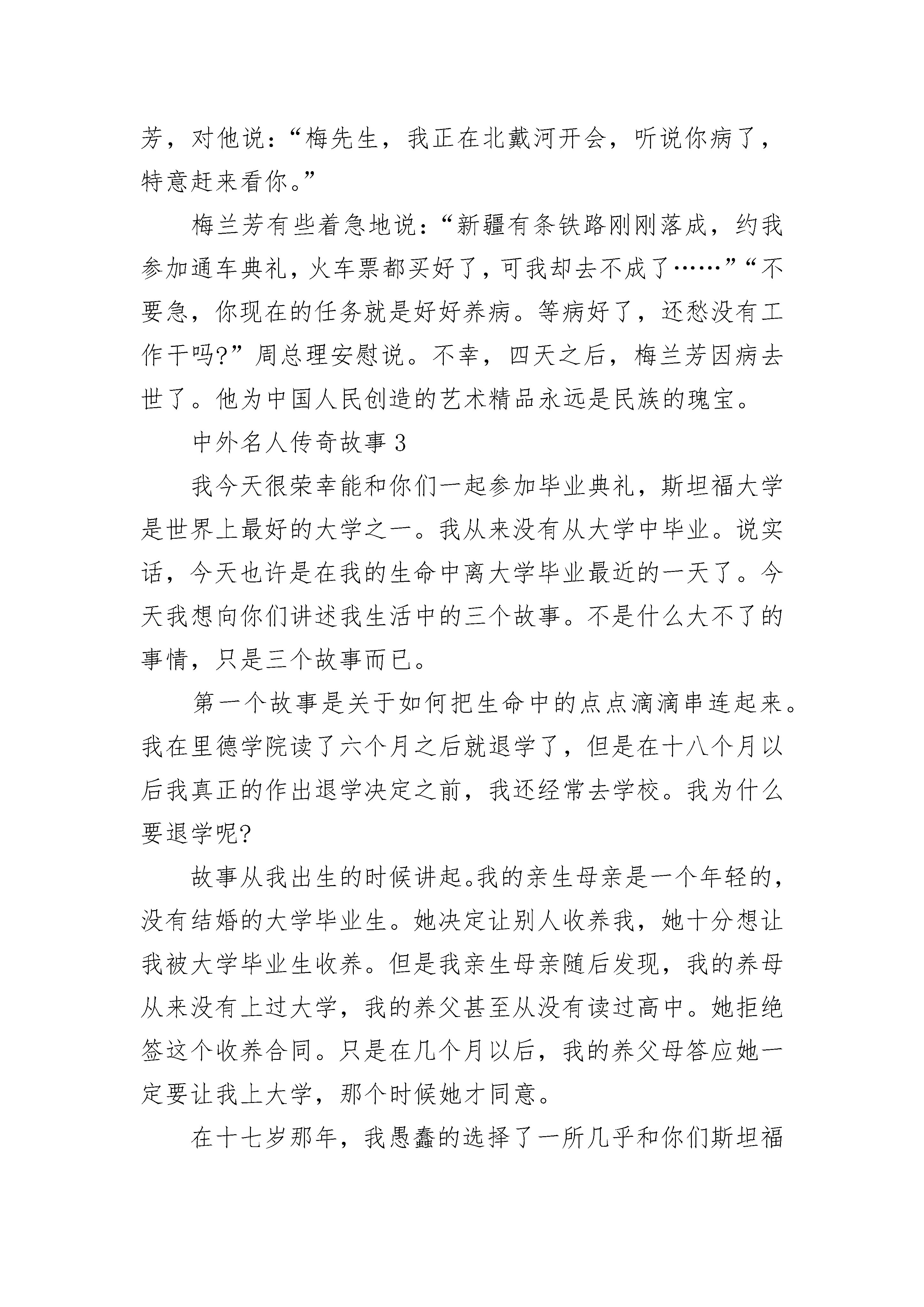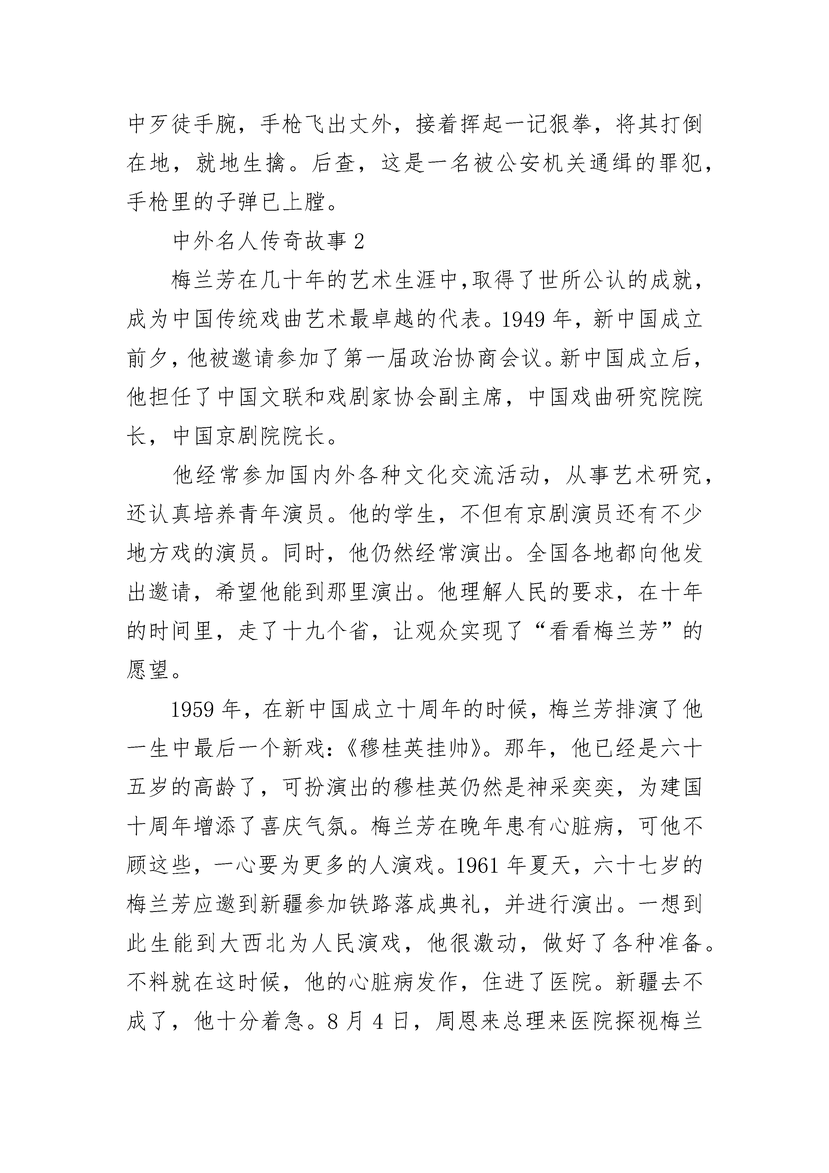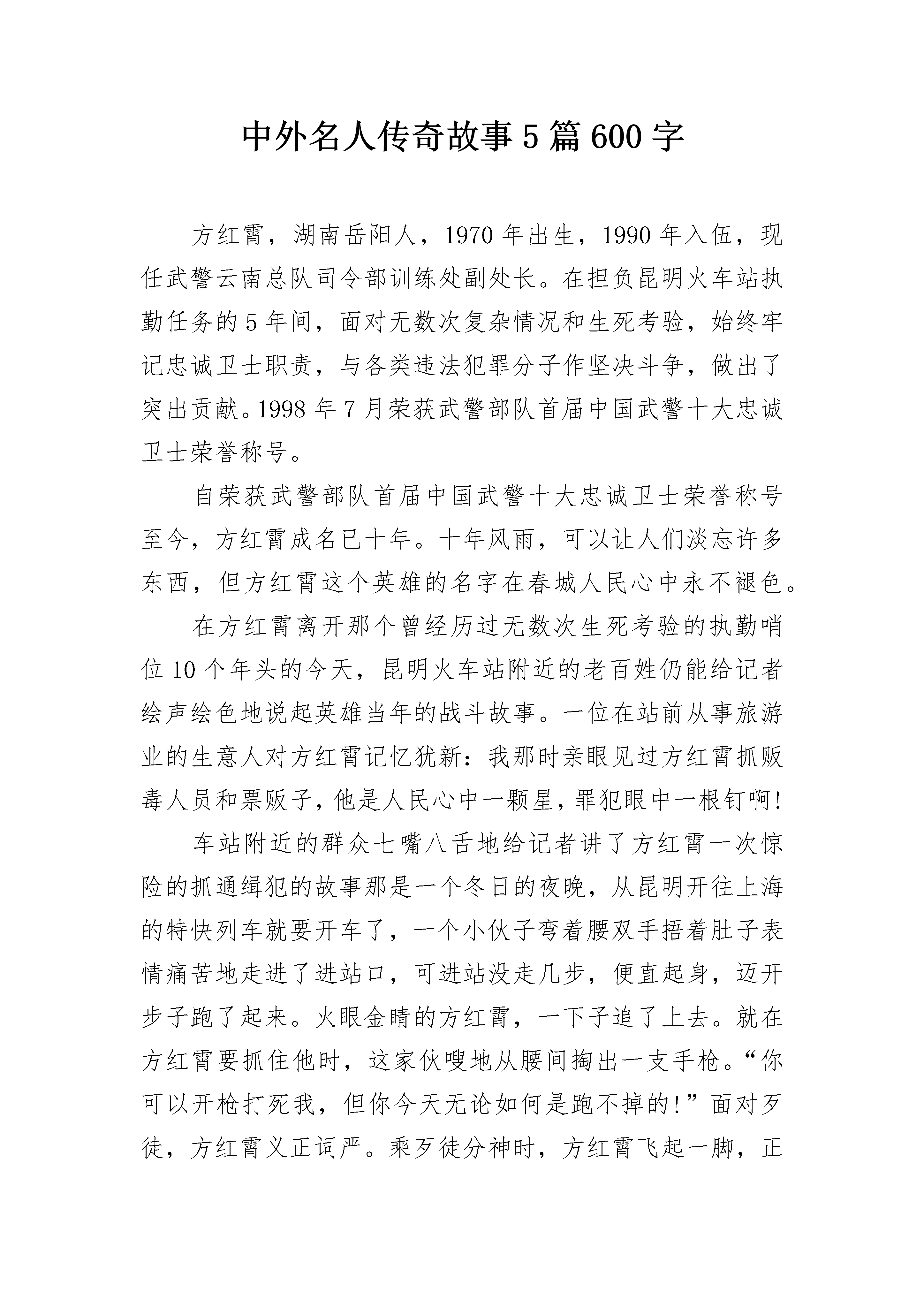 中外名人传奇故事5篇600字方红霄,湖南岳阳人,1970年出生,1990年入伍,现任武警云南总队司令部训练处副处长。在担负昆明火车站执勤任务的5年间,面对无数次复杂情况和生死考验,始终牢记忠诚卫士职责,与各类违法犯罪分子作坚决斗争,做出了突出贡献。1998年7月荣获武警部队首届中国武警十大忠诚卫士荣誉称号。自荣获武警部队首届中国武警十大忠诚卫士荣誉称号至今,方红霄成名已十年。十年风雨,可以让人们淡忘许多东西,但方红霄这个英雄的名字在春城人民心中永不褪色。在方红霄离开那个曾经历过无数次生死考验的执勤哨位10个年头的今天,昆明火车站附近的老百姓仍能给记者绘声绘色地说起英雄当年的战斗故事。一位在站前从事旅游业的生意人对方红霄记忆犹新:我那时亲眼见过方红霄抓贩毒人员和票贩子,他是人民心中一颗星,罪犯眼中一根钉啊!车站附近的群众七嘴八舌地给记者讲了方红霄一次惊险的抓通缉犯的故事那是一个冬日的夜晚,从昆明开往上海的特快列车就要开车了,一个小伙子弯着腰双手捂着肚子表情痛苦地走进了进站口,可进站没走几步,便直起身,迈开步子跑了起来。火眼金睛的方红霄,一下子追了上去。就在方红霄要抓住他时,这家伙嗖地从腰间掏出一支手枪。“你可以开枪打死我,但你今天无论如何是跑不掉的!”面对歹徒,方红霄义正词严。乘歹徒分神时,方红霄飞起一脚,正中歹徒手腕,手枪飞出丈外,接着挥起一记狠拳,将其打倒在地,就地生擒。后查,这是一名被公安机关通缉的罪犯,手枪里的子弹已上膛。中外名人传奇故事2梅兰芳在几十年的艺术生涯中,取得了世所公认的成就,成为中国传统戏曲艺术最卓越的代表。1949年,新中国成立前夕,他被邀请参加了第一届政治协商会议。新中国成立后,他担任了中国文联和戏剧家协会副主席,中国戏曲研究院院长,中国京剧院院长。他经常参加国内外各种文化交流活动,从事艺术研究,还认真培养青年演员。他的学生,不但有京剧演员还有不少地方戏的演员。同时,他仍然经常演出。全国各地都向他发出邀请,希望他能到那里演出。他理解人民的要求,在十年的时间里,走了十九个省,让观众实现了“看看梅兰芳”的愿望。1959年,在新中国成立十周年的时候,梅兰芳排演了他一生中最后一个新戏:《穆桂英挂帅》。那年,他已经是六十五岁的高龄了,可扮演出的穆桂英仍然是神采奕奕,为建国十周年增添了喜庆气氛。梅兰芳在晚年患有心脏病,可他不顾这些,一心要为更多的人演戏。1961年夏天,六十七岁的梅兰芳应邀到新疆参加铁路落成典礼,并进行演出。一想到此生能到大西北为人民演戏,他很激动,做好了各种准备。不料就在这时候,他的心脏病发作,住进了医院。新疆去不成了,他十分着急。8月4日,周恩来总理来医院探视梅兰芳,对他说:“梅先生,我正在北戴河开会,听说你病了,特意赶来看你。”梅兰芳有些着急地说:“新疆有条铁路刚刚落成,约我参加通车典礼,火车票都买好了,可我却去不成了……”“不要急,你现在的任务就是好好养病。等病好了,还愁没有工作干吗?”周总理安慰说。不幸,四天之后,梅兰芳因病去世了。他为中国人民创造的艺术精品永远是民族的瑰宝。中外名人传奇故事3我今天很荣幸能和你们一起参加毕业典礼,斯坦福大学是世界上最好的大学之一。我从来没有从大学中毕业。说实话,今天也许是在我的生命中离大学毕业最近的一天了。今天我想向你们讲述我生活中的三个故事。不是什么大不了的事情,只是三个故事而已。第一个故事是关于如何把生命中的点点滴滴串连起来。我在里德学院读了六个月之后就退学了,但是在十八个月以后我真正的作出退学决定之前,我还经常去学校。我为什么要退学呢?故事从我出生的时候讲起。我的亲生母亲是一个年轻的,没有结婚的大学毕业生。她决定让别人收养我,她十分想让我被大学毕业生收养。但是我亲生母亲随后发现,我的养母从来没有上过大学,我的养父甚至从没有读过高中。她拒绝签这个收养合同。只是在几个月以后,我的养父母答应她一定要让我上大学,那个时候她才同意。在十七岁那年,我愚蠢的选择了一所几乎和你们斯坦福大学一样贵的学校。我父母还处于蓝领阶层,他们几乎把所有积蓄都花在了我的学费上面。在六个月后,我已经看不到其中的价值所在。但是在这里,我几乎花光了我父母这一辈子的所有积蓄。所以我决定要退学。不能否认,我当时确实非常的害怕,但是现在回头看看,那的确是我这一生中最棒的一个决定。中外名人传奇故事4歌德在莱比锡上大学的时候,爱上了当地的一个姑娘。他爱得很认真,也很冲动,写了很多首动人的诗篇给那位姑娘,只是那姑娘一点也不领情,对他不理不睬,让他很痛苦。歌德和一位知心朋友聊起这件事,朋友非常同情,建议他去德累斯顿城找一位老鞋匠,没准可以帮助他,让他知道该怎么做。歌德真的去了,按照朋友给的地址,找到了老鞋匠。歌德把自己的故事说了说,问老人有什么建议,是不是年轻时候也碰上过类似的事情。老人笑了,对歌