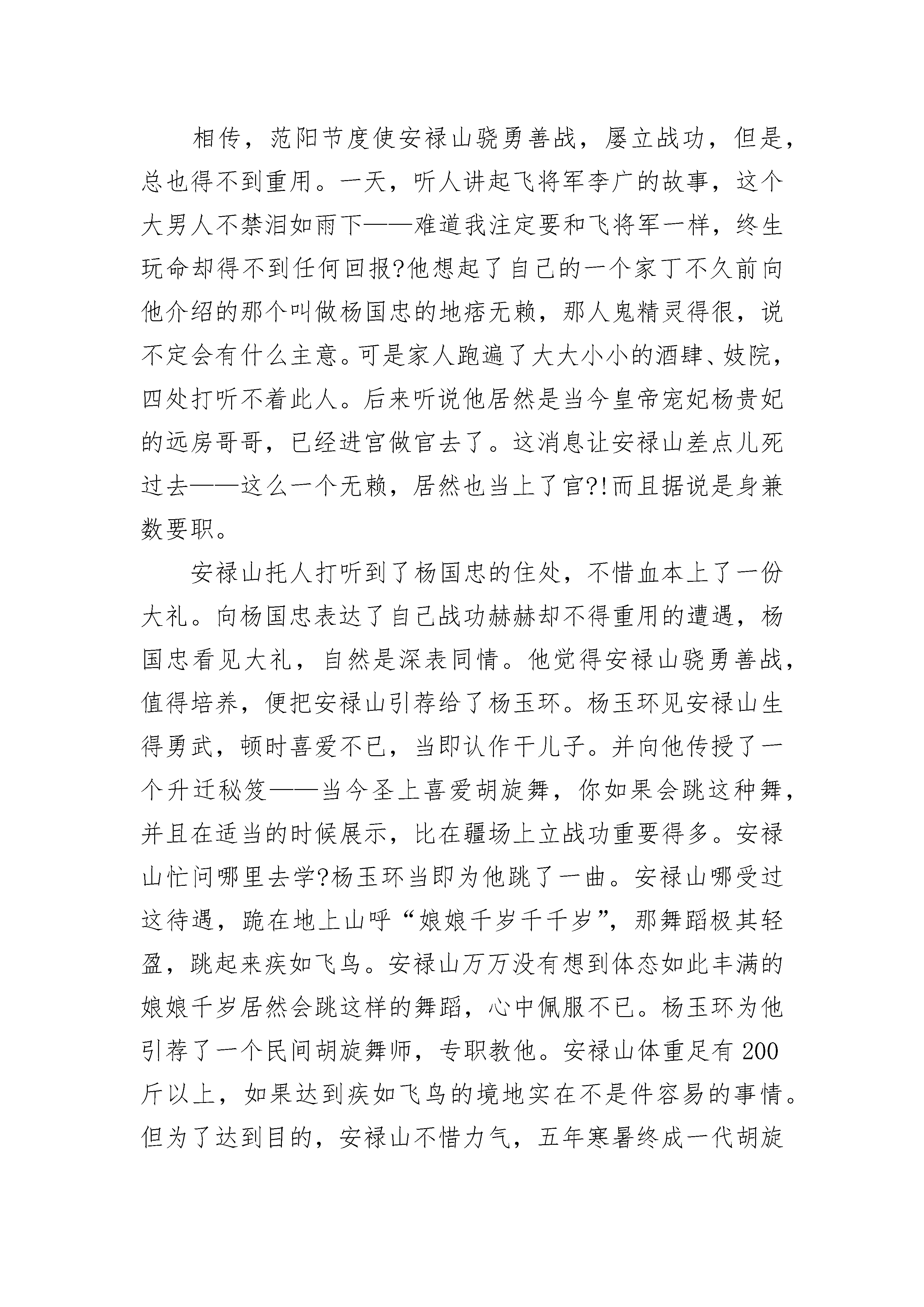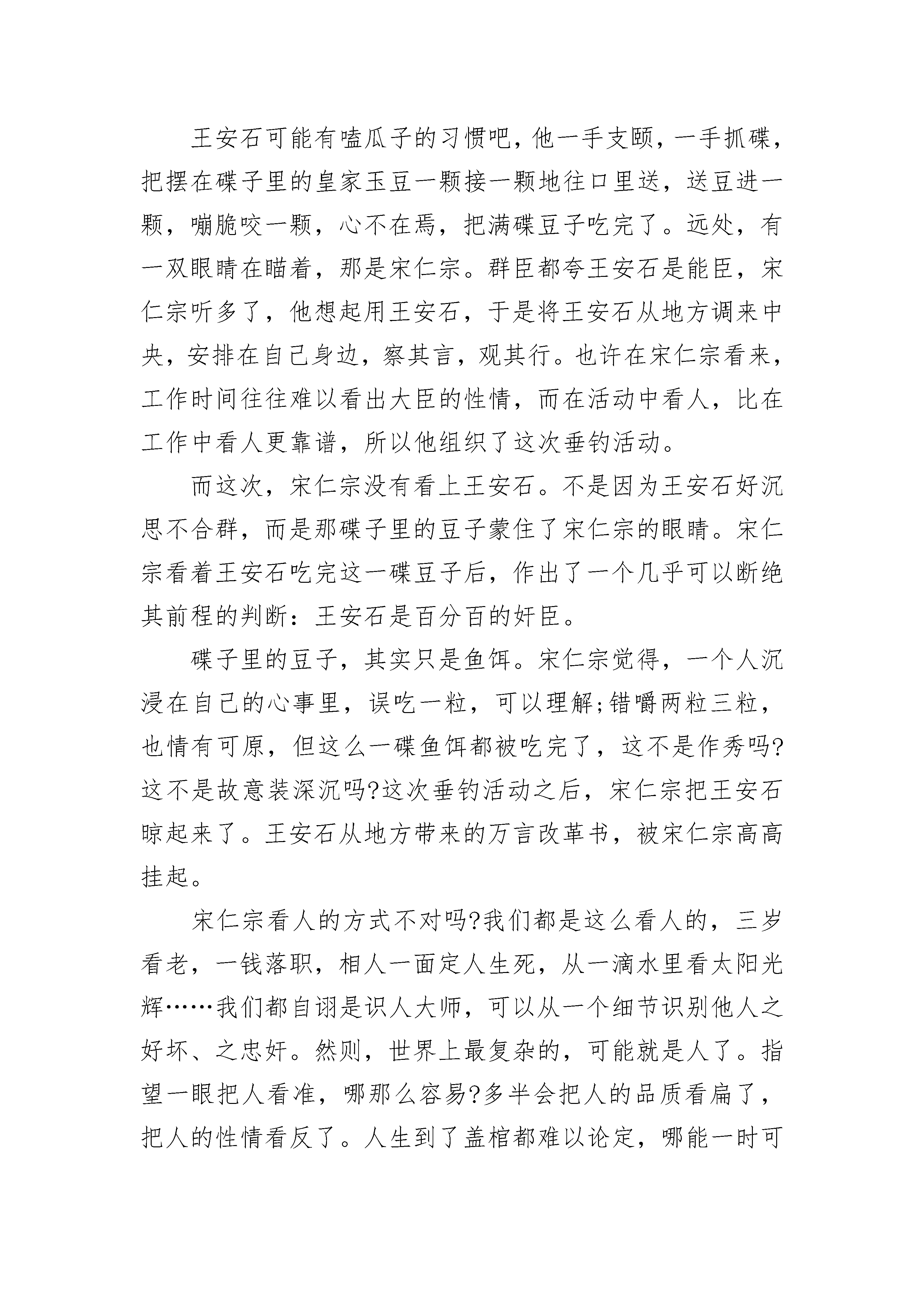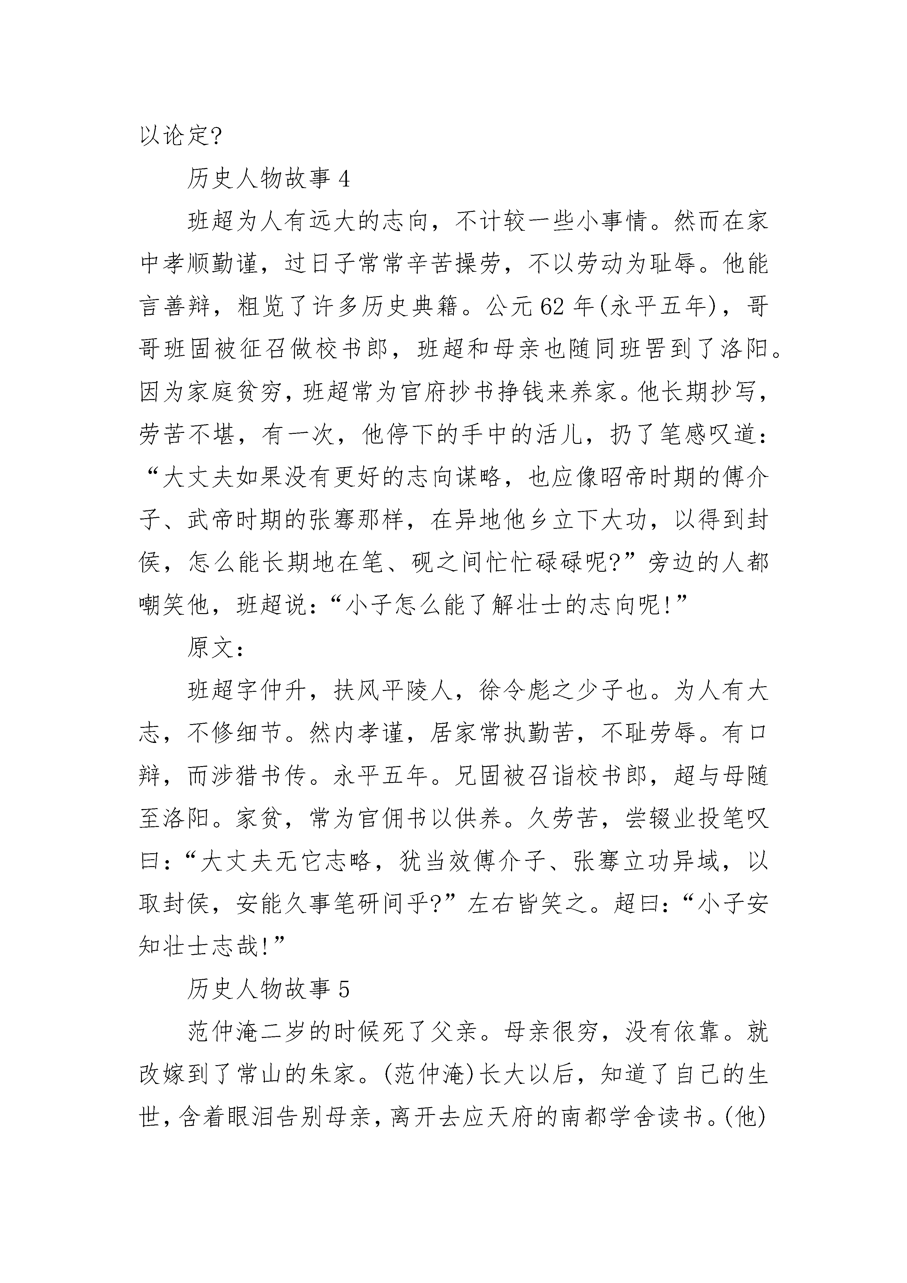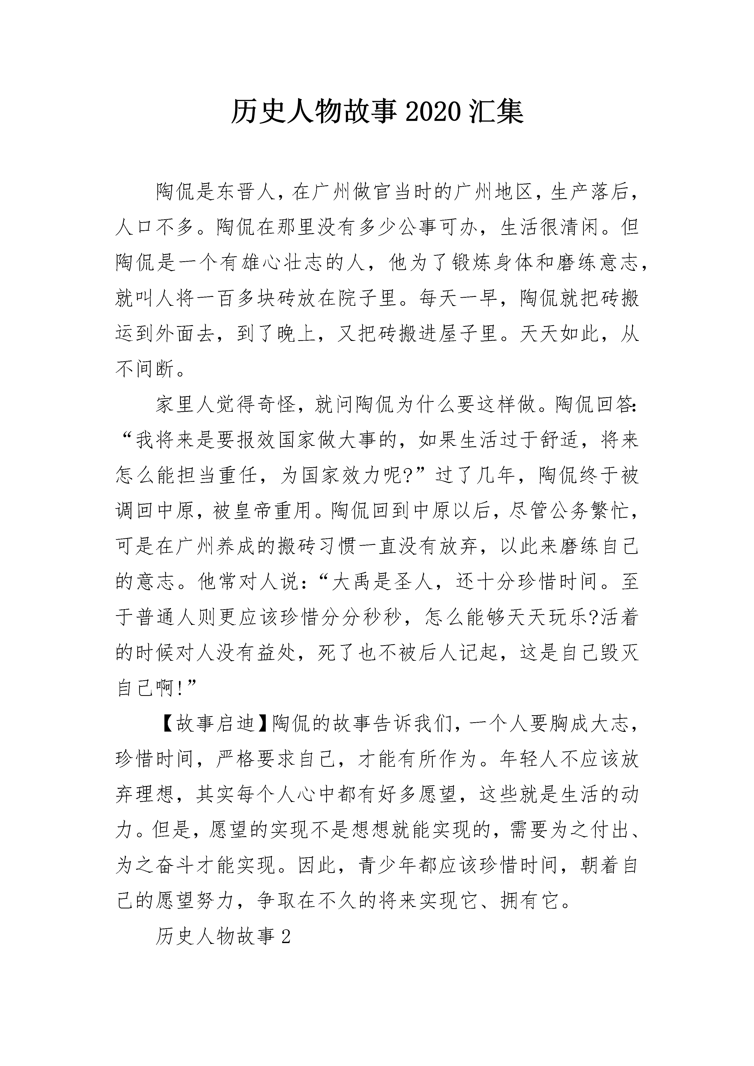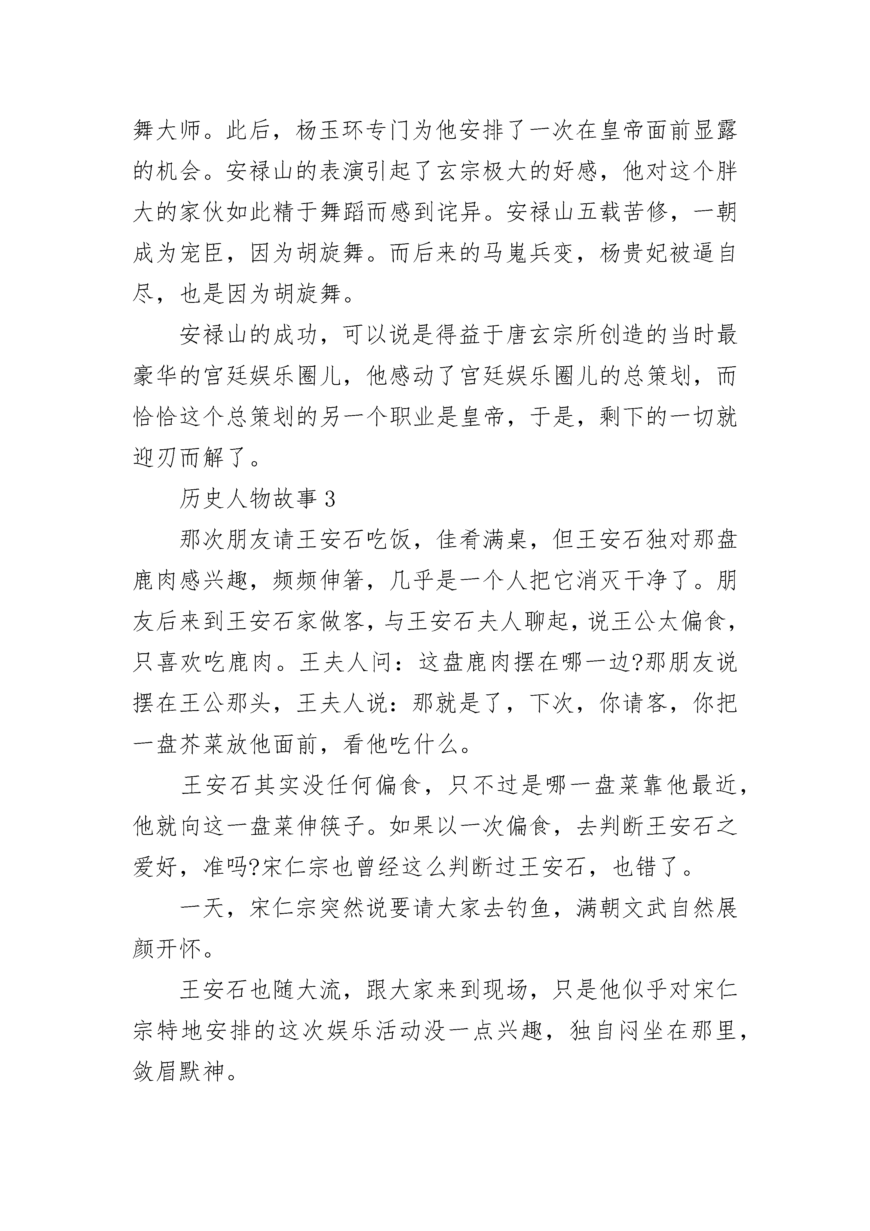 历史人物故事2020汇集陶侃是东晋人,在广州做官当时的广州地区,生产落后,人口不多。陶侃在那里没有多少公事可办,生活很清闲。但陶侃是一个有雄心壮志的人,他为了锻炼身体和磨练意志,就叫人将一百多块砖放在院子里。每天一早,陶侃就把砖搬运到外面去,到了晚上,又把砖搬进屋子里。天天如此,从不间断。家里人觉得奇怪,就问陶侃为什么要这样做。陶侃回答:“我将来是要报效国家做大事的,如果生活过于舒适,将来怎么能担当重任,为国家效力呢?”过了几年,陶侃终于被调回中原,被皇帝重用。陶侃回到中原以后,尽管公务繁忙,可是在广州养成的搬砖习惯一直没有放弃,以此来磨练自己的意志。他常对人说:“大禹是圣人,还十分珍惜时间。至于普通人则更应该珍惜分分秒秒,怎么能够天天玩乐?活着的时候对人没有益处,死了也不被后人记起,这是自己毁灭自己啊!”【故事启迪】陶侃的故事告诉我们,一个人要胸成大志,珍惜时间,严格要求自己,才能有所作为。年轻人不应该放弃理想,其实每个人心中都有好多愿望,这些就是生活的动力。但是,愿望的实现不是想想就能实现的,需要为之付出、为之奋斗才能实现。因此,青少年都应该珍惜时间,朝着自己的愿望努力,争取在不久的将来实现它、拥有它。历史人物故事2相传,范阳节度使安禄山骁勇善战,屡立战功,但是,总也得不到重用。一天,听人讲起飞将军李广的故事,这个大男人不禁泪如雨下——难道我注定要和飞将军一样,终生玩命却得不到任何回报?他想起了自己的一个家丁不久前向他介绍的那个叫做杨国忠的地痞无赖,那人鬼精灵得很,说不定会有什么主意。可是家人跑遍了大大小小的酒肆、妓院,四处打听不着此人。后来听说他居然是当今皇帝宠妃杨贵妃的远房哥哥,已经进宫做官去了。这消息让安禄山差点儿死过去——这么一个无赖,居然也当上了官?!而且据说是身兼数要职。安禄山托人打听到了杨国忠的住处,不惜血本上了一份大礼。向杨国忠表达了自己战功赫赫却不得重用的遭遇,杨国忠看见大礼,自然是深表同情。他觉得安禄山骁勇善战,值得培养,便把安禄山引荐给了杨玉环。杨玉环见安禄山生得勇武,顿时喜爱不已,当即认作干儿子。并向他传授了一个升迁秘笈——当今圣上喜爱胡旋舞,你如果会跳这种舞,并且在适当的时候展示,比在疆场上立战功重要得多。安禄山忙问哪里去学?杨玉环当即为他跳了一曲。安禄山哪受过这待遇,跪在地上山呼“娘娘千岁千千岁”,那舞蹈极其轻盈,跳起来疾如飞鸟。安禄山万万没有想到体态如此丰满的娘娘千岁居然会跳这样的舞蹈,心中佩服不已。杨玉环为他引荐了一个民间胡旋舞师,专职教他。安禄山体重足有200斤以上,如果达到疾如飞鸟的境地实在不是件容易的事情。但为了达到目的,安禄山不惜力气,五年寒暑终成一代胡旋舞大师。此后,杨玉环专门为他安排了一次在皇帝面前显露的机会。安禄山的表演引起了玄宗极大的好感,他对这个胖大的家伙如此精于舞蹈而感到诧异。安禄山五载苦修,一朝成为宠臣,因为胡旋舞。而后来的马嵬兵变,杨贵妃被逼自尽,也是因为胡旋舞。安禄山的成功,可以说是得益于唐玄宗所创造的当时最豪华的宫廷娱乐圈儿,他感动了宫廷娱乐圈儿的总策划,而恰恰这个总策划的另一个职业是皇帝,于是,剩下的一切就迎刃而解了。历史人物故事3那次朋友请王安石吃饭,佳肴满桌,但王安石独对那盘鹿肉感兴趣,频频伸箸,几乎是一个人把它消灭干净了。朋友后来到王安石家做客,与王安石夫人聊起,说王公太偏食,只喜欢吃鹿肉。王夫人问:这盘鹿肉摆在哪一边?那朋友说摆在王公那头,王夫人说:那就是了,下次,你请客,你把一盘芥菜放他面前,看他吃什么。王安石其实没任何偏食,只不过是哪一盘菜靠他最近,他就向这一盘菜伸筷子。如果以一次偏食,去判断王安石之爱好,准吗?宋仁宗也曾经这么判断过王安石,也错了。一天,宋仁宗突然说要请大家去钓鱼,满朝文武自然展颜开怀。王安石也随大流,跟大家来到现场,只是他似乎对宋仁宗特地安排的这次娱乐活动没一点兴趣,独自闷坐在那里,敛眉默神。王安石可能有嗑瓜子的习惯吧,他一手支颐,一手抓碟,把摆在碟子里的皇家玉豆一颗接一颗地往口里送,送豆进一颗,嘣脆咬一颗,心不在焉,把满碟豆子吃完了。远处,有一双眼睛在瞄着,那是宋仁宗。群臣都夸王安石是能臣,宋仁宗听多了,他想起用王安石,于是将王安石从地方调来中央,安排在自己身边,察其言,观其行。也许在宋仁宗看来,工作时间往往难以看出大臣的性情,而在活动中看人,比在工作中看人更靠谱,所以他组织了这次垂钓活动。而这次,宋仁宗没有看上王安石。不是因为王安石好沉思不合群,而是那碟子里的豆子蒙住了宋仁宗的眼睛。宋仁宗看着王安石吃完这一碟豆子后,作出了一个几乎可以断绝其前程的判断:王安石是百分百的奸臣。碟子里的豆子,其实只是鱼饵。宋仁宗觉得,一个人沉浸在自己的心事里,误吃一粒,可以理解;错嚼两粒三粒,也情有可原,但这么一碟鱼饵都被吃完了,这不是作秀吗?