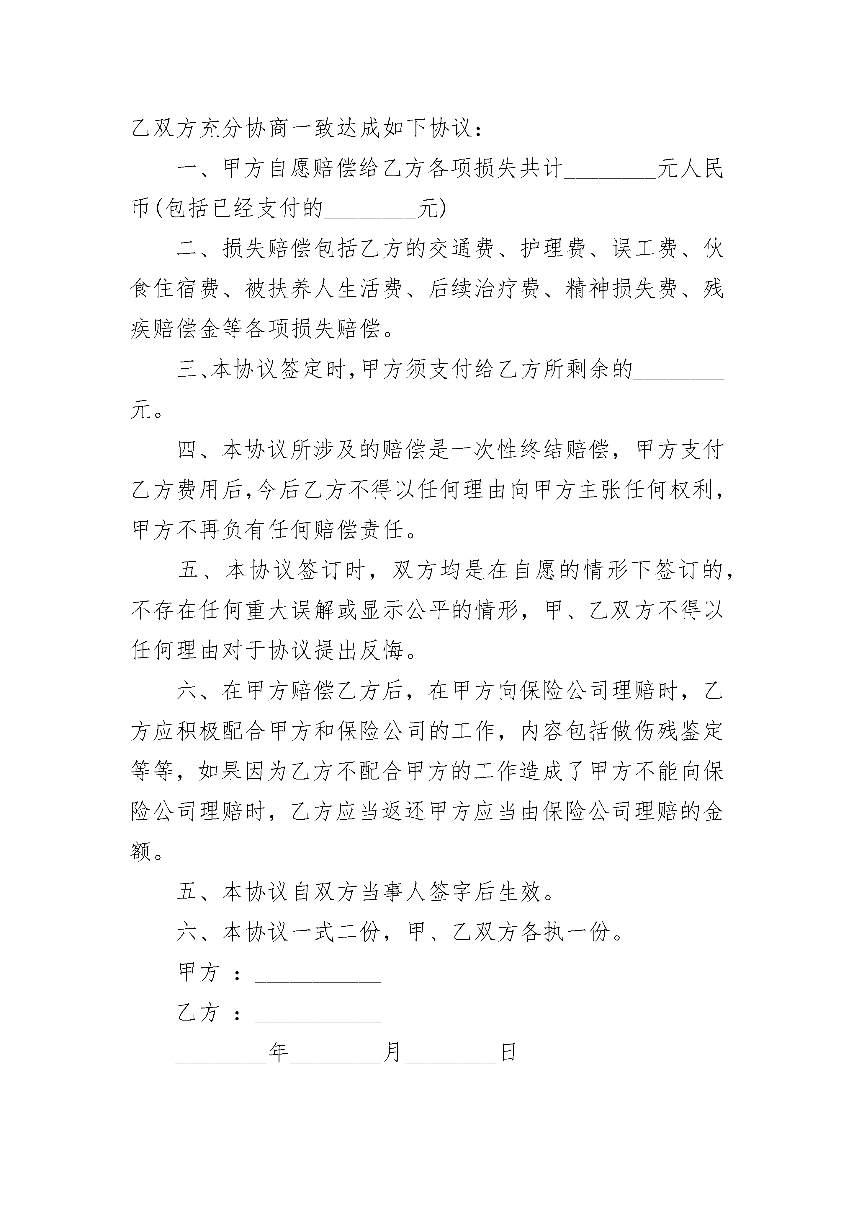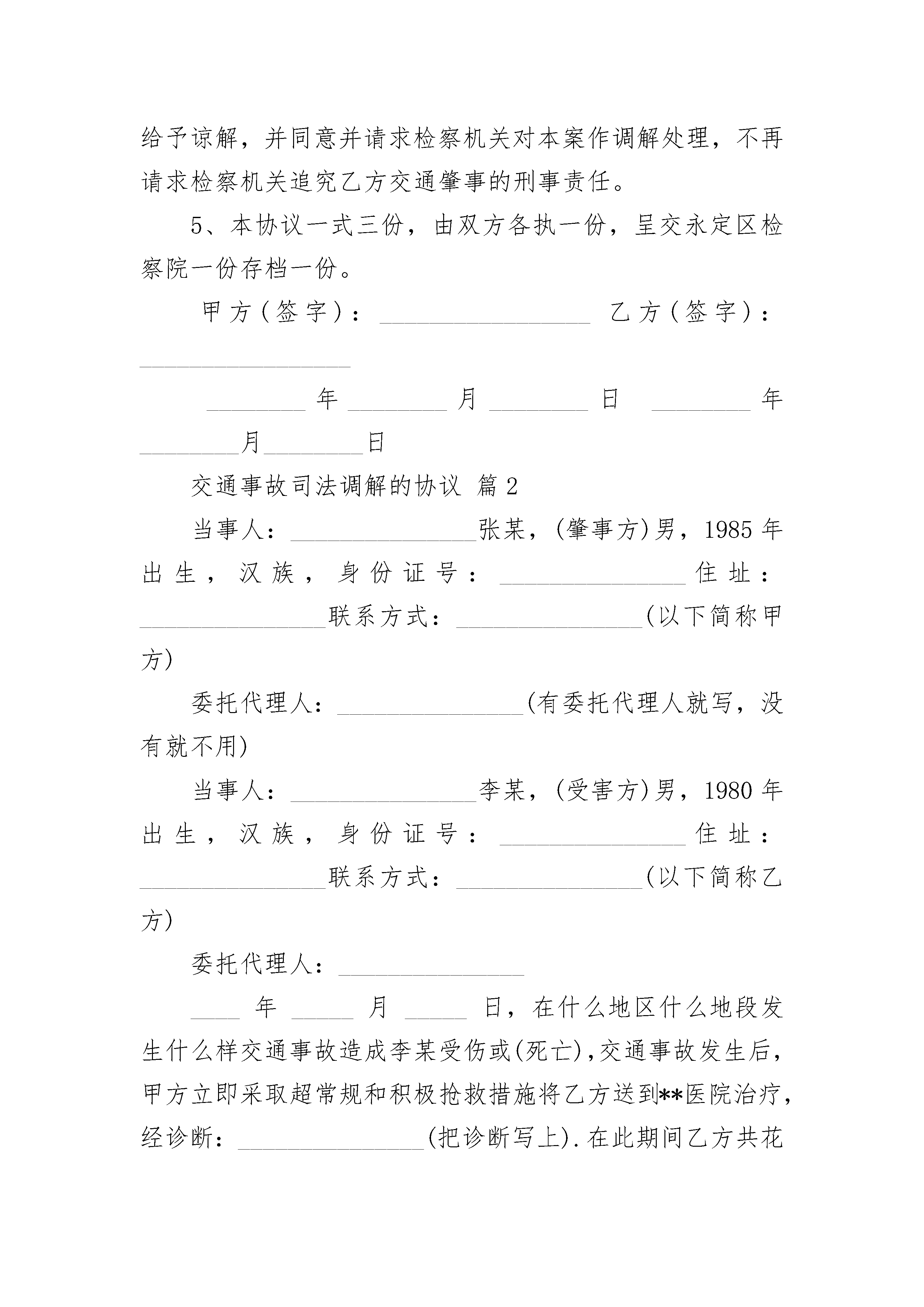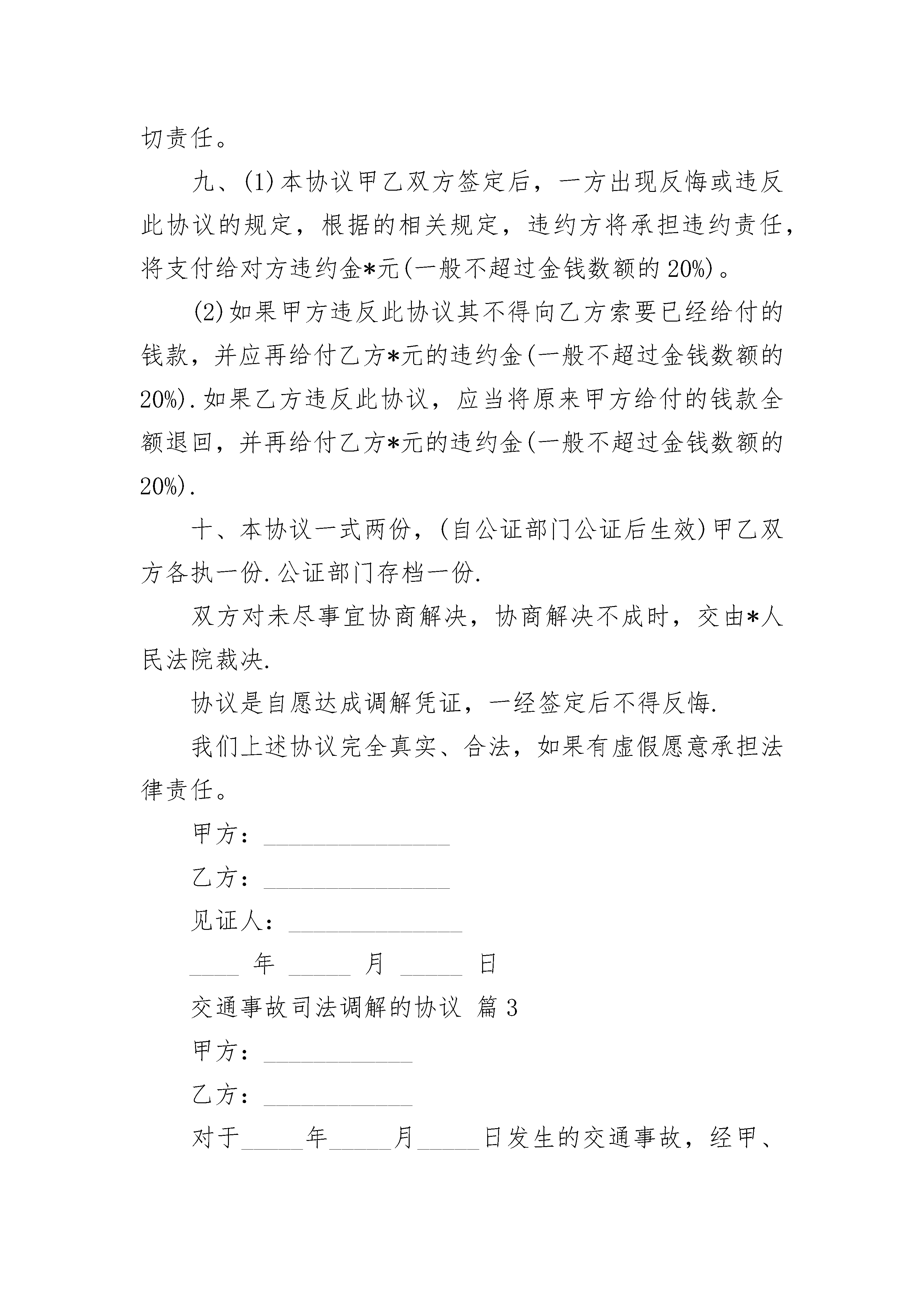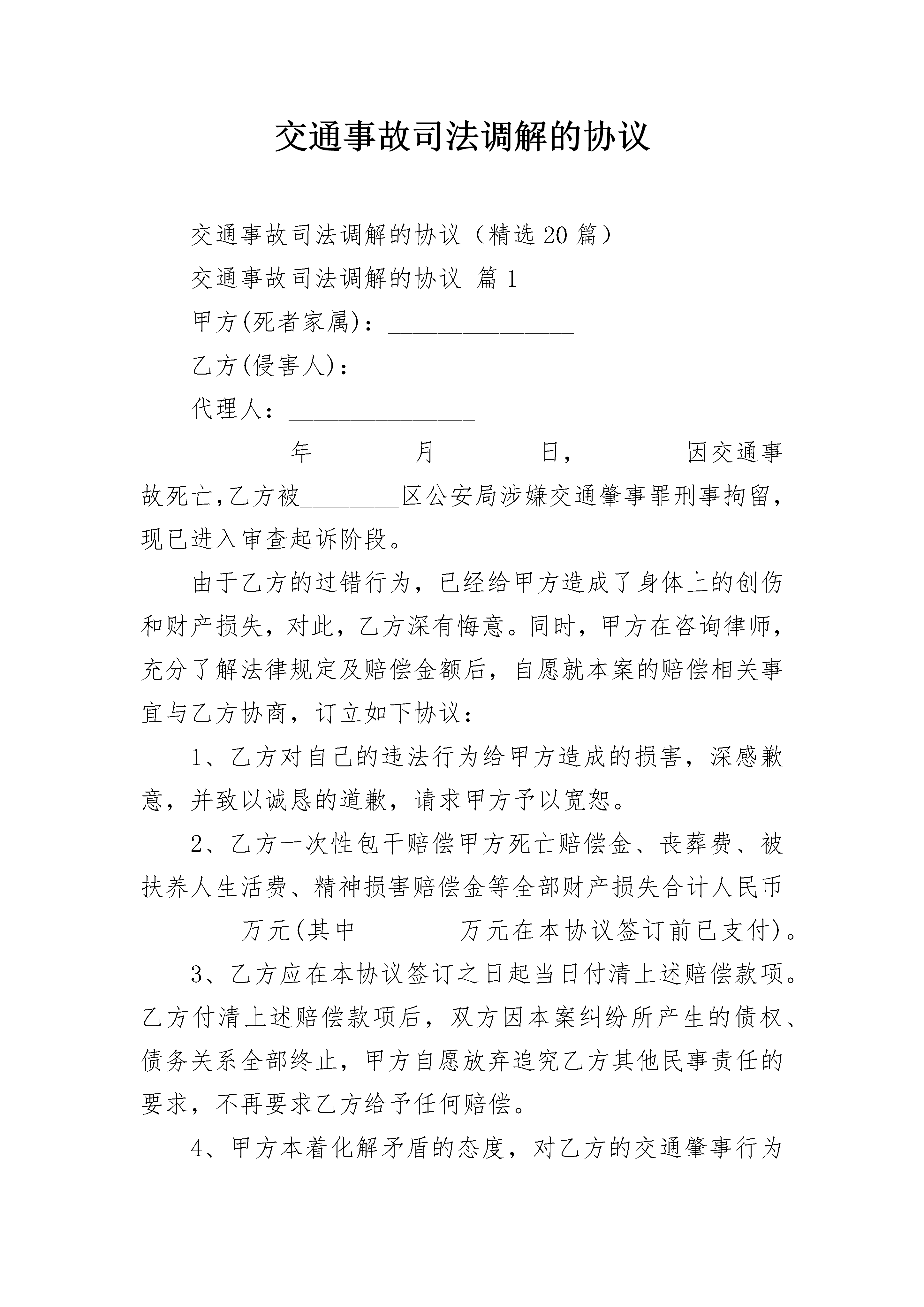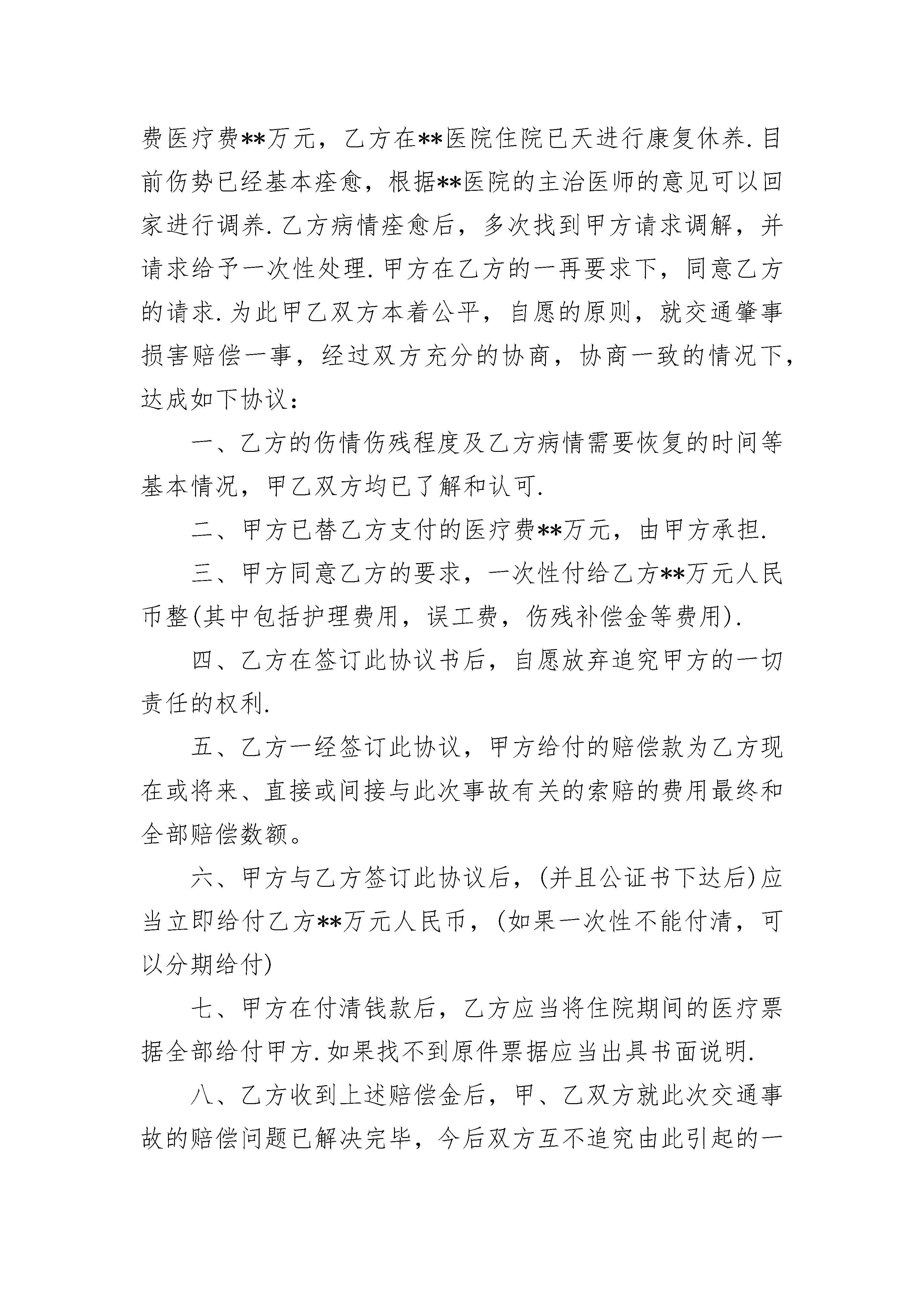 交通事故司法调解的协议交通事故司法调解的协议(精选20篇)交通事故司法调解的协议篇1甲方(死者家属):_______________乙方(侵害人):_______________代理人:_______________________年________月________日,________因交通事故死亡,乙方被________区公安局涉嫌交通肇事罪刑事拘留,现已进入审查起诉阶段。由于乙方的过错行为,已经给甲方造成了身体上的创伤和财产损失,对此,乙方深有悔意。同时,甲方在咨询律师,充分了解法律规定及赔偿金额后,自愿就本案的赔偿相关事宜与乙方协商,订立如下协议:1、乙方对自己的违法行为给甲方造成的损害,深感歉意,并致以诚恳的道歉,请求甲方予以宽恕。2、乙方一次性包干赔偿甲方死亡赔偿金、丧葬费、被扶养人生活费、精神损害赔偿金等全部财产损失合计人民币________万元(其中________万元在本协议签订前已支付)。3、乙方应在本协议签订之日起当日付清上述赔偿款项。乙方付清上述赔偿款项后,双方因本案纠纷所产生的债权、债务关系全部终止,甲方自愿放弃追究乙方其他民事责任的要求,不再要求乙方给予任何赔偿。4、甲方本着化解矛盾的态度,对乙方的交通肇事行为给予谅解,并同意并请求检察机关对本案作调解处理,不再请求检察机关追究乙方交通肇事的刑事责任。5、本协议一式三份,由双方各执一份,呈交永定区检察院一份存档一份。甲方(签字):_________________乙方(签字):_________________________年________月________日________年________月________日交通事故司法调解的协议篇2当事人:_______________张某,(肇事方)男,1985年出生,汉族,身份证号:_______________住址:_______________联系方式:_______________(以下简称甲方)委托代理人:_______________(有委托代理人就写,没有就不用)当事人:_______________李某,(受害方)男,1980年出生,汉族,身份证号:_______________住址:_______________联系方式:_______________(以下简称乙方)委托代理人:___________________年_____月_____日,在什么地区什么地段发生什么样交通事故造成李某受伤或(死亡),交通事故发生后,甲方立即采取超常规和积极抢救措施将乙方送到**医院治疗,经诊断:_______________(把诊断写上).在此期间乙方共花费医疗费**万元,乙方在**医院住院已天进行康复休养.目前伤势已经基本痊愈,根据**医院的主治医师的意见可以回家进行调养.乙方病情痊愈后,多次找到甲方请求调解,并请求给予一次性处理.甲方在乙方的一再要求下,同意乙方的请求.为此甲乙双方本着公平,自愿的原则,就交通肇事损害赔偿一事,经过双方充分的协商,协商一致的情况下,达成如下协议:一、乙方的伤情伤残程度及乙方病情需要恢复的时间等基本情况,甲乙双方均已了解和认可.二、甲方已替乙方支付的医疗费**万元,由甲方承担.三、甲方同意乙方的要求,一次性付给乙方**万元人民币整(其中包括护理费用,误工费,伤残补偿金等费用).四、乙方在签订此协议书后,自愿放弃追究甲方的一切责任的权利.五、乙方一经签订此协议,甲方给付的赔偿款为乙方现在或将来、直接或间接与此次事故有关的索赔的费用最终和全部赔偿数额。六、甲方与乙方签订此协议后,(并且公证书下达后)应当立即给付乙方**万元人民币,(如果一次性不能付清,可以分期给付)七、甲方在付清钱款后,乙方应当将住院期间的医疗票据全部给付甲方.如果找不到原件票据应当出具书面说明.八、乙方收到上述赔偿金后,甲、乙双方就此次交通事故的赔偿问题已解决完毕,今后双方互不追究由此引起的一切责任。九、(1)本协议甲乙双方签定后,一方出现反悔或违反此协议的规定,根据的相关规定,违约方将承担违约责任,将支付给对方违约金*元(一般不超过金钱数额的20%)。(2)如果甲方违反此协议其不得向乙方索要已经给付的钱款,并应再给付乙方*元的违约金(一般不超过金钱数额的20%).如果乙方违反此协议,应当将原来甲方给付的钱款全额退回,并再给付乙方*元的违约金(一般不超过金钱数额的20%).十、本协议一式两份,(自公证部门公证后生效)甲乙双方各执一份.公证部门存档一份.双方对未尽事宜协商解决,协商解决不成时,交由*人民法院裁决.协议是自愿达成调解凭证,一经签定后不得反悔.我们上述协议完全真实、合法,如果有虚假愿意承担法律责任。甲方:_______________乙方:_______________见证人:______