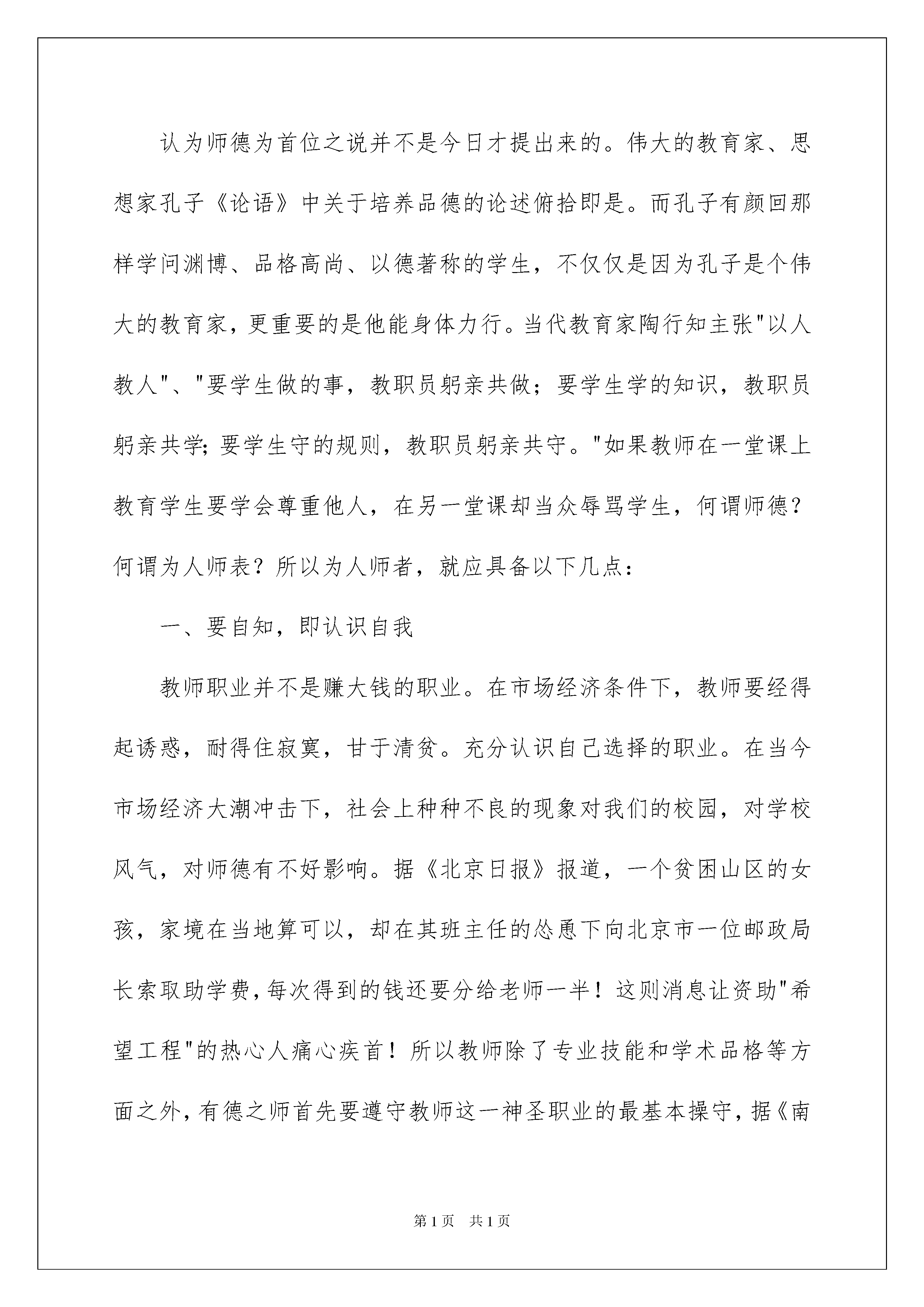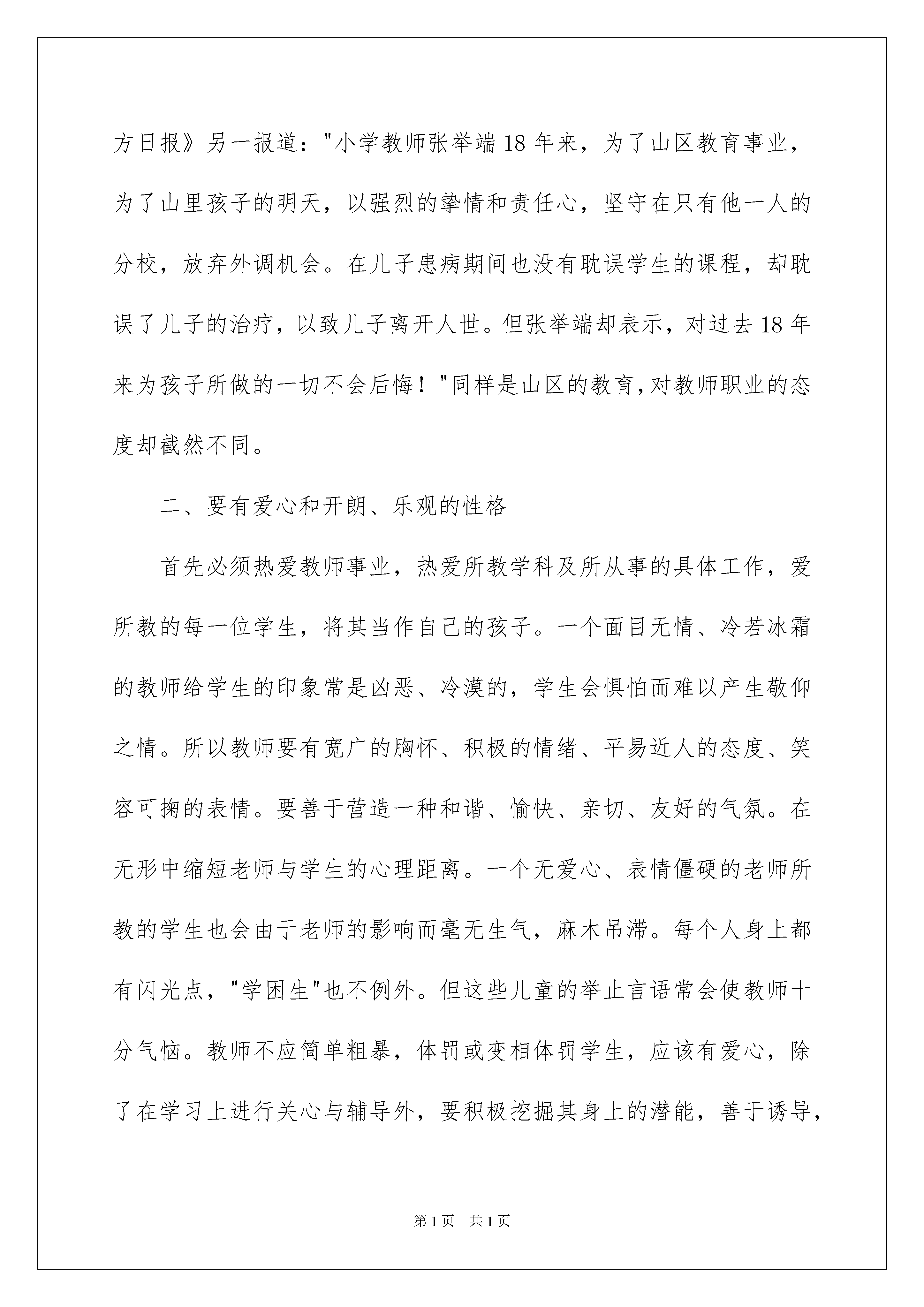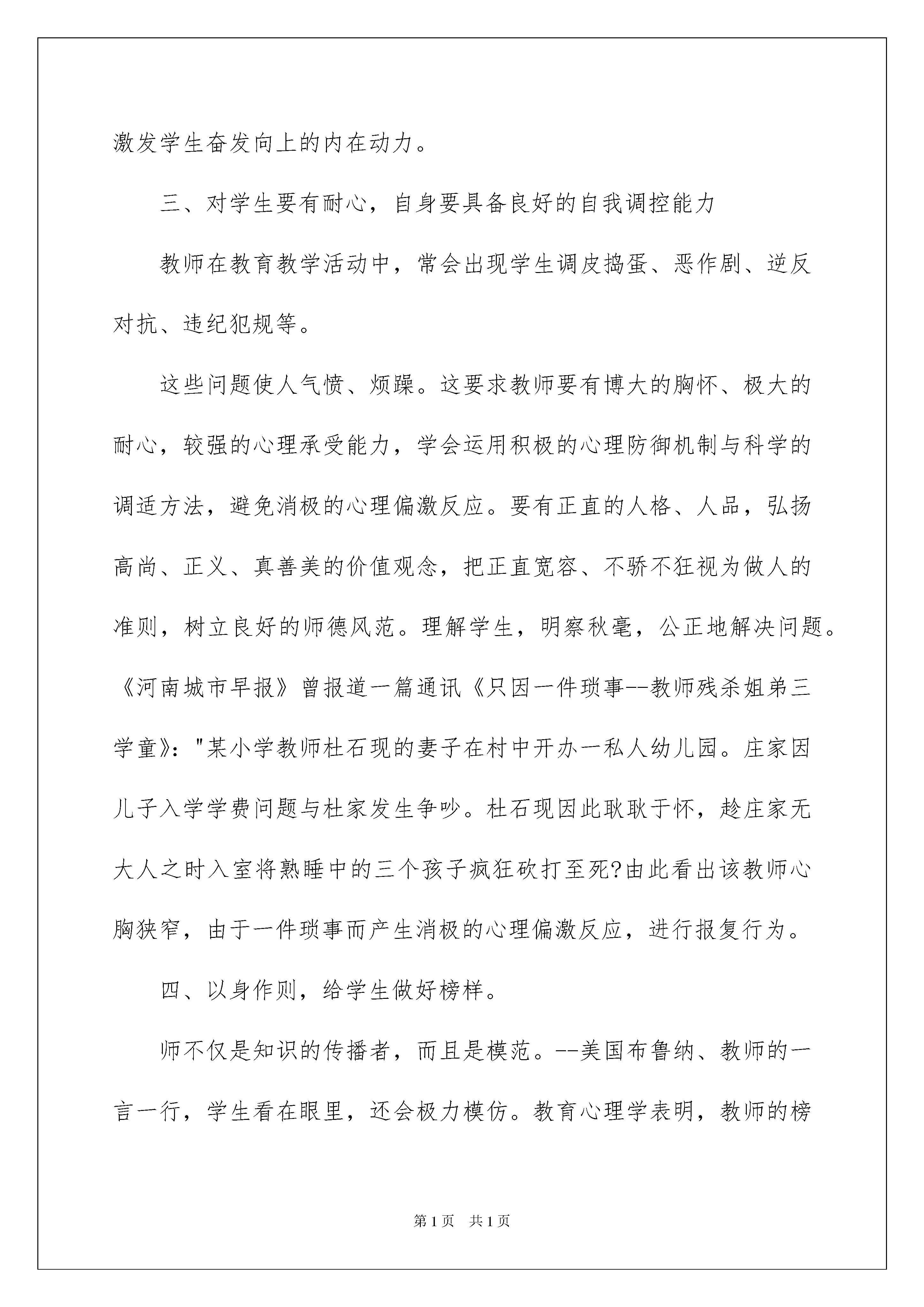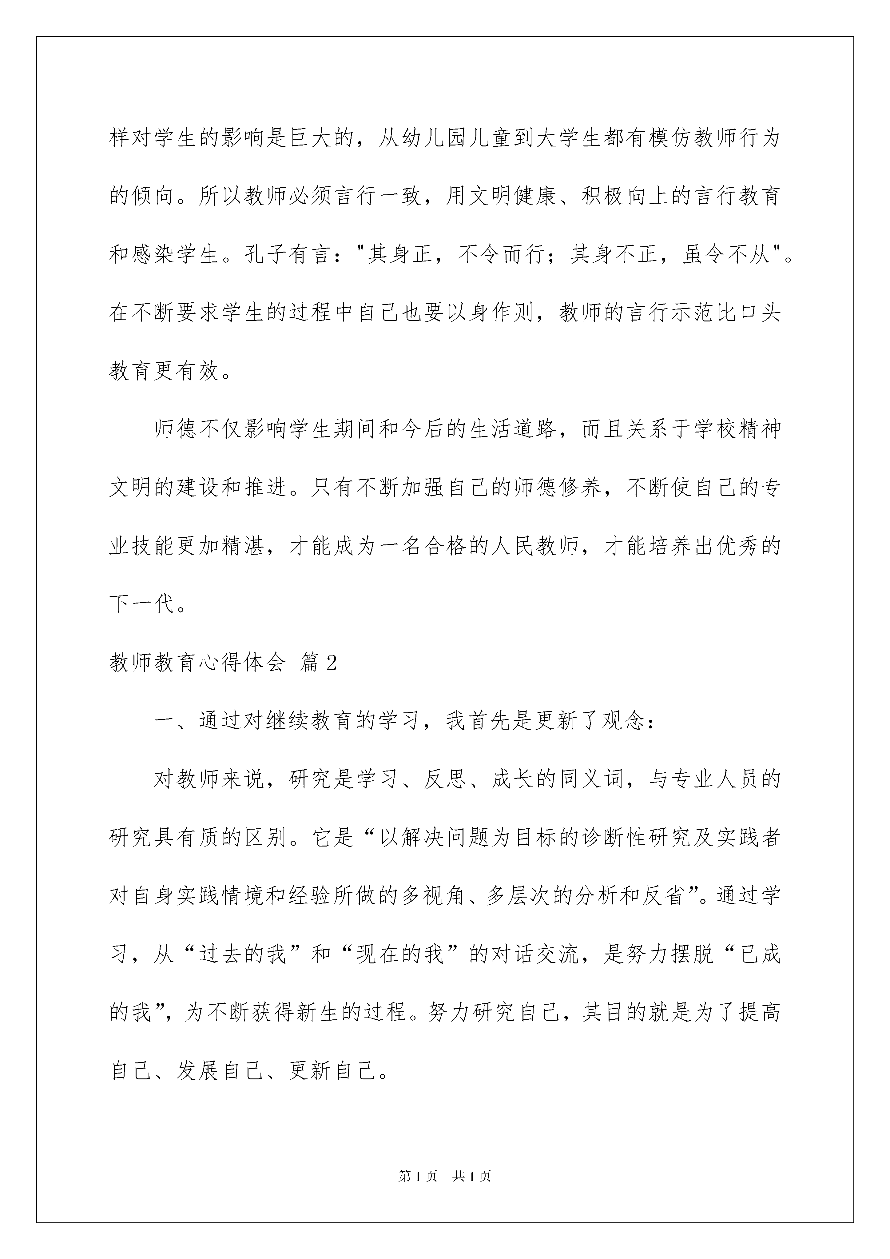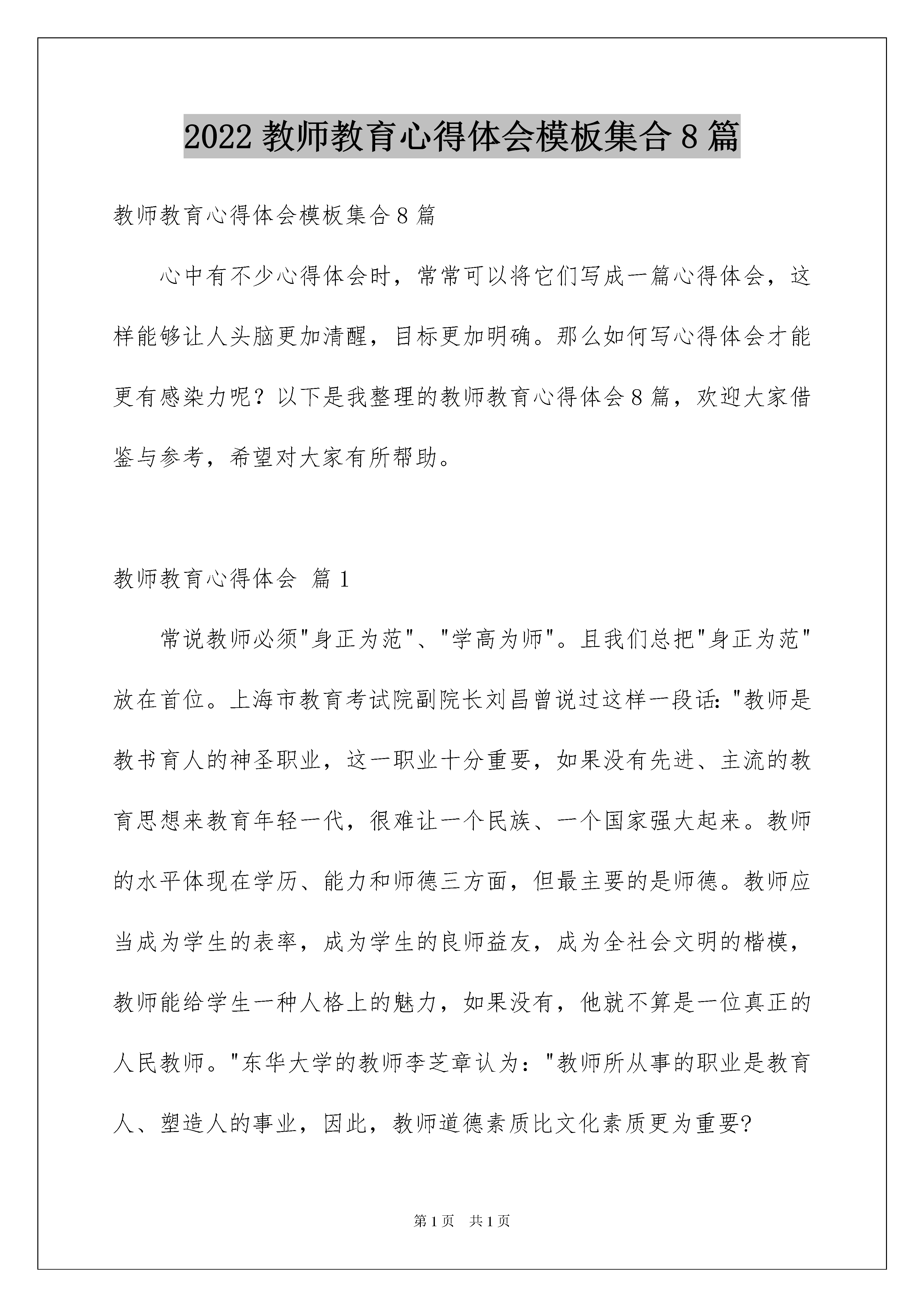 2022教师教育心得体会模板集合8篇教师教育心得体会模板集合8篇心中有不少心得体会时,常常可以将它们写成一篇心得体会,这样能够让人头脑更加清醒,目标更加明确。那么如何写心得体会才能更有感染力呢?以下是我整理的教师教育心得体会8篇,欢迎大家借鉴与参考,希望对大家有所帮助。教师教育心得体会篇1常说教师必须"身正为范"、"学高为师"。且我们总把"身正为范"放在首位。上海市教育考试院副院长刘昌曾说过这样一段话:"教师是教书育人的神圣职业,这一职业十分重要,如果没有先进、主流的教育思想来教育年轻一代,很难让一个民族、一个国家强大起来。教师的水平体现在学历、能力和师德三方面,但最主要的是师德。教师应当成为学生的表率,成为学生的良师益友,成为全社会文明的楷模,教师能给学生一种人格上的魅力,如果没有,他就不算是一位真正的人民教师。"东华大学的教师李芝章认为:"教师所从事的职业是教育人、塑造人的事业,因此,教师道德素质比文化素质更为重要?认为师德为首位之说并不是今日才提出来的。伟大的教育家、思想家孔子《论语》中关于培养品德的论述俯拾即是。而孔子有颜回那样学问渊博、品格高尚、以德著称的学生,不仅仅是因为孔子是个伟大的教育家,更重要的是他能身体力行。当代教育家陶行知主张"以人教人"、"要学生做的事,教职员躬亲共做;要学生学的知识,教职员躬亲共学;要学生守的规则,教职员躬亲共守。"如果教师在一堂课上教育学生要学会尊重他人,在另一堂课却当众辱骂学生,何谓师德?何谓为人师表?所以为人师者,就应具备以下几点:一、要自知,即认识自我教师职业并不是赚大钱的职业。在市场经济条件下,教师要经得起诱惑,耐得住寂寞,甘于清贫。充分认识自己选择的职业。在当今市场经济大潮冲击下,社会上种种不良的现象对我们的校园,对学校风气,对师德有不好影响。据《北京日报》报道,一个贫困山区的女孩,家境在当地算可以,却在其班主任的怂恿下向北京市一位邮政局长索取助学费,每次得到的钱还要分给老师一半!这则消息让资助"希望工程"的热心人痛心疾首!所以教师除了专业技能和学术品格等方面之外,有德之师首先要遵守教师这一神圣职业的最基本操守,据《南方日报》另一报道:"小学教师张举端18年来,为了山区教育事业,为了山里孩子的明天,以强烈的挚情和责任心,坚守在只有他一人的分校,放弃外调机会。在儿子患病期间也没有耽误学生的课程,却耽误了儿子的治疗,以致儿子离开人世。但张举端却表示,对过去18年来为孩子所做的一切不会后悔!"同样是山区的教育,对教师职业的态度却截然不同。二、要有爱心和开朗、乐观的性格首先必须热爱教师事业,热爱所教学科及所从事的具体工作,爱所教的每一位学生,将其当作自己的孩子。一个面目无情、冷若冰霜的教师给学生的印象常是凶恶、冷漠的,学生会惧怕而难以产生敬仰之情。所以教师要有宽广的胸怀、积极的情绪、平易近人的态度、笑容可掬的表情。要善于营造一种和谐、愉快、亲切、友好的气氛。在无形中缩短老师与学生的心理距离。一个无爱心、表情僵硬的老师所教的学生也会由于老师的影响而毫无生气,麻木吊滞。每个人身上都有闪光点,"学困生"也不例外。但这些儿童的举止言语常会使教师十分气恼。教师不应简单粗暴,体罚或变相体罚学生,应该有爱心,除了在学习上进行关心与辅导外,要积极挖掘其身上的潜能,善于诱导,激发学生奋发向上的内在动力。三、对学生要有耐心,自身要具备良好的自我调控能力教师在教育教学活动中,常会出现学生调皮捣蛋、恶作剧、逆反对抗、违纪犯规等。这些问题使人气愤、烦躁。这要求教师要有博大的胸怀、极大的耐心,较强的心理承受能力,学会运用积极的心理防御机制与科学的调适方法,避免消极的心理偏激反应。要有正直的人格、人品,弘扬高尚、正义、真善美的价值观念,把正直宽容、不骄不狂视为做人的准则,树立良好的师德风范。理解学生,明察秋毫,公正地解决问题。《河南城市早报》曾报道一篇通讯《只因一件琐事--教师残杀姐弟三学童》:"某小学教师杜石现的妻子在村中开办一私人幼儿园。庄家因儿子入学学费问题与杜家发生争吵。杜石现因此耿耿于怀,趁庄家无大人之时入室将熟睡中的三个孩子疯狂砍打至死?由此看出该教师心胸狭窄,由于一件琐事而产生消极的心理偏激反应,进行报复行为。四、以身作则,给学生做好榜样。师不仅是知识的传播者,而且是模范。--美国布鲁纳、教师的一言一行,学生看在眼里,还会极力模仿。教育心理学表明,教师的榜样对学生的影响是巨大的,从幼儿园儿童到大学生都有模仿教师行为的倾向。所以教师必须言行一致,用文明健康、积极向上的言行教育和感染学生。孔子有言:"其身正,不令而行;其身不正,虽令不从"。在不断