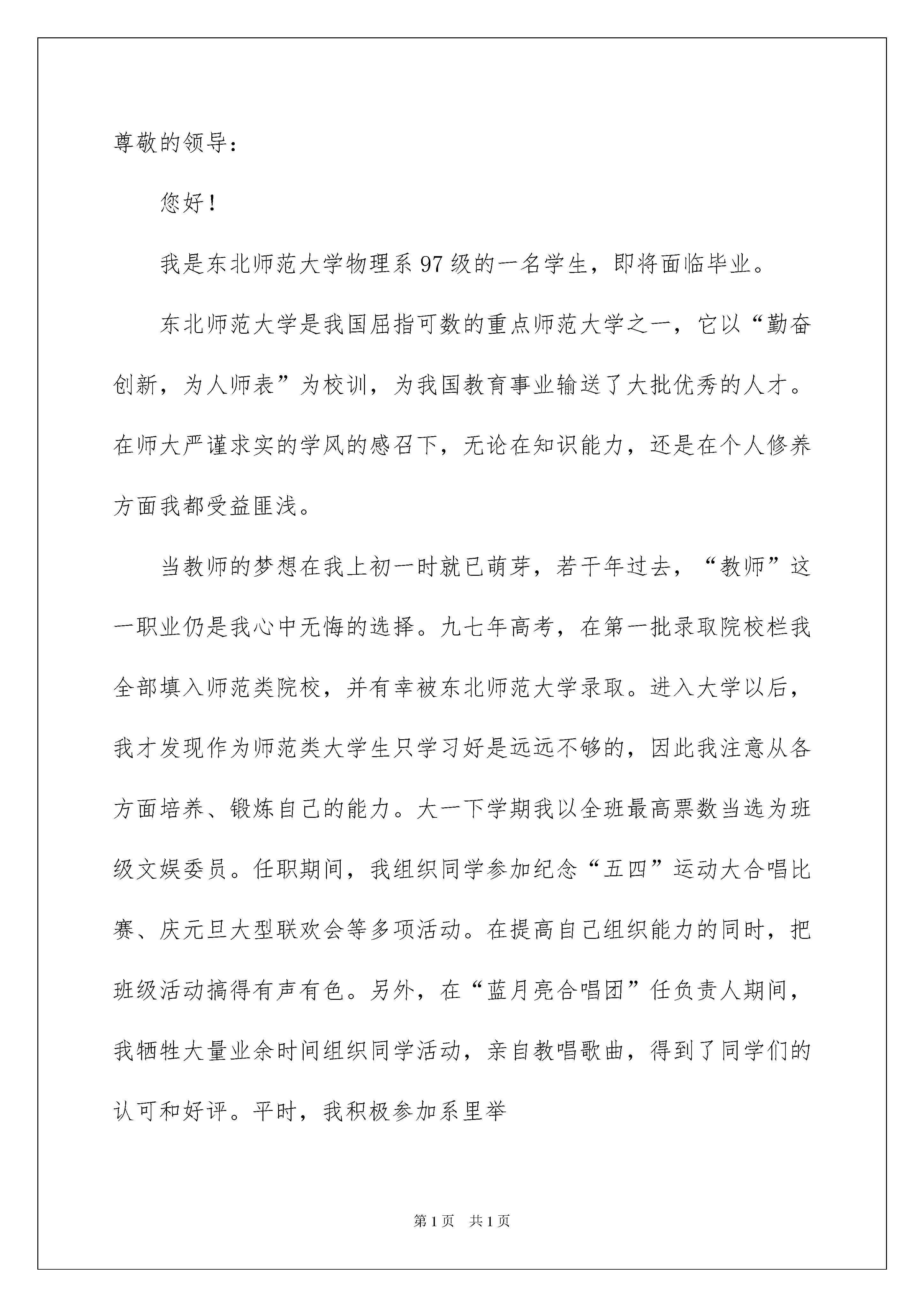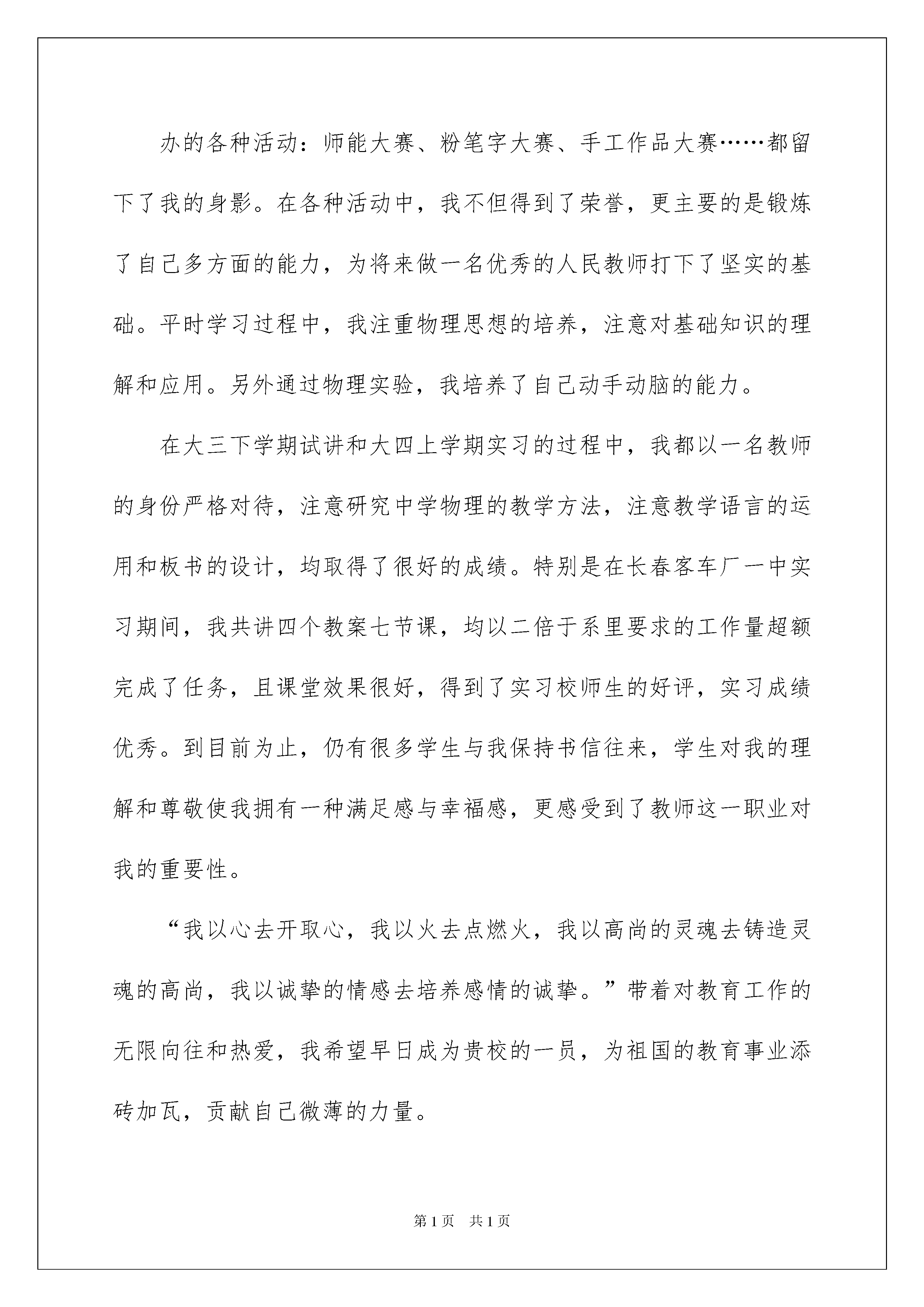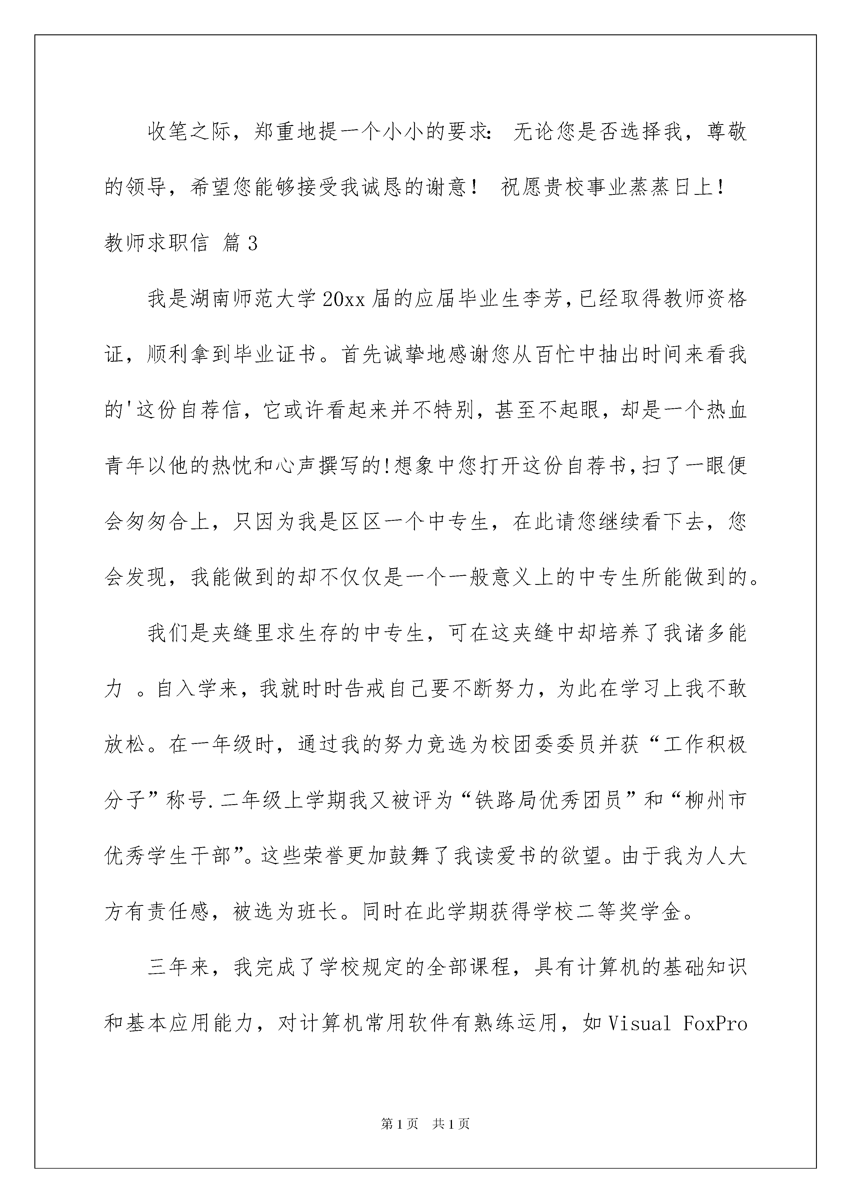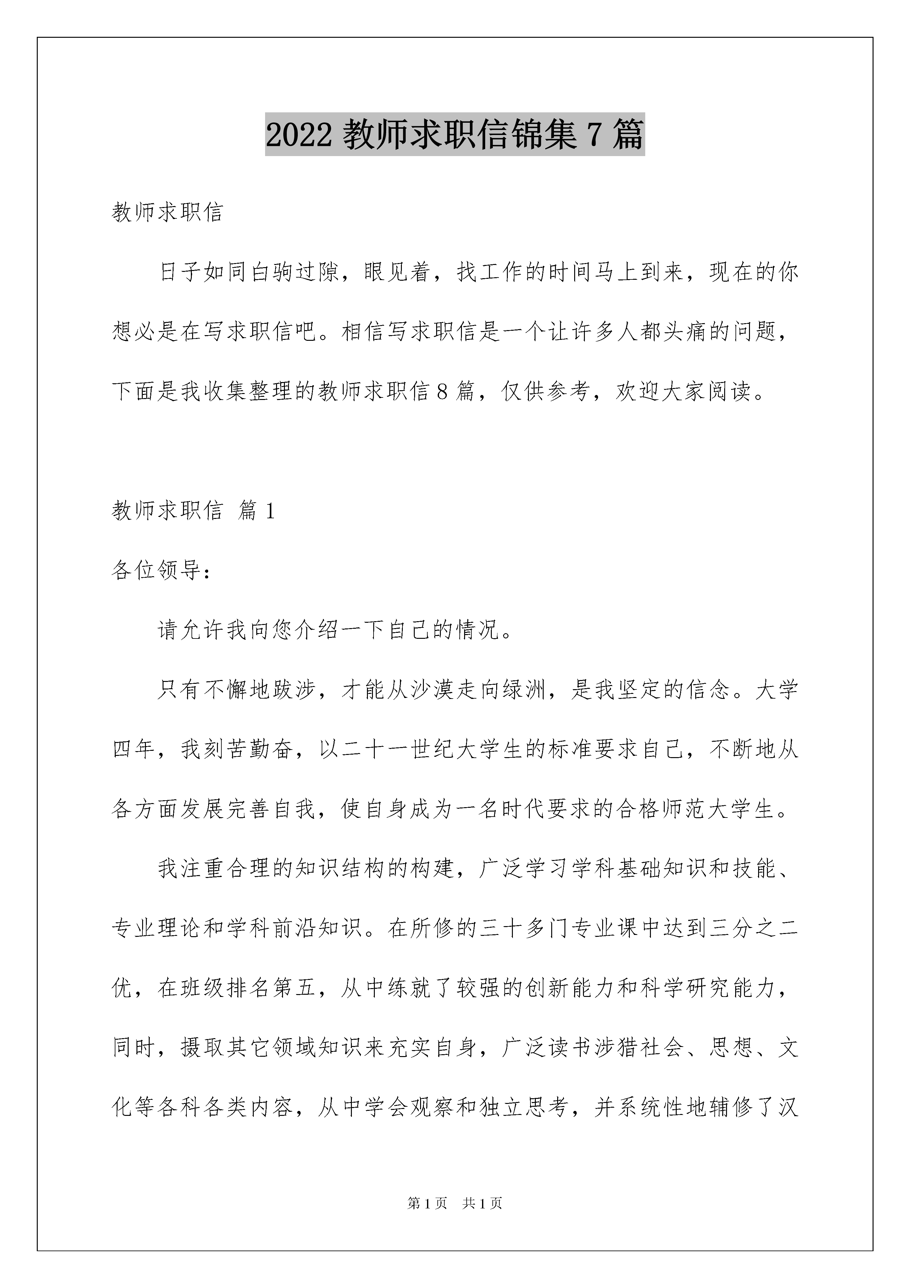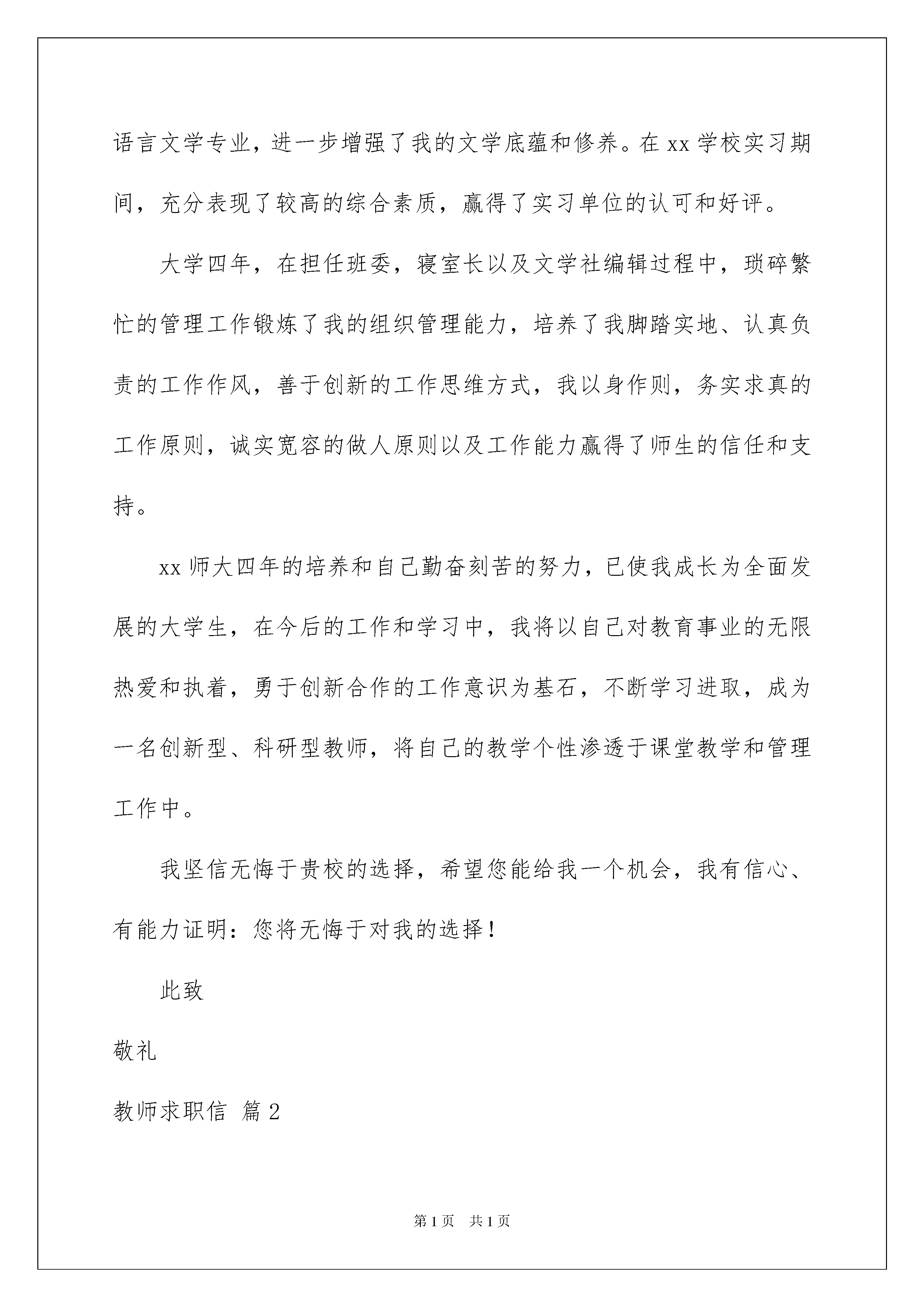 2022教师求职信锦集7篇教师求职信日子如同白驹过隙,眼见着,找工作的时间马上到来,现在的你想必是在写求职信吧。相信写求职信是一个让许多人都头痛的问题,下面是我收集整理的教师求职信8篇,仅供参考,欢迎大家阅读。教师求职信篇1各位领导:请允许我向您介绍一下自己的情况。只有不懈地跋涉,才能从沙漠走向绿洲,是我坚定的信念。大学四年,我刻苦勤奋,以二十一世纪大学生的标准要求自己,不断地从各方面发展完善自我,使自身成为一名时代要求的合格师范大学生。我注重合理的知识结构的构建,广泛学习学科基础知识和技能、专业理论和学科前沿知识。在所修的三十多门专业课中达到三分之二优,在班级排名第五,从中练就了较强的创新能力和科学研究能力,同时,摄取其它领域知识来充实自身,广泛读书涉猎社会、思想、文化等各科各类内容,从中学会观察和独立思考,并系统性地辅修了汉语言文学专业,进一步增强了我的文学底蕴和修养。在xx学校实习期间,充分表现了较高的综合素质,赢得了实习单位的认可和好评。大学四年,在担任班委,寝室长以及文学社编辑过程中,琐碎繁忙的管理工作锻炼了我的组织管理能力,培养了我脚踏实地、认真负责的工作作风,善于创新的工作思维方式,我以身作则,务实求真的工作原则,诚实宽容的做人原则以及工作能力赢得了师生的信任和支持。xx师大四年的培养和自己勤奋刻苦的努力,已使我成长为全面发展的大学生,在今后的工作和学习中,我将以自己对教育事业的无限热爱和执着,勇于创新合作的工作意识为基石,不断学习进取,成为一名创新型、科研型教师,将自己的教学个性渗透于课堂教学和管理工作中。我坚信无悔于贵校的选择,希望您能给我一个机会,我有信心、有能力证明:您将无悔于对我的选择!此致敬礼教师求职信篇2尊敬的领导:您好!我是东北师范大学物理系97级的一名学生,即将面临毕业。东北师范大学是我国屈指可数的重点师范大学之一,它以“勤奋创新,为人师表”为校训,为我国教育事业输送了大批优秀的人才。在师大严谨求实的学风的感召下,无论在知识能力,还是在个人修养方面我都受益匪浅。当教师的梦想在我上初一时就已萌芽,若干年过去,“教师”这一职业仍是我心中无悔的选择。九七年高考,在第一批录取院校栏我全部填入师范类院校,并有幸被东北师范大学录取。进入大学以后,我才发现作为师范类大学生只学习好是远远不够的,因此我注意从各方面培养、锻炼自己的能力。大一下学期我以全班最高票数当选为班级文娱委员。任职期间,我组织同学参加纪念“五四”运动大合唱比赛、庆元旦大型联欢会等多项活动。在提高自己组织能力的同时,把班级活动搞得有声有色。另外,在“蓝月亮合唱团”任负责人期间,我牺牲大量业余时间组织同学活动,亲自教唱歌曲,得到了同学们的认可和好评。平时,我积极参加系里举办的各种活动:师能大赛、粉笔字大赛、手工作品大赛……都留下了我的身影。在各种活动中,我不但得到了荣誉,更主要的是锻炼了自己多方面的能力,为将来做一名优秀的人民教师打下了坚实的基础。平时学习过程中,我注重物理思想的培养,注意对基础知识的理解和应用。另外通过物理实验,我培养了自己动手动脑的能力。在大三下学期试讲和大四上学期实习的过程中,我都以一名教师的身份严格对待,注意研究中学物理的教学方法,注意教学语言的运用和板书的设计,均取得了很好的成绩。特别是在长春客车厂一中实习期间,我共讲四个教案七节课,均以二倍于系里要求的工作量超额完成了任务,且课堂效果很好,得到了实习校师生的好评,实习成绩优秀。到目前为止,仍有很多学生与我保持书信往来,学生对我的理解和尊敬使我拥有一种满足感与幸福感,更感受到了教师这一职业对我的重要性。“我以心去开取心,我以火去点燃火,我以高尚的灵魂去铸造灵魂的高尚,我以诚挚的情感去培养感情的诚挚。”带着对教育工作的无限向往和热爱,我希望早日成为贵校的一员,为祖国的教育事业添砖加瓦,贡献自己微薄的力量。收笔之际,郑重地提一个小小的要求:无论您是否选择我,尊敬的领导,希望您能够接受我诚恳的谢意!祝愿贵校事业蒸蒸日上!教师求职信篇3我是湖南师范大学20xx届的应届毕业生李芳,已经取得教师资格证,顺利拿到毕业证书。首先诚挚地感谢您从百忙中抽出时间来看我的'这份自荐信,它或许看起来并不特别,甚至不起眼,却是一个热血青年以他的热忱和心声撰写的!想象中您打开这份自荐书,扫了一眼便会匆匆合上,只因为我是区区一个中专生,在此请您继续看下去,您会发现,我能做到的却不仅仅是一个一般意义上的中专生所能做到的。我们是夹缝里求生存的中专生,可在这夹缝中却培养了我诸多能力。自入学来,我就时时告戒自己要不断努力,为此在学习上我不敢放松。在一年级时