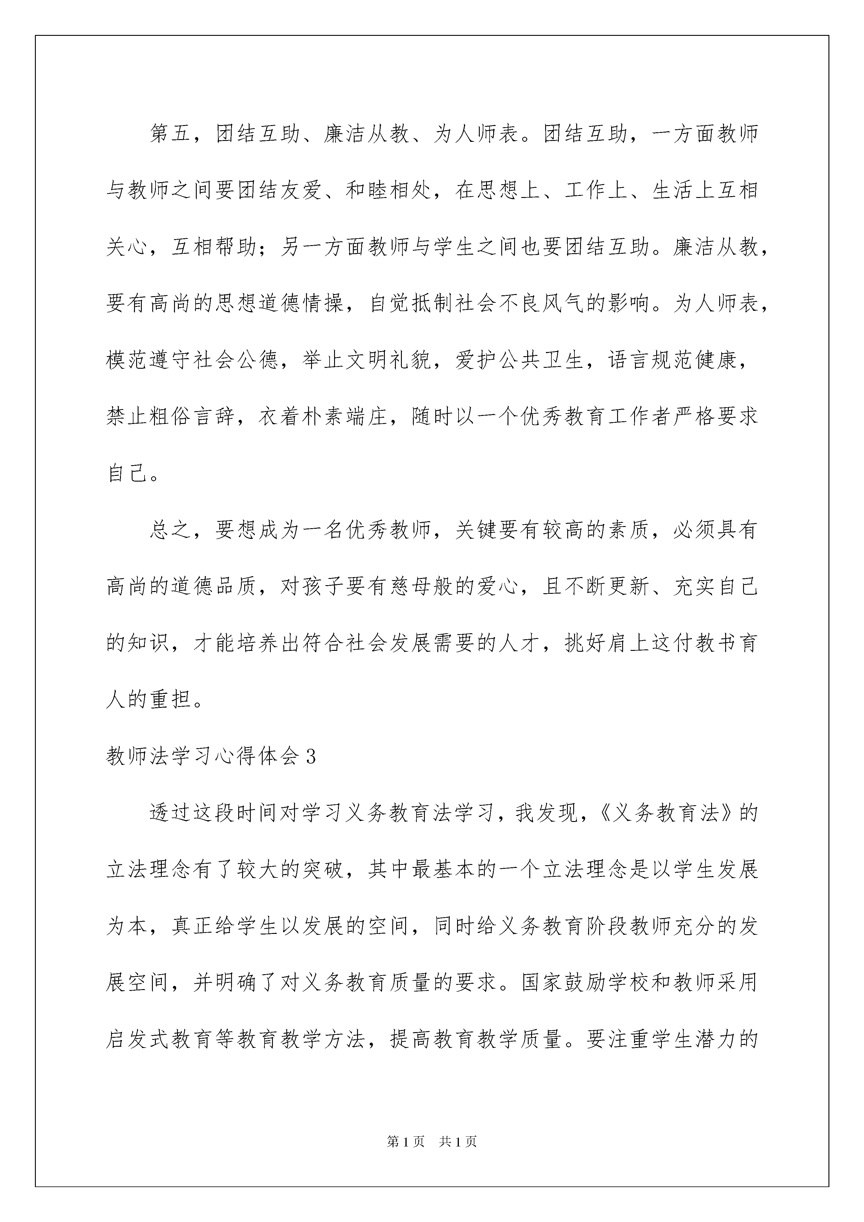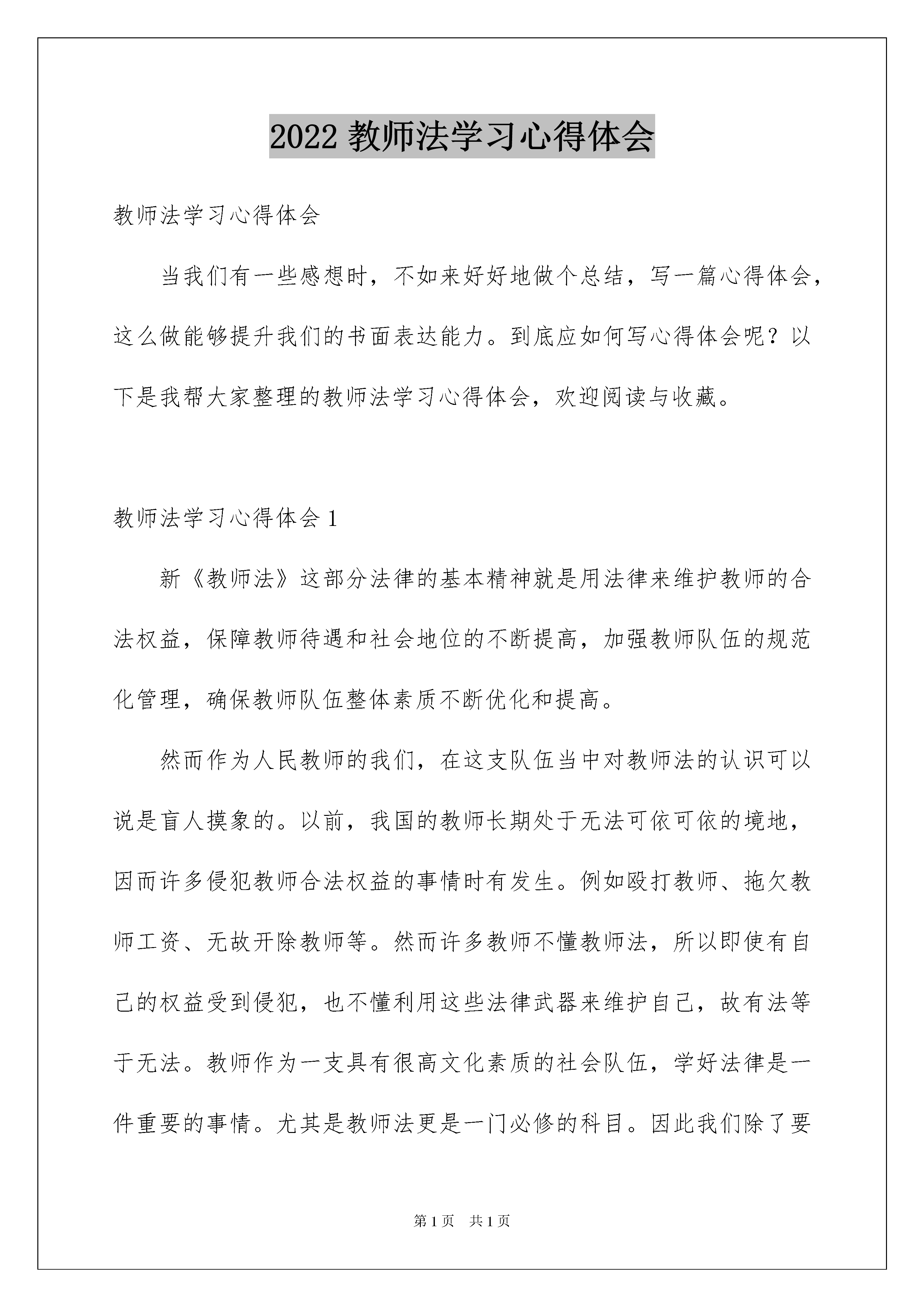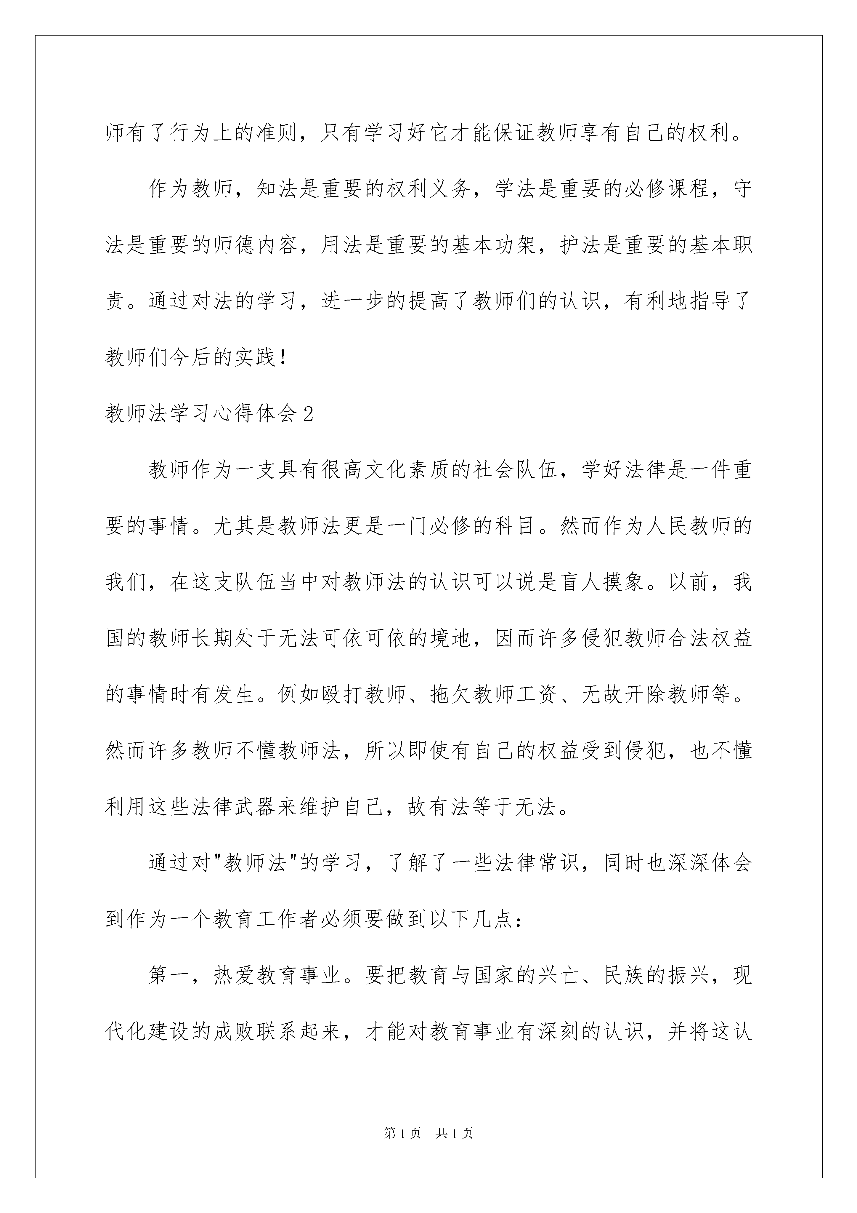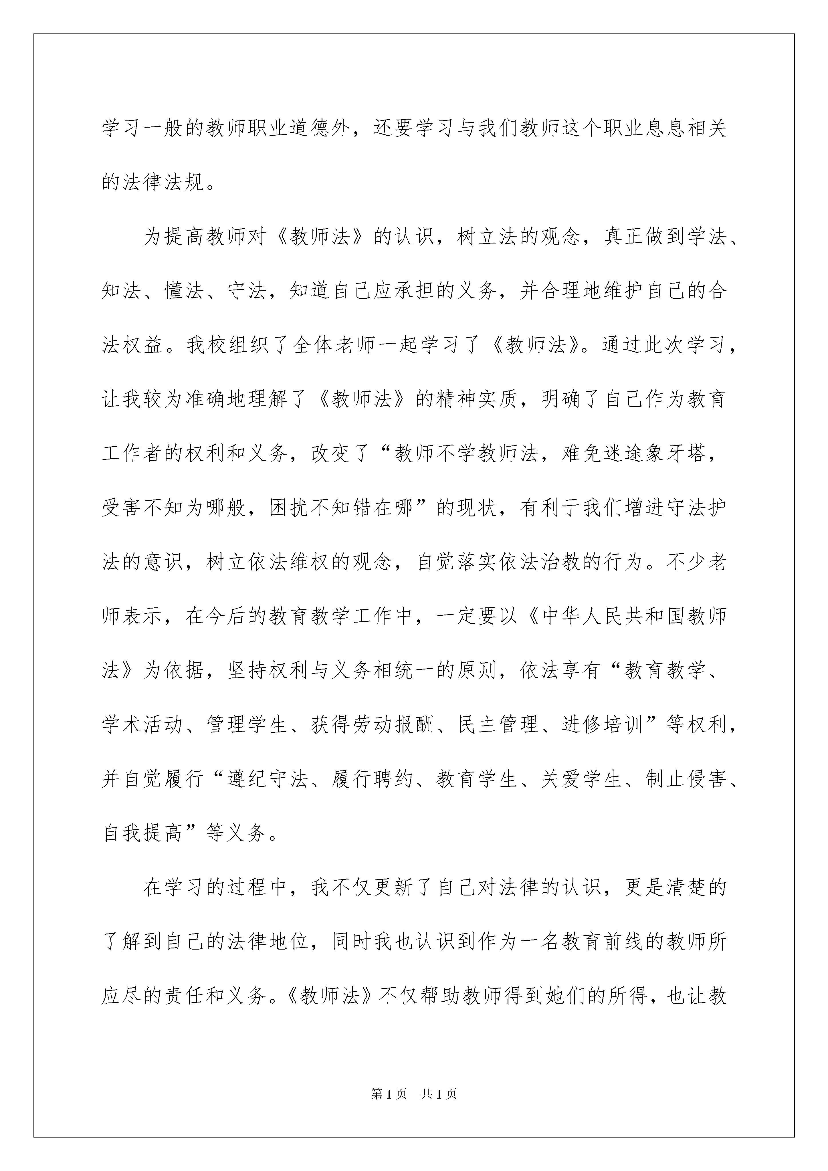 2022教师法学习心得体会教师法学习心得体会当我们有一些感想时,不如来好好地做个总结,写一篇心得体会,这么做能够提升我们的书面表达能力。到底应如何写心得体会呢?以下是我帮大家整理的教师法学习心得体会,欢迎阅读与收藏。教师法学习心得体会1新《教师法》这部分法律的基本精神就是用法律来维护教师的合法权益,保障教师待遇和社会地位的不断提高,加强教师队伍的规范化管理,确保教师队伍整体素质不断优化和提高。然而作为人民教师的我们,在这支队伍当中对教师法的认识可以说是盲人摸象的。以前,我国的教师长期处于无法可依可依的境地,因而许多侵犯教师合法权益的事情时有发生。例如殴打教师、拖欠教师工资、无故开除教师等。然而许多教师不懂教师法,所以即使有自己的权益受到侵犯,也不懂利用这些法律武器来维护自己,故有法等于无法。教师作为一支具有很高文化素质的社会队伍,学好法律是一件重要的事情。尤其是教师法更是一门必修的科目。因此我们除了要学习一般的教师职业道德外,还要学习与我们教师这个职业息息相关的法律法规。为提高教师对《教师法》的认识,树立法的观念,真正做到学法、知法、懂法、守法,知道自己应承担的义务,并合理地维护自己的合法权益。我校组织了全体老师一起学习了《教师法》。通过此次学习,让我较为准确地理解了《教师法》的精神实质,明确了自己作为教育工作者的权利和义务,改变了“教师不学教师法,难免迷途象牙塔,受害不知为哪般,困扰不知错在哪”的现状,有利于我们增进守法护法的意识,树立依法维权的观念,自觉落实依法治教的行为。不少老师表示,在今后的教育教学工作中,一定要以《中华人民共和国教师法》为依据,坚持权利与义务相统一的原则,依法享有“教育教学、学术活动、管理学生、获得劳动报酬、民主管理、进修培训”等权利,并自觉履行“遵纪守法、履行聘约、教育学生、关爱学生、制止侵害、自我提高”等义务。在学习的过程中,我不仅更新了自己对法律的认识,更是清楚的了解到自己的法律地位,同时我也认识到作为一名教育前线的教师所应尽的责任和义务。《教师法》不仅帮助教师得到她们的所得,也让教师有了行为上的准则,只有学习好它才能保证教师享有自己的权利。作为教师,知法是重要的权利义务,学法是重要的必修课程,守法是重要的师德内容,用法是重要的基本功架,护法是重要的基本职责。通过对法的学习,进一步的提高了教师们的认识,有利地指导了教师们今后的实践!教师法学习心得体会2教师作为一支具有很高文化素质的社会队伍,学好法律是一件重要的事情。尤其是教师法更是一门必修的科目。然而作为人民教师的我们,在这支队伍当中对教师法的认识可以说是盲人摸象。以前,我国的教师长期处于无法可依可依的境地,因而许多侵犯教师合法权益的事情时有发生。例如殴打教师、拖欠教师工资、无故开除教师等。然而许多教师不懂教师法,所以即使有自己的权益受到侵犯,也不懂利用这些法律武器来维护自己,故有法等于无法。通过对"教师法"的学习,了解了一些法律常识,同时也深深体会到作为一个教育工作者必须要做到以下几点:第一,热爱教育事业。要把教育与国家的兴亡、民族的振兴,现代化建设的成败联系起来,才能对教育事业有深刻的认识,并将这认识落实到日常的行动中,才能产生对教育事业的真爱,树立"一切为了孩子"的精神。第二,热爱学生。学生是祖国的未来,只有把学生教育培养好,振兴中华才有希望。关心爱护学生,尊重学生人格,平等、公正地对待他们,不侮辱、歧视,对他们一视同仁,不体罚和变相体罚。热爱学生,可激发他们的学习热情,使他们成为德、智、体、美、劳全面发展的社会主义新人。第三,不断提高自身素质和教育教学水平。要成为一名优秀教师,关键要有较高的素质。必须具备扎实的思想素质、业务素质、品德素质、心理素质、创新精神和能力素质。刻苦钻研业务,不断更新知识,努力学习和掌握现代教育技术,积极参与教育改革,认真总结经验,努力探索教育规律,改进教育教学方法,不断提高自己的教育教学和科研水平。第四,工作积极、认真负责。工作积极,就是要勇挑重提,埋头苦干,兢兢业业,一丝不苟,吃苦耐劳,为教育事业多做贡献。认真负责,根本的一条是对学生成长与成才负责,因此必须做到既教书又育人。第五,团结互助、廉洁从教、为人师表。团结互助,一方面教师与教师之间要团结友爱、和睦相处,在思想上、工作上、生活上互相关心,互相帮助;另一方面教师与学生之间也要团结互助。廉洁从教,要有高尚的思想道德情操,自觉抵制社会不良风气的影响。为人师表,模范遵守社会公德,举止文明礼貌,爱护公共卫生,语言规范健康,禁止粗俗言辞,衣着朴素端庄,随时以一个优秀教育工作者严格要求自己。总之,要想成为一名优