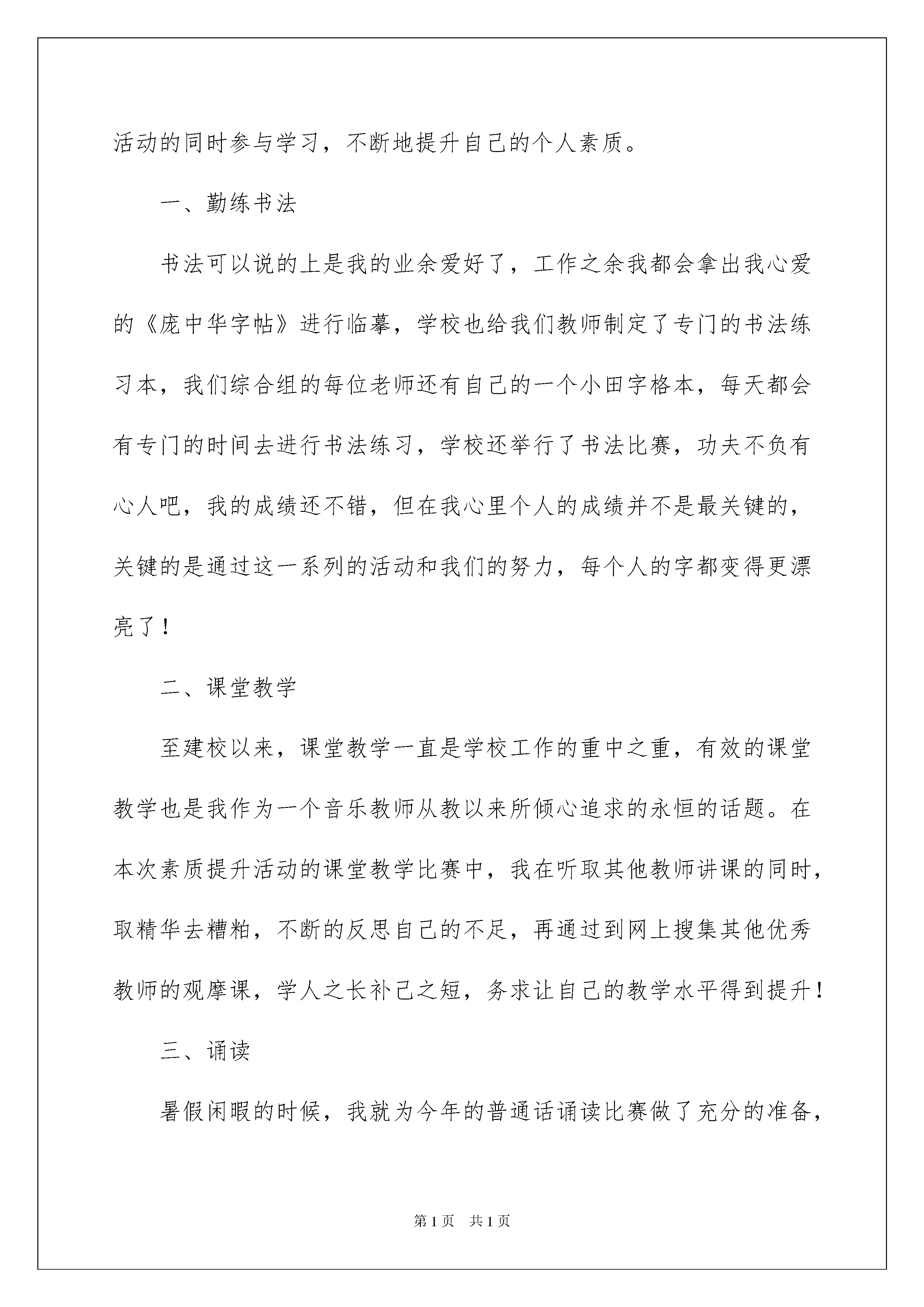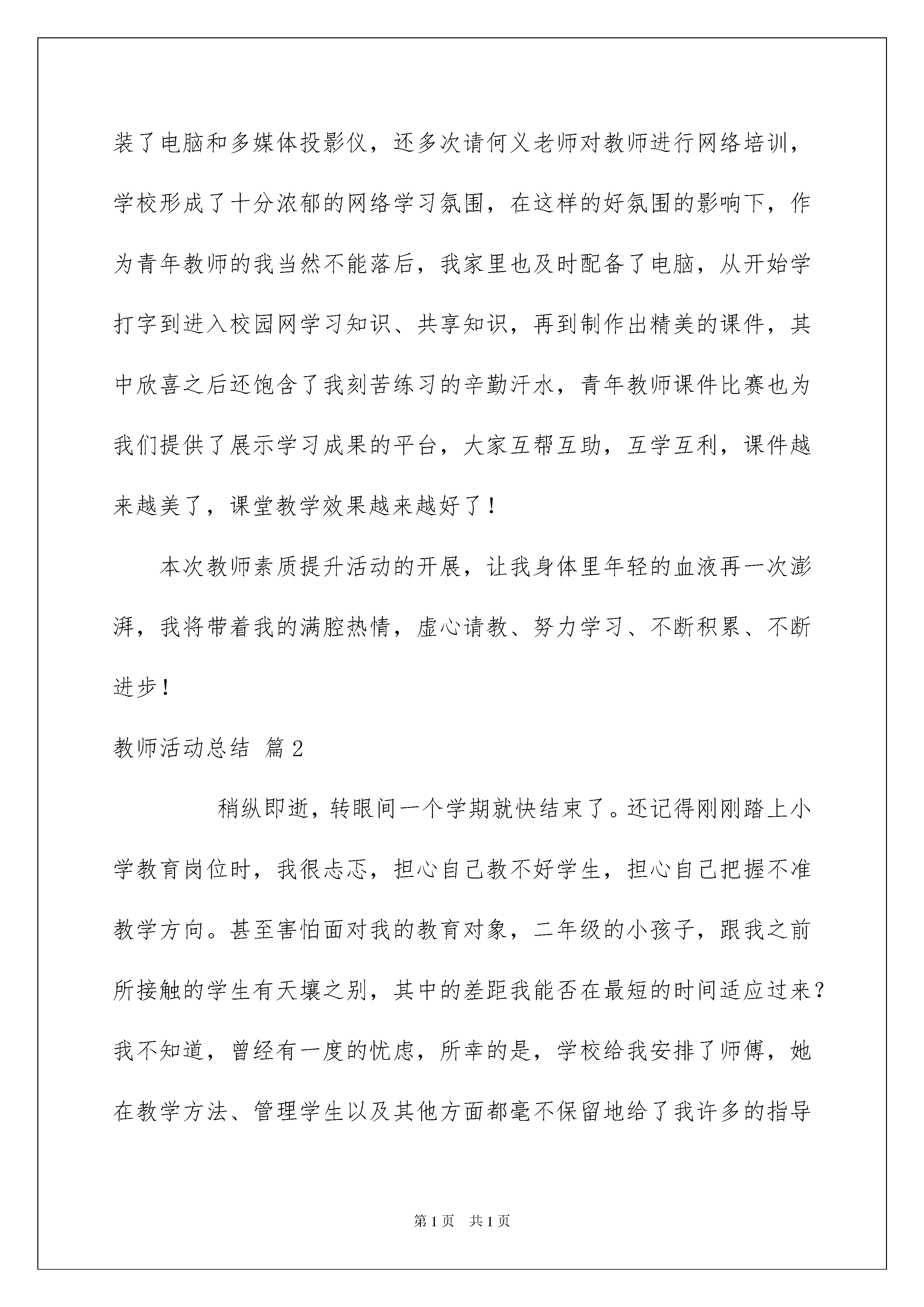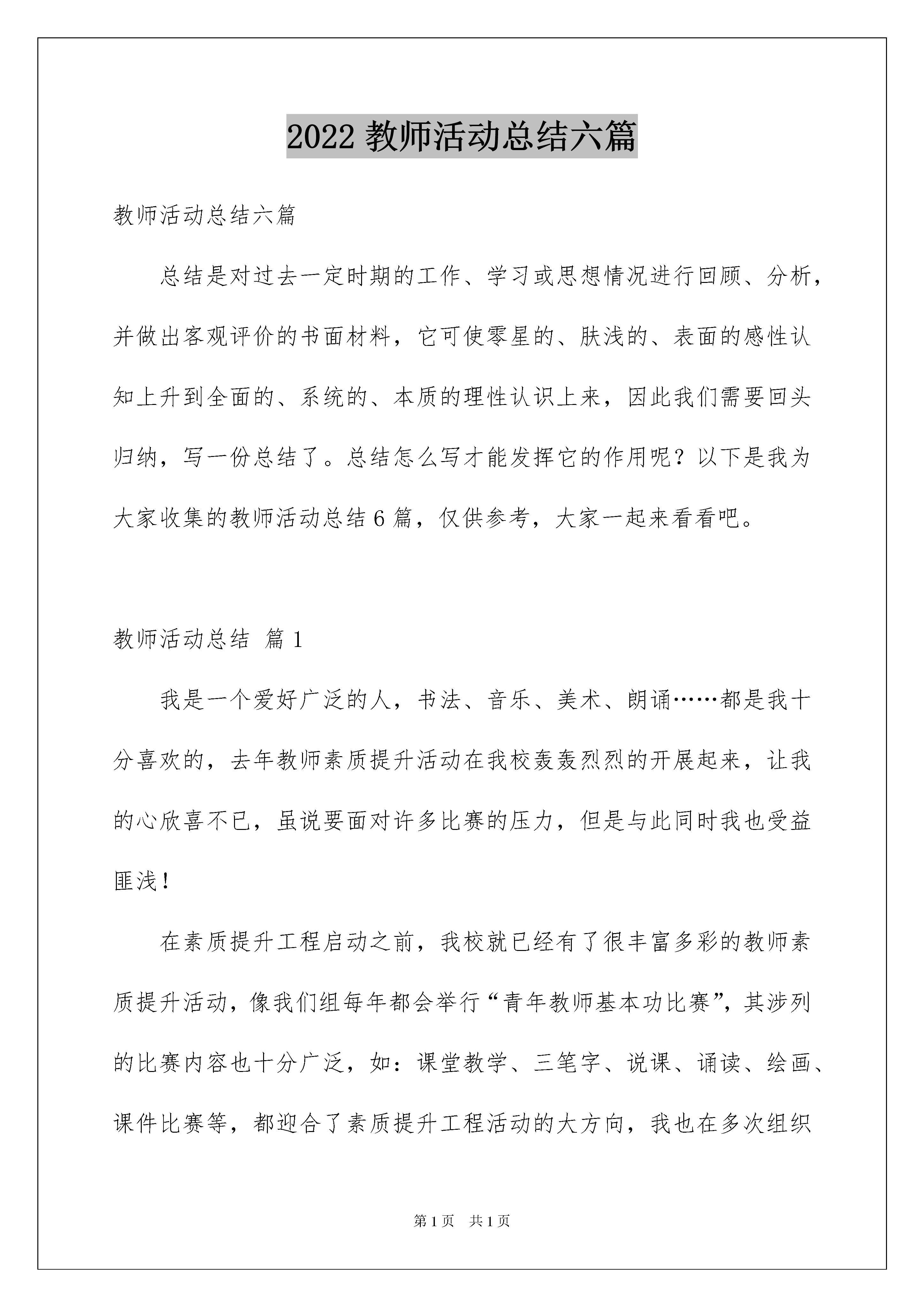 2022教师活动总结六篇教师活动总结六篇总结是对过去一定时期的工作、学习或思想情况进行回顾、分析,并做出客观评价的书面材料,它可使零星的、肤浅的、表面的感性认知上升到全面的、系统的、本质的理性认识上来,因此我们需要回头归纳,写一份总结了。总结怎么写才能发挥它的作用呢?以下是我为大家收集的教师活动总结6篇,仅供参考,大家一起来看看吧。教师活动总结篇1我是一个爱好广泛的人,书法、音乐、美术、朗诵……都是我十分喜欢的,去年教师素质提升活动在我校轰轰烈烈的开展起来,让我的心欣喜不已,虽说要面对许多比赛的压力,但是与此同时我也受益匪浅!在素质提升工程启动之前,我校就已经有了很丰富多彩的教师素质提升活动,像我们组每年都会举行“青年教师基本功比赛”,其涉列的比赛内容也十分广泛,如:课堂教学、三笔字、说课、诵读、绘画、课件比赛等,都迎合了素质提升工程活动的大方向,我也在多次组织活动的同时参与学习,不断地提升自己的个人素质。一、勤练书法书法可以说的上是我的业余爱好了,工作之余我都会拿出我心爱的《庞中华字帖》进行临摹,学校也给我们教师制定了专门的书法练习本,我们综合组的每位老师还有自己的一个小田字格本,每天都会有专门的时间去进行书法练习,学校还举行了书法比赛,功夫不负有心人吧,我的成绩还不错,但在我心里个人的成绩并不是最关键的,关键的是通过这一系列的活动和我们的努力,每个人的字都变得更漂亮了!二、课堂教学至建校以来,课堂教学一直是学校工作的重中之重,有效的课堂教学也是我作为一个音乐教师从教以来所倾心追求的永恒的话题。在本次素质提升活动的课堂教学比赛中,我在听取其他教师讲课的同时,取精华去糟粕,不断的反思自己的不足,再通过到网上搜集其他优秀教师的观摩课,学人之长补己之短,务求让自己的教学水平得到提升!三、诵读暑假闲暇的时候,我就为今年的普通话诵读比赛做了充分的准备,我打开家里的音响,下载了许多适合为诵读配乐的钢琴曲,除了诵读许多经典古诗词之外,还读了许多现代散文,其中一篇题为《妈妈呀我拿什么来报答你》的散文深深的感动了我,每每读起我都会为之落泪,心灵仿佛被什么触动了一般,静下心诵读一篇好文章,洗涤心灵的同时还增长了许多知识,更让自己的语言在课堂上生动起来,这样生动的教学就会触动学生的心灵。四、说课比赛说课就是让对课堂教学有准备的教师,根据教学大纲的要求,把自己上课的目标、方法、过程提前呈现的过程,通过说课,教师能找到更恰当的方法进行课堂教学,所以学校根据教师的需要开了多次全校教师会议对教师的说课进行专题培训,这对我的帮助是很大的,通过学习我明白了说课的重要意义和怎样说好一节课,我还参加了盖州市进修学校举办的音乐教师说课比赛,所谓“玉不磨不成器”,这对我来说是一次难得的磨练机会,虽说成绩还有待提升,但是通过比赛我也收获了很多,学到了很多。五、课件制作自多媒体进课堂以来,学校投入了大量资金为各班级和教研室安装了电脑和多媒体投影仪,还多次请何义老师对教师进行网络培训,学校形成了十分浓郁的网络学习氛围,在这样的好氛围的影响下,作为青年教师的我当然不能落后,我家里也及时配备了电脑,从开始学打字到进入校园网学习知识、共享知识,再到制作出精美的课件,其中欣喜之后还饱含了我刻苦练习的辛勤汗水,青年教师课件比赛也为我们提供了展示学习成果的平台,大家互帮互助,互学互利,课件越来越美了,课堂教学效果越来越好了!本次教师素质提升活动的开展,让我身体里年轻的血液再一次澎湃,我将带着我的满腔热情,虚心请教、努力学习、不断积累、不断进步!教师活动总结篇2稍纵即逝,转眼间一个学期就快结束了。还记得刚刚踏上小学教育岗位时,我很忐忑,担心自己教不好学生,担心自己把握不准教学方向。甚至害怕面对我的教育对象,二年级的小孩子,跟我之前所接触的学生有天壤之别,其中的差距我能否在最短的时间适应过来?我不知道,曾经有一度的忧虑,所幸的是,学校给我安排了师傅,她在教学方法、管理学生以及其他方面都毫不保留地给了我许多的指导和帮助,不断地鼓励我、指导我、帮助我,使我渐渐地成长起来。也让我从学期初的那种迷茫困惑中逐渐走出来,慢慢有序地开展教学工作。作为徒弟,我成为了师徒结对活动的一名受益者,也使我在教学道路上少走了很多弯路。这一学期以来,在领导的指示下,我们制订了详细的师徒结对子计划,坚持互相听课、评课。在平时的教学中,我做到认真备课,钻研教材,积极参与各种教研活动,遇到教学中的难点、重点、疑点,主动向师傅请教,师傅也总是能深入浅出地帮我梳理课文,提取重难点,使我豁然开朗。同时,她还很耐心地帮我修改教案中的不足,把握教学目标、认真审阅我的教学设计,