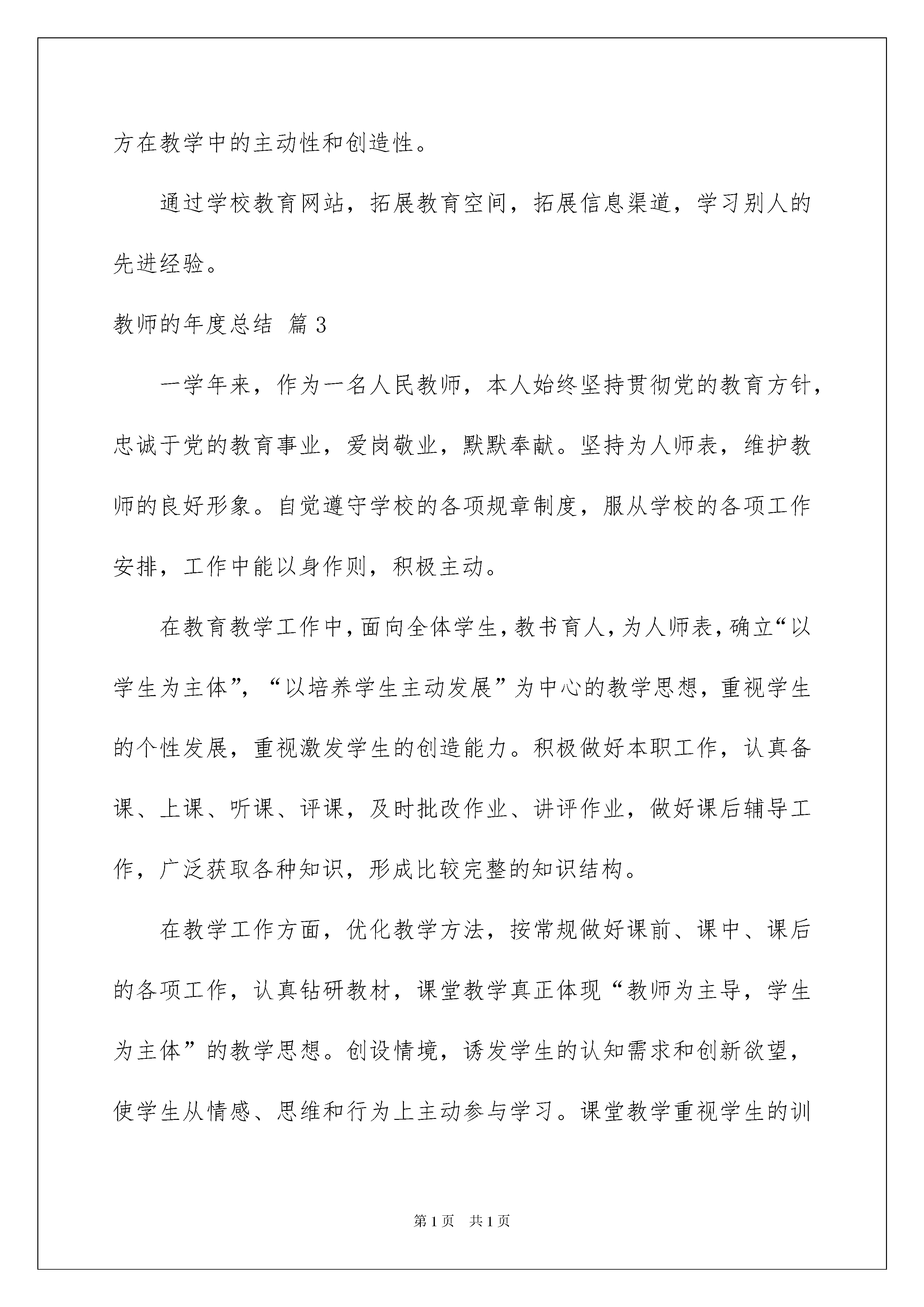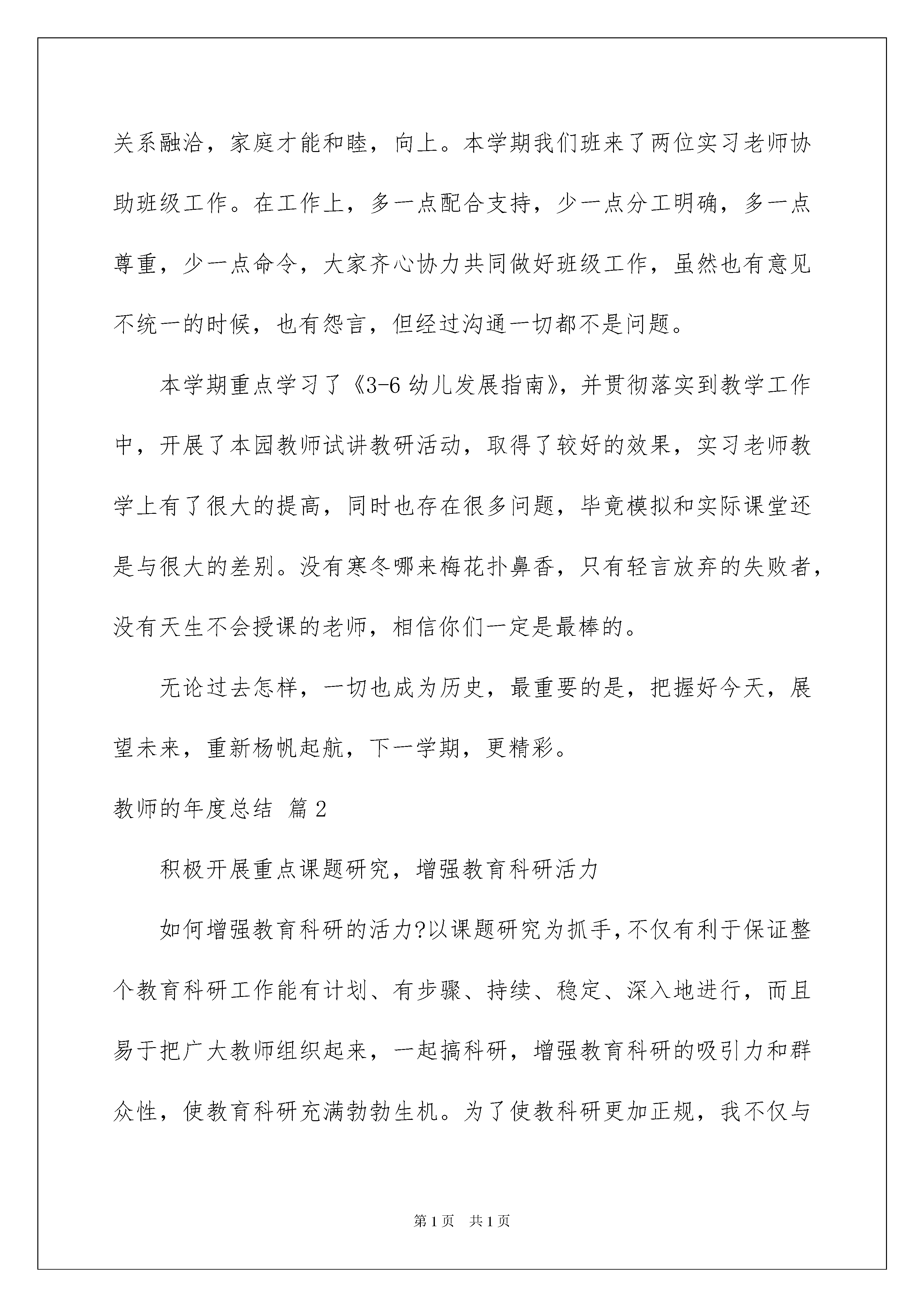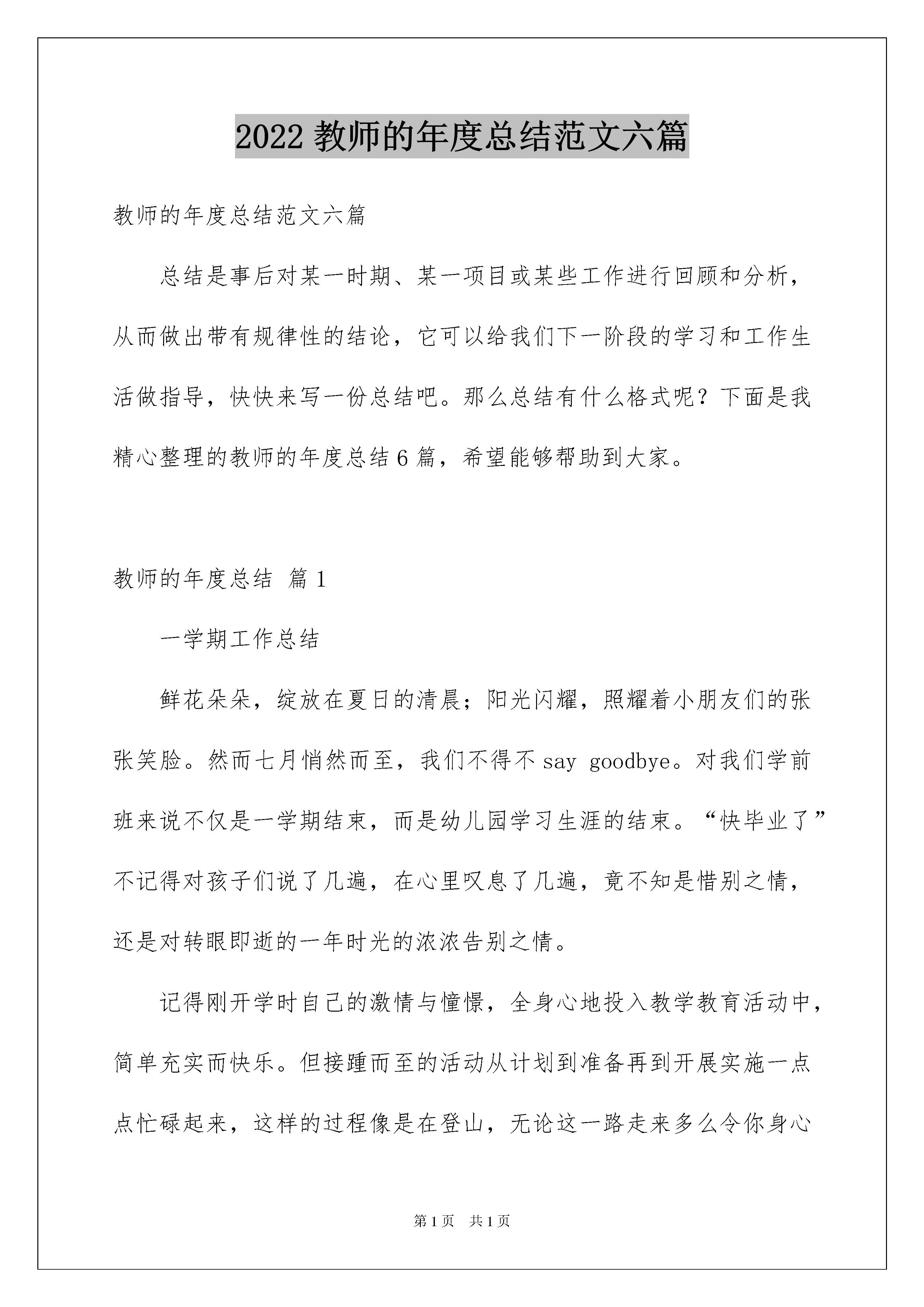 2022教师的年度总结范文六篇教师的年度总结范文六篇总结是事后对某一时期、某一项目或某些工作进行回顾和分析,从而做出带有规律性的结论,它可以给我们下一阶段的学习和工作生活做指导,快快来写一份总结吧。那么总结有什么格式呢?下面是我精心整理的教师的年度总结6篇,希望能够帮助到大家。教师的年度总结篇1一学期工作总结鲜花朵朵,绽放在夏日的清晨;阳光闪耀,照耀着小朋友们的张张笑脸。然而七月悄然而至,我们不得不saygoodbye。对我们学前班来说不仅是一学期结束,而是幼儿园学习生涯的结束。“快毕业了”不记得对孩子们说了几遍,在心里叹息了几遍,竟不知是惜别之情,还是对转眼即逝的一年时光的浓浓告别之情。记得刚开学时自己的激情与憧憬,全身心地投入教学教育活动中,简单充实而快乐。但接踵而至的活动从计划到准备再到开展实施一点点忙碌起来,这样的过程像是在登山,无论这一路走来多么令你身心俱疲,爬到山顶时的心情总是万般皆好。本学期,开学典礼,幼小衔接家长会,六一文艺汇演,期末教学展示,毕业典礼,再加上各种教研活动,让家长从各方面了解孩子在园情况,认可我们的工作。本学期由于更换教材,而且是一学年的下学期才更换的,在教学上不能很好的衔接,特别是数学,知识点有重复,课程编排较多元,延伸知识点较多,一学期下来书上的是全部教学完,但延伸的一些还不够深入和全面。毕竟是第一次接触,在以后的教学中一定会总结经验。一分耕耘,一分收获,加油,下次一定更好。这学期是小朋友在幼儿园的最后一个学期,九月份就要上小学了,幼小衔接是本学期的重点,我们在知识方面,语言:加大小朋友识字量,说词,说句的口语表达能力,拼音:加强认读和拼读练习,数学:训练计算能力,以及口编应用题的能力,能按一定顺序看图提问,回答问题的能力。在学习习惯方面,培养独立学习,自己整理书包,学会自己排作业。同时成立班委,体验小学生活,激发对小学生生活的憧憬和向往。为上小学提前做好准备。一个班级就是一个“大家庭”,老师就是“家长”,只有“家长”关系融洽,家庭才能和睦,向上。本学期我们班来了两位实习老师协助班级工作。在工作上,多一点配合支持,少一点分工明确,多一点尊重,少一点命令,大家齐心协力共同做好班级工作,虽然也有意见不统一的时候,也有怨言,但经过沟通一切都不是问题。本学期重点学习了《3-6幼儿发展指南》,并贯彻落实到教学工作中,开展了本园教师试讲教研活动,取得了较好的效果,实习老师教学上有了很大的提高,同时也存在很多问题,毕竟模拟和实际课堂还是与很大的差别。没有寒冬哪来梅花扑鼻香,只有轻言放弃的失败者,没有天生不会授课的老师,相信你们一定是最棒的。无论过去怎样,一切也成为历史,最重要的是,把握好今天,展望未来,重新杨帆起航,下一学期,更精彩。教师的年度总结篇2积极开展重点课题研究,增强教育科研活力如何增强教育科研的活力?以课题研究为抓手,不仅有利于保证整个教育科研工作能有计划、有步骤、持续、稳定、深入地进行,而且易于把广大教师组织起来,一起搞科研,增强教育科研的吸引力和群众性,使教育科研充满勃勃生机。为了使教科研更加正规,我不仅与本校教师互相沟通,还积极参加学校的教科研交流会,认真听取教师的经验总结,取长补短。我致力于课题研究的过程管理,而不仅仅把精力放在“播种”与“收获”上。课题在期初都必须有学期研究计划,在期中有课题研究活动,在期末有学期研究小结。这样,几个研究课题都能在每学期有量的积累,从而为最后质的飞跃即课题研究的结题工作打下良好的基础。在课题研究过程中。我吸取别人先进的科研经验,大胆探索,积累经验,提高科研能力。教师学历是教师文化素养、业务能力的一个标志。为了更好的进行教育科研工作,提高自身业务水平,本人积极参加进修。除此以外,我还继续进行信息技术培训,努力提高自身的专业化进程。严格抓好课堂教学研究,夯实教育科研基础课堂教学是教育科研的主阵地,我将继续深化课堂教学改革活动,形成重视课堂,研究课堂的热潮。认真学习“标准”,找准“标准”认真学习《全日制义务教育课程标准》(实验稿),做到心中有标准,心中有学生,创造性地理解和使用教材,积极开发课程资源,灵活运用多种教学策略,引导学生在实践中学会学习,充分发挥师生双方在教学中的主动性和创造性。通过学校教育网站,拓展教育空间,拓展信息渠道,学习别人的先进经验。教师的年度总结篇3一学年来,作为一名人民教师,本人始终坚持贯彻党的教育方针,忠诚于党的教育事业,爱岗敬业,默默奉献。坚持为人师表,维护教师的良好形象。自觉遵守学校的各项规章制度,服从学校的各项工作安排,工作中能以身作则,积极主动。在教育教学工作中,面向全