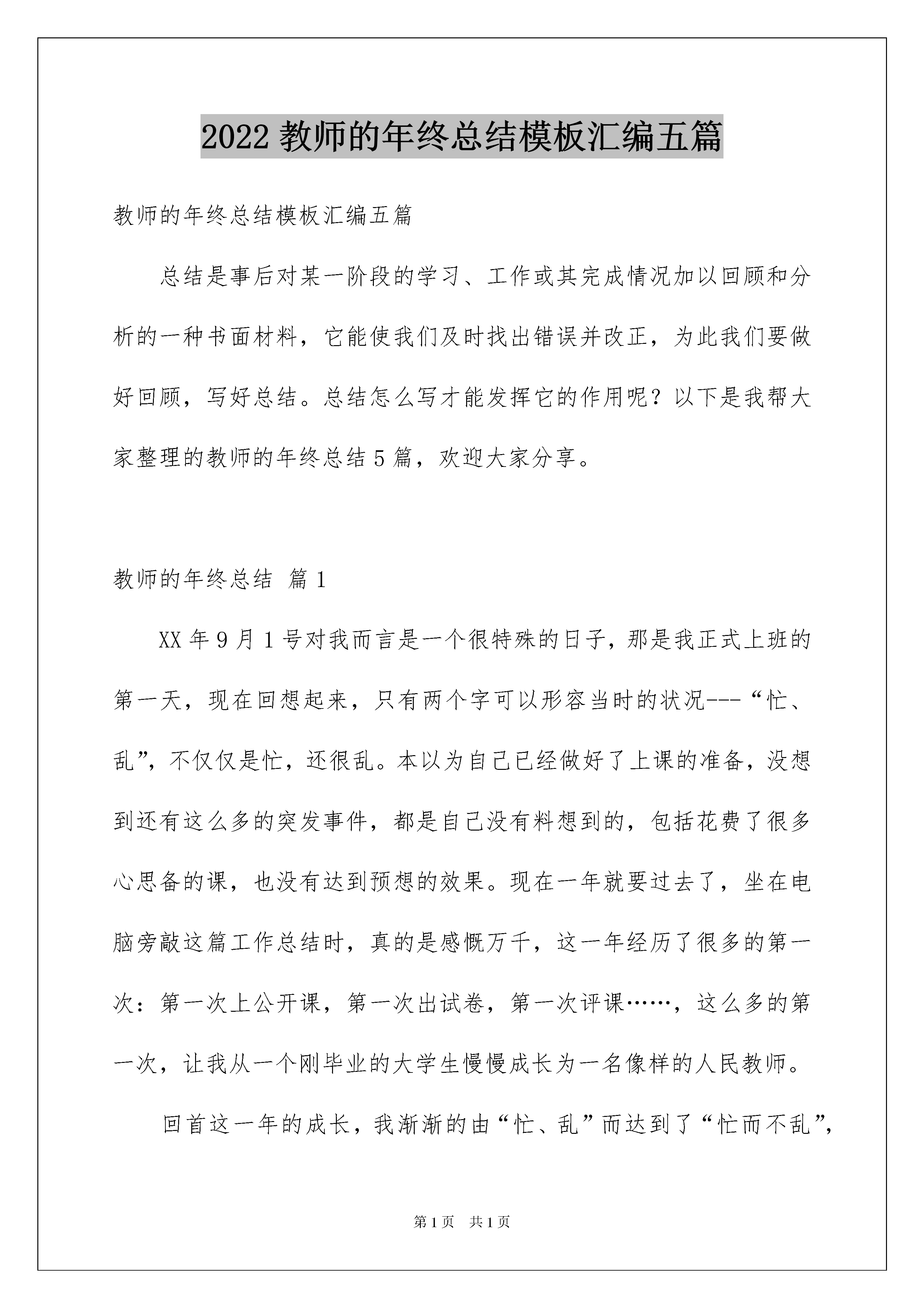 2022教师的年终总结模板汇编五篇教师的年终总结模板汇编五篇总结是事后对某一阶段的学习、工作或其完成情况加以回顾和分析的一种书面材料,它能使我们及时找出错误并改正,为此我们要做好回顾,写好总结。总结怎么写才能发挥它的作用呢?以下是我帮大家整理的教师的年终总结5篇,欢迎大家分享。教师的年终总结篇1XX年9月1号对我而言是一个很特殊的日子,那是我正式上班的第一天,现在回想起来,只有两个字可以形容当时的状况---“忙、乱”,不仅仅是忙,还很乱。本以为自己已经做好了上课的准备,没想到还有这么多的突发事件,都是自己没有料想到的,包括花费了很多心思备的课,也没有达到预想的效果。现在一年就要过去了,坐在电脑旁敲这篇工作总结时,真的是感慨万千,这一年经历了很多的第一次:第一次上公开课,第一次出试卷,第一次评课……,这么多的第一次,让我从一个刚毕业的大学生慢慢成长为一名像样的人民教师。回首这一年的成长,我渐渐的由“忙、乱”而达到了“忙而不乱”,下面,我从几个方面汇报一下这一年来我的成长------一、教学工作方面1、认真备课要想上好课,必须先备好课,刚一开始,我没有掌握好备课的方法,花费时间很多,却达不到想要的效果。这时我虚心向师父请教,从教学环节到提问技巧,从重难点的把握到作业的分析,我在探索中成长,在失败中收获,逐渐掌握了备课的方法,力图用最少的时间达到最好的效果,一步步提高了上课的效率。我的教案书写详细,反思及时,在学校常态检查中,受到了教研组长的好评。2、投入上课一堂成功的课要让学生学得容易,学得轻松,学得愉快。为了提高课堂效率,我仔细研究教辅材料,不漏掉任何一个知识点,不懂的问题向同年级有丰富经验的顾老师请教。我大胆的在课堂上尝试各种新的教法,比如编题、随堂批阅、课堂讨论等。在每一堂课上我都充分考虑每一个层次的学生学习需求和学习能力,让各个层次的学生都得到提高。现在学生普遍反映喜欢上数学课,就连以前极讨厌数学的学生都乐于上课了。3、辛勤辅优补差为了不使班级出现两极分化,我利用课余时间对学生进行辅导,效果很好。我几乎每天6:20到校,抓住早课前的这一段时间对及格临界和优秀临界的学生进行专门的辅导,以提高班级的及格率和优秀率。我因为住在学校附近,每天放学后,我也会对个别学生进行辅导,晚上我在办公室批改作业,对一天的工作进行总结,要忙到近21:00才回宿舍。由于我教学经验的逐步积累,对学生辅导力度的加大,终于将学生的成绩逐步提高了上来。有几位学生进校成绩不及格,现在基本上能考近七十分。通过一个学期的工作,我认识到,作为一个没有经验的新老师,想要把课上好,把教学搞好,把学生的成绩搞上去,就必须付出更多的劳动,花更多的时间。5、及时反思我每上完一节课就会写一节反思,因为我知道任何一个教师,不论其教学能力起点如何,都有必要通过多种途径对自己的教学进行反思。随时把所思所想给写下来,把工作中的点滴变成文字成为一种习惯。一个经常地并自觉地对自己教学进行反思的教师,就有可能发现许多教学中的问题,越是发现问题,就越是有强烈的愿望想去解决这些问题。关注问题并去解决问题的过程,也就是教师树立自己的科研意识,并潜心参与教学研究的过程。反思是教师进步的最好的途径,我在反思中得到了成长。6、优异的学生成绩老师教得好不好,学生的成绩最能说明问题。任教近一年来,我所教的六、六两个班在区统考与镇统考中都取得了优异的成绩。第一学期期中与期末都是镇统考,六年级数学平均分两次位列镇第一名,其中我任教的六班两次优秀率都是年级第一名;第二学期期中考试是区统考,六年级数学的平均分与合格率都是乡镇学校第一名,我的两个班全部超过镇平均分和区平均分。二、班级管理方面1、班级多次获奖这一学年,我辅助莫海华老师任教六班的见习班主任,充分的参与到班级管理中来。从给学生排座位,到秋游和春游,再到家校联系,我的班主任工作能力得到了极大的锻炼。经过师生的共同努力,六班取得了很大的成就----①“奉贤区优秀小队”(区级)②“XX年秋季运动会”获第三名(校级);③“科技周”获第三名;……现在的六班出现了良好的发展势头,在区统考第二学期期中考试中,六班有四名同学进入年级前十,占到了全年级的40%,本学年得过两次“卫生流动红旗”。我想将来真正的给我一个班,我也能将它带好。2、成功开设班队课六班是一个表现欲很强的班级,我利用这一特点,班队课中争取让每一个学生都参与到课堂中来,从主持人、中队长的选拔,到各个节目的排练,我充分发挥班主任这一角色的作用,让每个学生都得到了锻炼。班队课上的很顺利,形式多样,主持人激昂飞扬,舞蹈演员动作娴熟,小品意义深刻,亮点很多,