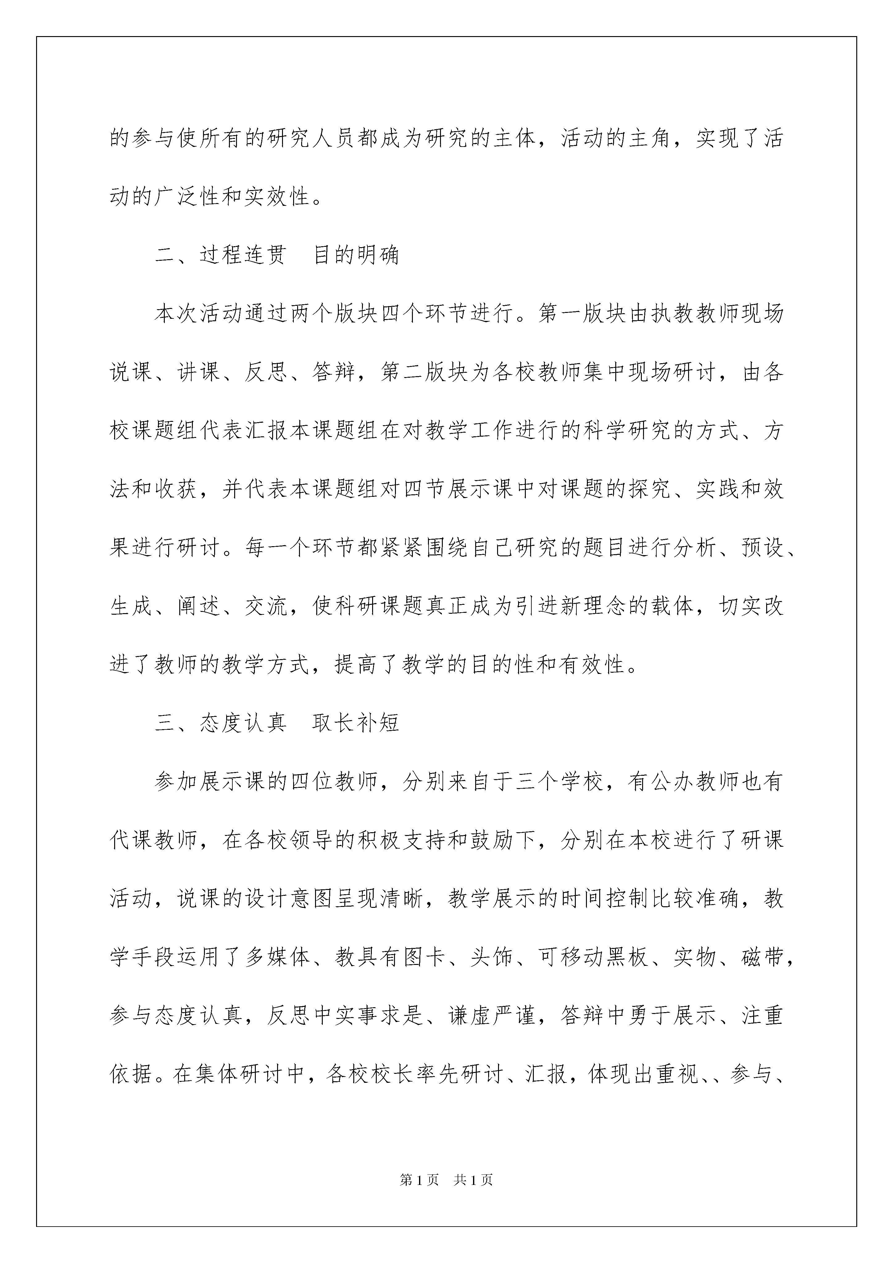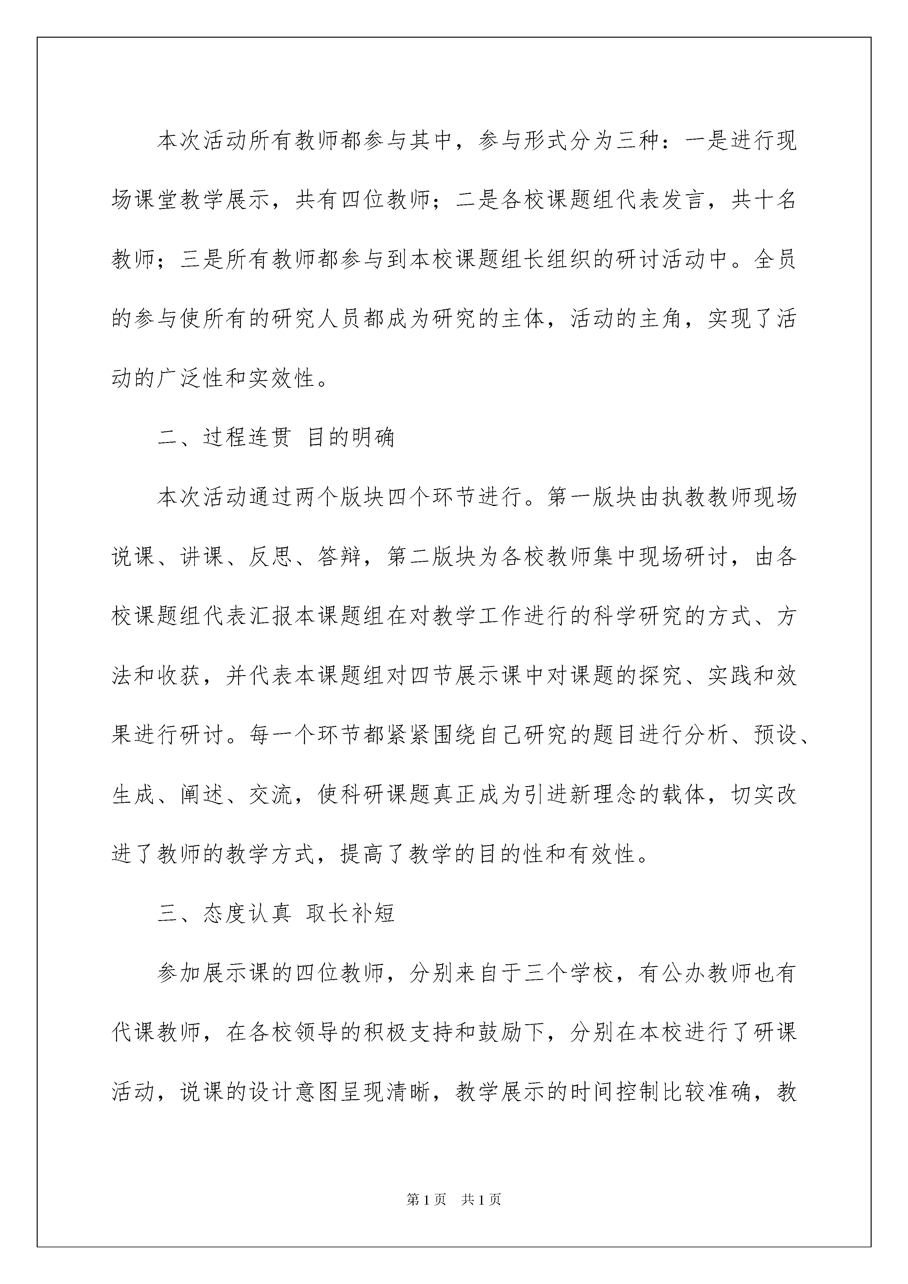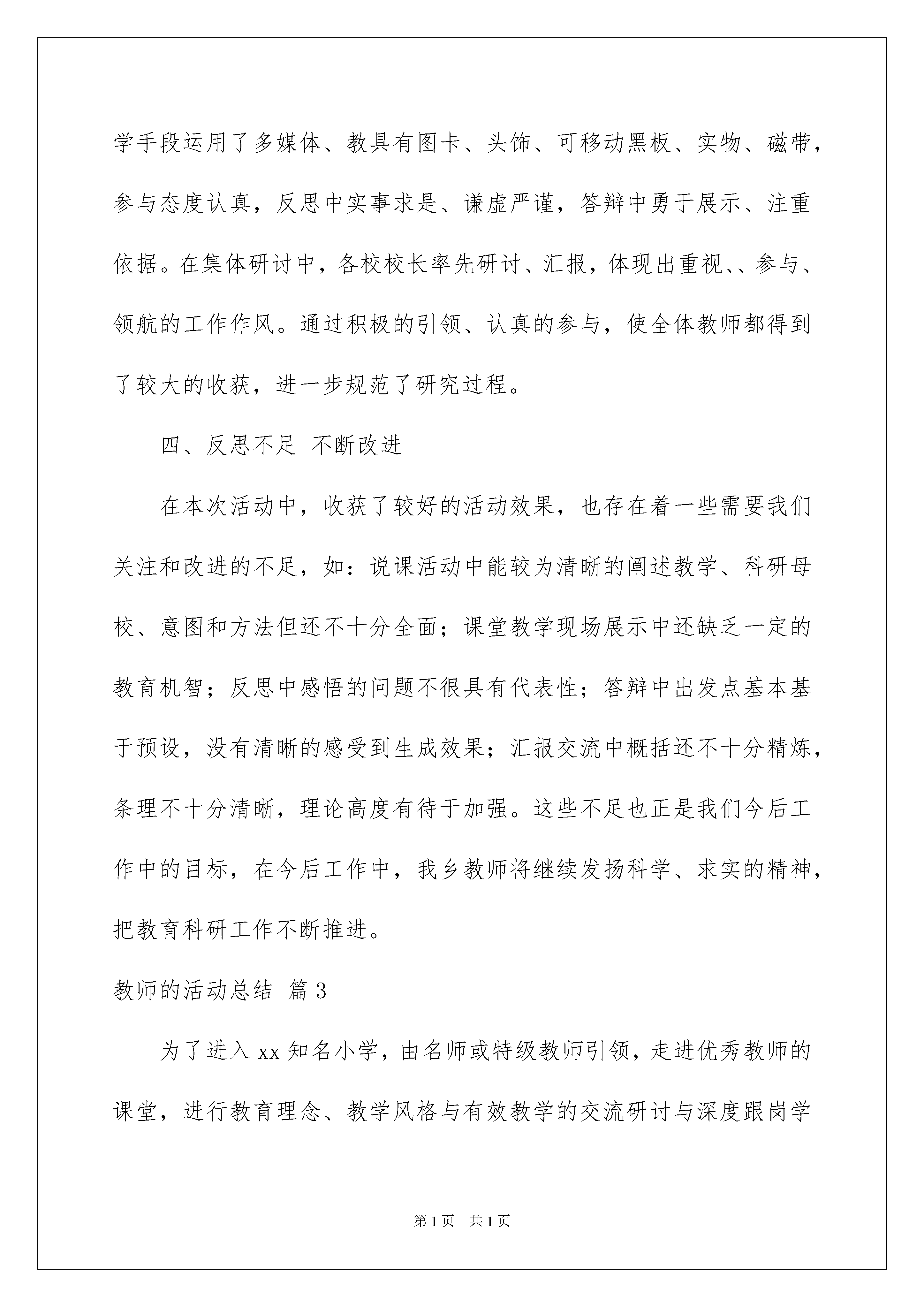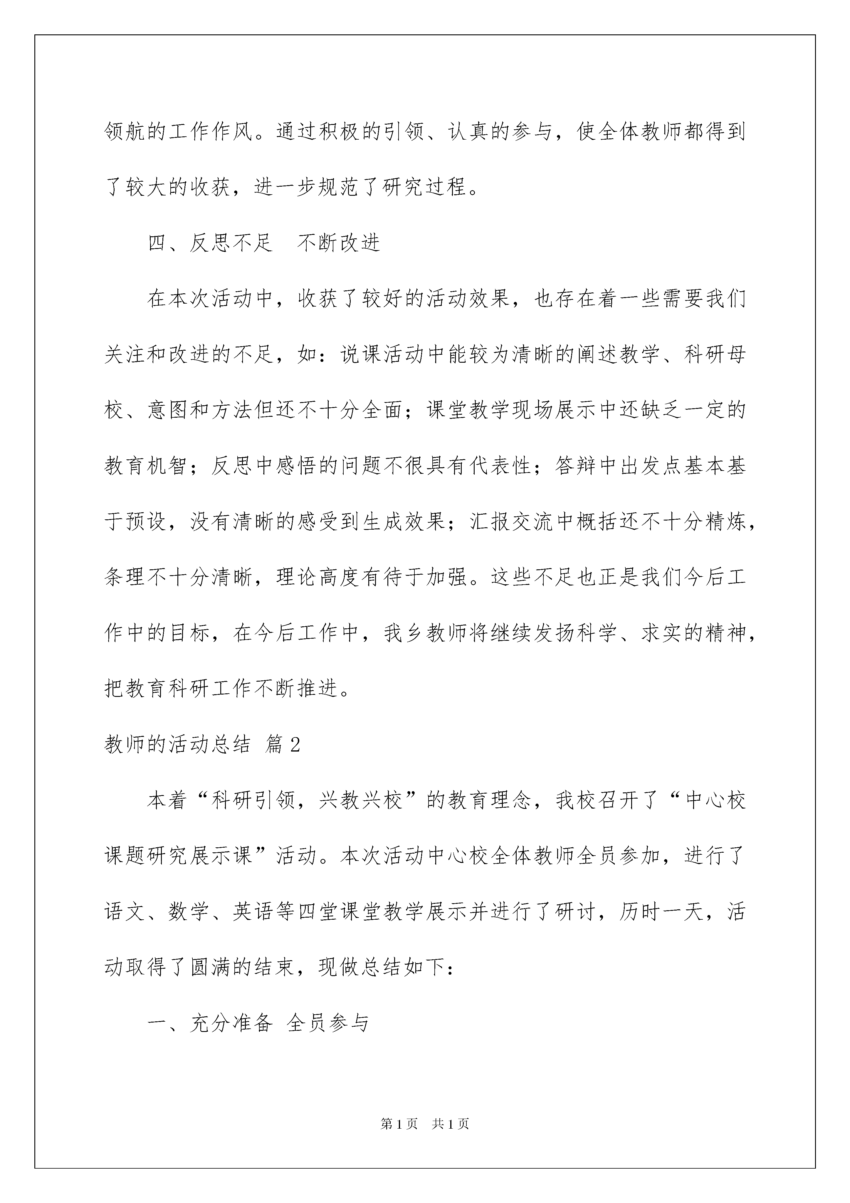 2022教师的活动总结模板合集8篇教师的活动总结模板合集8篇总结是对过去一定时期的工作、学习或思想情况进行回顾、分析,并做出客观评价的书面材料,它可以帮助我们有寻找学习和工作中的规律,因此,让我们写一份总结吧。总结你想好怎么写了吗?下面是我精心整理的教师的活动总结8篇,供大家参考借鉴,希望可以帮助到有需要的朋友。教师的活动总结篇1本着“科研引领,兴教兴校”的教育理念,我校召开了“中心校课题研究展示课”活动。本次活动中心校全体教师全员参加,进行了语文、数学、英语等四堂课堂教学展示并进行了研讨,历时一天,活动取得了圆满的结束,现做总结如下:一、充分准备全员参与本次活动所有教师都参与其中,参与形式分为三种:一是进行现场课堂教学展示,共有四位教师;二是各校课题组代表发言,共十名教师;三是所有教师都参与到本校课题组长组织的研讨活动中。全员的参与使所有的研究人员都成为研究的主体,活动的主角,实现了活动的广泛性和实效性。二、过程连贯目的明确本次活动通过两个版块四个环节进行。第一版块由执教教师现场说课、讲课、反思、答辩,第二版块为各校教师集中现场研讨,由各校课题组代表汇报本课题组在对教学工作进行的科学研究的方式、方法和收获,并代表本课题组对四节展示课中对课题的探究、实践和效果进行研讨。每一个环节都紧紧围绕自己研究的题目进行分析、预设、生成、阐述、交流,使科研课题真正成为引进新理念的载体,切实改进了教师的教学方式,提高了教学的目的性和有效性。三、态度认真取长补短参加展示课的四位教师,分别来自于三个学校,有公办教师也有代课教师,在各校领导的积极支持和鼓励下,分别在本校进行了研课活动,说课的设计意图呈现清晰,教学展示的时间控制比较准确,教学手段运用了多媒体、教具有图卡、头饰、可移动黑板、实物、磁带,参与态度认真,反思中实事求是、谦虚严谨,答辩中勇于展示、注重依据。在集体研讨中,各校校长率先研讨、汇报,体现出重视、、参与、领航的工作作风。通过积极的引领、认真的参与,使全体教师都得到了较大的收获,进一步规范了研究过程。四、反思不足不断改进在本次活动中,收获了较好的活动效果,也存在着一些需要我们关注和改进的不足,如:说课活动中能较为清晰的阐述教学、科研母校、意图和方法但还不十分全面;课堂教学现场展示中还缺乏一定的教育机智;反思中感悟的问题不很具有代表性;答辩中出发点基本基于预设,没有清晰的感受到生成效果;汇报交流中概括还不十分精炼,条理不十分清晰,理论高度有待于加强。这些不足也正是我们今后工作中的目标,在今后工作中,我乡教师将继续发扬科学、求实的精神,把教育科研工作不断推进。教师的活动总结篇2本着“科研引领,兴教兴校”的教育理念,我校召开了“中心校课题研究展示课”活动。本次活动中心校全体教师全员参加,进行了语文、数学、英语等四堂课堂教学展示并进行了研讨,历时一天,活动取得了圆满的结束,现做总结如下:一、充分准备全员参与本次活动所有教师都参与其中,参与形式分为三种:一是进行现场课堂教学展示,共有四位教师;二是各校课题组代表发言,共十名教师;三是所有教师都参与到本校课题组长组织的研讨活动中。全员的参与使所有的研究人员都成为研究的主体,活动的主角,实现了活动的广泛性和实效性。二、过程连贯目的明确本次活动通过两个版块四个环节进行。第一版块由执教教师现场说课、讲课、反思、答辩,第二版块为各校教师集中现场研讨,由各校课题组代表汇报本课题组在对教学工作进行的科学研究的方式、方法和收获,并代表本课题组对四节展示课中对课题的探究、实践和效果进行研讨。每一个环节都紧紧围绕自己研究的题目进行分析、预设、生成、阐述、交流,使科研课题真正成为引进新理念的载体,切实改进了教师的教学方式,提高了教学的目的性和有效性。三、态度认真取长补短参加展示课的四位教师,分别来自于三个学校,有公办教师也有代课教师,在各校领导的积极支持和鼓励下,分别在本校进行了研课活动,说课的设计意图呈现清晰,教学展示的时间控制比较准确,教学手段运用了多媒体、教具有图卡、头饰、可移动黑板、实物、磁带,参与态度认真,反思中实事求是、谦虚严谨,答辩中勇于展示、注重依据。在集体研讨中,各校校长率先研讨、汇报,体现出重视、、参与、领航的工作作风。通过积极的引领、认真的参与,使全体教师都得到了较大的收获,进一步规范了研究过程。四、反思不足不断改进在本次活动中,收获了较好的活动效果,也存在着一些需要我们关注和改进的不足,如:说课活动中能较为清晰的阐述教学、科研母校、意图和方法但还不十分全面;课堂教学现场展示中还缺乏一定的教育机智;反思中感悟的问题不很具有代表性;答辩中出发
