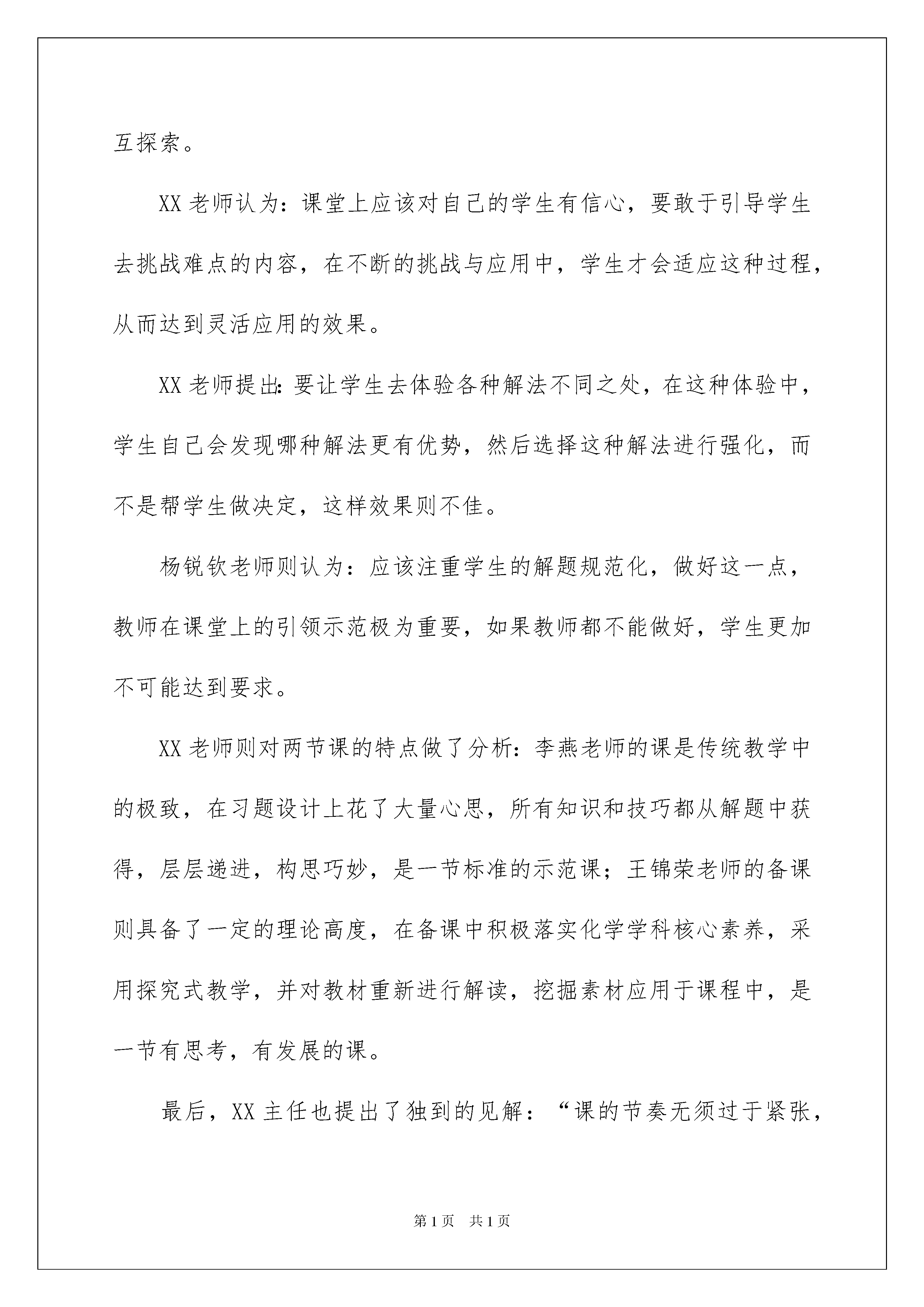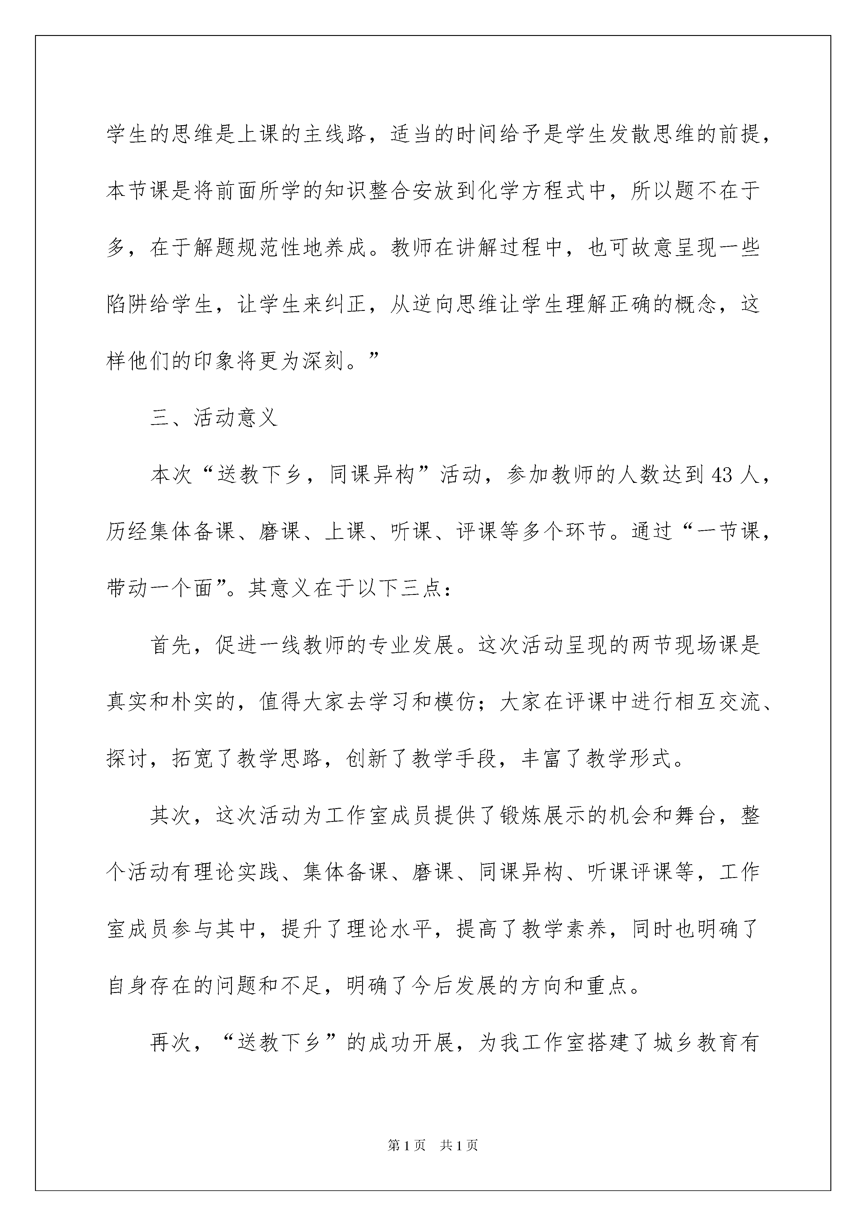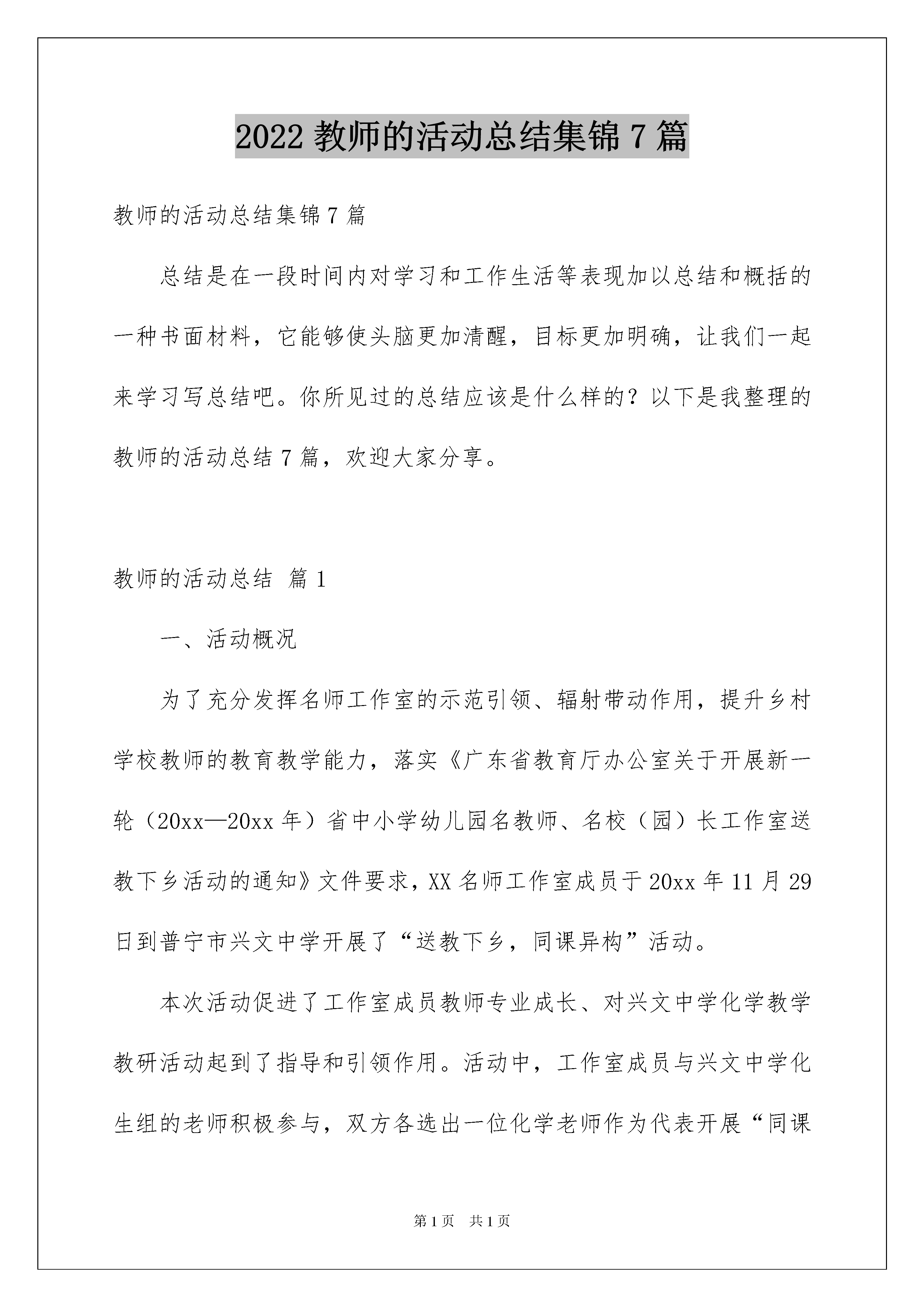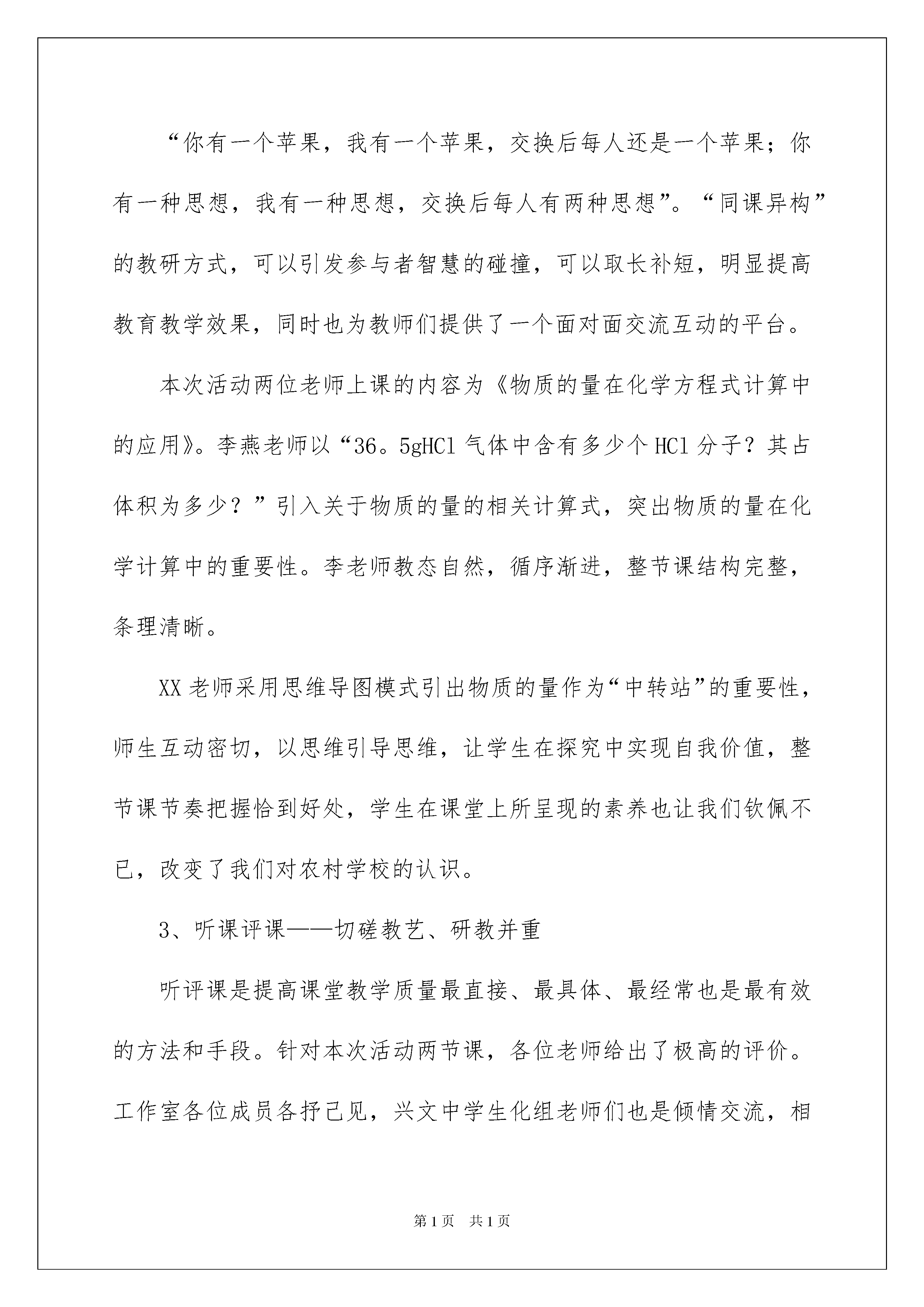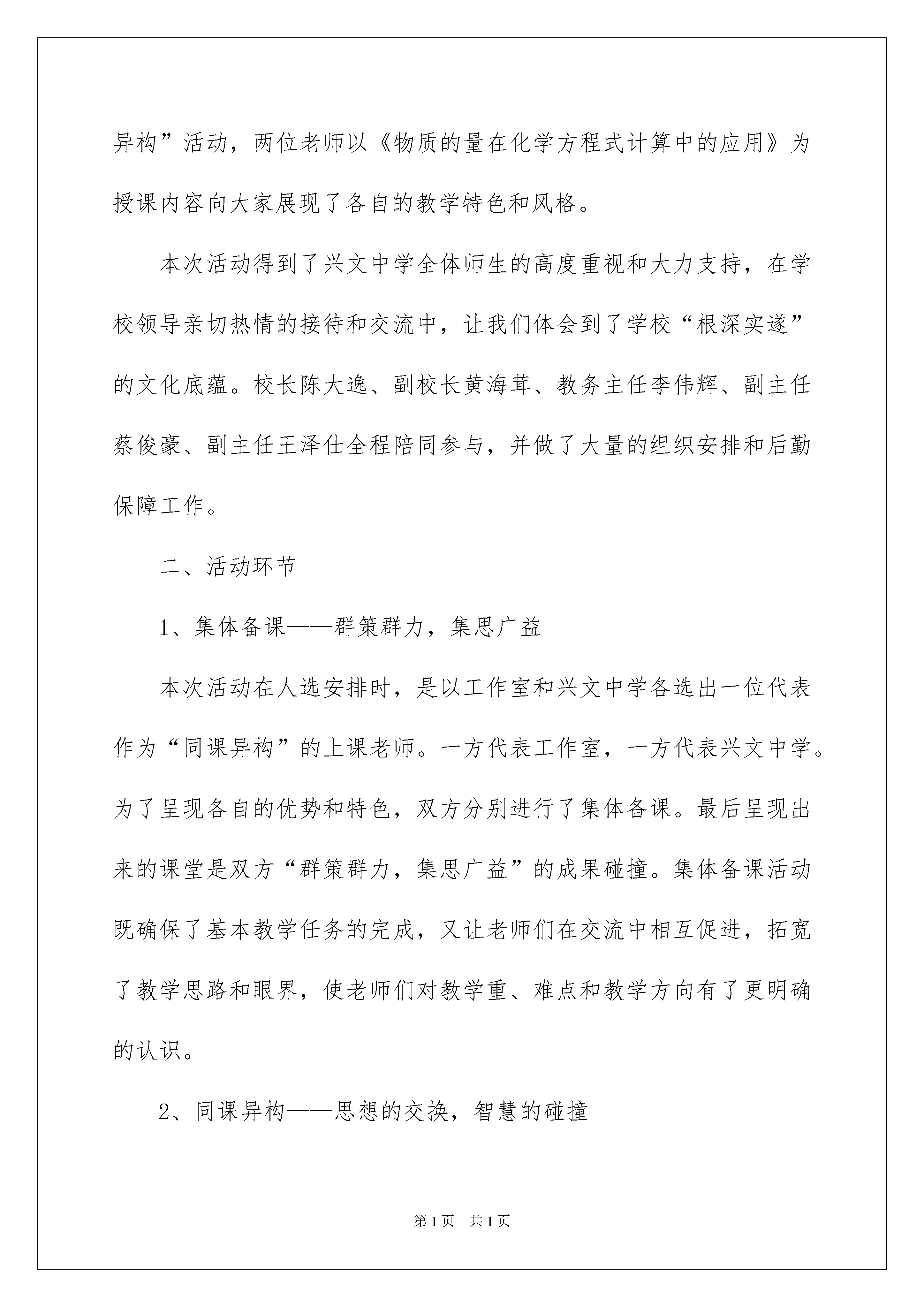 2022教师的活动总结集锦7篇教师的活动总结集锦7篇总结是在一段时间内对学习和工作生活等表现加以总结和概括的一种书面材料,它能够使头脑更加清醒,目标更加明确,让我们一起来学习写总结吧。你所见过的总结应该是什么样的?以下是我整理的教师的活动总结7篇,欢迎大家分享。教师的活动总结篇1一、活动概况为了充分发挥名师工作室的示范引领、辐射带动作用,提升乡村学校教师的教育教学能力,落实《广东省教育厅办公室关于开展新一轮(20xx—20xx年)省中小学幼儿园名教师、名校(园)长工作室送教下乡活动的通知》文件要求,XX名师工作室成员于20xx年11月29日到普宁市兴文中学开展了“送教下乡,同课异构”活动。本次活动促进了工作室成员教师专业成长、对兴文中学化学教学教研活动起到了指导和引领作用。活动中,工作室成员与兴文中学化生组的老师积极参与,双方各选出一位化学老师作为代表开展“同课异构”活动,两位老师以《物质的量在化学方程式计算中的应用》为授课内容向大家展现了各自的教学特色和风格。本次活动得到了兴文中学全体师生的高度重视和大力支持,在学校领导亲切热情的接待和交流中,让我们体会到了学校“根深实遂”的文化底蕴。校长陈大逸、副校长黄海茸、教务主任李伟辉、副主任蔡俊豪、副主任王泽仕全程陪同参与,并做了大量的组织安排和后勤保障工作。二、活动环节1、集体备课——群策群力,集思广益本次活动在人选安排时,是以工作室和兴文中学各选出一位代表作为“同课异构”的上课老师。一方代表工作室,一方代表兴文中学。为了呈现各自的优势和特色,双方分别进行了集体备课。最后呈现出来的课堂是双方“群策群力,集思广益”的成果碰撞。集体备课活动既确保了基本教学任务的完成,又让老师们在交流中相互促进,拓宽了教学思路和眼界,使老师们对教学重、难点和教学方向有了更明确的认识。2、同课异构——思想的交换,智慧的碰撞“你有一个苹果,我有一个苹果,交换后每人还是一个苹果;你有一种思想,我有一种思想,交换后每人有两种思想”。“同课异构”的教研方式,可以引发参与者智慧的碰撞,可以取长补短,明显提高教育教学效果,同时也为教师们提供了一个面对面交流互动的平台。本次活动两位老师上课的内容为《物质的量在化学方程式计算中的应用》。李燕老师以“36。5gHCl气体中含有多少个HCl分子?其占体积为多少?”引入关于物质的量的相关计算式,突出物质的量在化学计算中的重要性。李老师教态自然,循序渐进,整节课结构完整,条理清晰。XX老师采用思维导图模式引出物质的量作为“中转站”的重要性,师生互动密切,以思维引导思维,让学生在探究中实现自我价值,整节课节奏把握恰到好处,学生在课堂上所呈现的素养也让我们钦佩不已,改变了我们对农村学校的认识。3、听课评课——切磋教艺、研教并重听评课是提高课堂教学质量最直接、最具体、最经常也是最有效的方法和手段。针对本次活动两节课,各位老师给出了极高的评价。工作室各位成员各抒己见,兴文中学生化组老师们也是倾情交流,相互探索。XX老师认为:课堂上应该对自己的学生有信心,要敢于引导学生去挑战难点的内容,在不断的挑战与应用中,学生才会适应这种过程,从而达到灵活应用的效果。XX老师提出:要让学生去体验各种解法不同之处,在这种体验中,学生自己会发现哪种解法更有优势,然后选择这种解法进行强化,而不是帮学生做决定,这样效果则不佳。杨锐钦老师则认为:应该注重学生的解题规范化,做好这一点,教师在课堂上的引领示范极为重要,如果教师都不能做好,学生更加不可能达到要求。XX老师则对两节课的特点做了分析:李燕老师的课是传统教学中的极致,在习题设计上花了大量心思,所有知识和技巧都从解题中获得,层层递进,构思巧妙,是一节标准的示范课;王锦荣老师的备课则具备了一定的理论高度,在备课中积极落实化学学科核心素养,采用探究式教学,并对教材重新进行解读,挖掘素材应用于课程中,是一节有思考,有发展的课。最后,XX主任也提出了独到的见解:“课的节奏无须过于紧张,学生的思维是上课的主线路,适当的时间给予是学生发散思维的前提,本节课是将前面所学的知识整合安放到化学方程式中,所以题不在于多,在于解题规范性地养成。教师在讲解过程中,也可故意呈现一些陷阱给学生,让学生来纠正,从逆向思维让学生理解正确的概念,这样他们的印象将更为深刻。”三、活动意义本次“送教下乡,同课异构”活动,参加教师的人数达到43人,历经集体备课、磨课、上课、听课、评课等多个环节。通过“一节课,带动一个面”。其意义在于以下三点:首先,促进一线教师的专业发展。这次活动呈现的两节现场课是真实和朴实的,值得大家去学习和模仿;大家在评课中