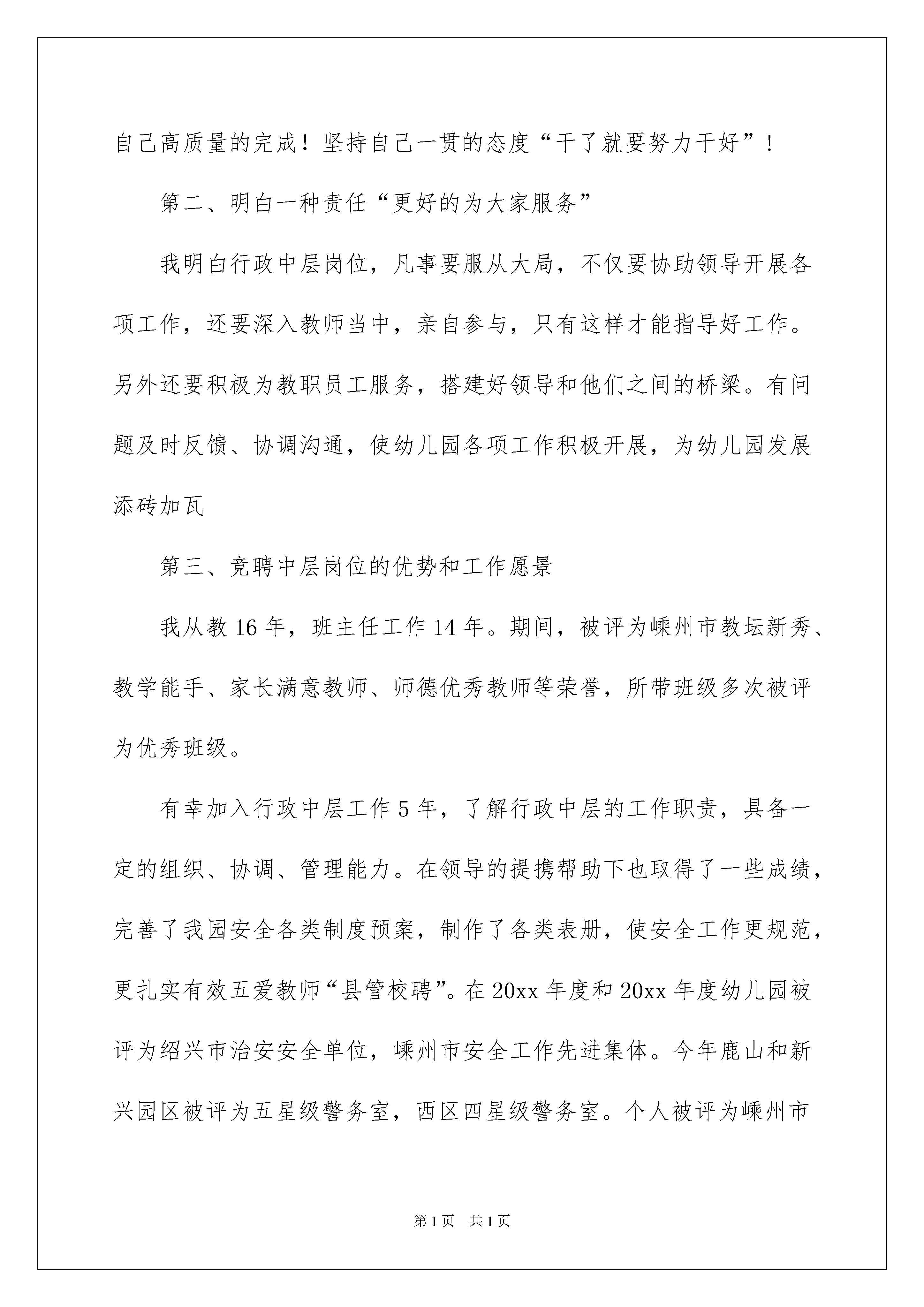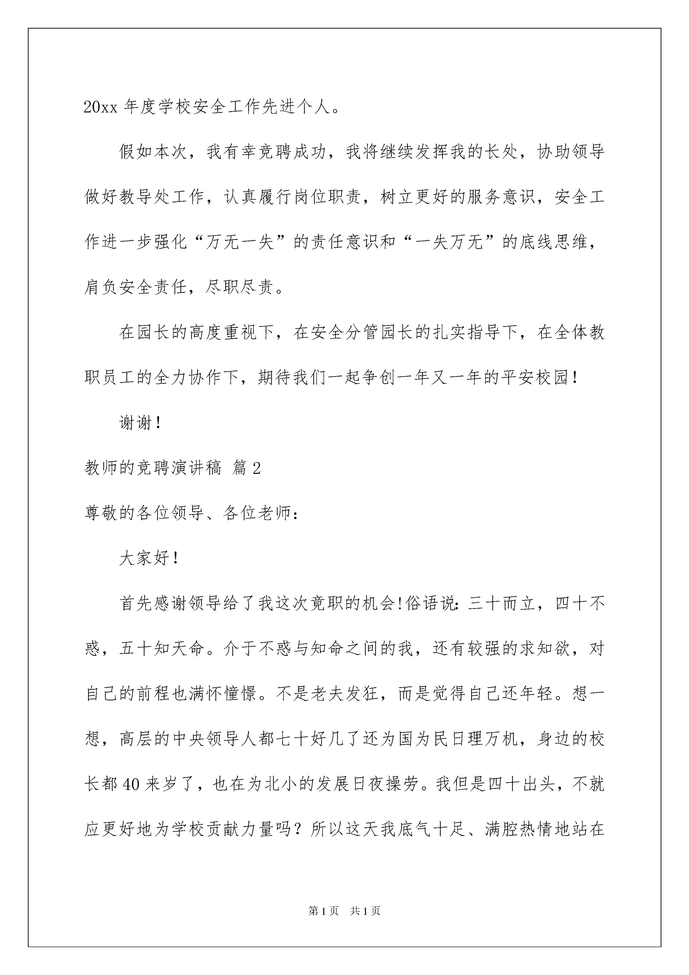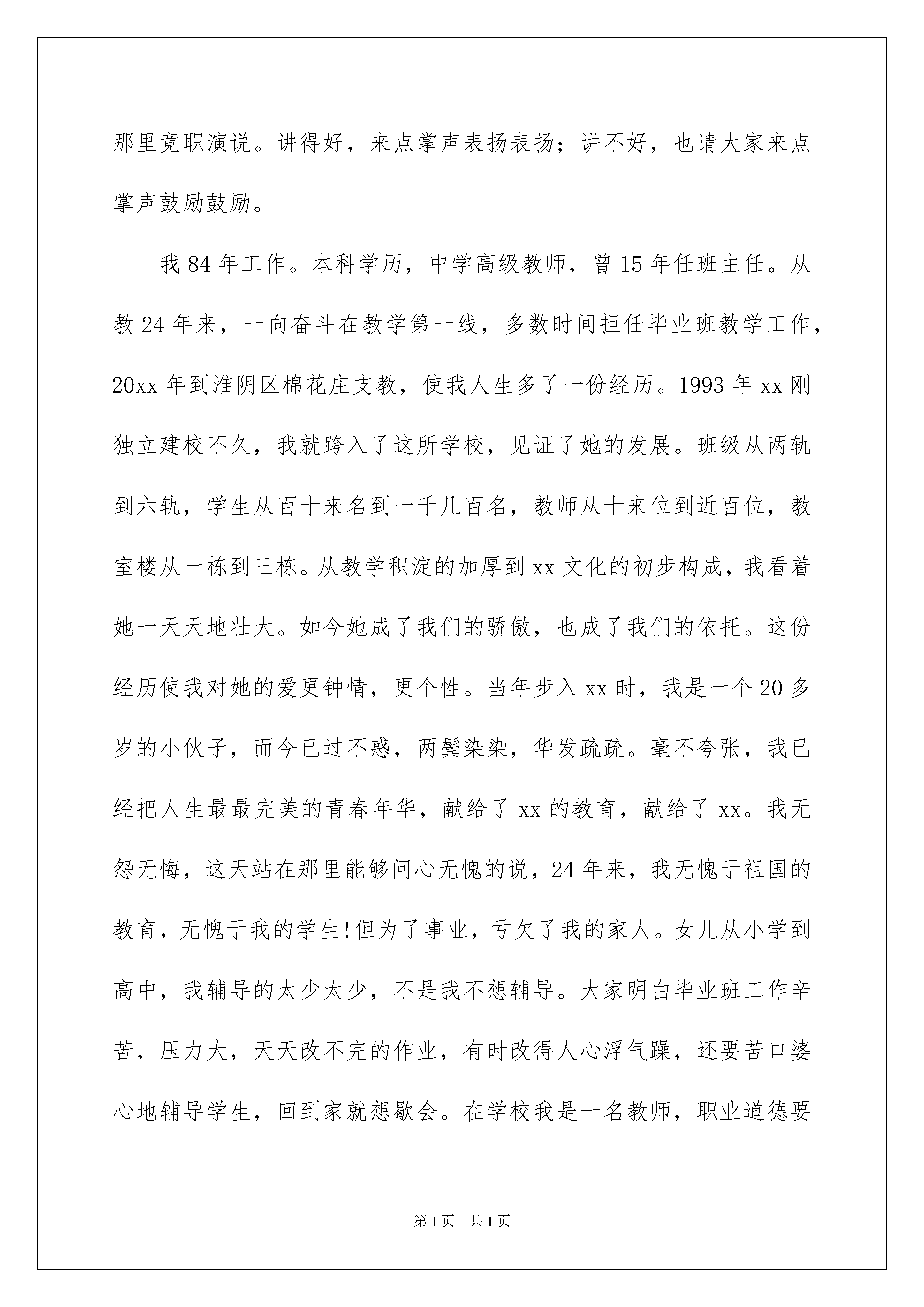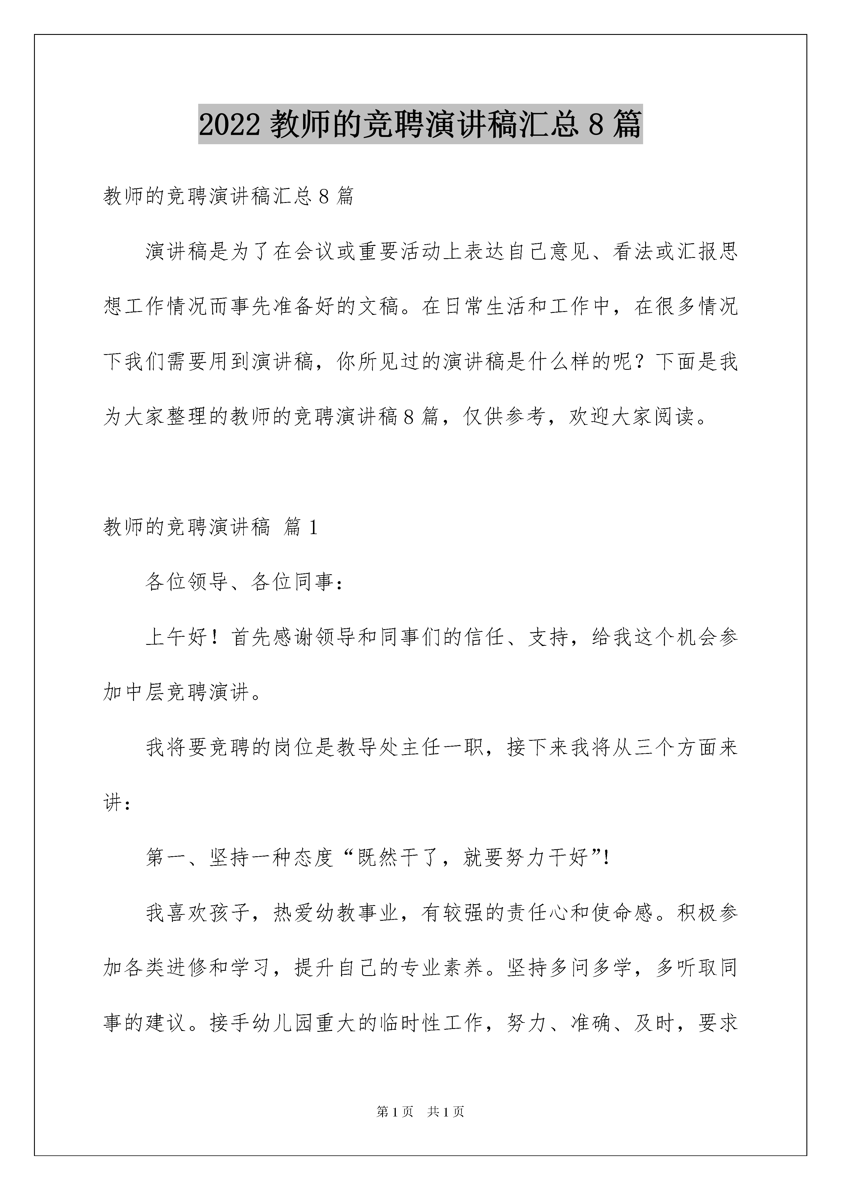 2022教师的竞聘演讲稿汇总8篇教师的竞聘演讲稿汇总8篇演讲稿是为了在会议或重要活动上表达自己意见、看法或汇报思想工作情况而事先准备好的文稿。在日常生活和工作中,在很多情况下我们需要用到演讲稿,你所见过的演讲稿是什么样的呢?下面是我为大家整理的教师的竞聘演讲稿8篇,仅供参考,欢迎大家阅读。教师的竞聘演讲稿篇1各位领导、各位同事:上午好!首先感谢领导和同事们的信任、支持,给我这个机会参加中层竞聘演讲。我将要竞聘的岗位是教导处主任一职,接下来我将从三个方面来讲:第一、坚持一种态度“既然干了,就要努力干好”!我喜欢孩子,热爱幼教事业,有较强的责任心和使命感。积极参加各类进修和学习,提升自己的专业素养。坚持多问多学,多听取同事的建议。接手幼儿园重大的临时性工作,努力、准确、及时,要求自己高质量的完成!坚持自己一贯的态度“干了就要努力干好”!第二、明白一种责任“更好的为大家服务”我明白行政中层岗位,凡事要服从大局,不仅要协助领导开展各项工作,还要深入教师当中,亲自参与,只有这样才能指导好工作。另外还要积极为教职员工服务,搭建好领导和他们之间的桥梁。有问题及时反馈、协调沟通,使幼儿园各项工作积极开展,为幼儿园发展添砖加瓦第三、竞聘中层岗位的优势和工作愿景我从教16年,班主任工作14年。期间,被评为嵊州市教坛新秀、教学能手、家长满意教师、师德优秀教师等荣誉,所带班级多次被评为优秀班级。有幸加入行政中层工作5年,了解行政中层的工作职责,具备一定的组织、协调、管理能力。在领导的提携帮助下也取得了一些成绩,完善了我园安全各类制度预案,制作了各类表册,使安全工作更规范,更扎实有效五爱教师“县管校聘”。在20xx年度和20xx年度幼儿园被评为绍兴市治安安全单位,嵊州市安全工作先进集体。今年鹿山和新兴园区被评为五星级警务室,西区四星级警务室。个人被评为嵊州市20xx年度学校安全工作先进个人。假如本次,我有幸竞聘成功,我将继续发挥我的长处,协助领导做好教导处工作,认真履行岗位职责,树立更好的服务意识,安全工作进一步强化“万无一失”的责任意识和“一失万无”的底线思维,肩负安全责任,尽职尽责。在园长的高度重视下,在安全分管园长的扎实指导下,在全体教职员工的全力协作下,期待我们一起争创一年又一年的平安校园!谢谢!教师的竞聘演讲稿篇2尊敬的各位领导、各位老师:大家好!首先感谢领导给了我这次竟职的机会!俗语说:三十而立,四十不惑,五十知天命。介于不惑与知命之间的我,还有较强的求知欲,对自己的前程也满怀憧憬。不是老夫发狂,而是觉得自己还年轻。想一想,高层的中央领导人都七十好几了还为国为民日理万机,身边的校长都40来岁了,也在为北小的发展日夜操劳。我但是四十出头,不就应更好地为学校贡献力量吗?所以这天我底气十足、满腔热情地站在那里竟职演说。讲得好,来点掌声表扬表扬;讲不好,也请大家来点掌声鼓励鼓励。我84年工作。本科学历,中学高级教师,曾15年任班主任。从教24年来,一向奋斗在教学第一线,多数时间担任毕业班教学工作,20xx年到淮阴区棉花庄支教,使我人生多了一份经历。1993年xx刚独立建校不久,我就跨入了这所学校,见证了她的发展。班级从两轨到六轨,学生从百十来名到一千几百名,教师从十来位到近百位,教室楼从一栋到三栋。从教学积淀的加厚到xx文化的初步构成,我看着她一天天地壮大。如今她成了我们的骄傲,也成了我们的依托。这份经历使我对她的爱更钟情,更个性。当年步入xx时,我是一个20多岁的小伙子,而今已过不惑,两鬓染染,华发疏疏。毫不夸张,我已经把人生最最完美的青春年华,献给了xx的教育,献给了xx。我无怨无悔,这天站在那里能够问心无愧的说,24年来,我无愧于祖国的教育,无愧于我的学生!但为了事业,亏欠了我的家人。女儿从小学到高中,我辅导的太少太少,不是我不想辅导。大家明白毕业班工作辛苦,压力大,天天改不完的作业,有时改得人心浮气躁,还要苦口婆心地辅导学生,回到家就想歇会。在学校我是一名教师,职业道德要求我务必循循善诱地对待学生,再苦再累再烦,也要含笑回答学生问题。在家里就掩饰不了自己的情绪了,讲两次听不懂就对女儿吼起来了。女儿在小学、初中我是能辅导没情绪,到高中又没潜力辅导,这是一种无奈。作为教师,我为从xx出去的一个个大学生、硕士生、研究生,高考、中考状元,这些莘莘学子奠定了基础,我是一名合格的老师。而作为家长,我是一个不称职的父亲。我这天讲这些不是向领导、向同志们诉苦邀功,而是告诉大家,我爱教育事业,我爱北小。就是吃再多的苦,受再多的累,也无怨无悔。源于这种爱才促使我走上这天的竞职讲台。草根教育家陶行知说过,道