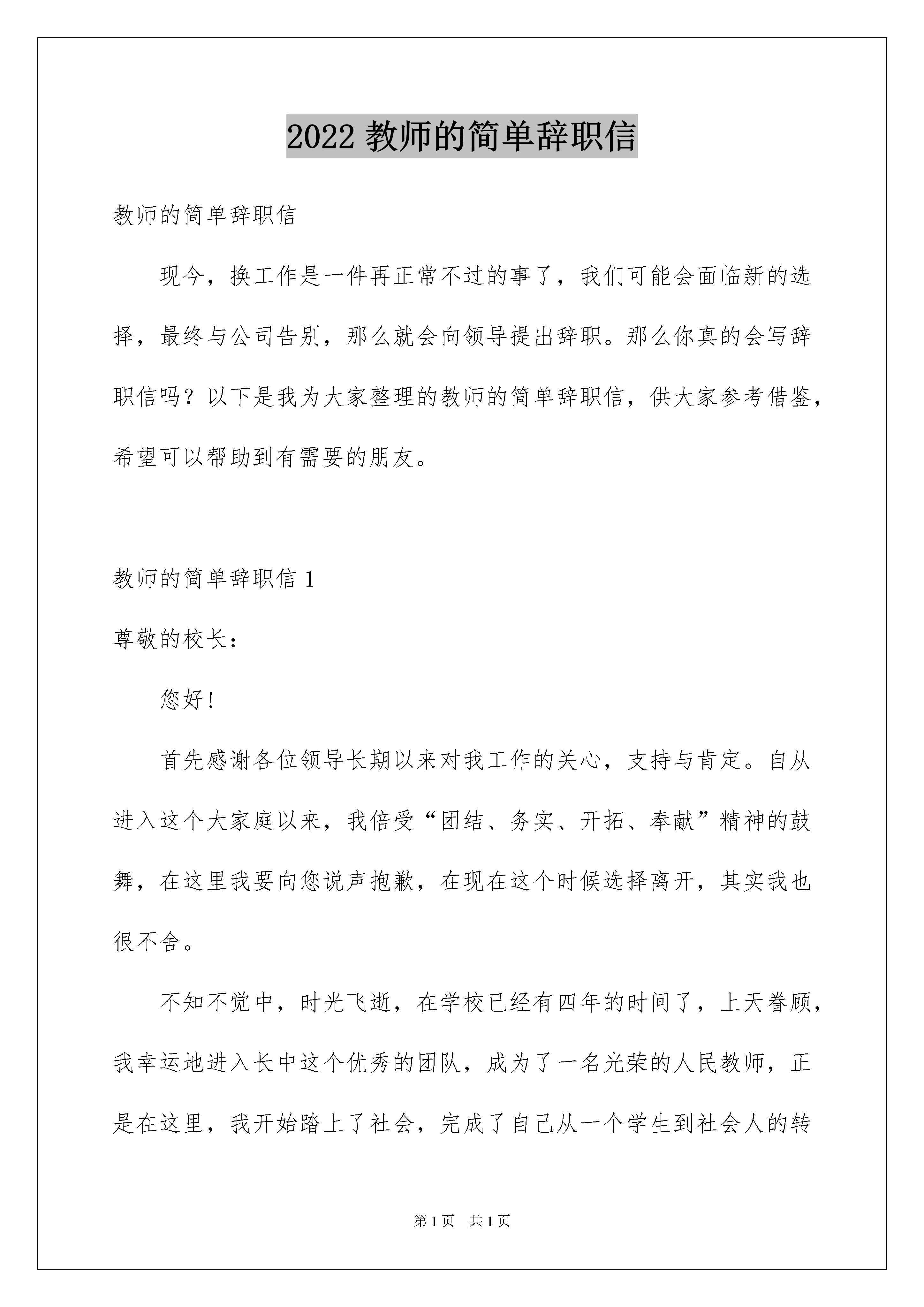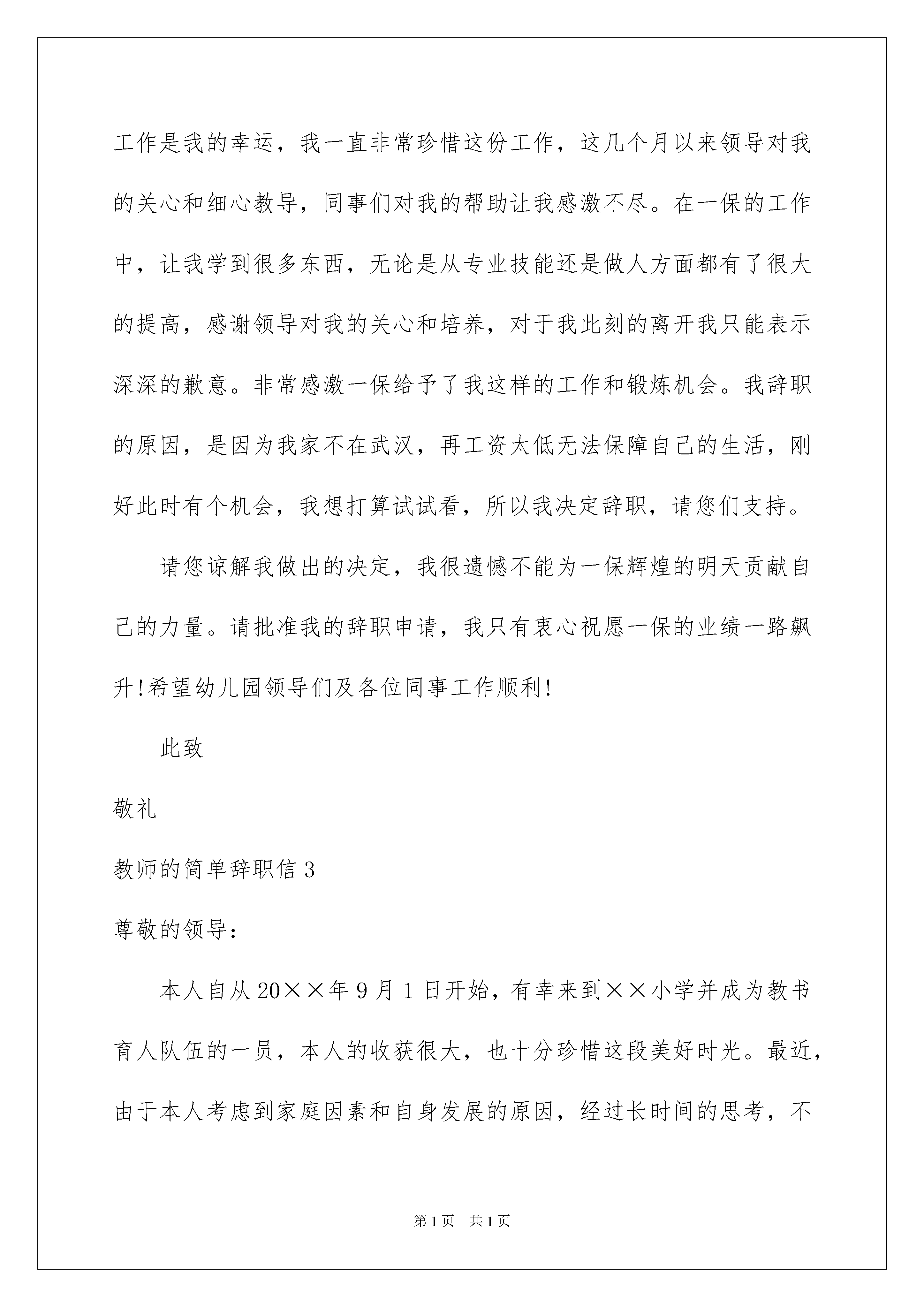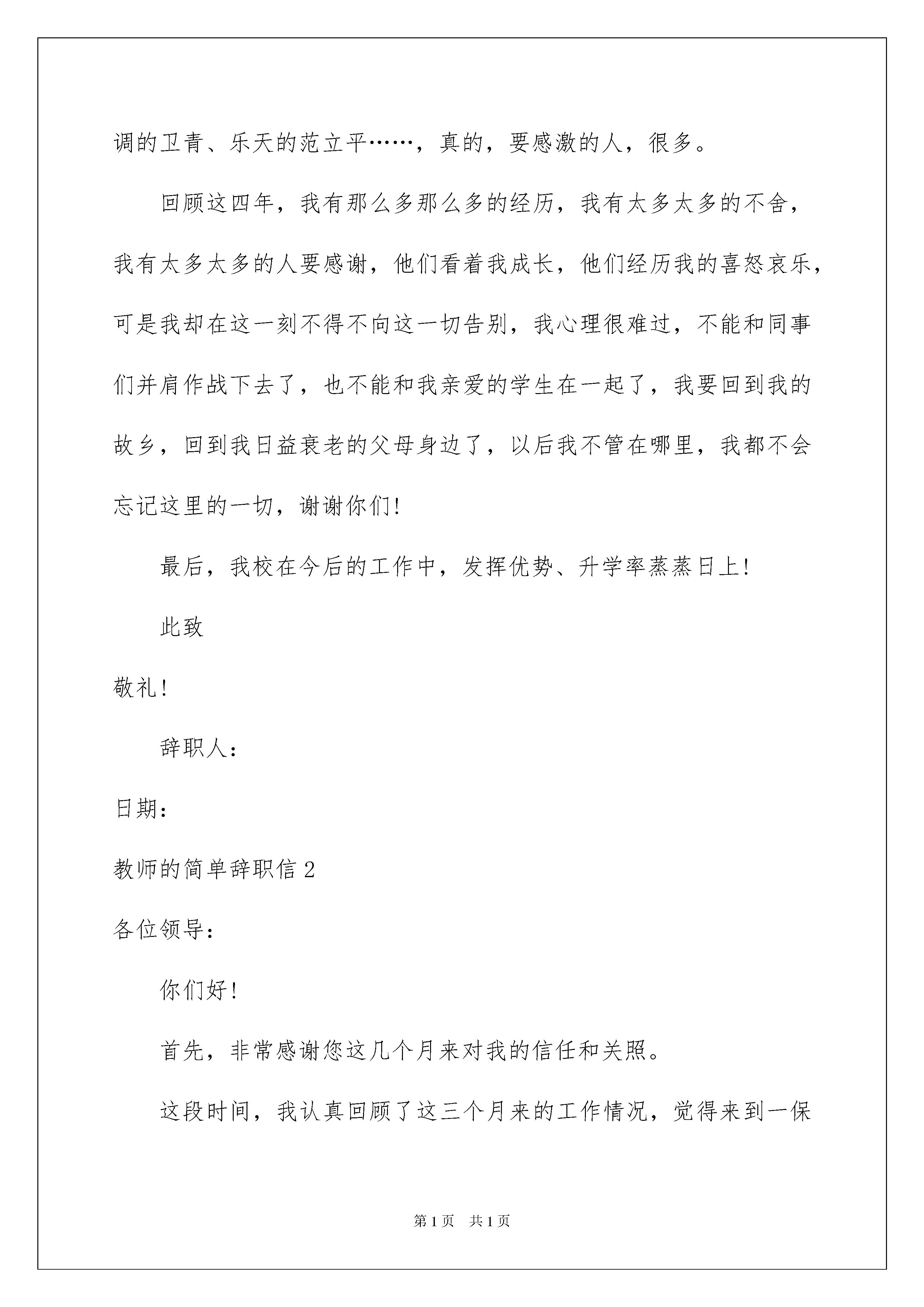 2022教师的简单辞职信教师的简单辞职信现今,换工作是一件再正常不过的事了,我们可能会面临新的选择,最终与公司告别,那么就会向领导提出辞职。那么你真的会写辞职信吗?以下是我为大家整理的教师的简单辞职信,供大家参考借鉴,希望可以帮助到有需要的朋友。教师的简单辞职信1尊敬的校长:您好!首先感谢各位领导长期以来对我工作的关心,支持与肯定。自从进入这个大家庭以来,我倍受“团结、务实、开拓、奉献”精神的鼓舞,在这里我要向您说声抱歉,在现在这个时候选择离开,其实我也很不舍。不知不觉中,时光飞逝,在学校已经有四年的时间了,上天眷顾,我幸运地进入长中这个优秀的团队,成为了一名光荣的人民教师,正是在这里,我开始踏上了社会,完成了自己从一个学生到社会人的转变。我还记得,我到校的时候已经是晚上了,您不辞辛劳来到我们教师宿舍亲切的慰问。和善的交谈,让我消除了孤身离乡的伤感,多了一份亲切的温暖,多了一份对未来的乐观信念。我还记得,20xx年9月1日,在开学大会上我代表新进14名教师发言的情景,那时的天气、那时说的话、那时的心情,都清晰可忆,至今想来,仍有几许激动。四年了,在学校的工作中,我尝过了酸甜苦辣,我为成功而欢笑,为失败留下而流泪,为同事们的友善而开心,为领导的和善而感到温暖,我一定要成为一名优秀的教师,这坚定的信念伴我走过成长的日日夜夜,我要努力地工作,努力地学习,历练完善自我,以对得起信任我的领导,对得起我的学生,对得起我拥有的身份、地位。第一年工作,由于自己没有经验,总让自己彷徨苦恼,甚至焦急无助地暗自哭泣,但是,领导、同事、学生对我的支持和鼓励,终于让我一步步地走出方向,走出感觉,走出门路来。也许,我在教学上有些后知后觉,但还算让自己欣慰的是,我在长中的第一届也是最后一届毕业生,虽然没有取得一二名的优异成绩,但这份成果,已经是对我极大的`安慰和鼓励了,是对我努力与付出的一份认可。高考成绩揭晓的那个夜晚,我虽身在远方,苦楚萦身,但却心系学校、心系我的学生,当学校、同事、学生纷纷传来喜讯时,我激动得到了三点也睡不着,那是我这一个月来唯一的笑容和喜悦,我的付出终于得到了回报,我相信“一分耕耘,一分收获”四年来,要感激的人太多。也许现在说这样的话很空,但是我还是要说,因为这是我心里最想说的话,首先,要感激张校长,是您给了我机会把我带到这片新土地上来,您就是我在这里的亲人、我的家长,所以,一直因您的失望而自责,因您的认可而喜悦。其次,我要感激的是周学新老师,第一年工作,因为我就在高三办公室,所以受到周老师的诸多指点,有工作,有处事,让初出茅庐的我受益匪浅。而后三年的搭班任教,周老师更是给了我无限的肯定和指导,在我失落的时候,对我伸出援手鼓励我,在我成功的时候也会为我送上祝福,在我处事不周的时候劝告我,在我迷茫困惑的时候点拨我,甚至时时不忘我的个人问题。所以,我觉得,他是我在这片土地上像哥哥一样的亲人。还有,我要感激我们的语文组:我的师父,憨态可爱的佘老师,感谢他毫无保留地带了我三年;我的组长,耿直公正的严老师,感谢他对我工作的指引和照顾;我的战友,简单的郑雅、强干的梁磊、低调的卫青、乐天的范立平……,真的,要感激的人,很多。回顾这四年,我有那么多那么多的经历,我有太多太多的不舍,我有太多太多的人要感谢,他们看着我成长,他们经历我的喜怒哀乐,可是我却在这一刻不得不向这一切告别,我心理很难过,不能和同事们并肩作战下去了,也不能和我亲爱的学生在一起了,我要回到我的故乡,回到我日益衰老的父母身边了,以后我不管在哪里,我都不会忘记这里的一切,谢谢你们!最后,我校在今后的工作中,发挥优势、升学率蒸蒸日上!此致敬礼!辞职人:日期:教师的简单辞职信2各位领导:你们好!首先,非常感谢您这几个月来对我的信任和关照。这段时间,我认真回顾了这三个月来的工作情况,觉得来到一保工作是我的幸运,我一直非常珍惜这份工作,这几个月以来领导对我的关心和细心教导,同事们对我的帮助让我感激不尽。在一保的工作中,让我学到很多东西,无论是从专业技能还是做人方面都有了很大的提高,感谢领导对我的关心和培养,对于我此刻的离开我只能表示深深的歉意。非常感激一保给予了我这样的工作和锻炼机会。我辞职的原因,是因为我家不在武汉,再工资太低无法保障自己的生活,刚好此时有个机会,我想打算试试看,所以我决定辞职,请您们支持。请您谅解我做出的决定,我很遗憾不能为一保辉煌的明天贡献自己的力量。请批准我的辞职申请,我只有衷心祝愿一保的业绩一路飙升!希望幼儿园领导们及各位同事工作顺利!此致敬礼教师的简单辞职信3尊敬的领导:本人自从20××年9月1日开始,有幸来到×