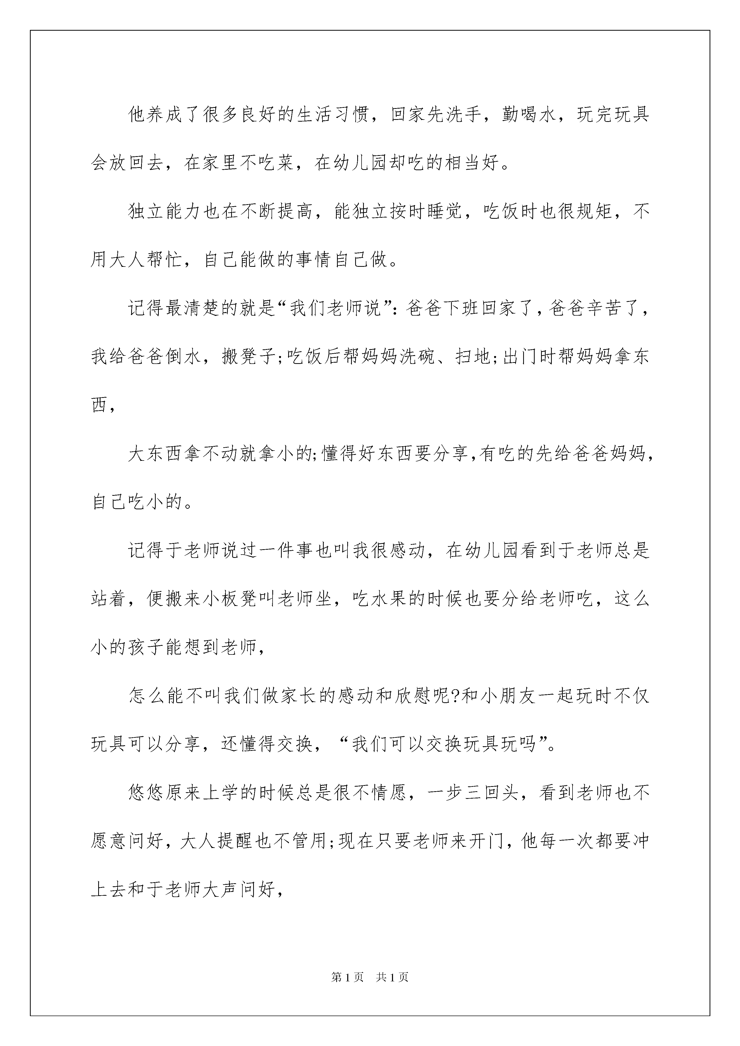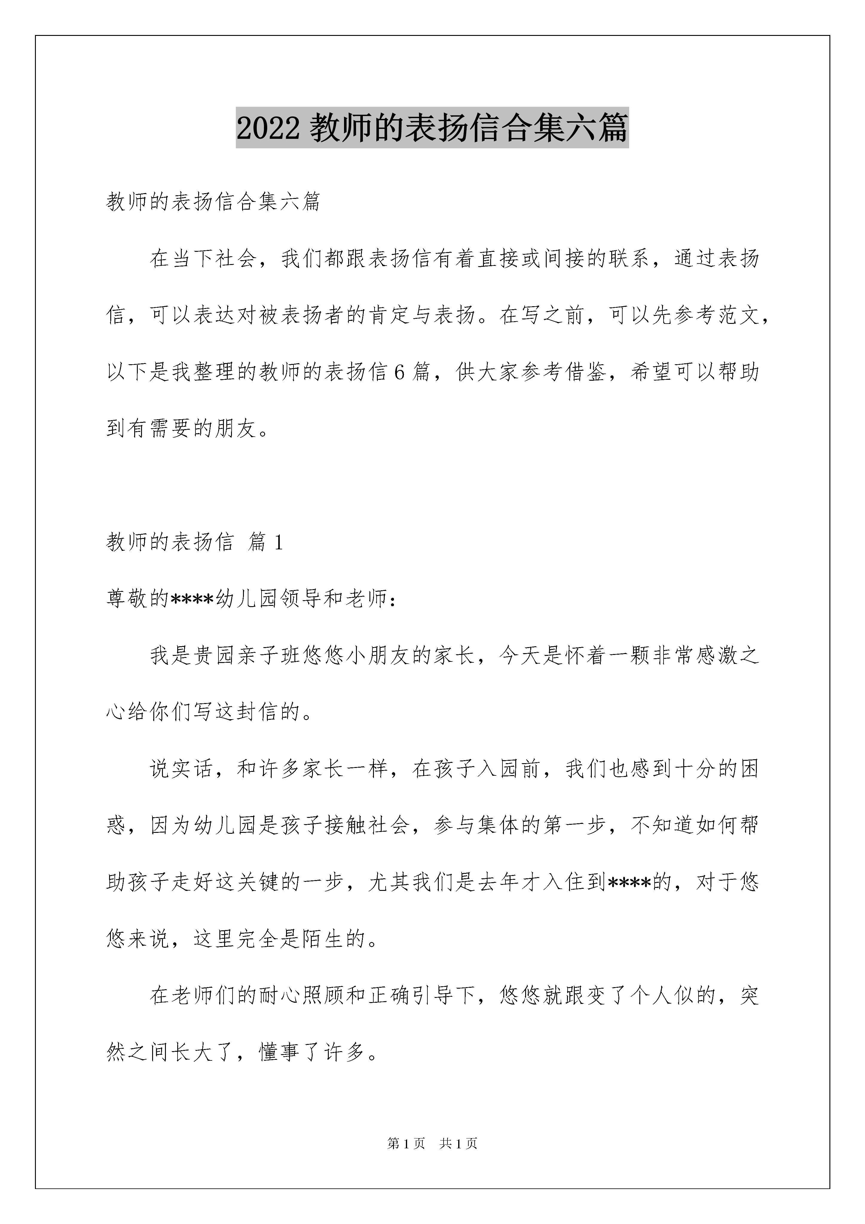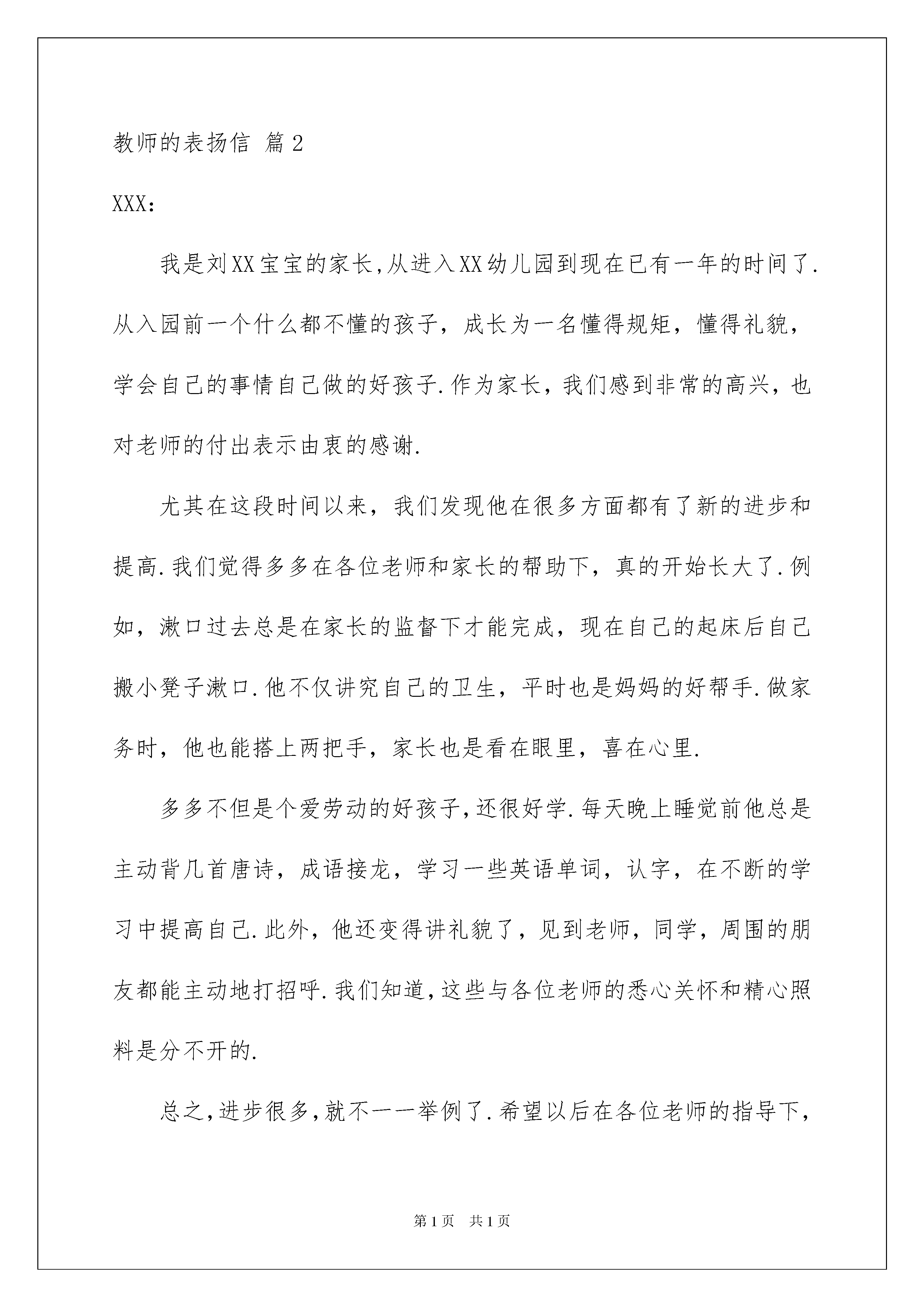 2022教师的表扬信合集六篇教师的表扬信合集六篇在当下社会,我们都跟表扬信有着直接或间接的联系,通过表扬信,可以表达对被表扬者的肯定与表扬。在写之前,可以先参考范文,以下是我整理的教师的表扬信6篇,供大家参考借鉴,希望可以帮助到有需要的朋友。教师的表扬信篇1尊敬的****幼儿园领导和老师:我是贵园亲子班悠悠小朋友的家长,今天是怀着一颗非常感激之心给你们写这封信的。说实话,和许多家长一样,在孩子入园前,我们也感到十分的困惑,因为幼儿园是孩子接触社会,参与集体的第一步,不知道如何帮助孩子走好这关键的一步,尤其我们是去年才入住到****的,对于悠悠来说,这里完全是陌生的。在老师们的耐心照顾和正确引导下,悠悠就跟变了个人似的,突然之间长大了,懂事了许多。他养成了很多良好的生活习惯,回家先洗手,勤喝水,玩完玩具会放回去,在家里不吃菜,在幼儿园却吃的相当好。独立能力也在不断提高,能独立按时睡觉,吃饭时也很规矩,不用大人帮忙,自己能做的事情自己做。记得最清楚的就是“我们老师说”:爸爸下班回家了,爸爸辛苦了,我给爸爸倒水,搬凳子;吃饭后帮妈妈洗碗、扫地;出门时帮妈妈拿东西,大东西拿不动就拿小的;懂得好东西要分享,有吃的先给爸爸妈妈,自己吃小的。记得于老师说过一件事也叫我很感动,在幼儿园看到于老师总是站着,便搬来小板凳叫老师坐,吃水果的时候也要分给老师吃,这么小的孩子能想到老师,怎么能不叫我们做家长的感动和欣慰呢?和小朋友一起玩时不仅玩具可以分享,还懂得交换,“我们可以交换玩具玩吗”。悠悠原来上学的时候总是很不情愿,一步三回头,看到老师也不愿意问好,大人提醒也不管用;现在只要老师来开门,他每一次都要冲上去和于老师大声问好,于老师总是站在门口迎接并呼喊孩子的名字,接过孩子的书包,可亲热了,和妈妈再见后头也不回的走进教室,于老师脸上始终洋溢着母爱般的笑容,一直温暖着我们的心。老师还耐心的跟我们讲解孩子在园的表现,悠悠有些害羞,贾老师说可以带他多出去和小朋友们玩,现在到了外面不管认不认识,和大部分孩子都能玩到一起;老师上课的时候孩子坐不住,而且注意力不集中,贾老师说可以叫他多玩些静的游戏,经过老师的指导悠悠现在可以很专心的听老师上课,即使是在家里玩一种玩具都能玩很长时间;于老师说养成良好的习惯可以让图画书来帮忙,现在悠悠不仅有良好的阅读习惯,而且语言表达能力也有显著的提高;于老师说要培养孩子的表现力,悠悠刚来幼儿园的时候不仅害羞而且胆小,我们就带他多参加亲子活动,鼓励他上台表演。她们不仅要教授教学课程,还要关心孩子的“吃喝拉撒”,工作量很大,十分辛苦,但她们毫无怨言。刚开始悠悠在幼儿园尿裤,拉粑,于老师都给洗干净了。有的孩子不管怎么哭闹,不管有多么难缠,老师从不对孩子大喊大叫,而是向对待自己的孩子一样,不厌其烦,认真引导,老师们在孩子身上倾注了多少心血和爱心!这种充满人性化的教育管理方式,让我们这些家长很放心。孩子身上承载着我们全部的希望,很幸运孩子遇上这么好的老师,没有老师这段时期的指导我们年轻家长的育儿方法不会有很大的改进,孩子不好的行为要先从家长身上找原因,对孩子不打骂,小孩是很讲道理的,不放纵、娇惯孩子,教育方法和幼儿园结合,做到家园统一,良好的习惯可以让孩子受益终生!微笑,挂在孩子们的脸上;感激,流进母亲们的心窝。我们衷心感谢幼儿园的于老师、贾老师、郝老师及教育过、关心过、帮助过悠悠的所有老师!感谢园长的辛勤工作,感谢园长领导出这样出色的幼儿园!有了你们,我们看到了孩子美好的未来!祝福老师们工作顺利、身体健康、万事如意!此致敬礼!xx20xx年x月x日教师的表扬信篇2XXX:我是刘XX宝宝的家长,从进入XX幼儿园到现在已有一年的时间了.从入园前一个什么都不懂的孩子,成长为一名懂得规矩,懂得礼貌,学会自己的事情自己做的好孩子.作为家长,我们感到非常的高兴,也对老师的付出表示由衷的感谢.尤其在这段时间以来,我们发现他在很多方面都有了新的进步和提高.我们觉得多多在各位老师和家长的帮助下,真的开始长大了.例如,漱口过去总是在家长的监督下才能完成,现在自己的起床后自己搬小凳子漱口.他不仅讲究自己的卫生,平时也是妈妈的好帮手.做家务时,他也能搭上两把手,家长也是看在眼里,喜在心里.多多不但是个爱劳动的好孩子,还很好学.每天晚上睡觉前他总是主动背几首唐诗,成语接龙,学习一些英语单词,认字,在不断的学习中提高自己.此外,他还变得讲礼貌了,见到老师,同学,周围的朋友都能主动地打招呼.我们知道,这些与各位老师的悉心关怀和精心照料是分不开的.总之,进步很多,就不一一举例了.希望以后在各位老师的指导下,认真学