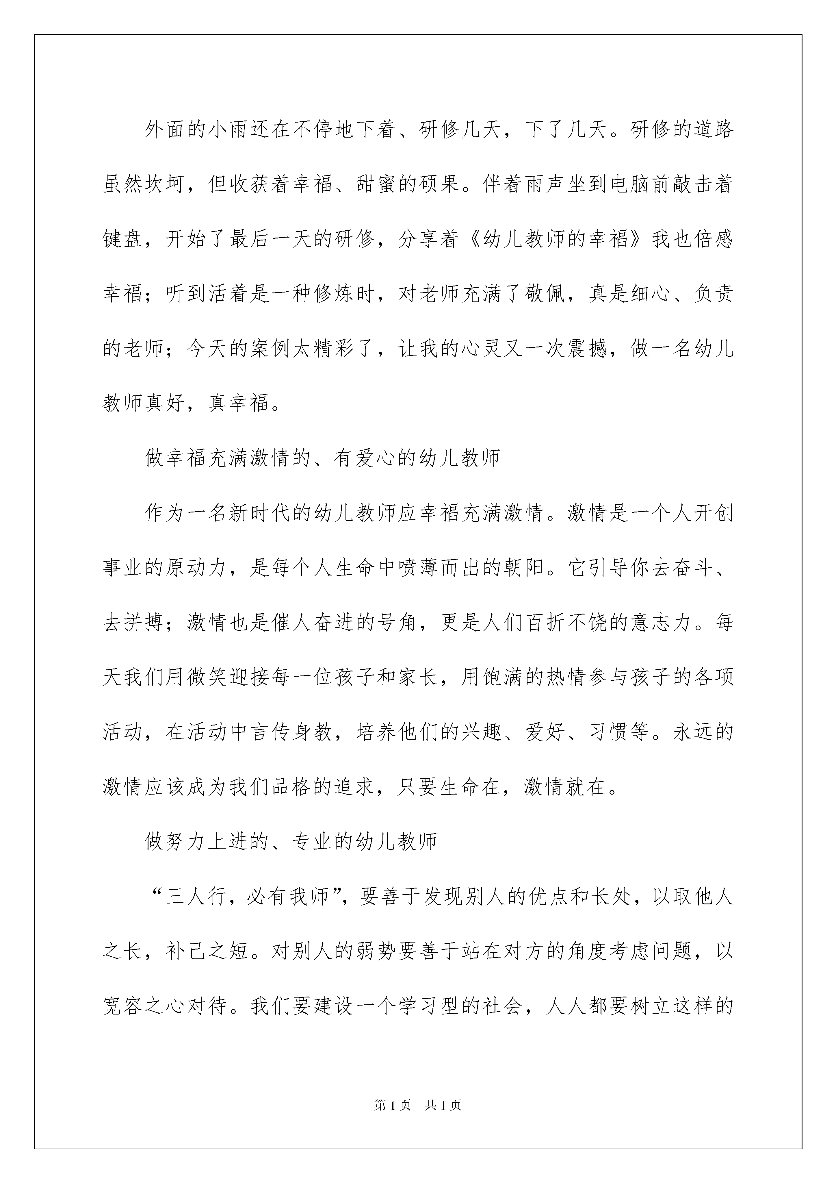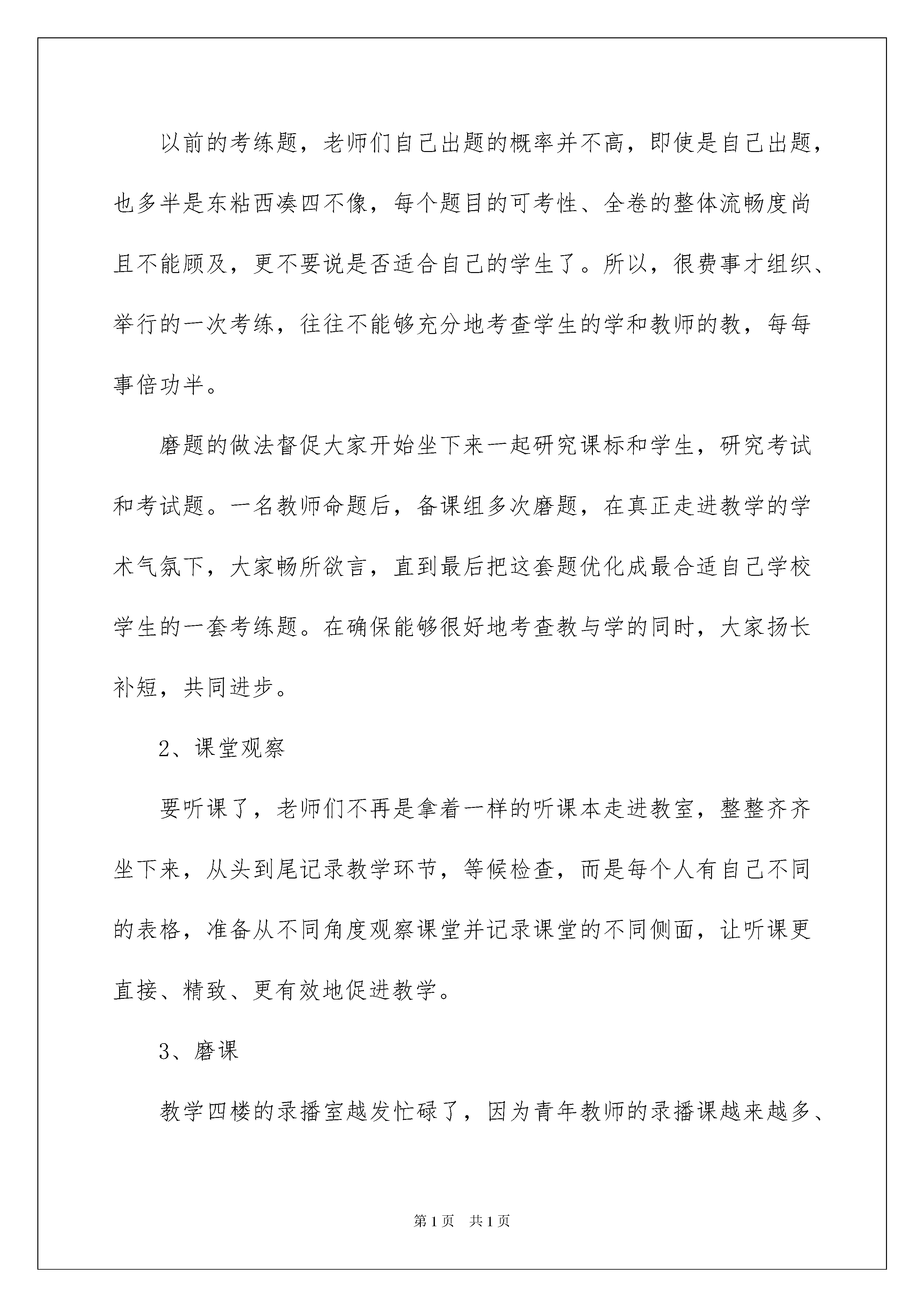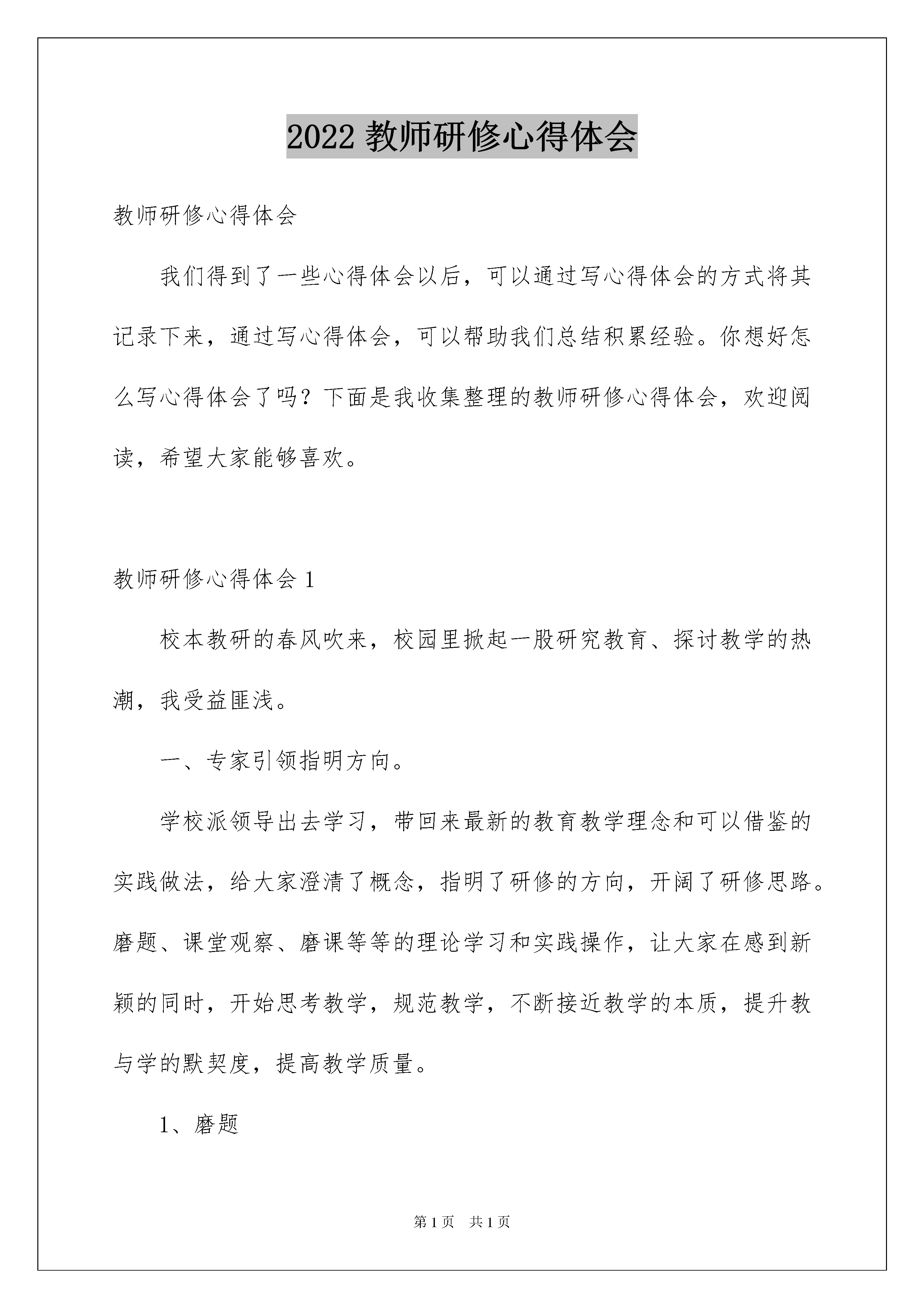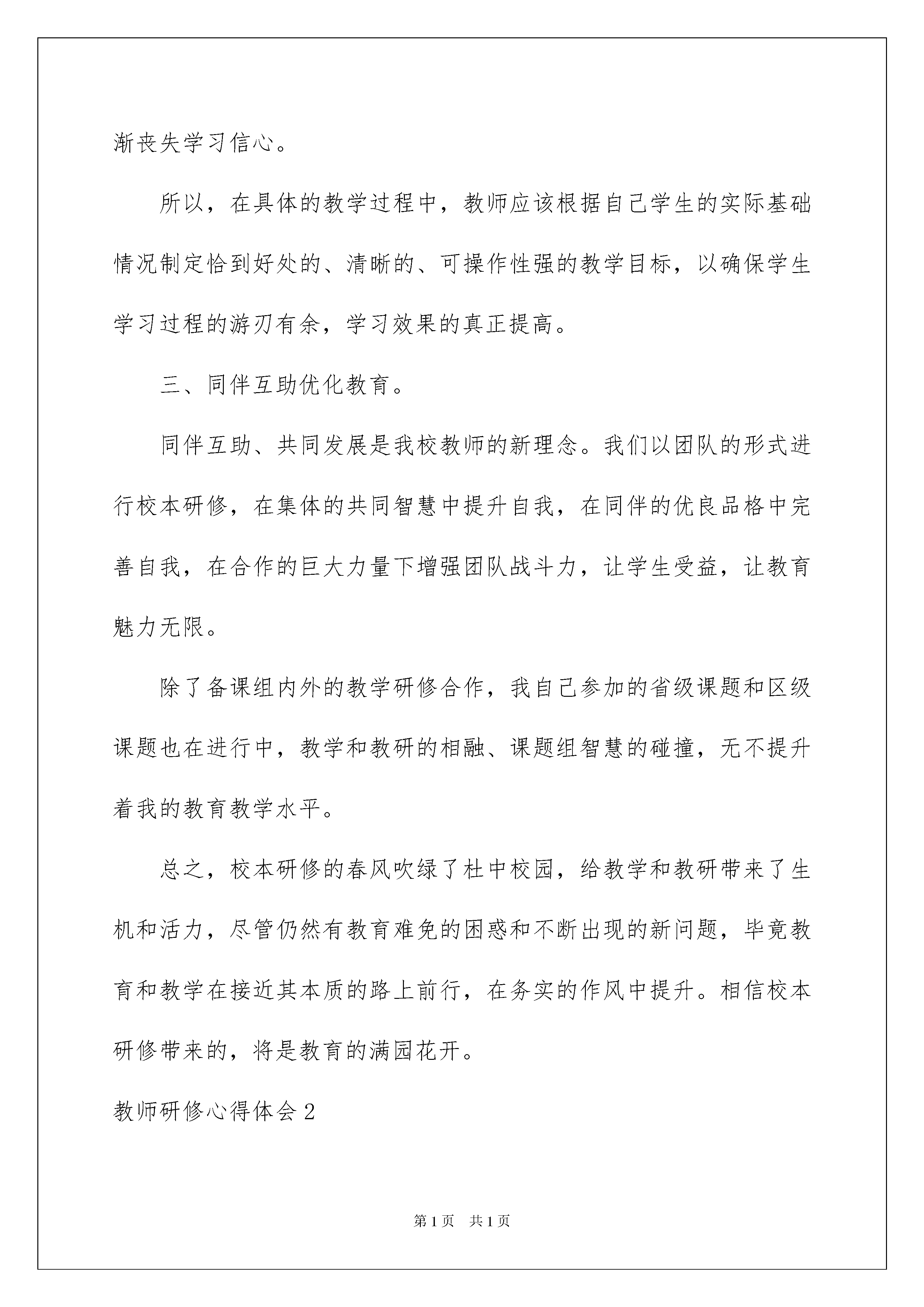 2022教师研修心得体会教师研修心得体会我们得到了一些心得体会以后,可以通过写心得体会的方式将其记录下来,通过写心得体会,可以帮助我们总结积累经验。你想好怎么写心得体会了吗?下面是我收集整理的教师研修心得体会,欢迎阅读,希望大家能够喜欢。教师研修心得体会1校本教研的春风吹来,校园里掀起一股研究教育、探讨教学的热潮,我受益匪浅。一、专家引领指明方向。学校派领导出去学习,带回来最新的教育教学理念和可以借鉴的实践做法,给大家澄清了概念,指明了研修的方向,开阔了研修思路。磨题、课堂观察、磨课等等的理论学习和实践操作,让大家在感到新颖的同时,开始思考教学,规范教学,不断接近教学的本质,提升教与学的默契度,提高教学质量。1、磨题以前的考练题,老师们自己出题的概率并不高,即使是自己出题,也多半是东粘西凑四不像,每个题目的可考性、全卷的整体流畅度尚且不能顾及,更不要说是否适合自己的学生了。所以,很费事才组织、举行的一次考练,往往不能够充分地考查学生的学和教师的教,每每事倍功半。磨题的做法督促大家开始坐下来一起研究课标和学生,研究考试和考试题。一名教师命题后,备课组多次磨题,在真正走进教学的学术气氛下,大家畅所欲言,直到最后把这套题优化成最合适自己学校学生的一套考练题。在确保能够很好地考查教与学的同时,大家扬长补短,共同进步。2、课堂观察要听课了,老师们不再是拿着一样的听课本走进教室,整整齐齐坐下来,从头到尾记录教学环节,等候检查,而是每个人有自己不同的表格,准备从不同角度观察课堂并记录课堂的不同侧面,让听课更直接、精致、更有效地促进教学。3、磨课教学四楼的录播室越发忙碌了,因为青年教师的录播课越来越多、越来越好。每一节课都是经过备课组反复打磨的。导课是否简洁?课堂设计是否遵循科学突出重点突破难点?教师追问是否准确?学生参与度是否提高?点拨是否及时到位?小结环节有没有缺失?课堂训练题是否典型?课堂评价怎样?听课人多方位的观察,讲课人全面的提升,因而,每一节课都有相当高的质量,直接受益的,是学生。二、自我反思纠正行为。在教学实践中,每位教师都不断反思自己。我最深的体会是教学目标对教学效果的影响。我发现,学生学习效果欠佳,是有原因的。而这其中最重要的原因之一,可能就是教学目标的不明确了。也就是说,教学效果不好,论起该负的责任来,老师首当其冲。教学效果不明确,会有什么影响呢?1、太多的内容、太高的目标会使学生望而却步,或者干脆选择放弃。2、太少的内容、太低的目标会使学生失去兴趣,或者盲目得意忘形。3、教学目标不清晰,会使学生摸不着头脑,学习过程中无所适从。4、教学目标偏离,会使学生因明显的学考分离和衔接不自然而逐渐丧失学习信心。所以,在具体的教学过程中,教师应该根据自己学生的实际基础情况制定恰到好处的、清晰的、可操作性强的教学目标,以确保学生学习过程的游刃有余,学习效果的真正提高。三、同伴互助优化教育。同伴互助、共同发展是我校教师的新理念。我们以团队的形式进行校本研修,在集体的共同智慧中提升自我,在同伴的优良品格中完善自我,在合作的巨大力量下增强团队战斗力,让学生受益,让教育魅力无限。除了备课组内外的教学研修合作,我自己参加的省级课题和区级课题也在进行中,教学和教研的相融、课题组智慧的碰撞,无不提升着我的教育教学水平。总之,校本研修的春风吹绿了杜中校园,给教学和教研带来了生机和活力,尽管仍然有教育难免的困惑和不断出现的新问题,毕竟教育和教学在接近其本质的路上前行,在务实的作风中提升。相信校本研修带来的,将是教育的满园花开。教师研修心得体会2外面的小雨还在不停地下着、研修几天,下了几天。研修的道路虽然坎坷,但收获着幸福、甜蜜的硕果。伴着雨声坐到电脑前敲击着键盘,开始了最后一天的研修,分享着《幼儿教师的幸福》我也倍感幸福;听到活着是一种修炼时,对老师充满了敬佩,真是细心、负责的老师;今天的案例太精彩了,让我的心灵又一次震撼,做一名幼儿教师真好,真幸福。做幸福充满激情的、有爱心的幼儿教师作为一名新时代的幼儿教师应幸福充满激情。激情是一个人开创事业的原动力,是每个人生命中喷薄而出的朝阳。它引导你去奋斗、去拼搏;激情也是催人奋进的号角,更是人们百折不饶的意志力。每天我们用微笑迎接每一位孩子和家长,用饱满的热情参与孩子的各项活动,在活动中言传身教,培养他们的兴趣、爱好、习惯等。永远的激情应该成为我们品格的追求,只要生命在,激情就在。做努力上进的、专业的幼儿教师“三人行,必有我师”,要善于发现别人的优点和长处,以取他人之长,补己之短。对别人的弱势要善于站在对方的角度考虑问题,以宽容之心对待。我们要建设一个学习