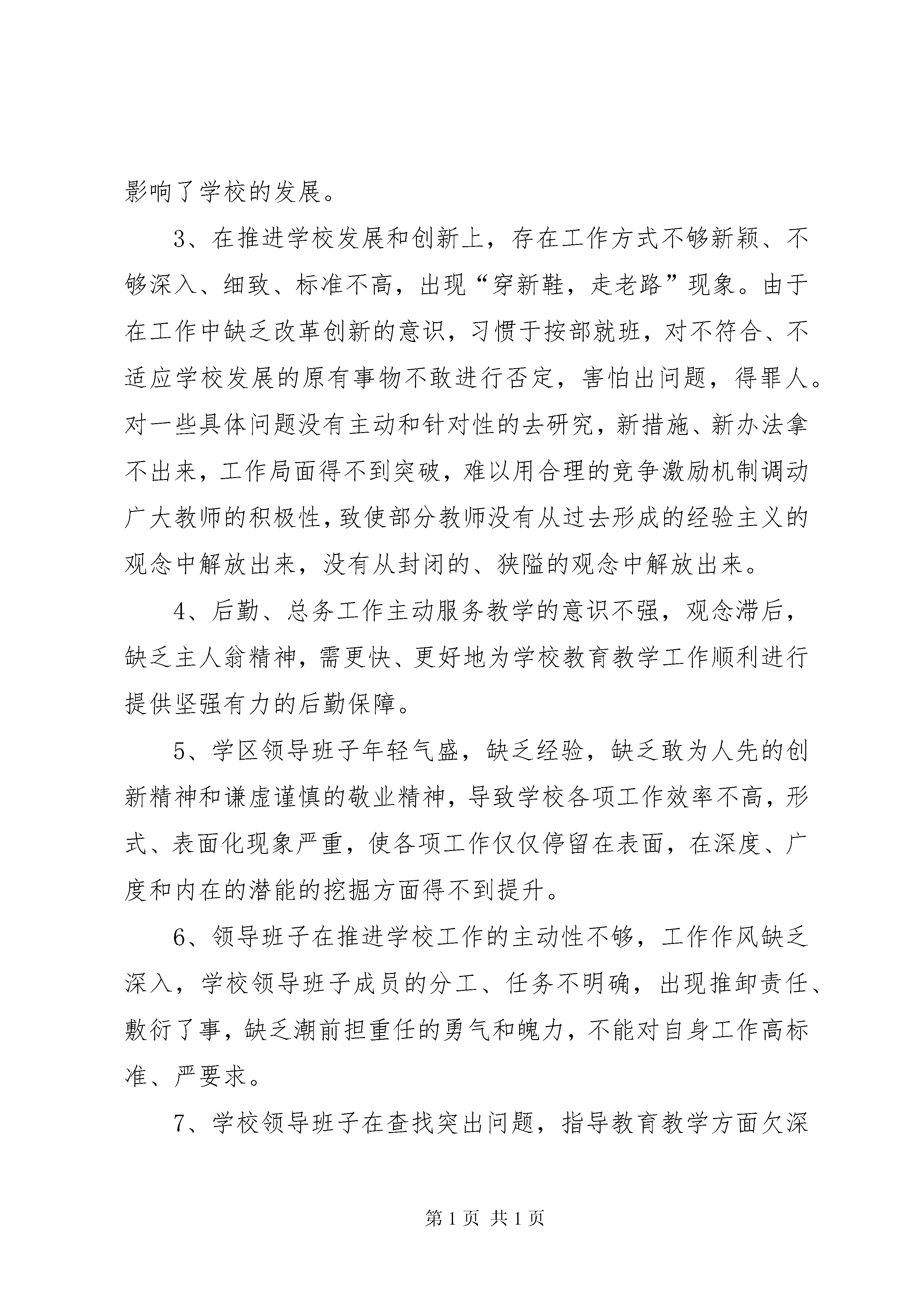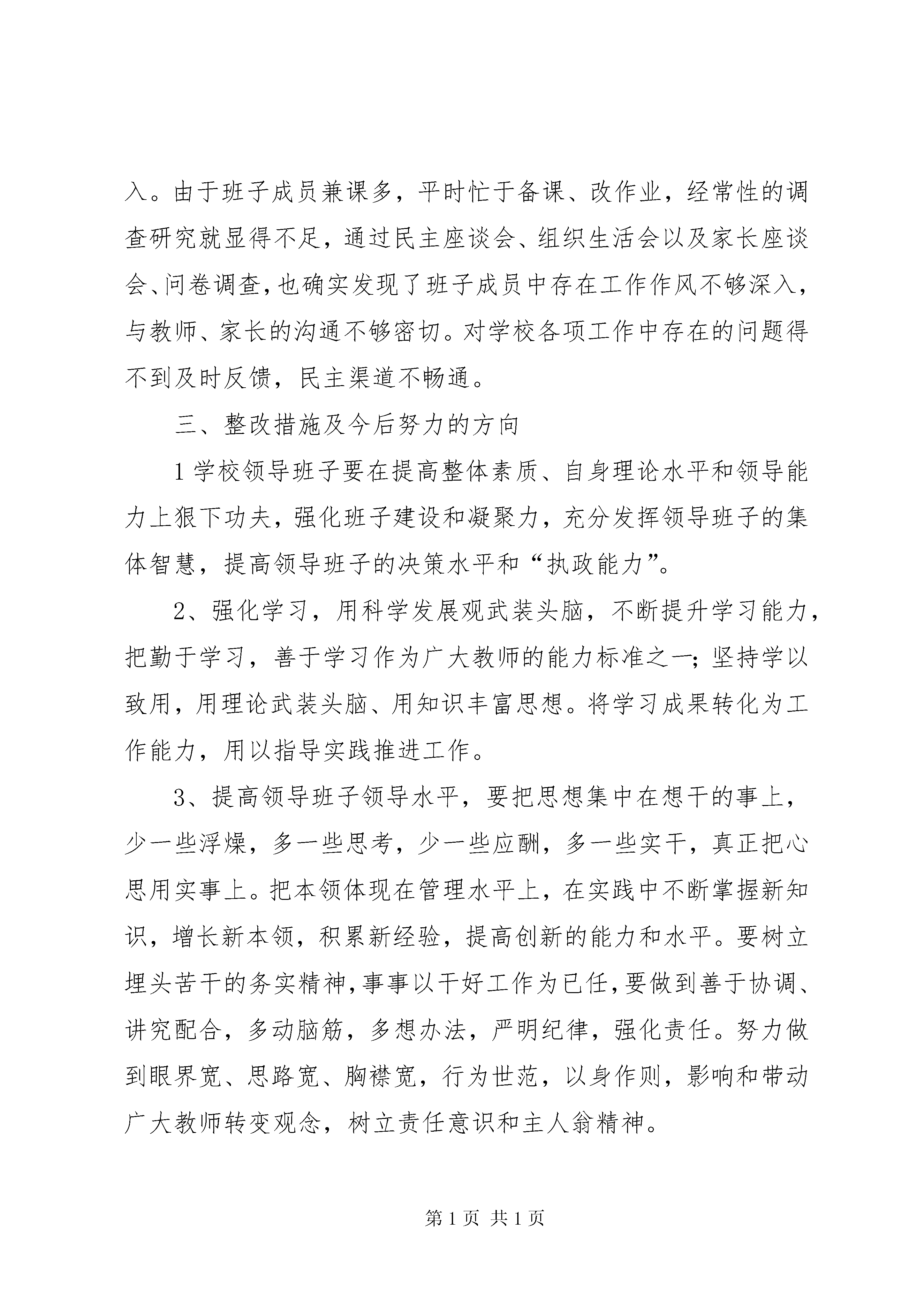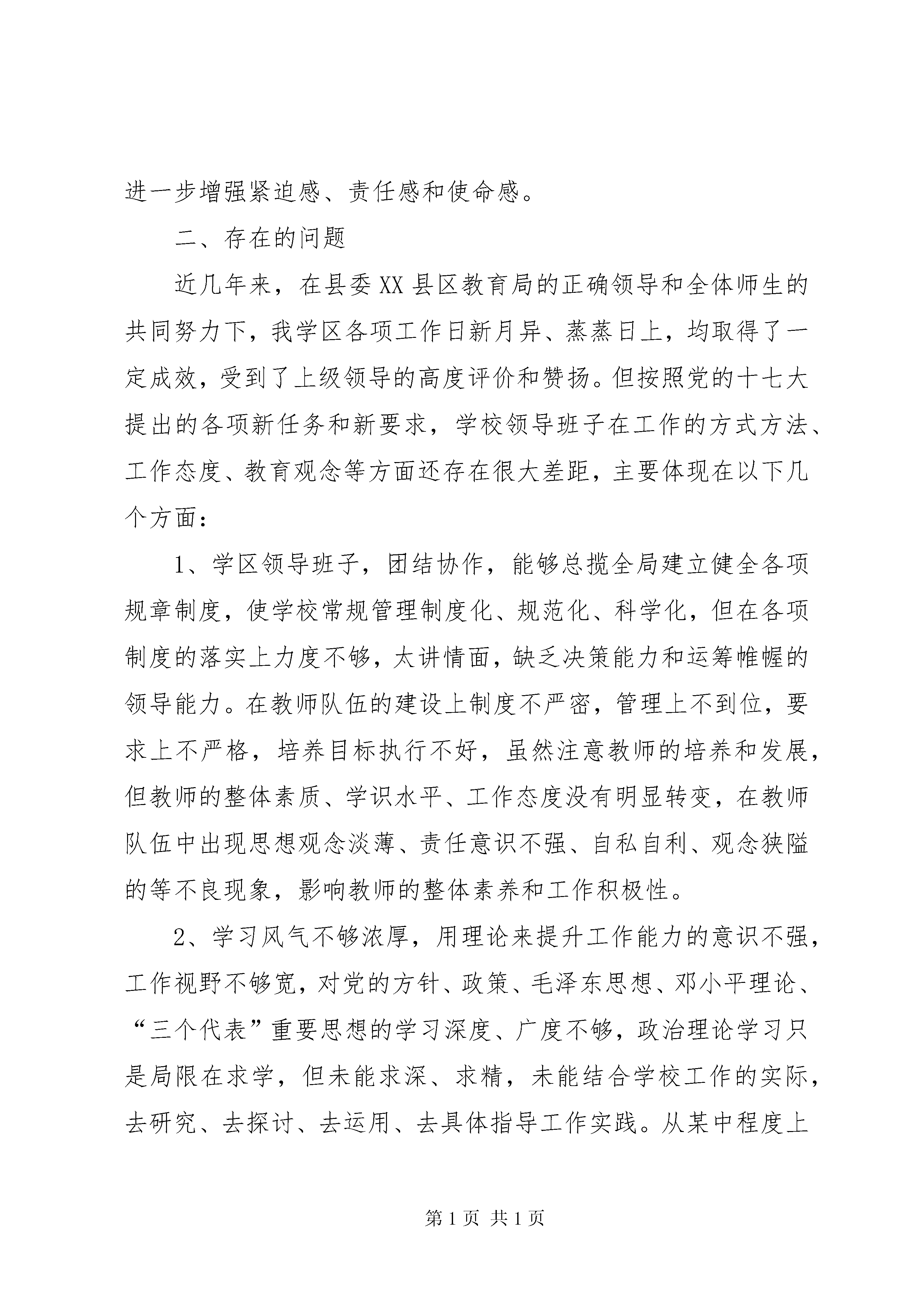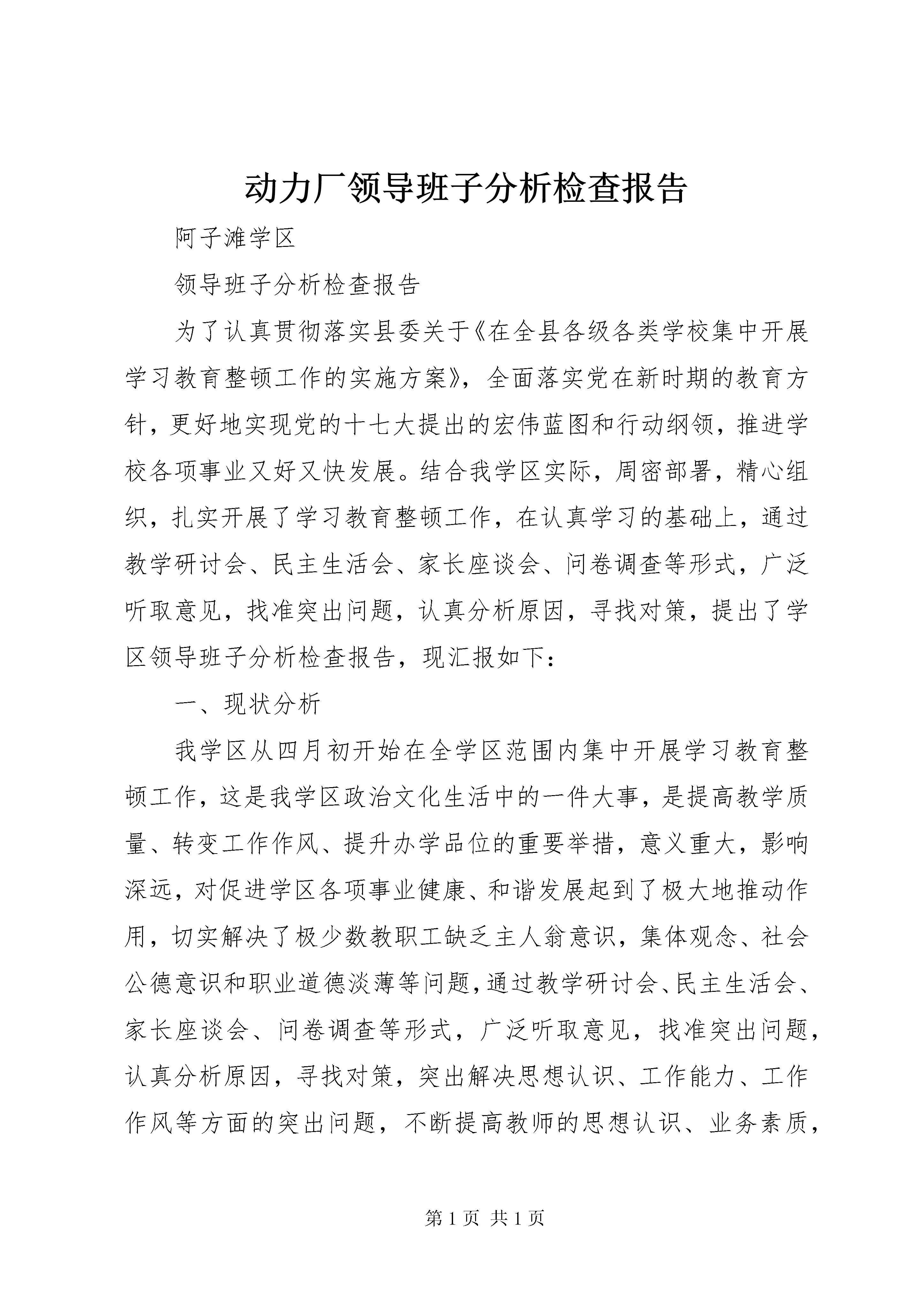 动力厂领导班子分析检查报告阿子滩学区领导班子分析检查报告为了认真贯彻落实县委关于《在全县各级各类学校集中开展学习教育整顿工作的实施方案》,全面落实党在新时期的教育方针,更好地实现党的十七大提出的宏伟蓝图和行动纲领,推进学校各项事业又好又快发展。结合我学区实际,周密部署,精心组织,扎实开展了学习教育整顿工作,在认真学习的基础上,通过教学研讨会、民主生活会、家长座谈会、问卷调查等形式,广泛听取意见,找准突出问题,认真分析原因,寻找对策,提出了学区领导班子分析检查报告,现汇报如下:一、现状分析我学区从四月初开始在全学区范围内集中开展学习教育整顿工作,这是我学区政治文化生活中的一件大事,是提高教学质量、转变工作作风、提升办学品位的重要举措,意义重大,影响深远,对促进学区各项事业健康、和谐发展起到了极大地推动作用,切实解决了极少数教职工缺乏主人翁意识,集体观念、社会公德意识和职业道德淡薄等问题,通过教学研讨会、民主生活会、家长座谈会、问卷调查等形式,广泛听取意见,找准突出问题,认真分析原因,寻找对策,突出解决思想认识、工作能力、工作作风等方面的突出问题,不断提高教师的思想认识、业务素质,进一步增强紧迫感、责任感和使命感。二、存在的问题近几年来,在县委XX县区教育局的正确领导和全体师生的共同努力下,我学区各项工作日新月异、蒸蒸日上,均取得了一定成效,受到了上级领导的高度评价和赞扬。但按照党的十七大提出的各项新任务和新要求,学校领导班子在工作的方式方法、工作态度、教育观念等方面还存在很大差距,主要体现在以下几个方面:1、学区领导班子,团结协作,能够总揽全局建立健全各项规章制度,使学校常规管理制度化、规范化、科学化,但在各项制度的落实上力度不够,太讲情面,缺乏决策能力和运筹帷幄的领导能力。在教师队伍的建设上制度不严密,管理上不到位,要求上不严格,培养目标执行不好,虽然注意教师的培养和发展,但教师的整体素质、学识水平、工作态度没有明显转变,在教师队伍中出现思想观念淡薄、责任意识不强、自私自利、观念狭隘的等不良现象,影响教师的整体素养和工作积极性。2、学习风气不够浓厚,用理论来提升工作能力的意识不强,工作视野不够宽,对党的方针、政策、毛泽东思想、邓小平理论、“三个代表”重要思想的学习深度、广度不够,政治理论学习只是局限在求学,但未能求深、求精,未能结合学校工作的实际,去研究、去探讨、去运用、去具体指导工作实践。从某中程度上影响了学校的发展。3、在推进学校发展和创新上,存在工作方式不够新颖、不够深入、细致、标准不高,出现“穿新鞋,走老路”现象。由于在工作中缺乏改革创新的意识,习惯于按部就班,对不符合、不适应学校发展的原有事物不敢进行否定,害怕出问题,得罪人。对一些具体问题没有主动和针对性的去研究,新措施、新办法拿不出来,工作局面得不到突破,难以用合理的竞争激励机制调动广大教师的积极性,致使部分教师没有从过去形成的经验主义的观念中解放出来,没有从封闭的、狭隘的观念中解放出来。4、后勤、总务工作主动服务教学的意识不强,观念滞后,缺乏主人翁精神,需更快、更好地为学校教育教学工作顺利进行提供坚强有力的后勤保障。5、学区领导班子年轻气盛,缺乏经验,缺乏敢为人先的创新精神和谦虚谨慎的敬业精神,导致学校各项工作效率不高,形式、表面化现象严重,使各项工作仅仅停留在表面,在深度、广度和内在的潜能的挖掘方面得不到提升。6、领导班子在推进学校工作的主动性不够,工作作风缺乏深入,学校领导班子成员的分工、任务不明确,出现推卸责任、敷衍了事,缺乏潮前担重任的勇气和魄力,不能对自身工作高标准、严要求。7、学校领导班子在查找突出问题,指导教育教学方面欠深入。由于班子成员兼课多,平时忙于备课、改作业,经常性的调查研究就显得不足,通过民主座谈会、组织生活会以及家长座谈会、问卷调查,也确实发现了班子成员中存在工作作风不够深入,与教师、家长的沟通不够密切。对学校各项工作中存在的问题得不到及时反馈,民主渠道不畅通。三、整改措施及今后努力的方向1学校领导班子要在提高整体素质、自身理论水平和领导能力上狠下功夫,强化班子建设和凝聚力,充分发挥领导班子的集体智慧,提高领导班子的决策水平和“执政能力”。2、强化学习,用科学发展观武装头脑,不断提升学习能力,把勤于学习,善于学习作为广大教师的能力标准之一;坚持学以致用,用理论武装头脑、用知识丰富思想。将学习成果转化为工作能力,用以指导实践推进工作。3、提高领导班子领导水平,要把思想集中在想干的事上,少一些浮燥,多一些思考,少一些应酬,多一些实干,真正把心思用实事上。把本领体现在管理水平上,在实践中不断掌握新知识,增长新本领,积累新经验,提高创新的能力和水平。要树立埋头苦干的务实精神,事事以干好工作为已任,要做到善于协调、讲究配