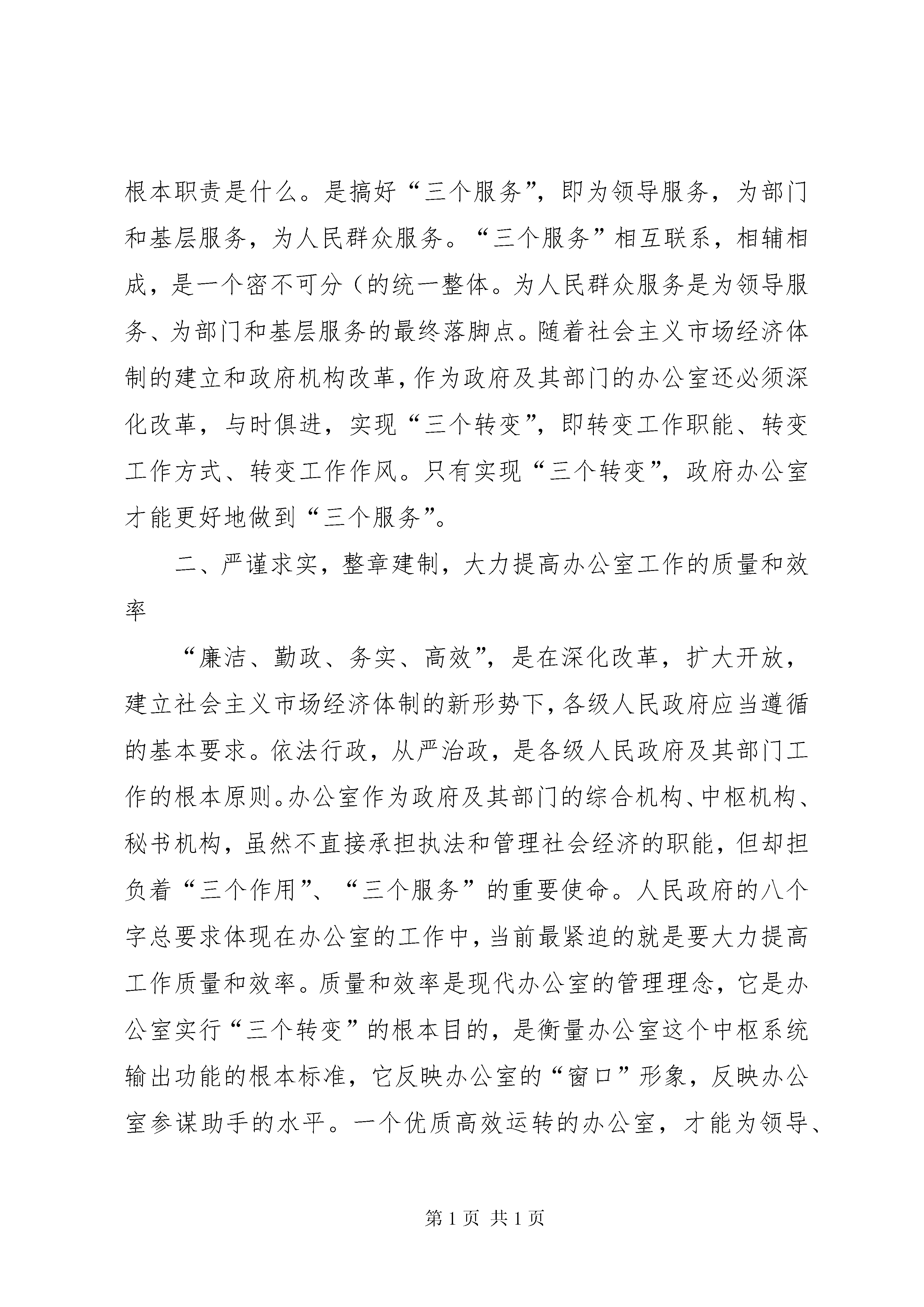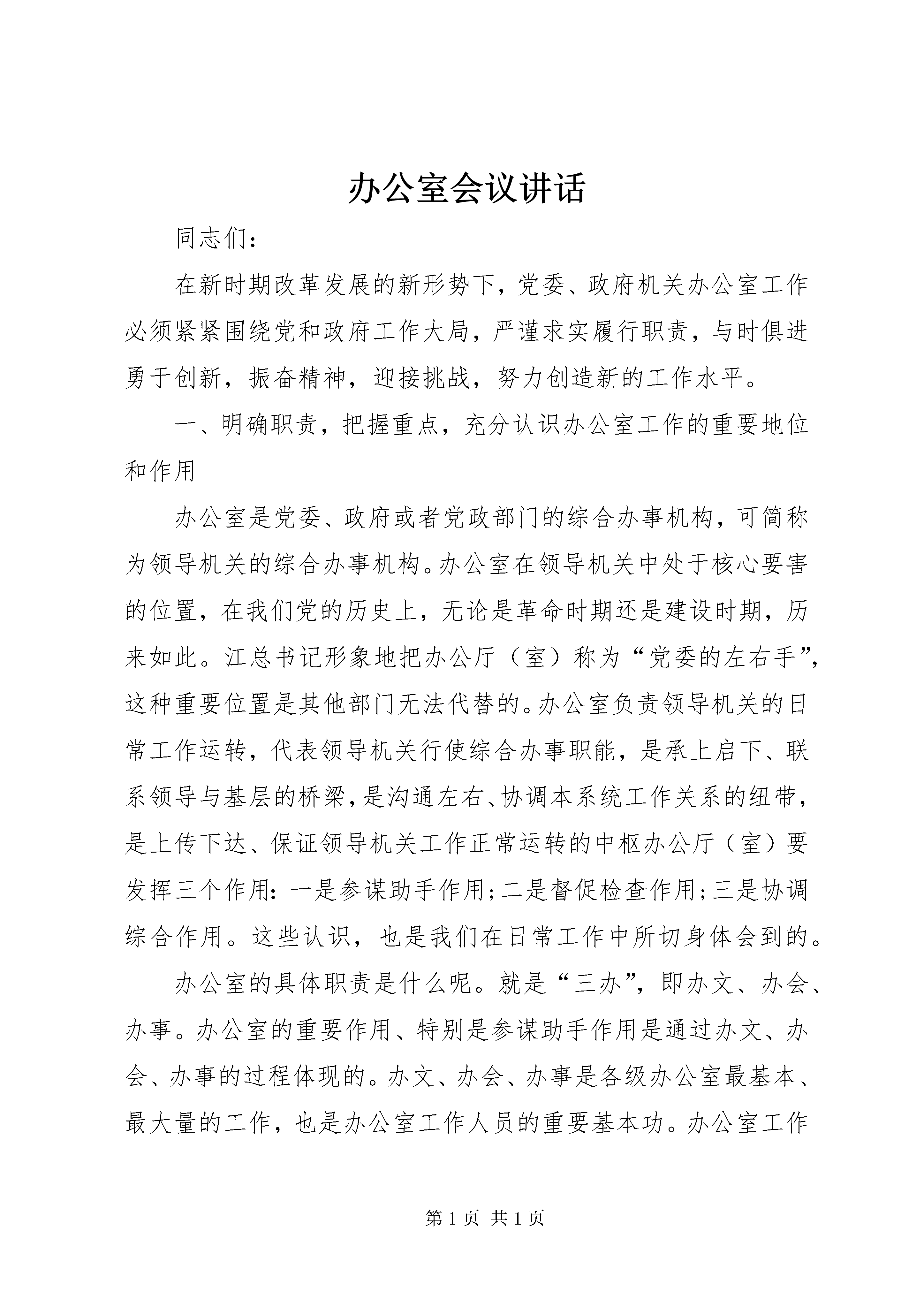 办公室会议讲话同志们:在新时期改革发展的新形势下,党委、政府机关办公室工作必须紧紧围绕党和政府工作大局,严谨求实履行职责,与时俱进勇于创新,振奋精神,迎接挑战,努力创造新的工作水平。一、明确职责,把握重点,充分认识办公室工作的重要地位和作用办公室是党委、政府或者党政部门的综合办事机构,可简称为领导机关的综合办事机构。办公室在领导机关中处于核心要害的位置,在我们党的历史上,无论是革命时期还是建设时期,历来如此。江总书记形象地把办公厅(室)称为“党委的左右手”,这种重要位置是其他部门无法代替的。办公室负责领导机关的日常工作运转,代表领导机关行使综合办事职能,是承上启下、联系领导与基层的桥梁,是沟通左右、协调本系统工作关系的纽带,是上传下达、保证领导机关工作正常运转的中枢办公厅(室)要发挥三个作用:一是参谋助手作用;二是督促检查作用;三是协调综合作用。这些认识,也是我们在日常工作中所切身体会到的。办公室的具体职责是什么呢。就是“三办”,即办文、办会、办事。办公室的重要作用、特别是参谋助手作用是通过办文、办会、办事的过程体现的。办文、办会、办事是各级办公室最基本、最大量的工作,也是办公室工作人员的重要基本功。办公室工作根本职责是什么。是搞好“三个服务”,即为领导服务,为部门和基层服务,为人民群众服务。“三个服务”相互联系,相辅相成,是一个密不可分(的统一整体。为人民群众服务是为领导服务、为部门和基层服务的最终落脚点。随着社会主义市场经济体制的建立和政府机构改革,作为政府及其部门的办公室还必须深化改革,与时俱进,实现“三个转变”,即转变工作职能、转变工作方式、转变工作作风。只有实现“三个转变”,政府办公室才能更好地做到“三个服务”。二、严谨求实,整章建制,大力提高办公室工作的质量和效率“廉洁、勤政、务实、高效”,是在深化改革,扩大开放,建立社会主义市场经济体制的新形势下,各级人民政府应当遵循的基本要求。依法行政,从严治政,是各级人民政府及其部门工作的根本原则。办公室作为政府及其部门的综合机构、中枢机构、秘书机构,虽然不直接承担执法和管理社会经济的职能,但却担负着“三个作用”、“三个服务”的重要使命。人民政府的八个字总要求体现在办公室的工作中,当前最紧迫的就是要大力提高工作质量和效率。质量和效率是现代办公室的管理理念,它是办公室实行“三个转变”的根本目的,是衡量办公室这个中枢系统输出功能的根本标准,它反映办公室的“窗口”形象,反映办公室参谋助手的水平。一个优质高效运转的办公室,才能为领导、为基层部门、为人民群众提供优质高效的服务,也才能达到让领导、基层部门和人民群众“三个满意”。怎样才能提高政府机关办公室工作的质量和效率呢。对此我认为:第一,靠觉悟,就是要用敬业奉献、严谨求实的事业心、责任心来凝铸办公室工作的质量和效率。