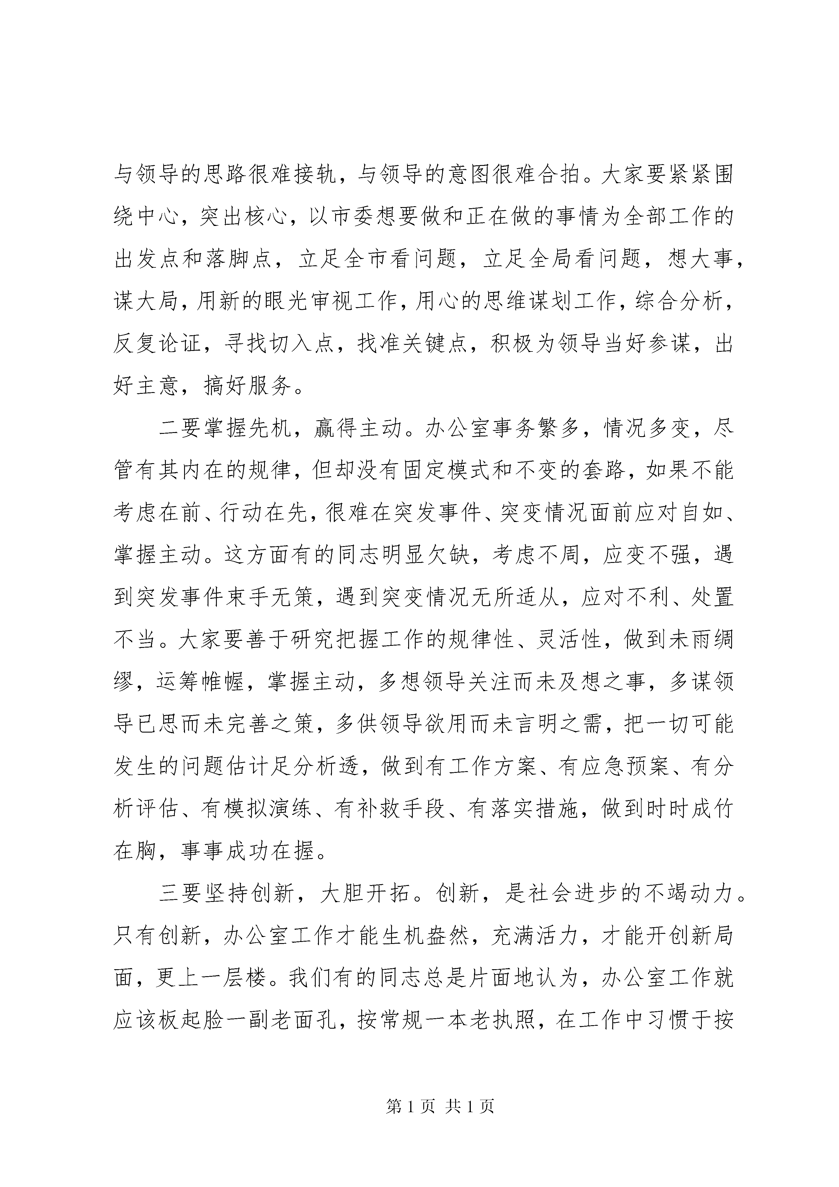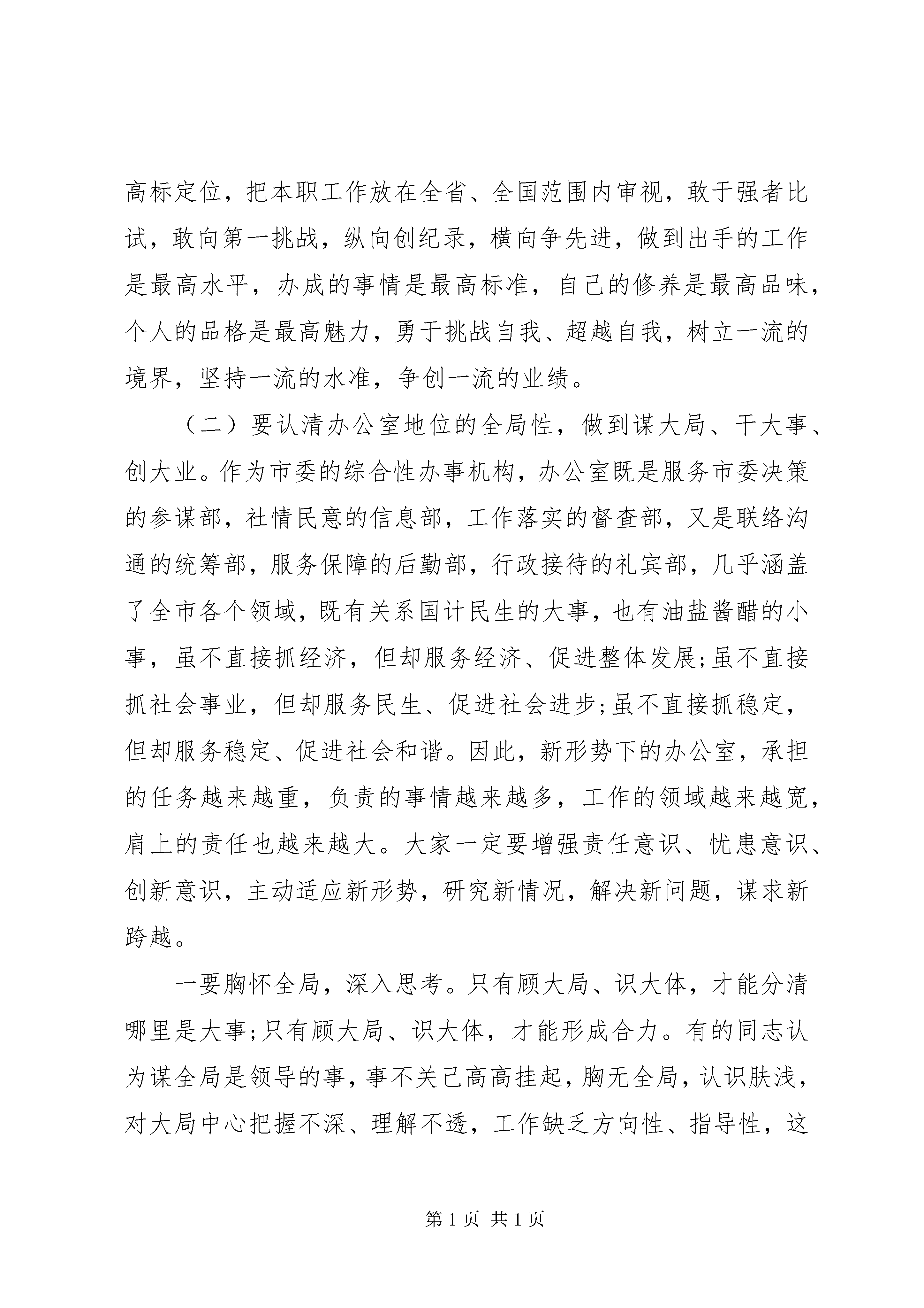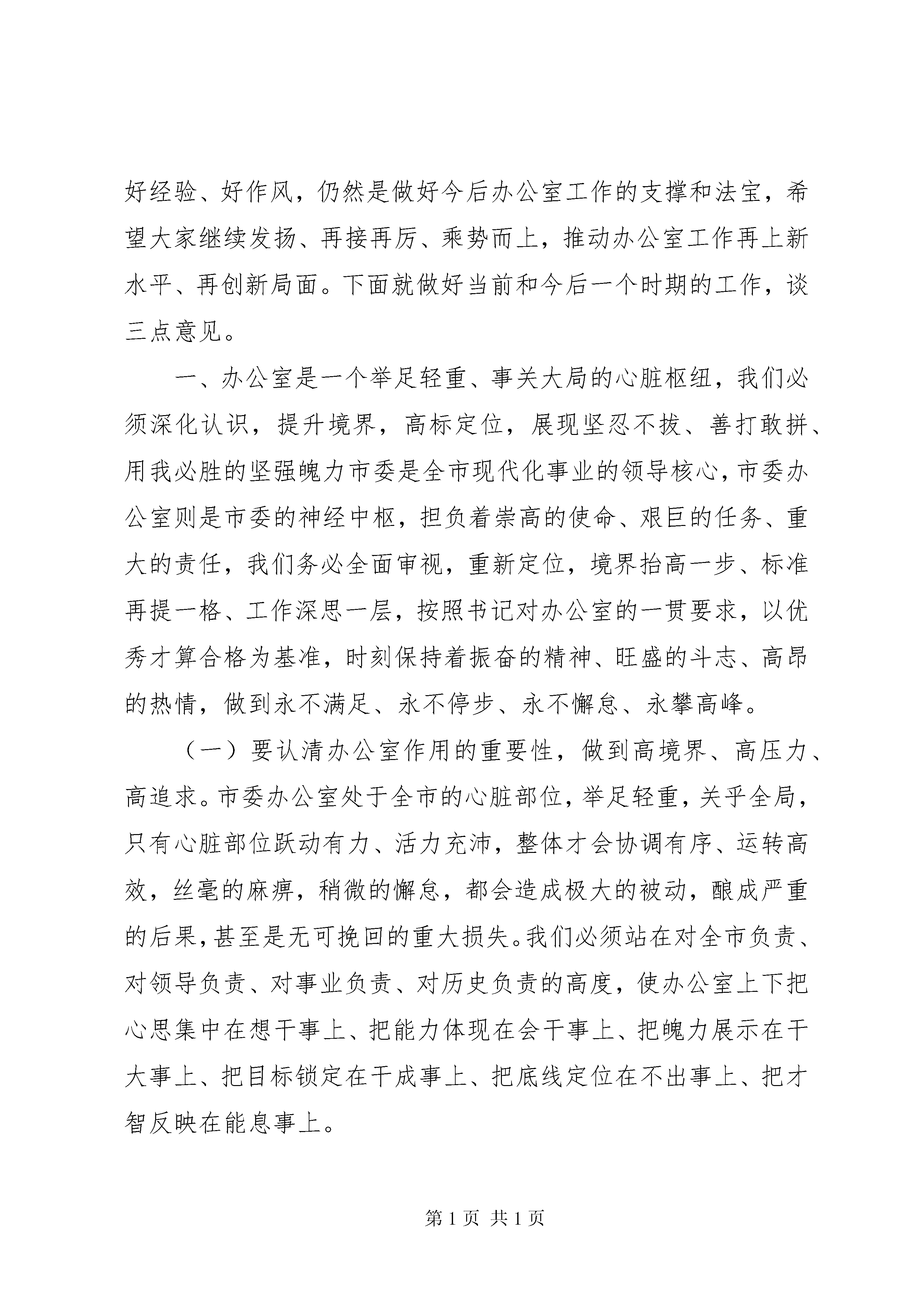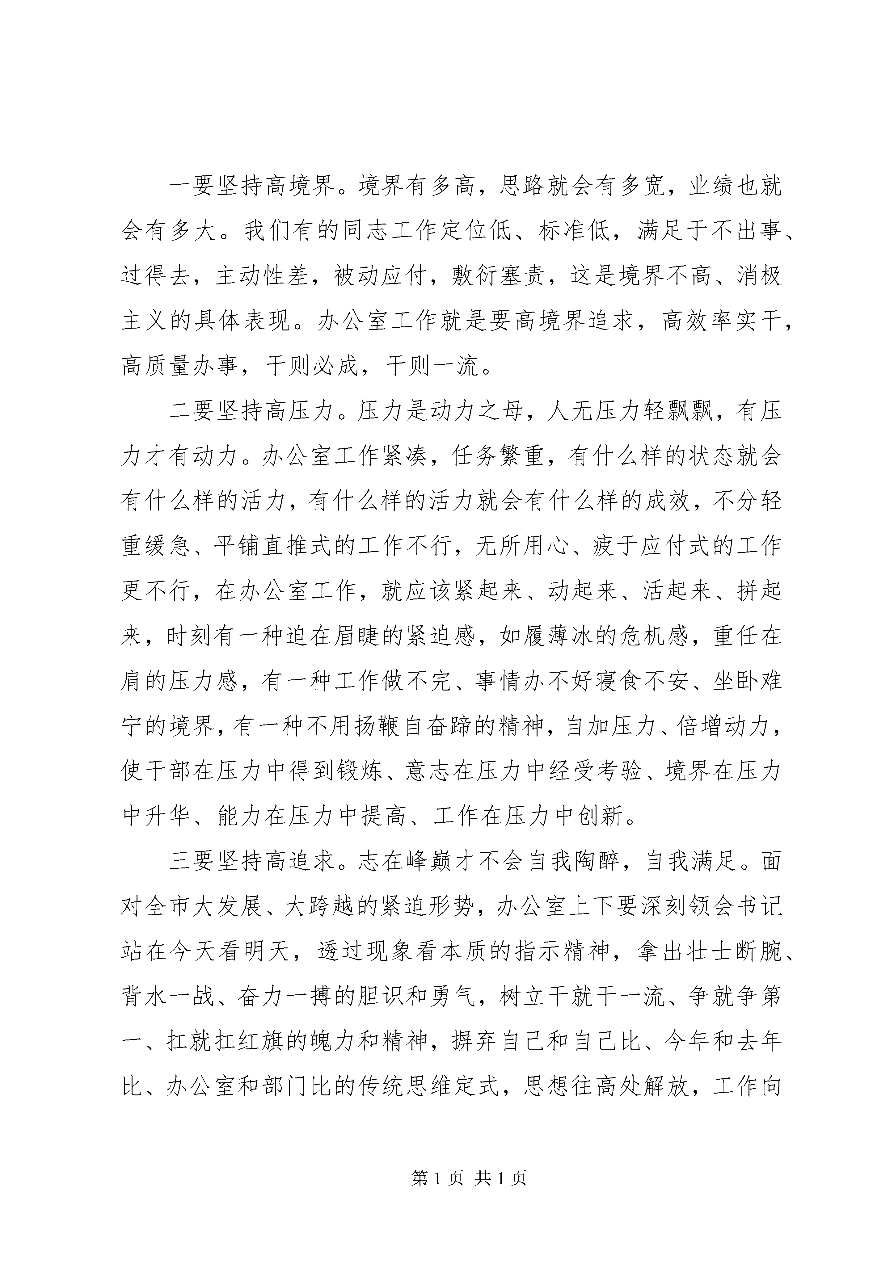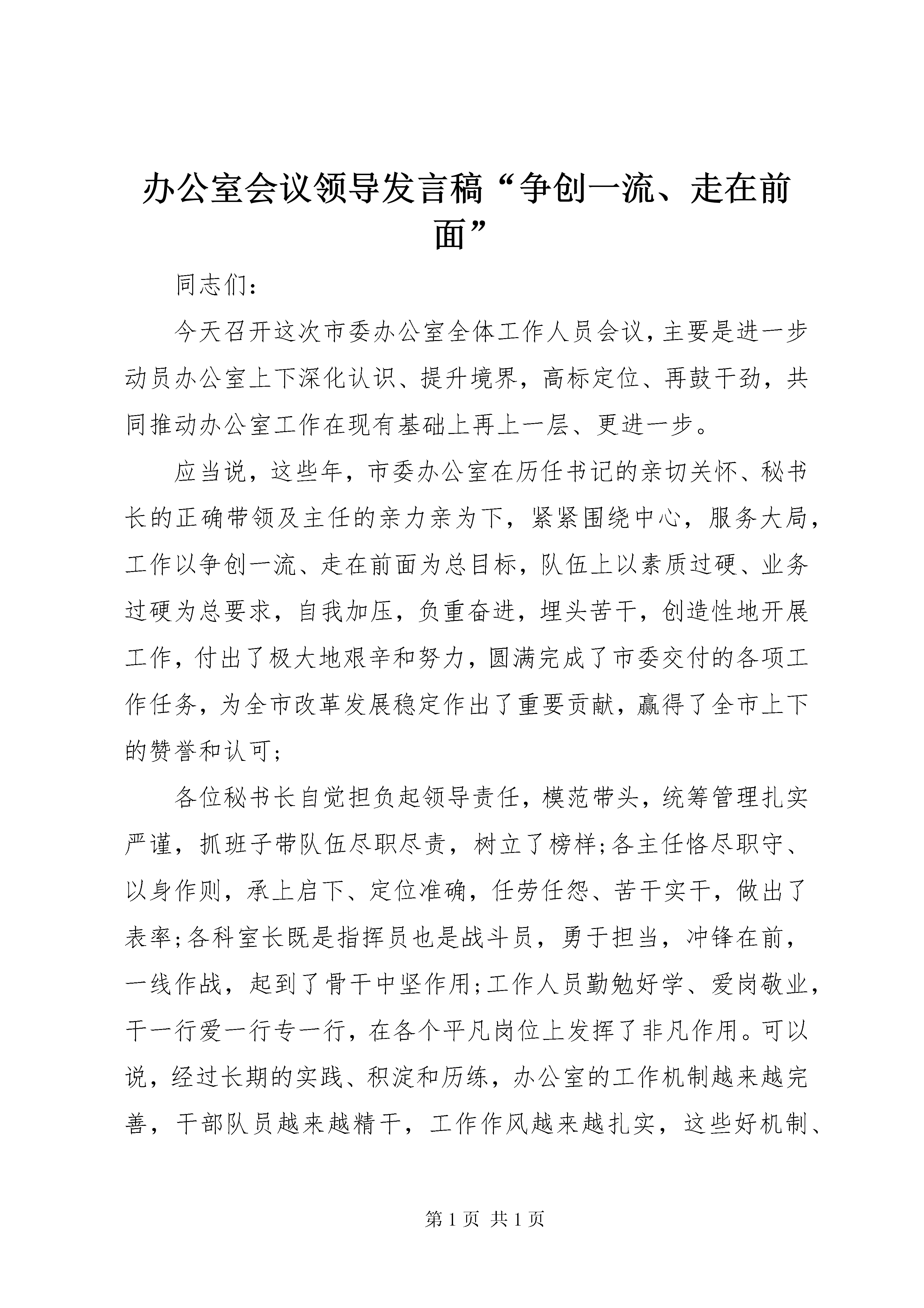 办公室会议领导发言稿“争创一流、走在前面”同志们:今天召开这次市委办公室全体工作人员会议,主要是进一步动员办公室上下深化认识、提升境界,高标定位、再鼓干劲,共同推动办公室工作在现有基础上再上一层、更进一步。应当说,这些年,市委办公室在历任书记的亲切关怀、秘书长的正确带领及主任的亲力亲为下,紧紧围绕中心,服务大局,工作以争创一流、走在前面为总目标,队伍上以素质过硬、业务过硬为总要求,自我加压,负重奋进,埋头苦干,创造性地开展工作,付出了极大地艰辛和努力,圆满完成了市委交付的各项工作任务,为全市改革发展稳定作出了重要贡献,赢得了全市上下的赞誉和认可;各位秘书长自觉担负起领导责任,模范带头,统筹管理扎实严谨,抓班子带队伍尽职尽责,树立了榜样;各主任恪尽职守、以身作则,承上启下、定位准确,任劳任怨、苦干实干,做出了表率;各科室长既是指挥员也是战斗员,勇于担当,冲锋在前,一线作战,起到了骨干中坚作用;工作人员勤勉好学、爱岗敬业,干一行爱一行专一行,在各个平凡岗位上发挥了非凡作用。可以说,经过长期的实践、积淀和历练,办公室的工作机制越来越完善,干部队员越来越精干,工作作风越来越扎实,这些好机制、好经验、好作风,仍然是做好今后办公室工作的支撑和法宝,希望大家继续发扬、再接再厉、乘势而上,推动办公室工作再上新水平、再创新局面。下面就做好当前和今后一个时期的工作,谈三点意见。一、办公室是一个举足轻重、事关大局的心脏枢纽,我们必须深化认识,提升境界,高标定位,展现坚忍不拔、善打敢拼、用我必胜的坚强魄力市委是全市现代化事业的领导核心,市委办公室则是市委的神经中枢,担负着崇高的使命、艰巨的任务、重大的责任,我们务必全面审视,重新定位,境界抬高一步、标准再提一格、工作深思一层,按照书记对办公室的一贯要求,以优秀才算合格为基准,时刻保持着振奋的精神、旺盛的斗志、高昂的热情,做到永不满足、永不停步、永不懈怠、永攀高峰。(一)要认清办公室作用的重要性,做到高境界、高压力、高追求。市委办公室处于全市的心脏部位,举足轻重,关乎全局,只有心脏部位跃动有力、活力充沛,整体才会协调有序、运转高效,丝毫的麻痹,稍微的懈怠,都会造成极大的被动,酿成严重的后果,甚至是无可挽回的重大损失。我们必须站在对全市负责、对领导负责、对事业负责、对历史负责的高度,使办公室上下把心思集中在想干事上、把能力体现在会干事上、把魄力展示在干大事上、把目标锁定在干成事上、把底线定位在不出事上、把才智反映在能息事上。一要坚持高境界。境界有多高,思路就会有多宽,业绩也就会有多大。我们有的同志工作定位低、标准低,满足于不出事、过得去,主动性差,被动应付,敷衍塞责,这是境界不高、消极主义的具体表现。办公室工作就是要高境界追求,高效率实干,高质量办事,干则必成,干则一流。二要坚持高压力。压力是动力之母,人无压力轻飘飘,有压力才有动力。办公室工作紧凑,任务繁重,有什么样的状态就会有什么样的活力,有什么样的活力就会有什么样的成效,不分轻重缓急、平铺直推式的工作不行,无所用心、疲于应付式的工作更不行,在办公室工作,就应该紧起来、动起来、活起来、拼起来,时刻有一种迫在眉睫的紧迫感,如履薄冰的危机感,重任在肩的压力感,有一种工作做不完、事情办不好寝食不安、坐卧难宁的境界,有一种不用扬鞭自奋蹄的精神,自加压力、倍增动力,使干部在压力中得到锻炼、意志在压力中经受考验、境界在压力中升华、能力在压力中提高、工作在压力中创新。三要坚持高追求。志在峰巅才不会自我陶醉,自我满足。面对全市大发展、大跨越的紧迫形势,办公室上下要深刻领会书记站在今天看明天,透过现象看本质的指示精神,拿出壮士断腕、背水一战、奋力一搏的胆识和勇气,树立干就干一流、争就争第一、扛就扛红旗的魄力和精神,摒弃自己和自己比、今年和去年比、办公室和部门比的传统思维定式,思想往高处解放,工作向高标定位,把本职工作放在全省、全国范围内审视,敢于强者比试,敢向第一挑战,纵向创纪录,横向争先进,做到出手的工作是最高水平,办成的事情是最高标准,自己的修养是最高品味,个人的品格是最高魅力,勇于挑战自我、超越自我,树立一流的境界,坚持一流的水准,争创一流的业绩。(二)要认清办公室地位的全局性,做到谋大局、干大事、创大业。作为市委的综合性办事机构,办公室既是服务市委决策的参谋部,社情民意的信息部,工作落实的督查部,又是联络沟通的统筹部,服务保障的后勤部,行政接待的礼宾部,几乎涵盖了全市各个领域,既有关系国计民生的大事,也有油盐酱醋的小事,虽不直接抓经济,但却服务经济、促进整体发展;虽不直接抓社会事业,但却服务民生、促进社会进步;虽不直接抓稳定,但却服务稳定、促进社会和谐。因此,新形势下的办公室,承担的任务越来越重,负责的事情越来越多,工作的领域越来越宽,