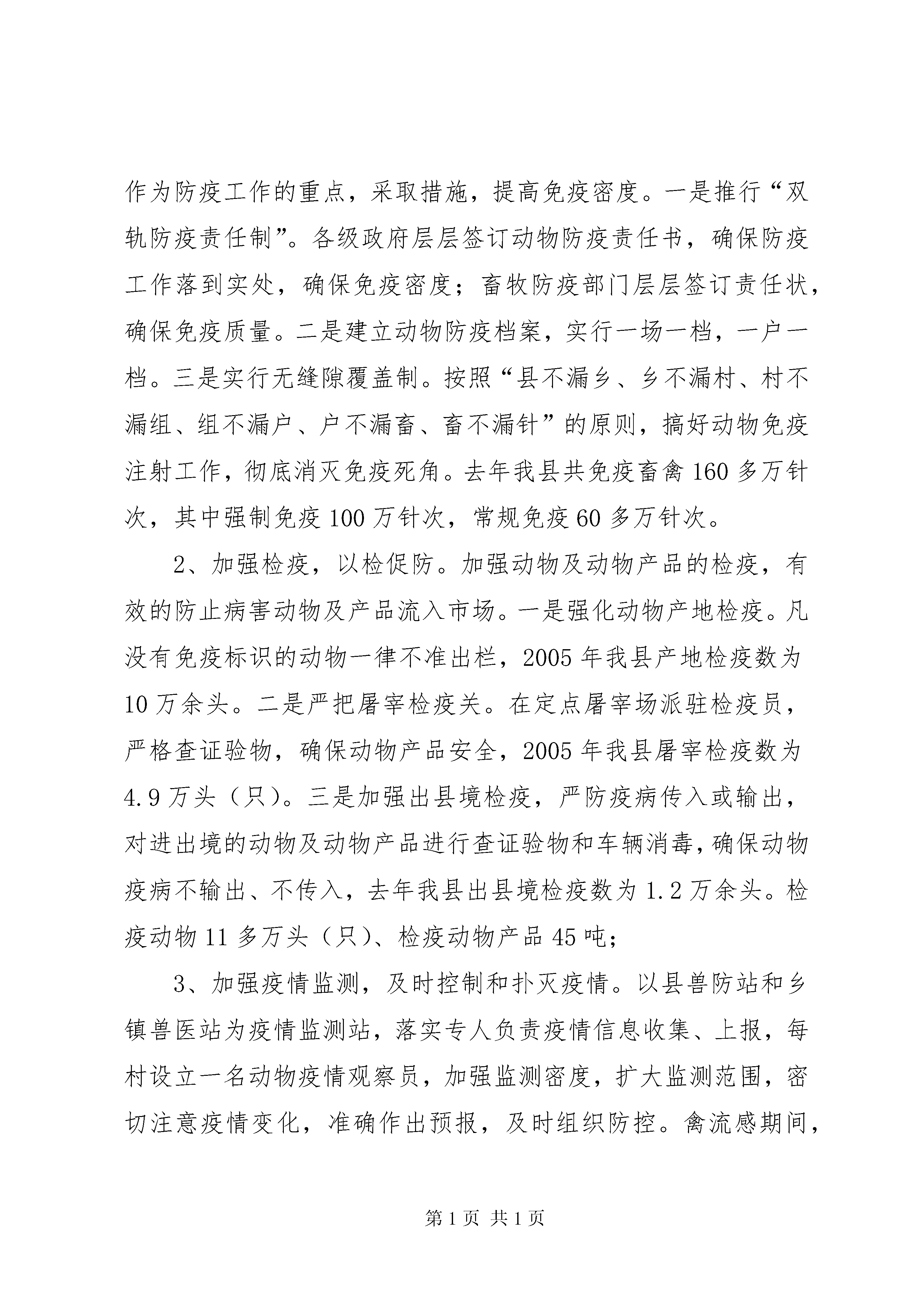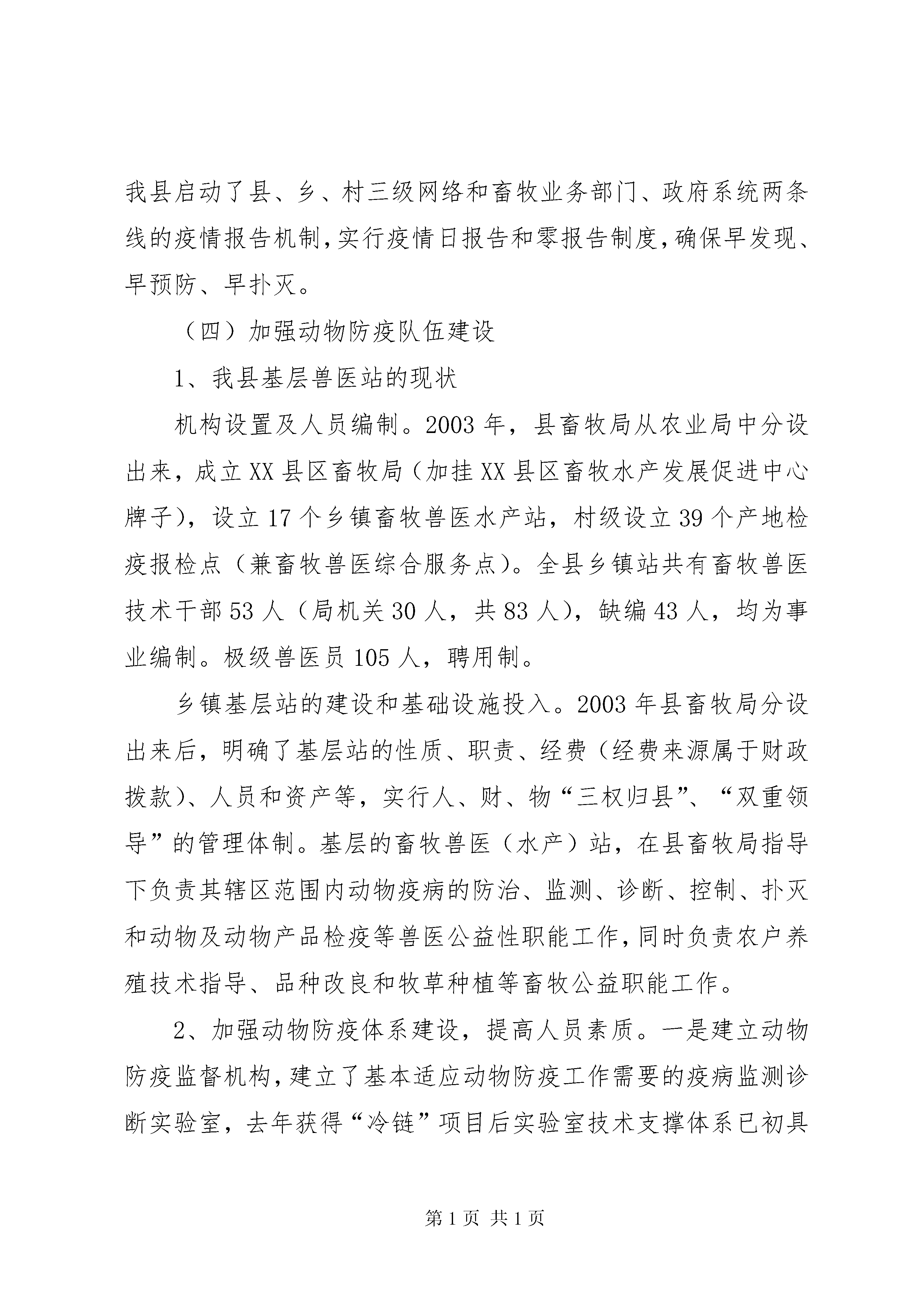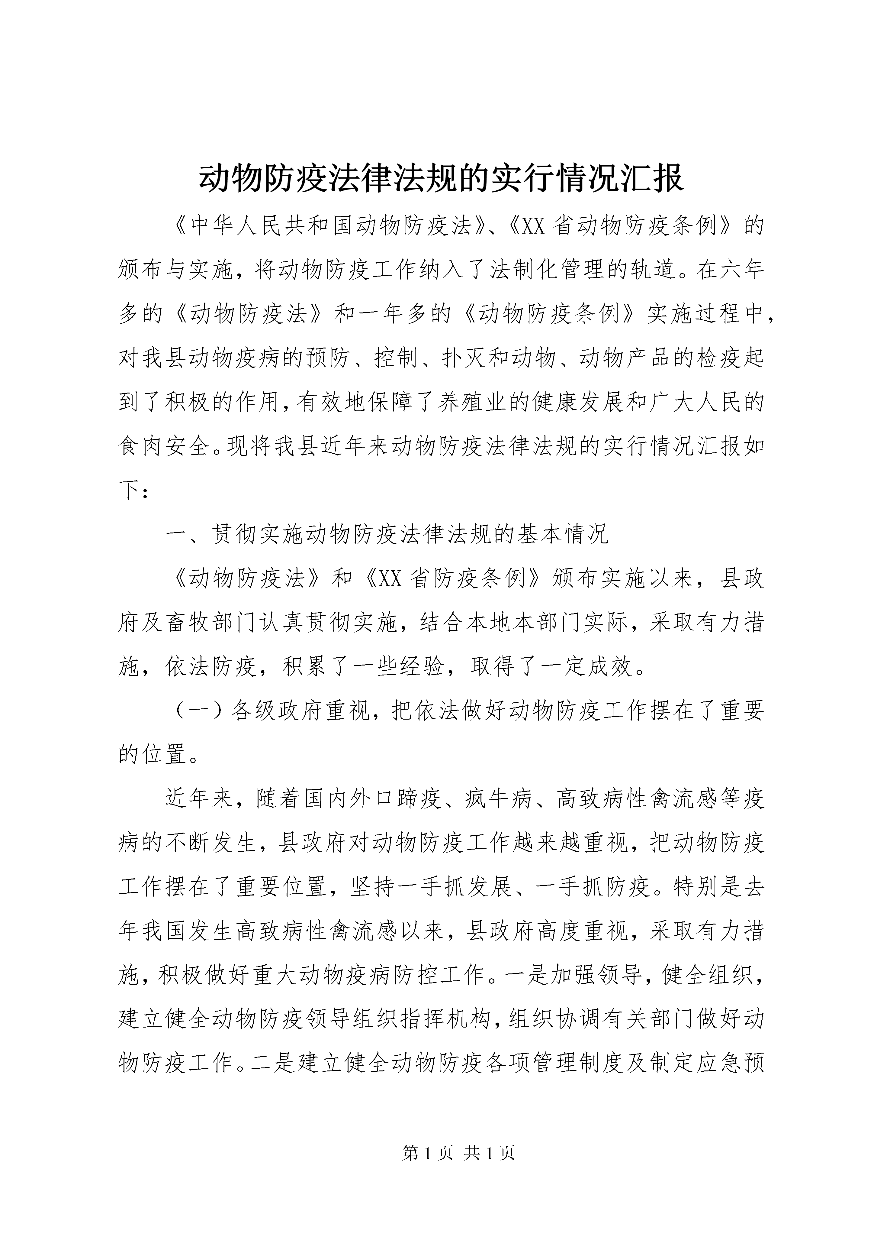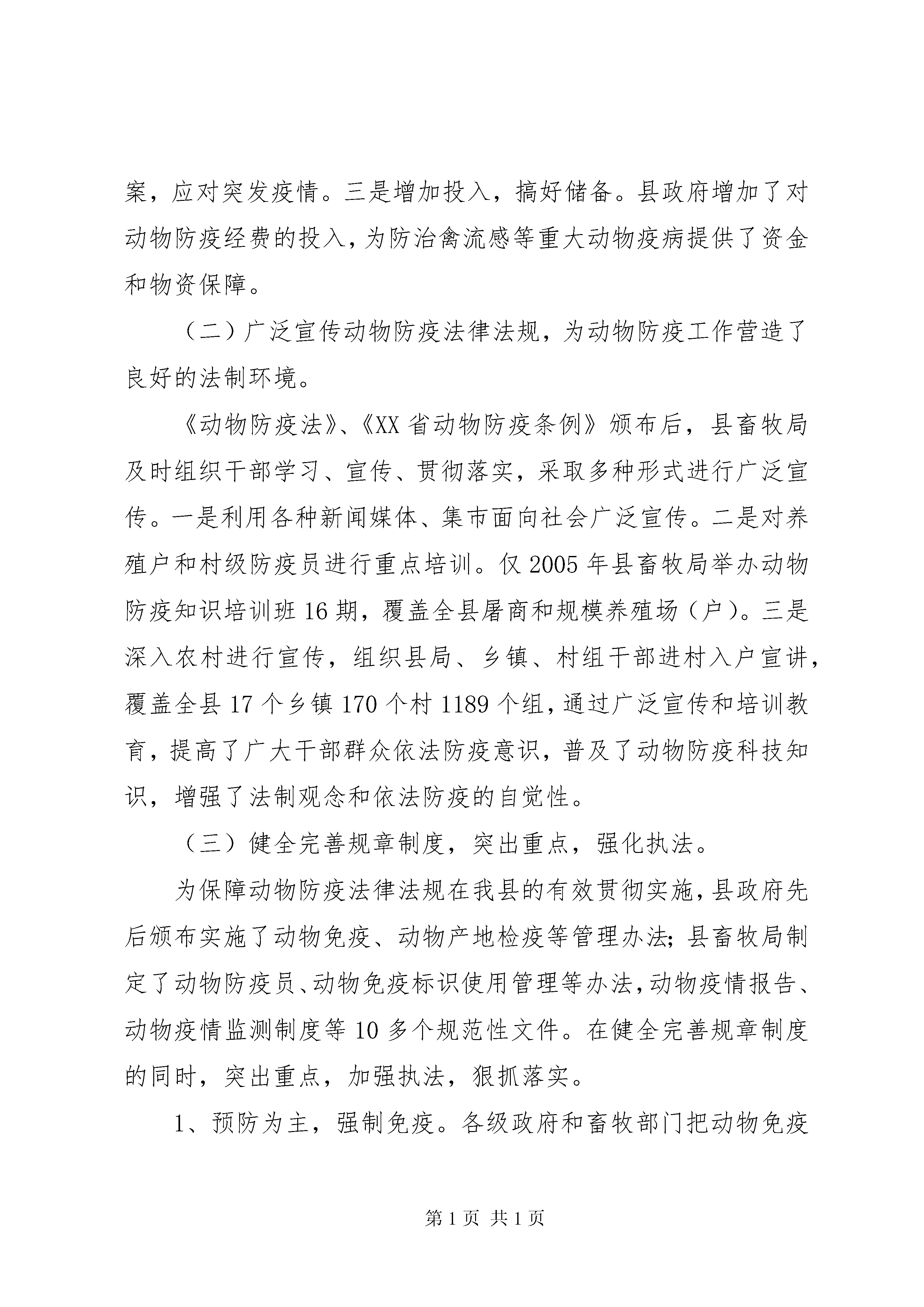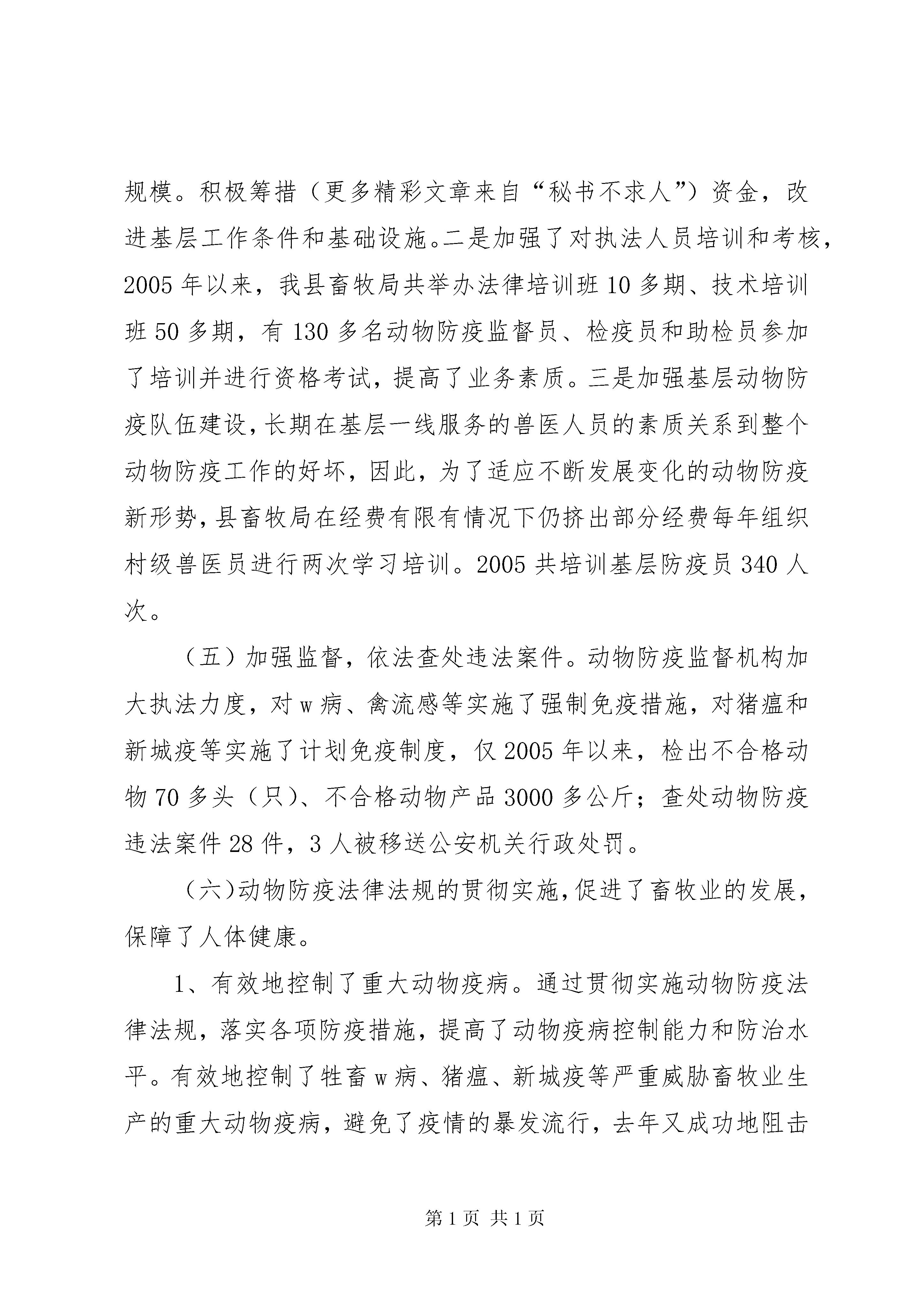 动物防疫法律法规的实行情况汇报《中华人民共和国动物防疫法》、《XX省动物防疫条例》的颁布与实施,将动物防疫工作纳入了法制化管理的轨道。在六年多的《动物防疫法》和一年多的《动物防疫条例》实施过程中,对我县动物疫病的预防、控制、扑灭和动物、动物产品的检疫起到了积极的作用,有效地保障了养殖业的健康发展和广大人民的食肉安全。现将我县近年来动物防疫法律法规的实行情况汇报如下:一、贯彻实施动物防疫法律法规的基本情况《动物防疫法》和《XX省防疫条例》颁布实施以来,县政府及畜牧部门认真贯彻实施,结合本地本部门实际,采取有力措施,依法防疫,积累了一些经验,取得了一定成效。(一)各级政府重视,把依法做好动物防疫工作摆在了重要的位置。近年来,随着国内外口蹄疫、疯牛病、高致病性禽流感等疫病的不断发生,县政府对动物防疫工作越来越重视,把动物防疫工作摆在了重要位置,坚持一手抓发展、一手抓防疫。特别是去年我国发生高致病性禽流感以来,县政府高度重视,采取有力措施,积极做好重大动物疫病防控工作。一是加强领导,健全组织,建立健全动物防疫领导组织指挥机构,组织协调有关部门做好动物防疫工作。二是建立健全动物防疫各项管理制度及制定应急预案,应对突发疫情。三是增加投入,搞好储备。县政府增加了对动物防疫经费的投入,为防治禽流感等重大动物疫病提供了资金和物资保障。(二)广泛宣传动物防疫法律法规,为动物防疫工作营造了良好的法制环境。《动物防疫法》、《XX省动物防疫条例》颁布后,县畜牧局及时组织干部学习、宣传、贯彻落实,采取多种形式进行广泛宣传。一是利用各种新闻媒体、集巿面向社会广泛宣传。二是对养殖户和村级防疫员进行重点培训。仅2005年县畜牧局举办动物防疫知识培训班16期,覆盖全县屠商和规模养殖场(户)。三是深入农村进行宣传,组织县局、乡镇、村组干部进村入户宣讲,覆盖全县17个乡镇170个村1189个组,通过广泛宣传和培训教育,提高了广大干部群众依法防疫意识,普及了动物防疫科技知识,增强了法制观念和依法防疫的自觉性。(三)健全完善规章制度,突出重点,强化执法。为保障动物防疫法律法规在我县的有效贯彻实施,县政府先后颁布实施了动物免疫、动物产地检疫等管理办法;县畜牧局制定了动物防疫员、动物免疫标识使用管理等办法,动物疫情报告、动物疫情监测制度等10多个规范性文件。在健全完善规章制度的同时,突出重点,加强执法,狠抓落实。1、预防为主,强制免疫。各级政府和畜牧部门把动物免疫作为防疫工作的重点,采取措施,提高免疫密度。一是推行“双轨防疫责任制”。各级政府层层签订动物防疫责任书,确保防疫工作落到实处,确保免疫密度;畜牧防疫部门层层签订责任状,确保免疫质量。二是建立动物防疫档案,实行一场一档,一户一档。三是实行无缝隙覆盖制。按照“县不漏乡、乡不漏村、村不漏组、组不漏户、户不漏畜、畜不漏针”的原则,搞好动物免疫注射工作,彻底消灭免疫死角。去年我县共免疫畜禽160多万针次,其中强制免疫100万针次,常规免疫60多万针次。2、加强检疫,以检促防。加强动物及动物产品的检疫,有效的防止病害动物及产品流入市场。一是强化动物产地检疫。凡没有免疫标识的动物一律不准出栏,2005年我县产地检疫数为10万余头。二是严把屠宰检疫关。在定点屠宰场派驻检疫员,严格查证验物,确保动物产品安全,2005年我县屠宰检疫数为4.9万头(只)。三是加强出县境检疫,严防疫病传入或输出,对进出境的动物及动物产品进行查证验物和车辆消毒,确保动物疫病不输出、不传入,去年我县出县境检疫数为1.2万余头。检疫动物11多万头(只)、检疫动物产品45吨;3、加强疫情监测,及时控制和扑灭疫情。以县兽防站和乡镇兽医站为疫情监测站,落实专人负责疫情信息收集、上报,每村设立一名动物疫情观察员,加强监测密度,扩大监测范围,密切注意疫情变化,准确作出预报,及时组织防控。禽流感期间,我县启动了县、乡、村三级网络和畜牧业务部门、政府系统两条线的疫情报告机制,实行疫情日报告和零报告制度,确保早发现、早预防、早扑灭。(四)加强动物防疫队伍建设1、我县基层兽医站的现状机构设置及人员编制。2003年,县畜牧局从农业局中分设出来,成立XX县区畜牧局(加挂XX县区畜牧水产发展促进中心牌子),设立17个乡镇畜牧兽医水产站,村级设立39个产地检疫报检点(兼畜牧兽医综合服务点)。全县乡镇站共有畜牧兽医技术干部53人(局机关30人,共83人),缺编43人,均为事业编制。极级兽医员105人,聘用制。乡镇基层站的建设和基础设施投入。2003年县畜牧局分设出来后,明确了基层站的性质、职责、经费(经费来源属于财政拨款)、人员和资产等,实行人、财、物“三权归县”、“双重领导”的管理体制。基层的畜牧兽医(水产)站,在县畜牧局指导下负责其辖区范围内动物疫病的防治、