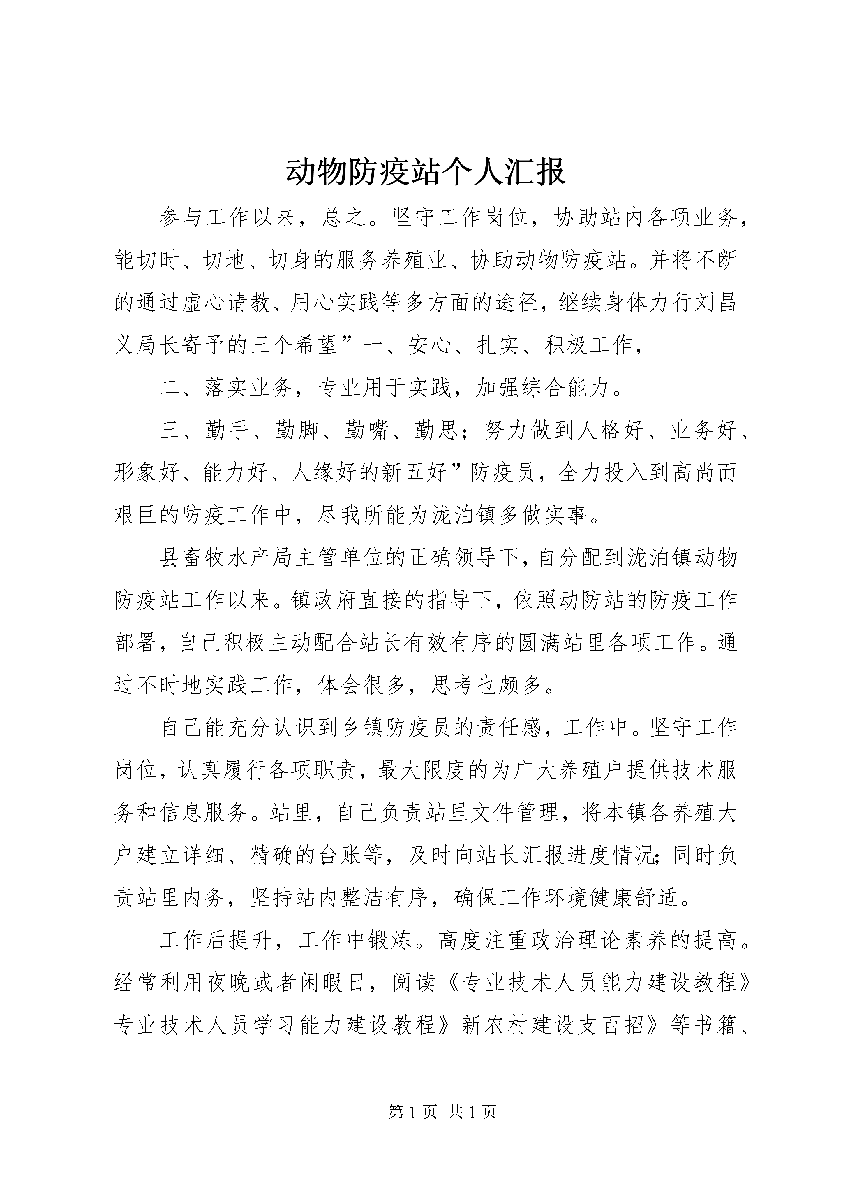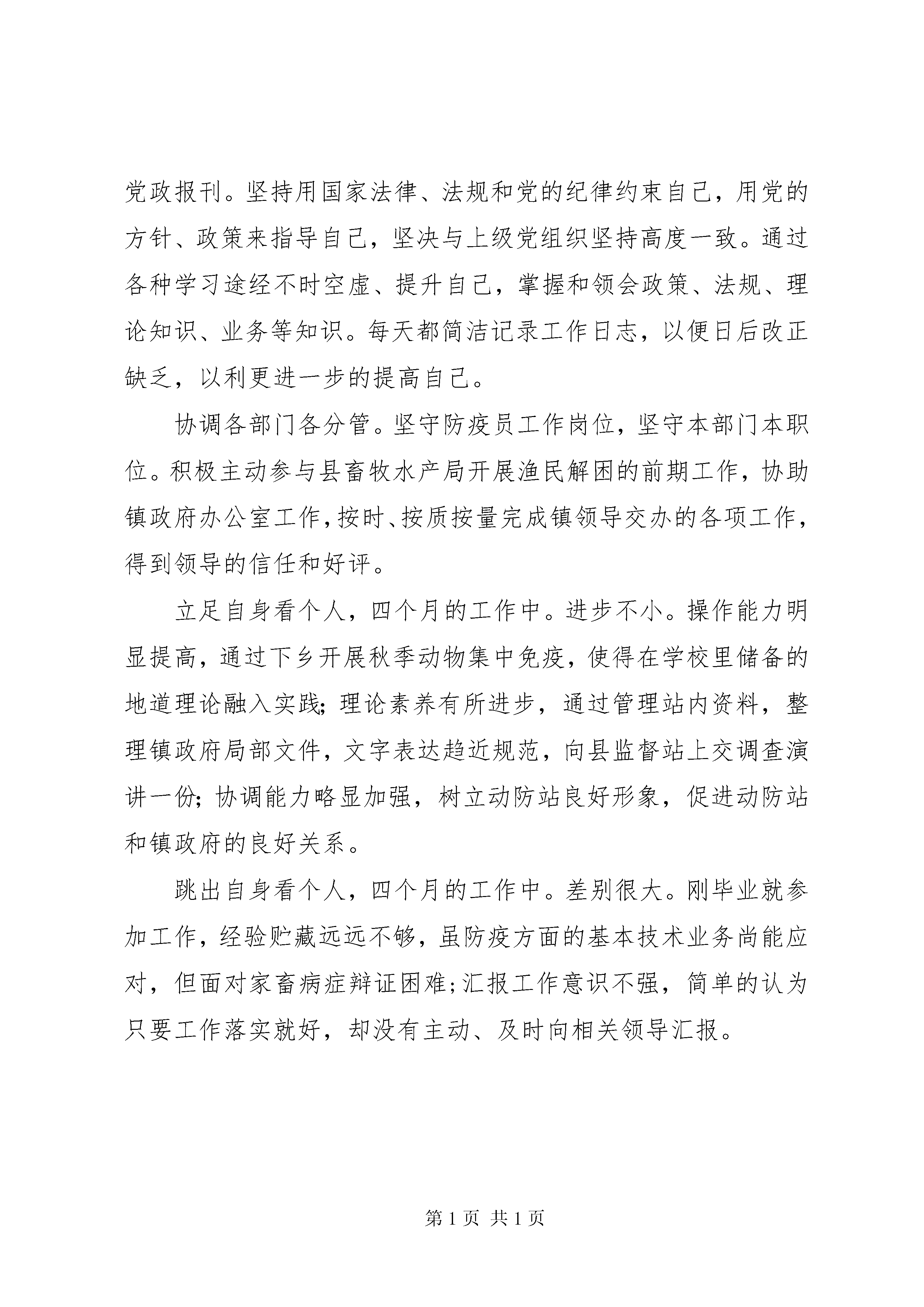 动物防疫站个人汇报参与工作以来,总之。坚守工作岗位,协助站内各项业务,能切时、切地、切身的服务养殖业、协助动物防疫站。并将不断的通过虚心请教、用心实践等多方面的途径,继续身体力行刘昌义局长寄予的三个希望”一、安心、扎实、积极工作,二、落实业务,专业用于实践,加强综合能力。三、勤手、勤脚、勤嘴、勤思;努力做到人格好、业务好、形象好、能力好、人缘好的新五好”防疫员,全力投入到高尚而艰巨的防疫工作中,尽我所能为泷泊镇多做实事。县畜牧水产局主管单位的正确领导下,自分配到泷泊镇动物防疫站工作以来。镇政府直接的指导下,依照动防站的防疫工作部署,自己积极主动配合站长有效有序的圆满站里各项工作。通过不时地实践工作,体会很多,思考也颇多。自己能充分认识到乡镇防疫员的责任感,工作中。坚守工作岗位,认真履行各项职责,最大限度的为广大养殖户提供技术服务和信息服务。站里,自己负责站里文件管理,将本镇各养殖大户建立详细、精确的台账等,及时向站长汇报进度情况;同时负责站里内务,坚持站内整洁有序,确保工作环境健康舒适。工作后提升,工作中锻炼。高度注重政治理论素养的提高。经常利用夜晚或者闲暇日,阅读《专业技术人员能力建设教程》专业技术人员学习能力建设教程》新农村建设支百招》等书籍、党政报刊。坚持用国家法律、法规和党的纪律约束自己,用党的方针、政策来指导自己,坚决与上级党组织坚持高度一致。通过各种学习途经不时空虚、提升自己,掌握和领会政策、法规、理论知识、业务等知识。每天都简洁记录工作日志,以便日后改正缺乏,以利更进一步的提高自己。协调各部门各分管。坚守防疫员工作岗位,坚守本部门本职位。积极主动参与县畜牧水产局开展渔民解困的前期工作,协助镇政府办公室工作,按时、按质按量完成镇领导交办的各项工作,得到领导的信任和好评。立足自身看个人,四个月的工作中。进步不小。操作能力明显提高,通过下乡开展秋季动物集中免疫,使得在学校里储备的地道理论融入实践;理论素养有所进步,通过管理站内资料,整理镇政府局部文件,文字表达趋近规范,向县监督站上交调查演讲一份;协调能力略显加强,树立动防站良好形象,促进动防站和镇政府的良好关系。跳出自身看个人,四个月的工作中。差别很大。刚毕业就参加工作,经验贮藏远远不够,虽防疫方面的基本技术业务尚能应对,但面对家畜病症辩证困难;汇报工作意识不强,简单的认为只要工作落实就好,却没有主动、及时向相关领导汇报。