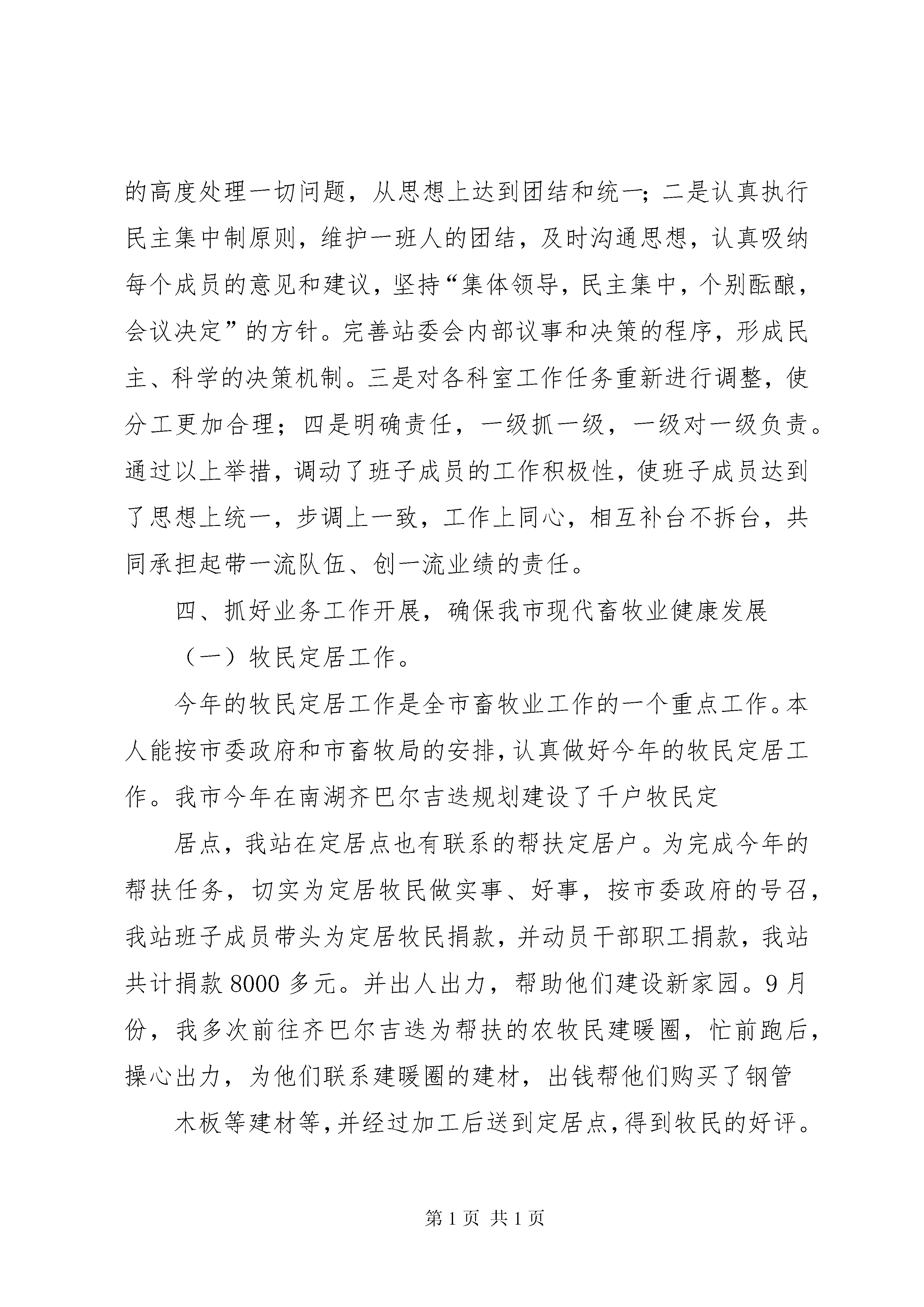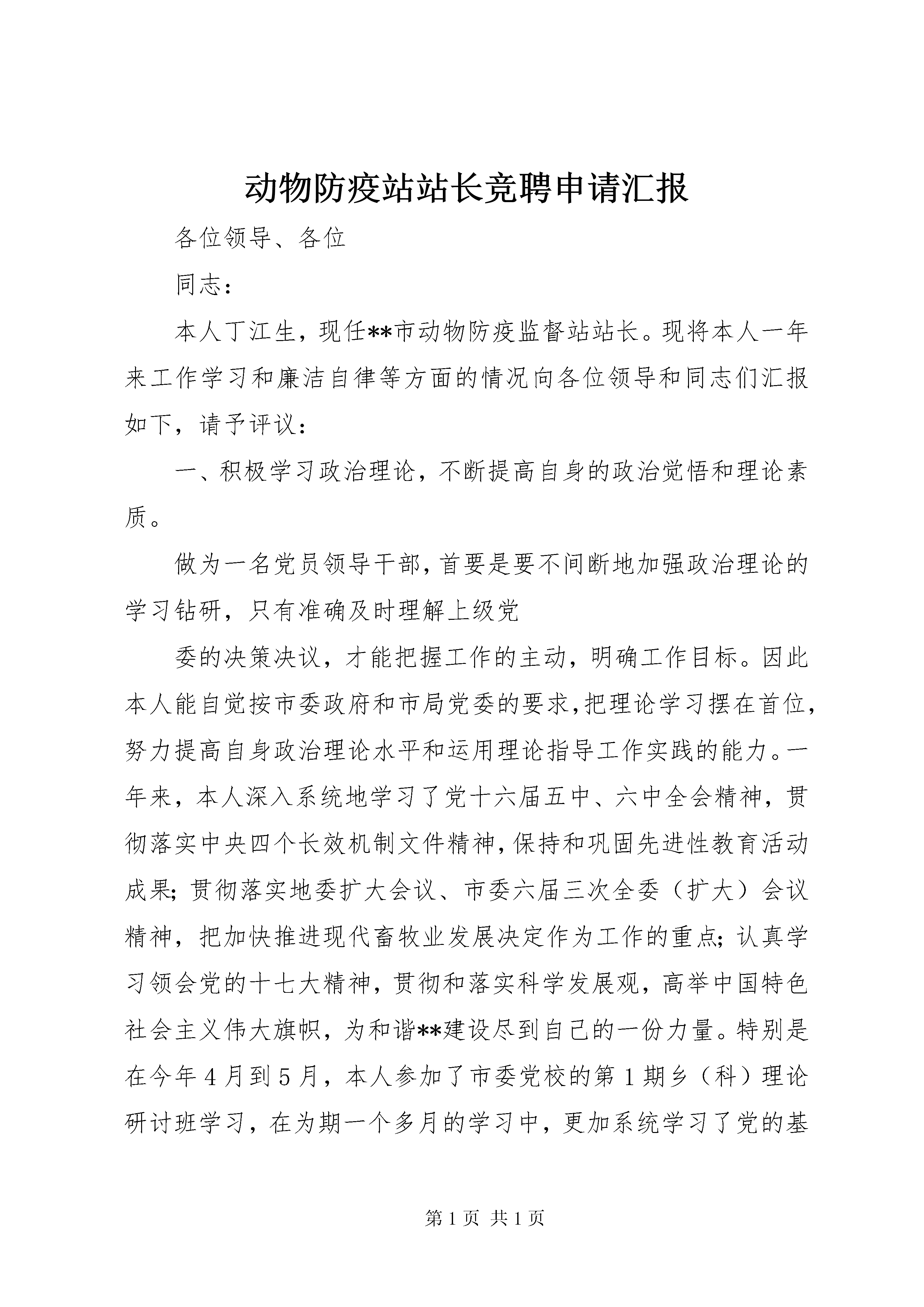 动物防疫站站长竞聘申请汇报各位领导、各位同志:本人丁江生,现任**市动物防疫监督站站长。现将本人一年来工作学习和廉洁自律等方面的情况向各位领导和同志们汇报如下,请予评议:一、积极学习政治理论,不断提高自身的政治觉悟和理论素质。做为一名党员领导干部,首要是要不间断地加强政治理论的学习钻研,只有准确及时理解上级党委的决策决议,才能把握工作的主动,明确工作目标。因此本人能自觉按市委政府和市局党委的要求,把理论学习摆在首位,努力提高自身政治理论水平和运用理论指导工作实践的能力。一年来,本人深入系统地学习了党十六届五中、六中全会精神,贯彻落实中央四个长效机制文件精神,保持和巩固先进性教育活动成果;贯彻落实地委扩大会议、市委六届三次全委(扩大)会议精神,把加快推进现代畜牧业发展决定作为工作的重点;认真学习领会党的十七大精神,贯彻和落实科学发展观,高举中国特色社会主义伟大旗帜,为和谐**建设尽到自己的一份力量。特别是在今年4月到5月,本人参加了市委党校的第1期乡(科)理论研讨班学习,在为期一个多月的学习中,更加系统学习了党的基本理论,进一步提高了本人的政治理论素养和理论水平。通过一年来的思想政治学习,自己的思想得到了进一步升华,增强了贯彻执行党的路线方针的自觉性和坚定性,增强了政治意识、责任意识和大局意识,力争做到立党为公、执政为民。同时本人还注重对法律、科技、专业知识等方面知识的进行不断学习、继续学习,力求拓宽知识面和工作视野,努力提高自身的综合素质,为更好地指导各项工作开展提供理论依据。二、牢记“两个务必”,严格各项纪律,狠抓廉洁自律。为加强对广大党员干部的廉政教育,增强廉洁自律意识,落实党风廉政建设工作责任制,本人作为单位主要党廉责任人之一,严格依照职责分工,认真学习了中央、自治区关于从严治党的一系列指示精神,做到警钟长鸣,勤政廉政。加强对“两个条例”的学习,并通过警示教育,增强廉政意识,充分认识到新形势下加强党风廉政建设的重要性。今年本人按按照党风廉政建设责任书的要求,分解党风廉政责任,落实党廉机制。通过完善管理措施,加强对党员干部的监督管理,严格执行廉政规定。作为单位党廉主要责任人之一,本人在今年的工作中能严格要求自己,以身作则,率先垂范,认真贯彻执行中央、自治区党委纪委关于对党员领导干部廉洁从政若干准则等各项规定。严格按市委、纪委和局党委、纪委的规定和要求,加强自我监督,强化群众监督,提高廉洁自律意识,牢固树立正确的人生观、价值观和权力观。认识到权力是人民给的,为人民要用好手中的权力,多为群众谋福利,慎用权,增强拒腐防变的能力。同时自觉贯彻执行廉政准则和各项规定,注意小节,在经济上公私分明,在工作上秉公办事,严格约束自己,切实管好自己的家人和身边工作人员。积极参加班子建设和机关廉政建设,严格要求自己,保持勤政廉洁,不计较个人得失,堂堂正正做人,清清白白做官。做到自重、自省、自警、自励,以自己的实际行动推进我站党风廉政建设工作进步。三、抓班子、带队伍、求真务实,科学决策在工作上,自己始终保持积极进取、真抓实干、求真务实的工作作风,加强对纠风工作领导,加强五风建设,加强了机关考勤管理,加强班子建设,带动专业技术队伍建设,使整个机关作风有了明显的转变。今年我站由于原办公场所被征用,单位搬了两次家,但虽没有固定的办公场所,但班子的建设、单位的管理并没有因此而停滞,而是进一步加强了。工作中本人能以诚待人,严以律己,充分发挥大家的积极性、主动性、创造性,使大家能团结协调,各负其责,合作共事。站班子形成了较强的凝聚力和战斗力,成为团结大家开创事业的核心,全站呈现团结向上的良好局面。为了增强班子合力,我着重从四个方面狠抓了班子建设。一是加强班子成员和干部职工的理论学习,在具体工作中从讲政治的高度处理一切问题,从思想上达到团结和统一;二是认真执行民主集中制原则,维护一班人的团结,及时沟通思想,认真吸纳每个成员的意见和建议,坚持“集体领导,民主集中,个别酝酿,会议决定”的方针。完善站委会内部议事和决策的程序,形成民主、科学的决策机制。三是对各科室工作任务重新进行调整,使分工更加合理;四是明确责任,一级抓一级,一级对一级负责。通过以上举措,调动了班子成员的工作积极性,使班子成员达到了思想上统一,步调上一致,工作上同心,相互补台不拆台,共同承担起带一流队伍、创一流业绩的责任。四、抓好业务工作开展,确保我市现代畜牧业健康发展(一)牧民定居工作。今年的牧民定居工作是全市畜牧业工作的一个重点工作。本人能按市委政府和市畜牧局的安排,认真做好今年的牧民定居工作。我市今年在南湖齐巴尔吉迭规划建设了千户牧民定居点,我站在定居点也有联系的帮扶定居户。为完成今年的帮扶任务,切实为定居牧民做实事、好事,按市委政府的号召,我站班子成员带头为定居牧民